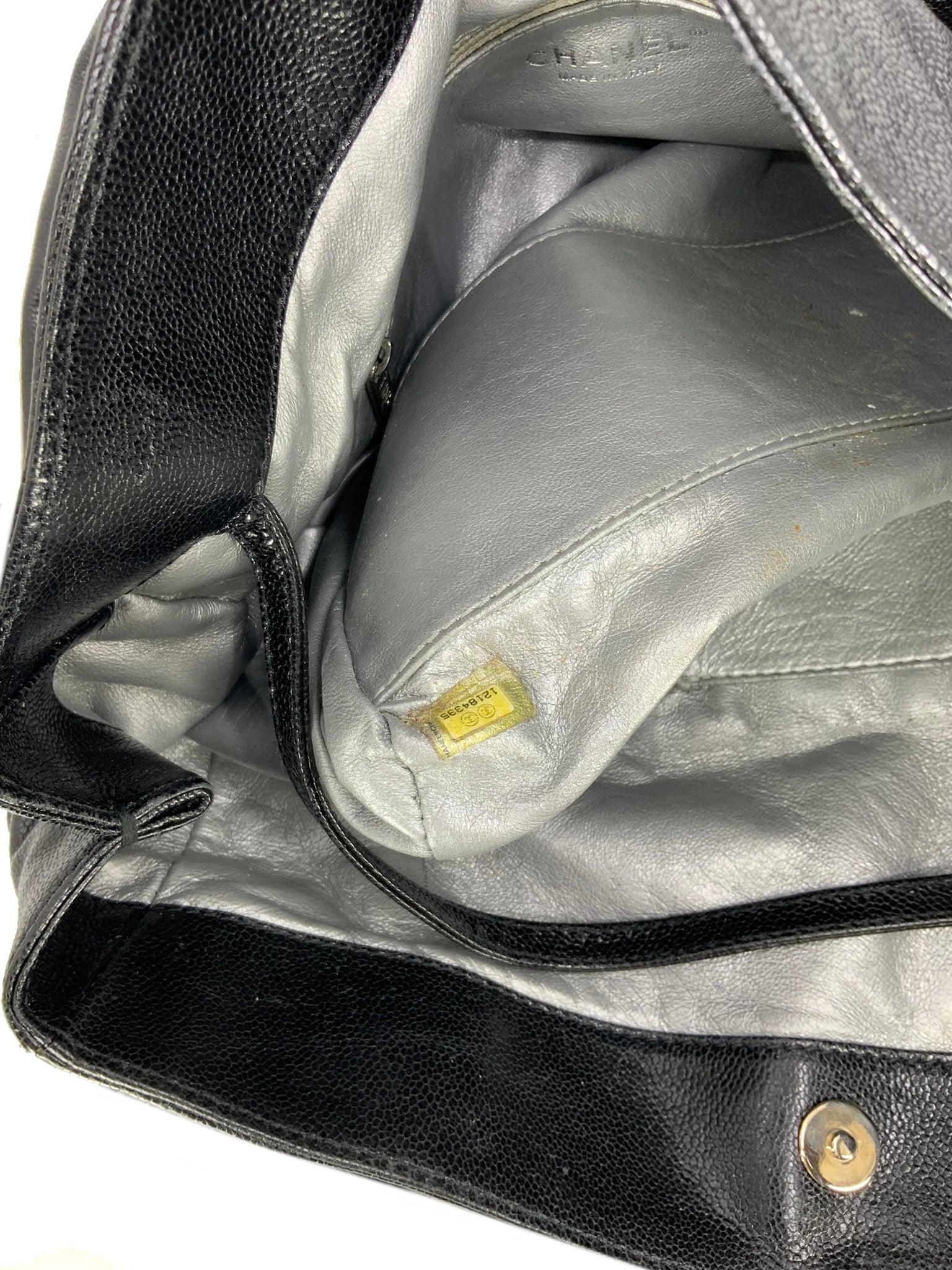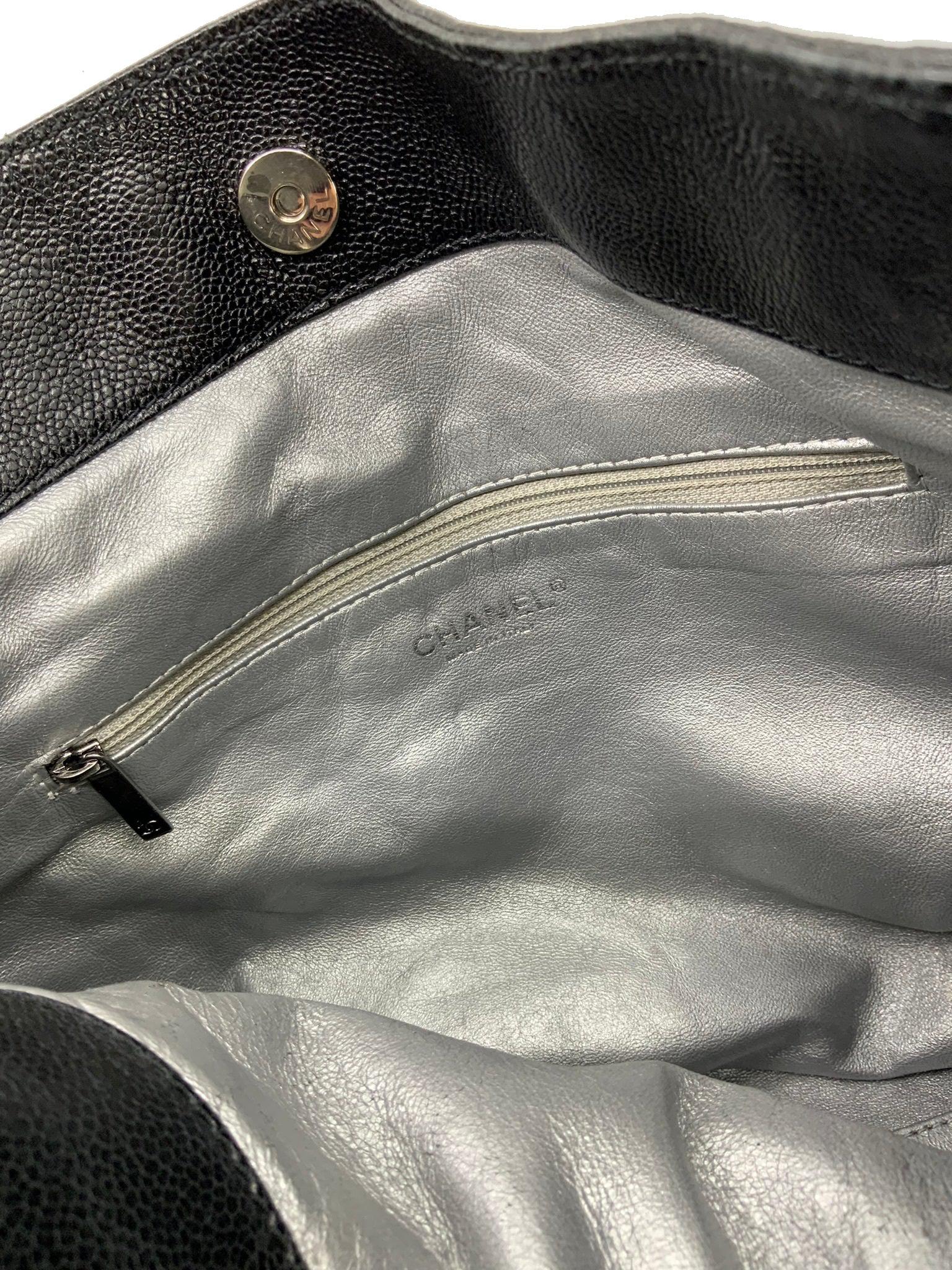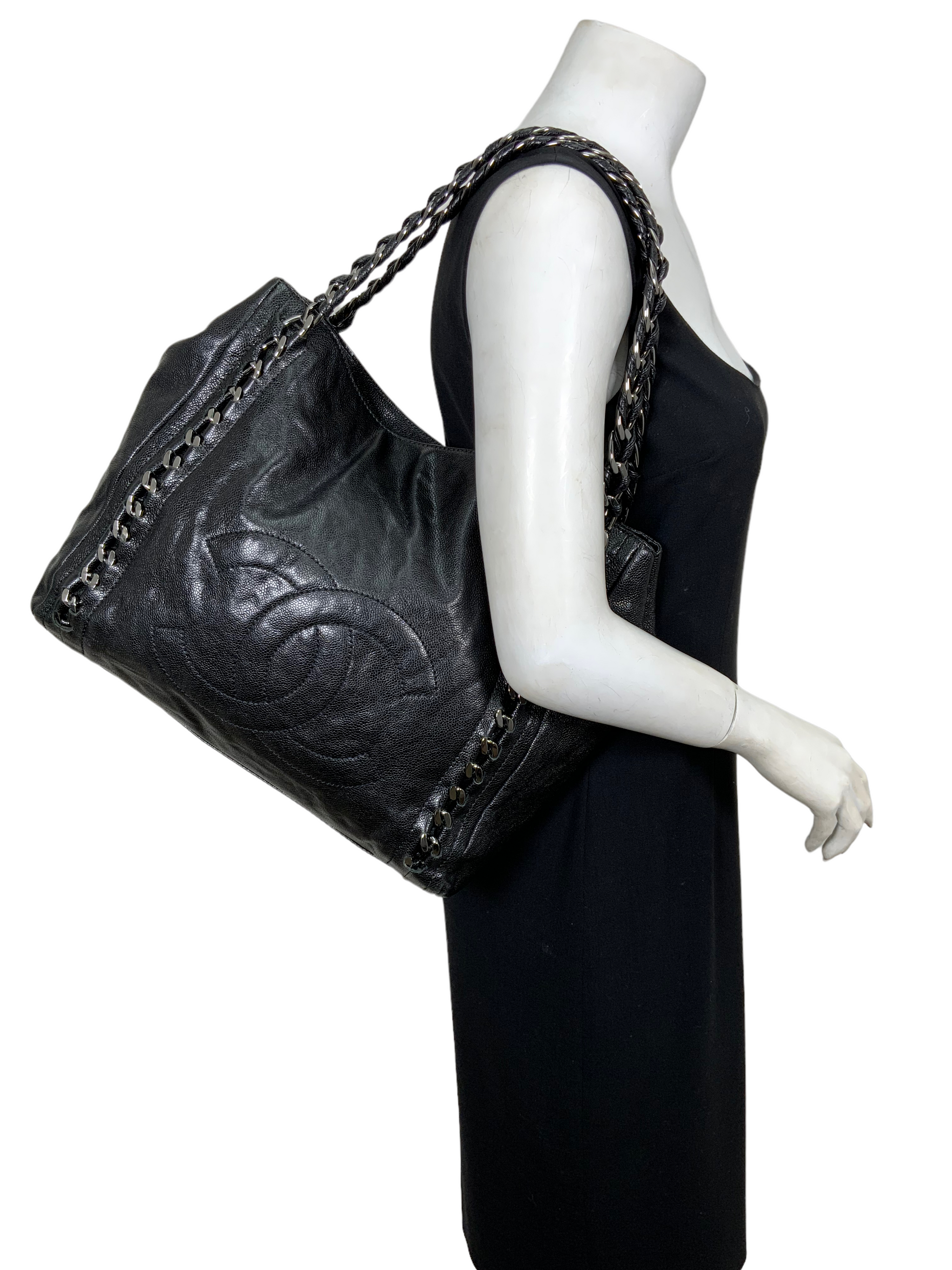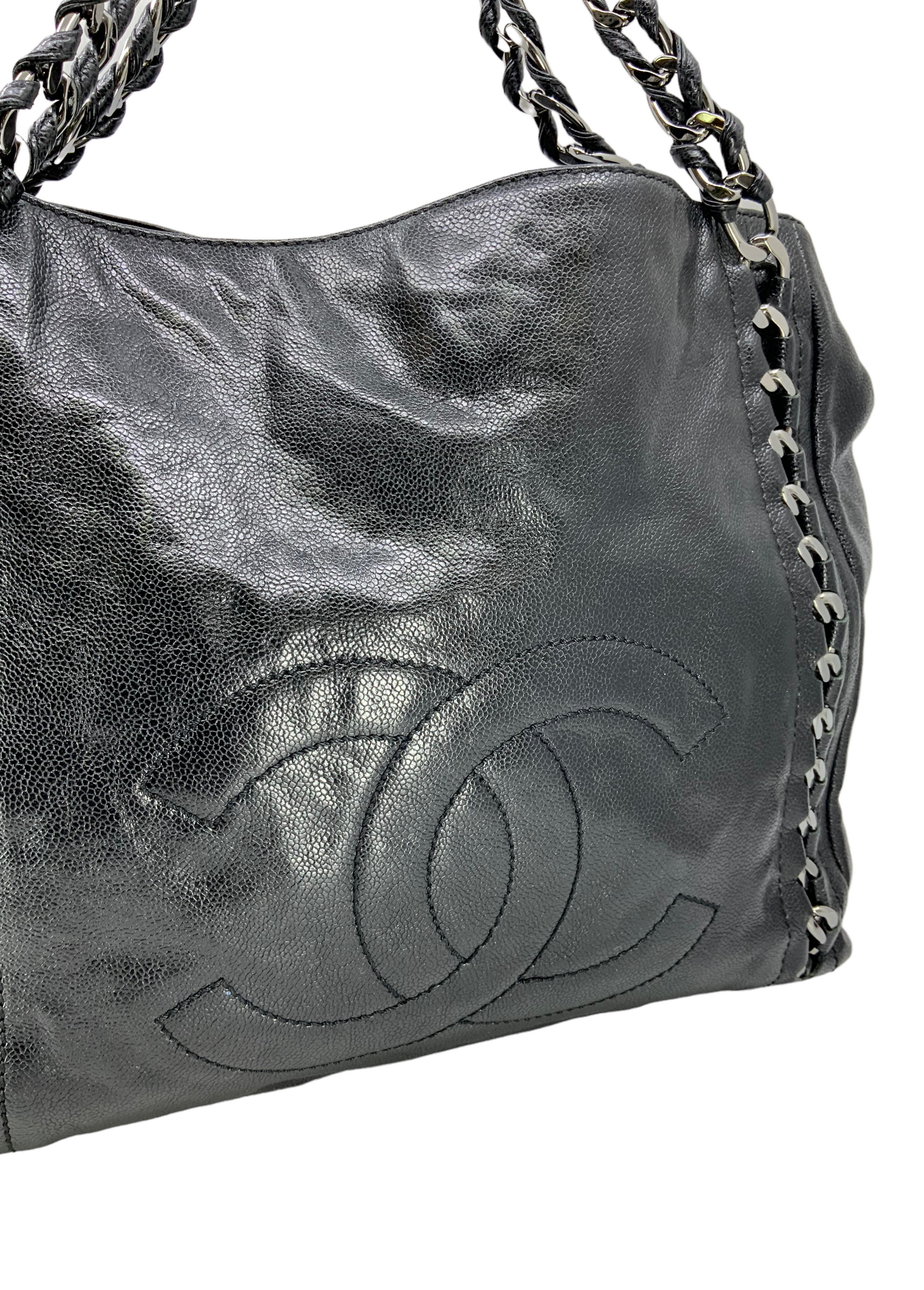 Add to your collection this CHANEL Luxe Ligne Leather Shoulder Bag from the 2008-2009 Collection.This bag isbeautifullycrafted fromblack caviar leather and silver-tone hardware. It features dualchain linkstraps threaded with tonal black leather, a large embossed signature CC logo at center and an ultra-spacious interior, roomy enough for all your essential belongings.Shop designer handbags by Chanelat.