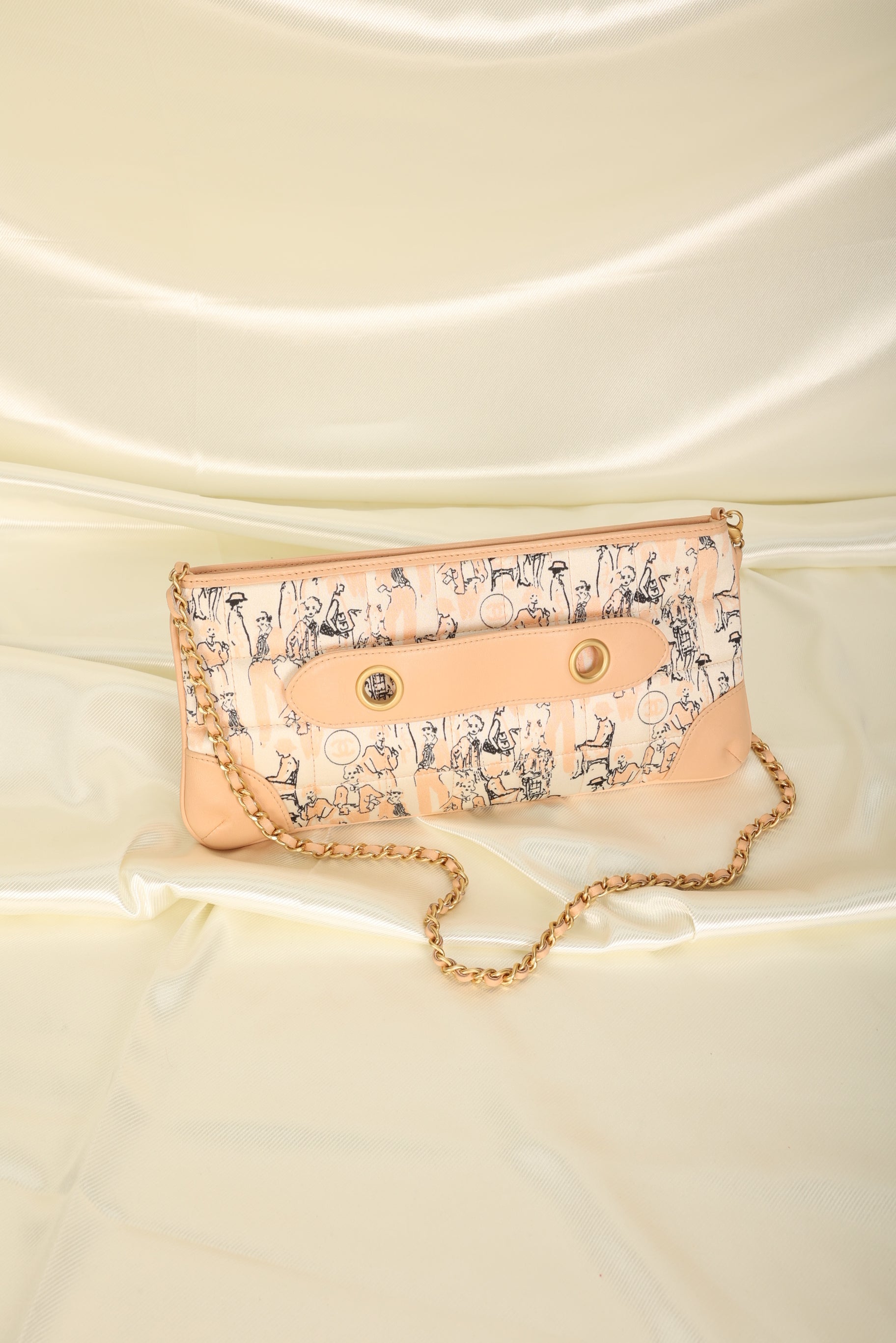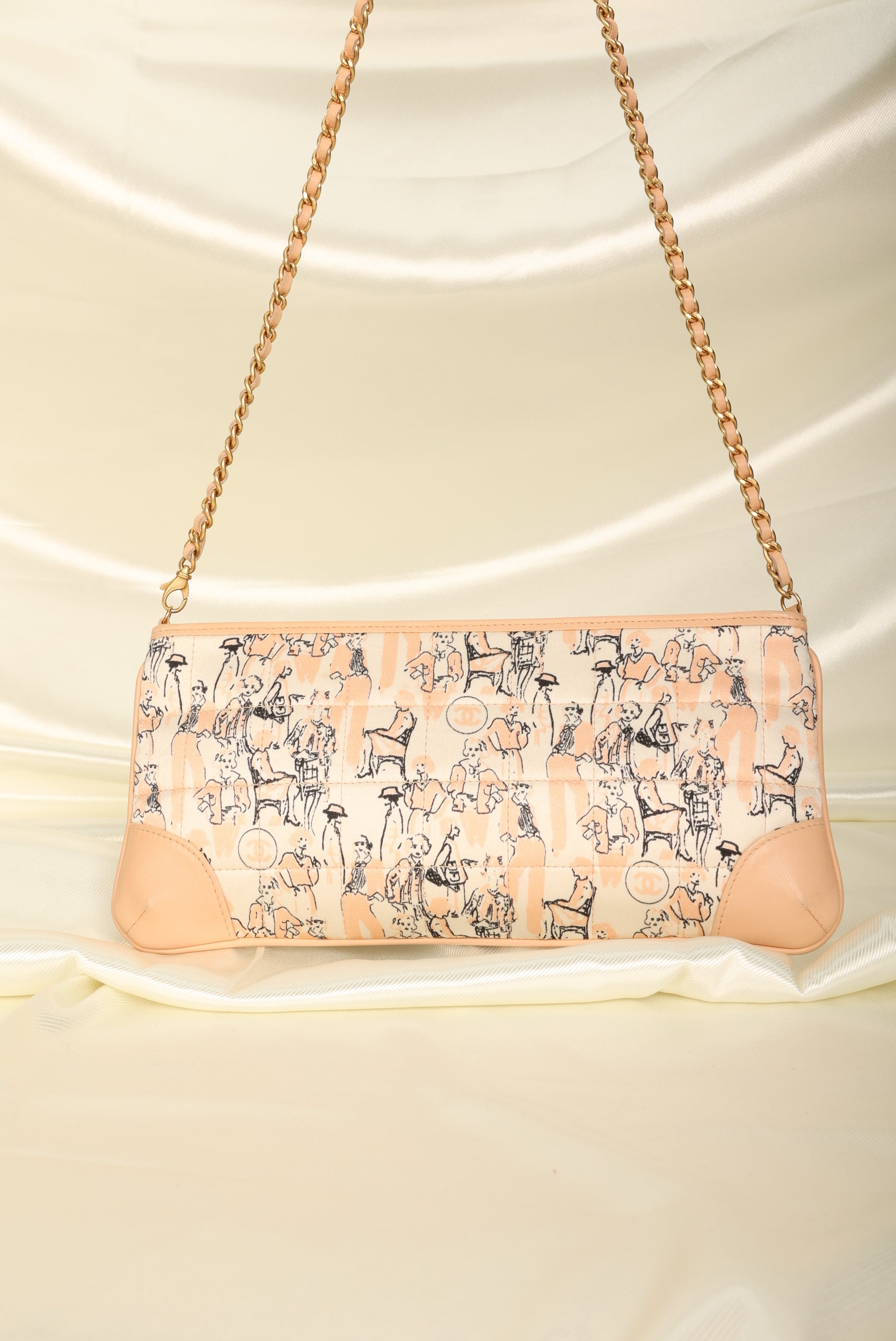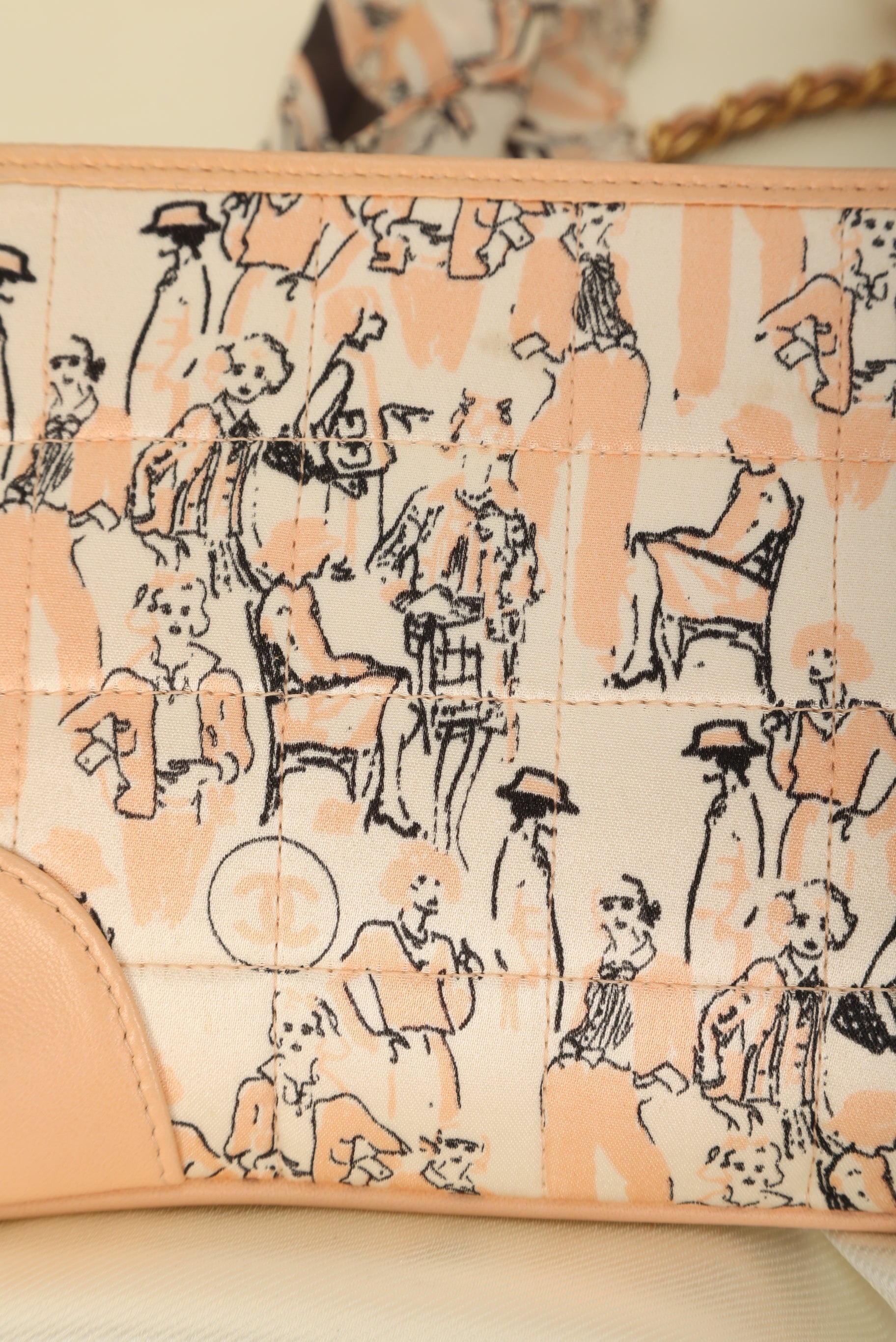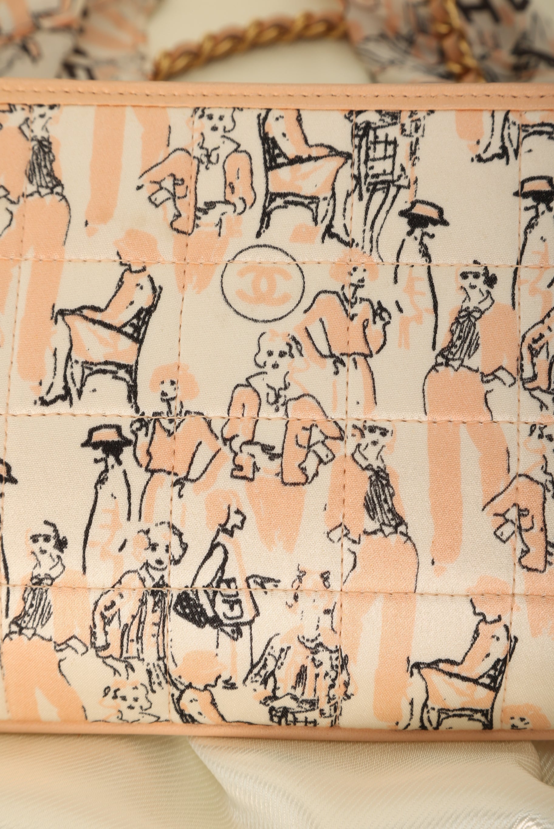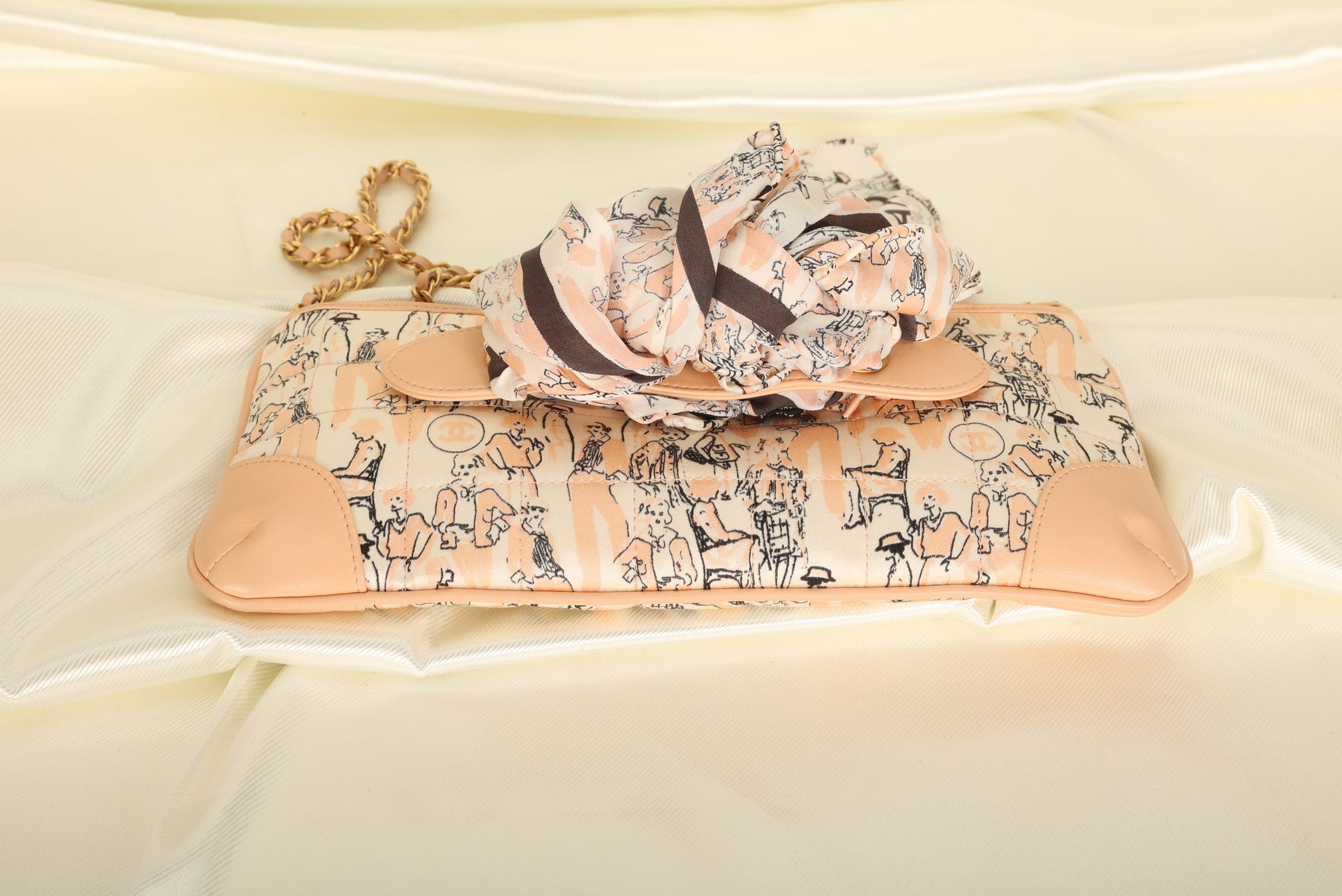 Crafted in a satin and adorned with small Coco Chanel mademoiselle figures, this is a rare vintage find! This beautiful ballerina pink piece has champagne gold hardware, and has a matching silk scarf fastened to the front for some added style. Scarf can be removed and tied on the chain for a girly twilly look, or can be separately as a fashionable accessory!!?