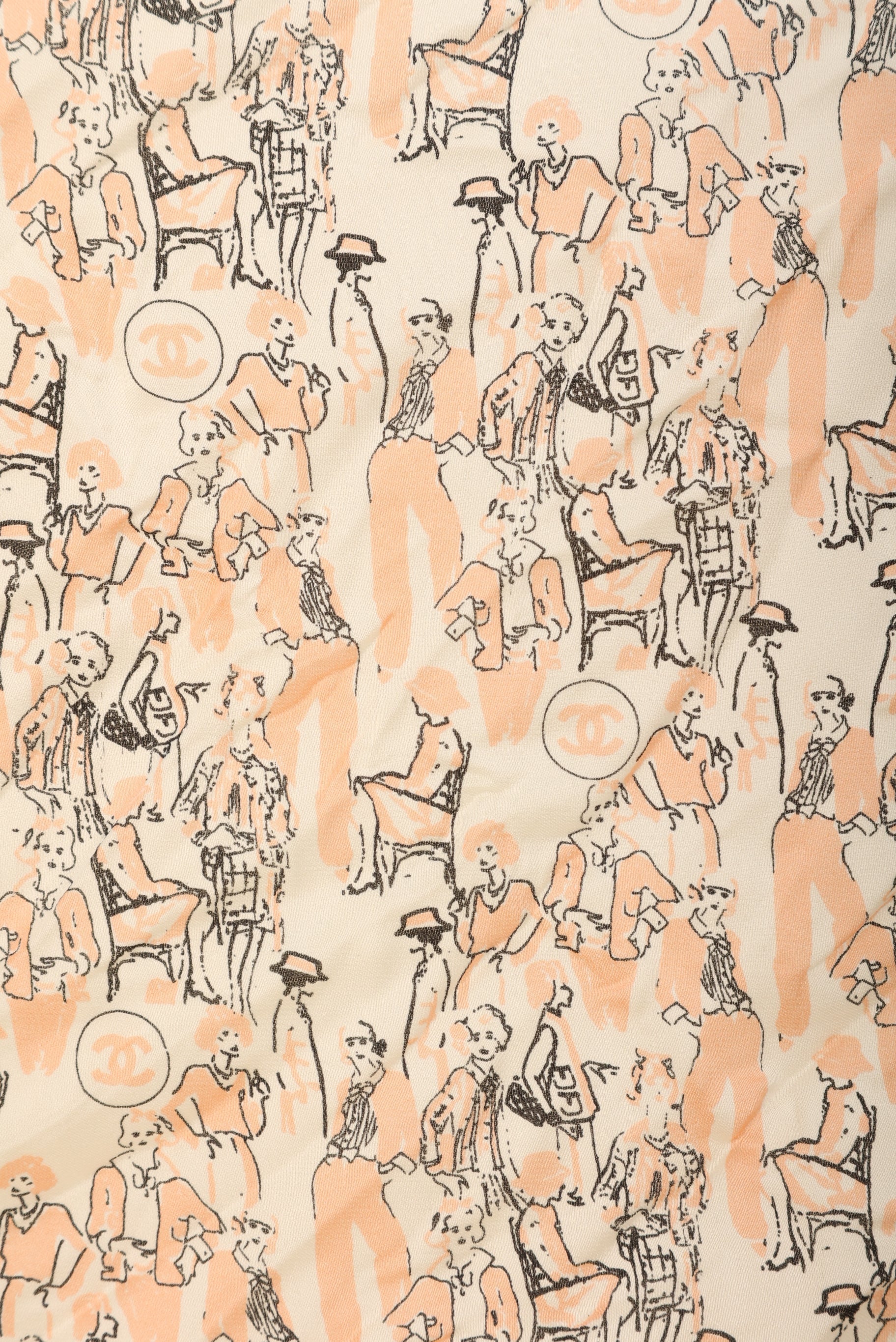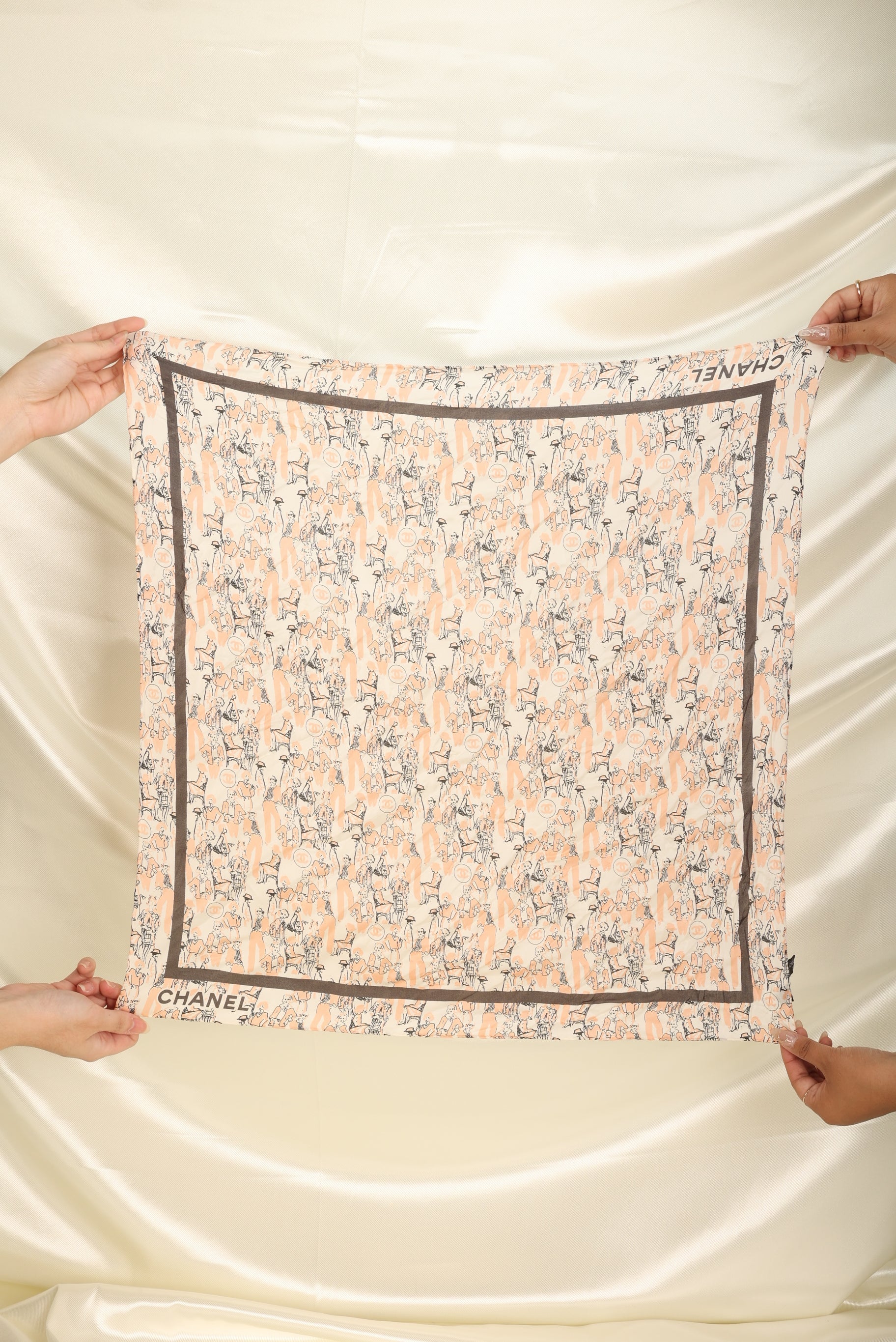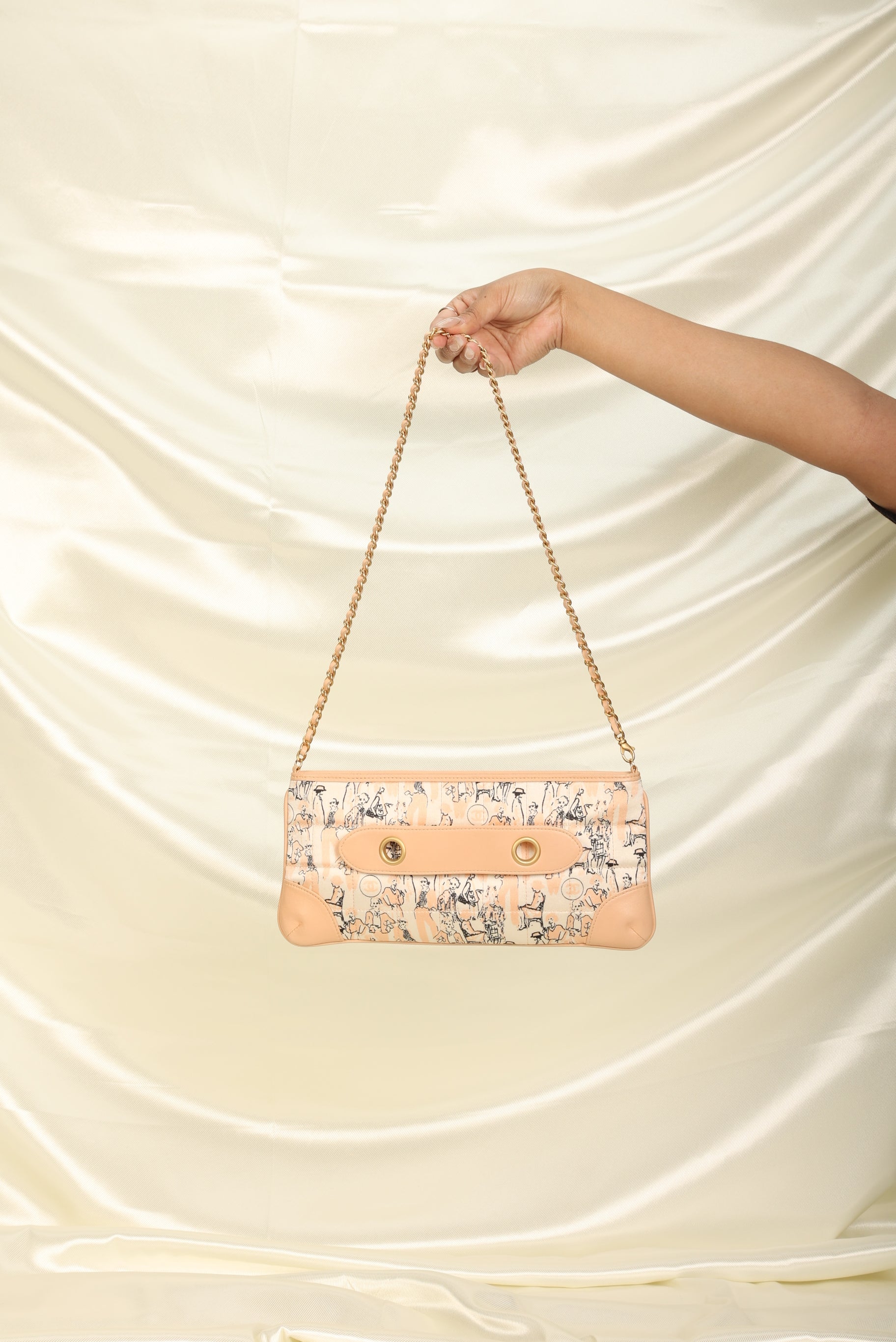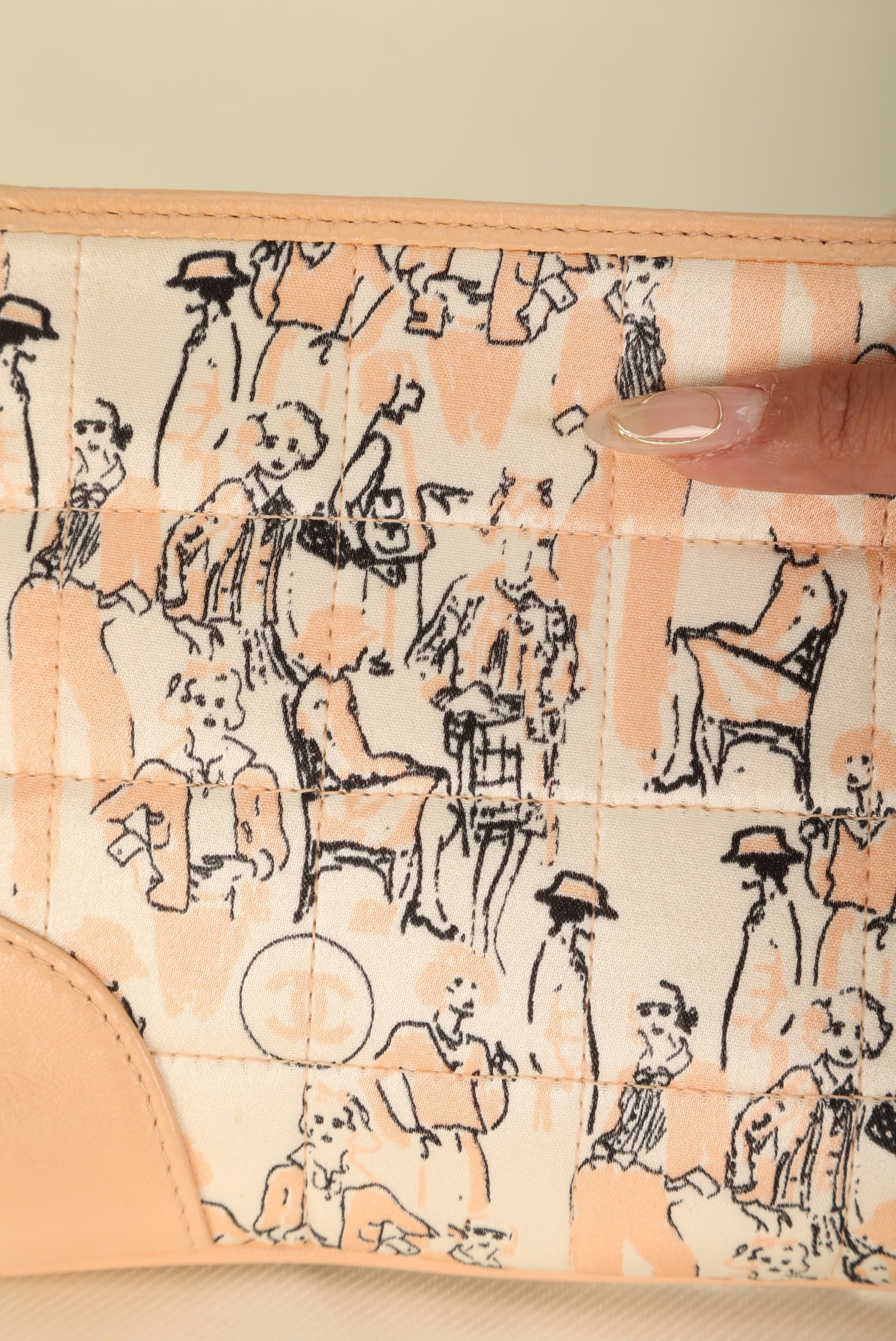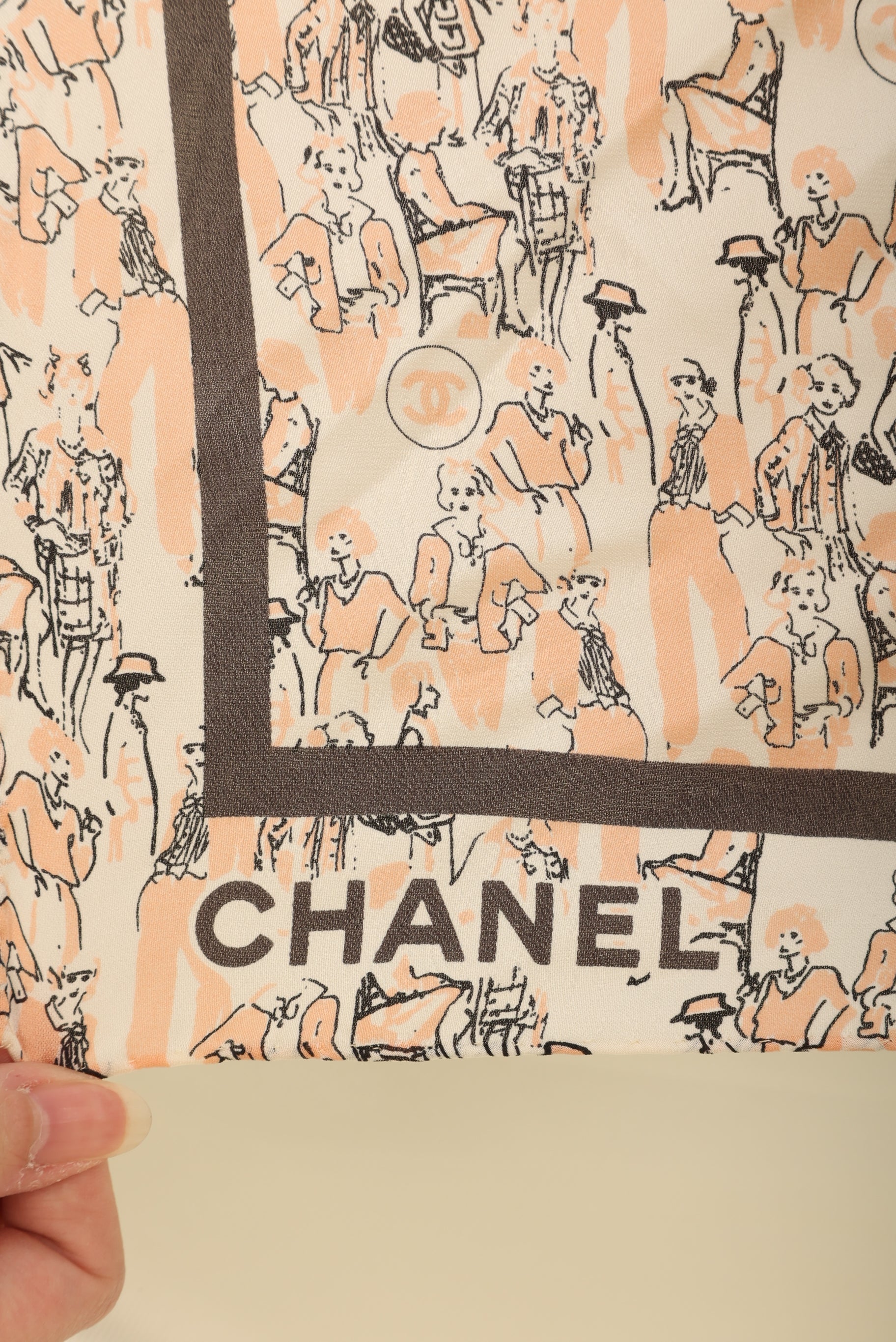 Crafted in a satin and adorned with small Coco Chanel mademoiselle figures, this is a rare vintage find! This beautiful ballerina pink piece has champagne gold hardware, and has a matching silk scarf fastened to the front for some added style. Scarf can be removed and tied on the chain for a girly twilly look, or can be separately as a fashionable accessory!!?