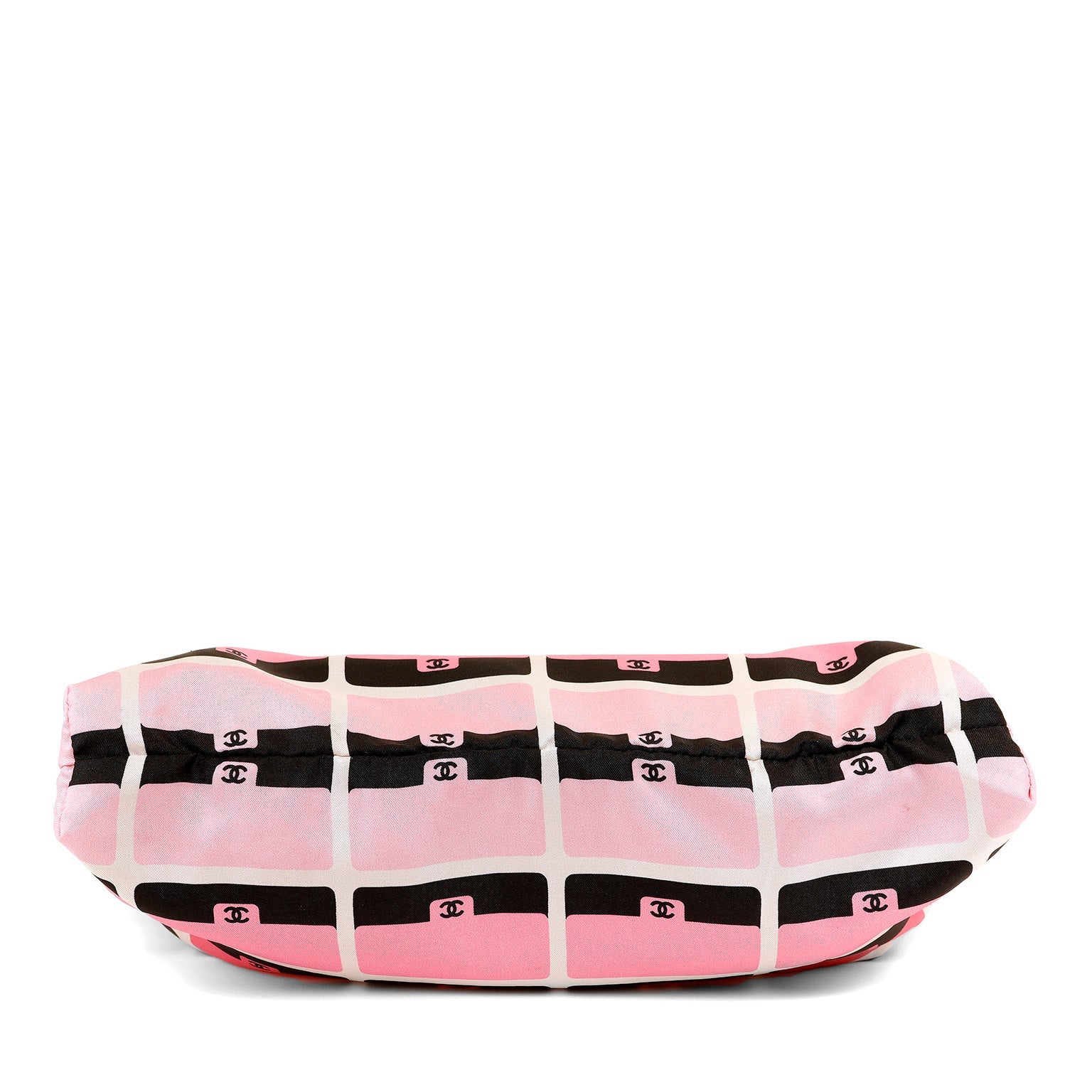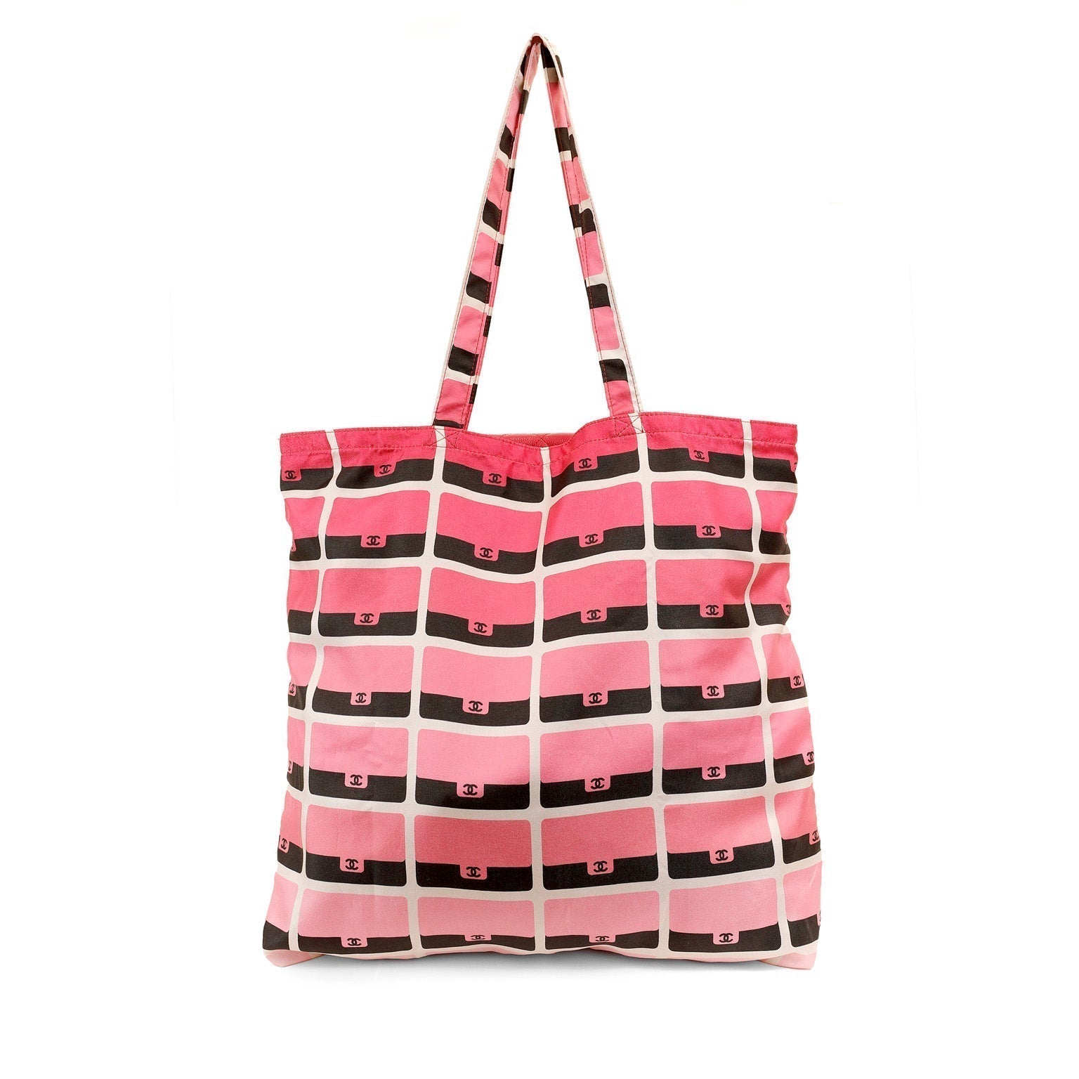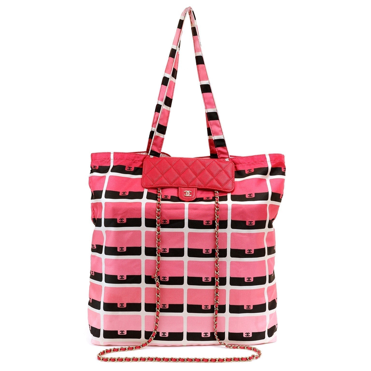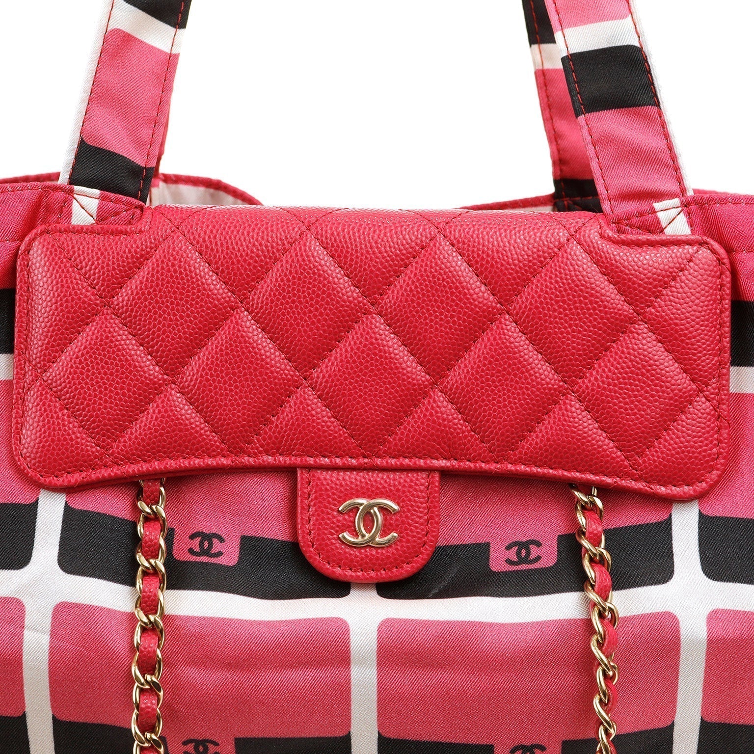 Vivid magenta pink caviar leather WOC is textured and durable. Quilted in signature Chanel diamond pattern with gold hardware accents. Pink gradient CC geometrically patterned tote unfolds and allows for shoulder carry. Dust bag included.