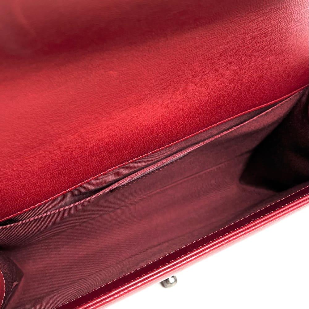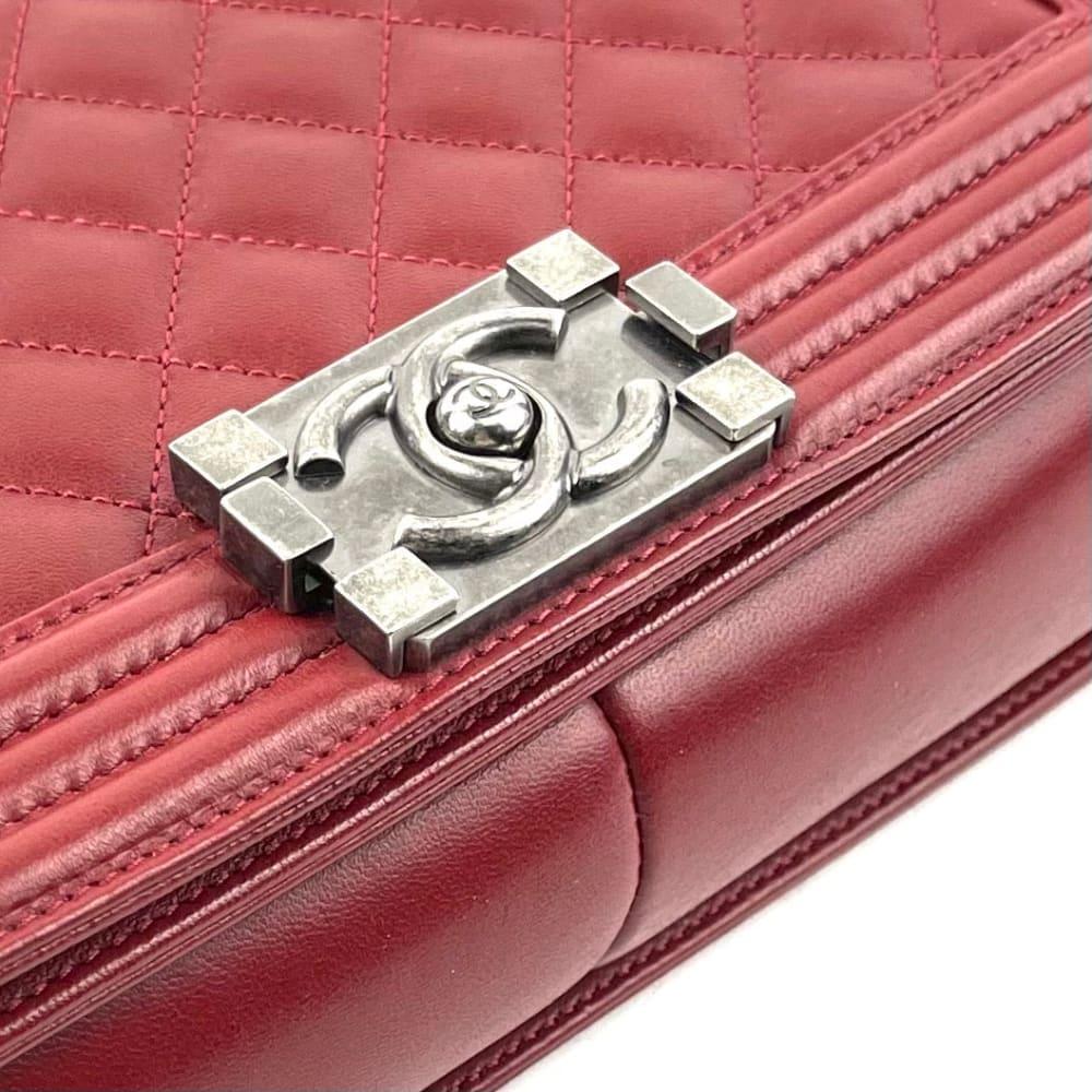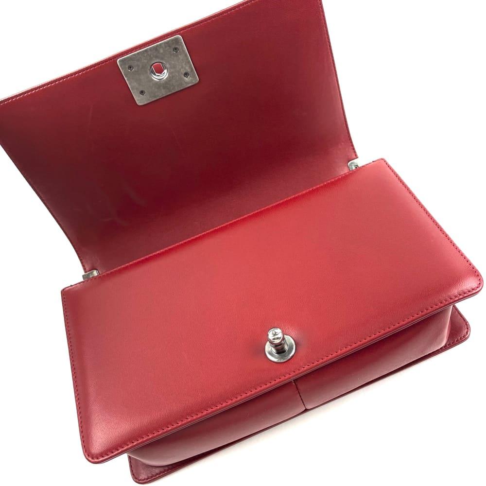 Red quilted leather Chanel Medium Boy bag with silver-tone hardware, convertible chain-link shoulder strap featuring leather shoulder guard, tonal grosgrain lining, single interior slit pocket and CC push-lock closure at front flap. Includes dust bag and . (18261490)