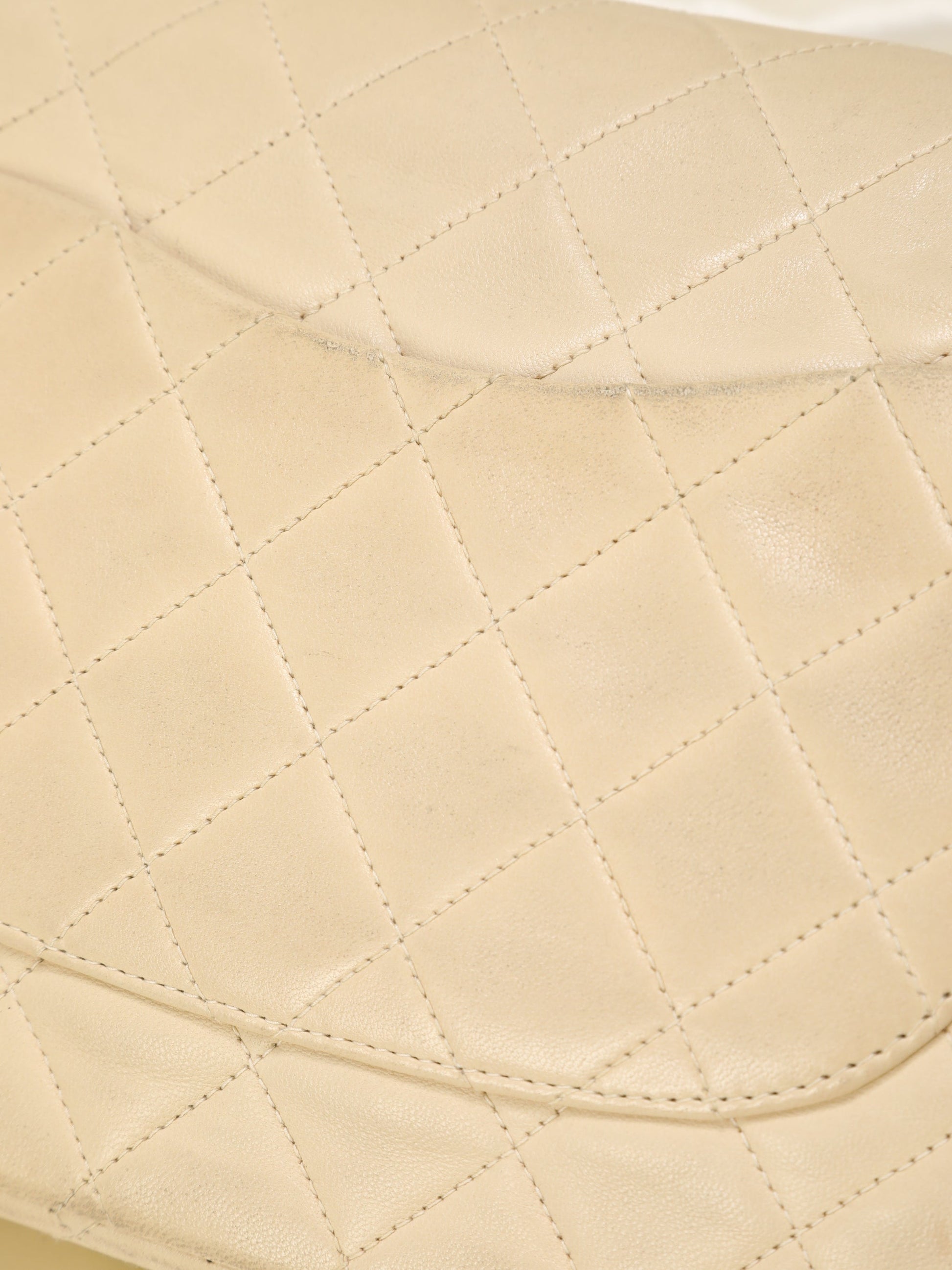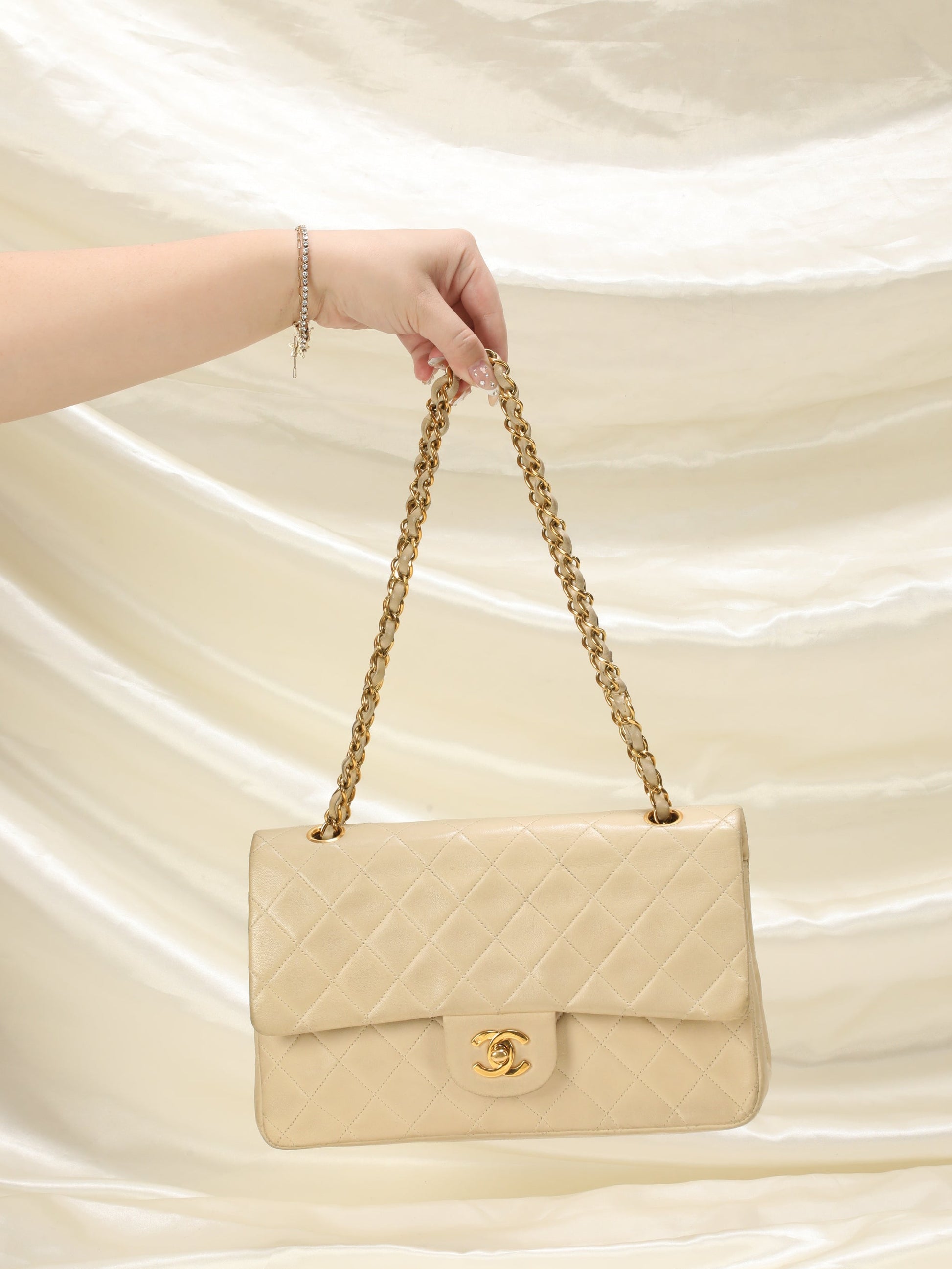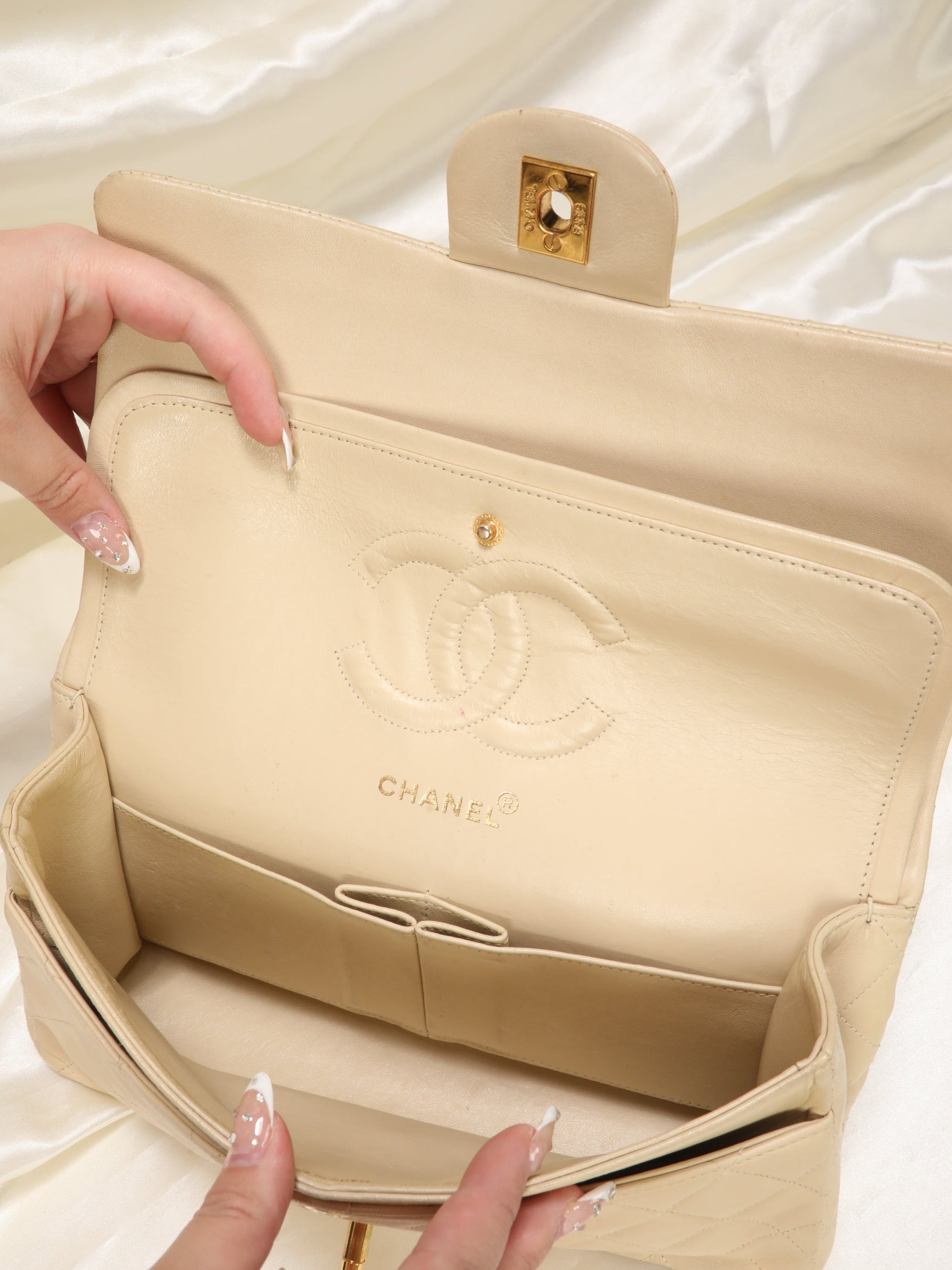 Bringing to the shop a stunning, soft classic beige Lambskin Chanel flap. New investment piece that?can be loved for years to come. Vintage Chanel crafted in the 90's= 24k hardware and soft buttery lambskin. Don't miss out on this gorgeous find. Can be as a long or short shoulder bag.