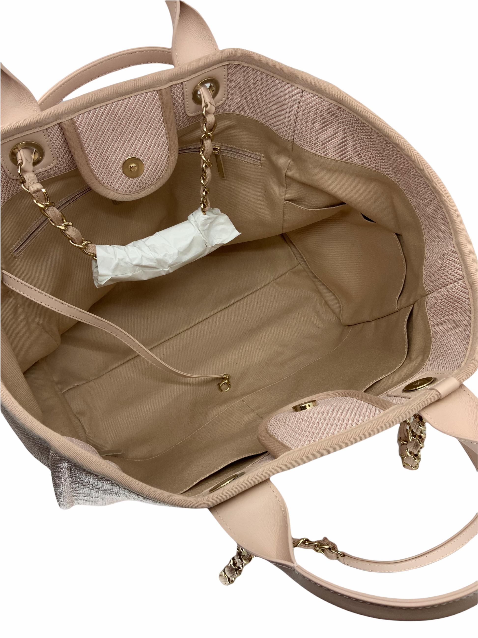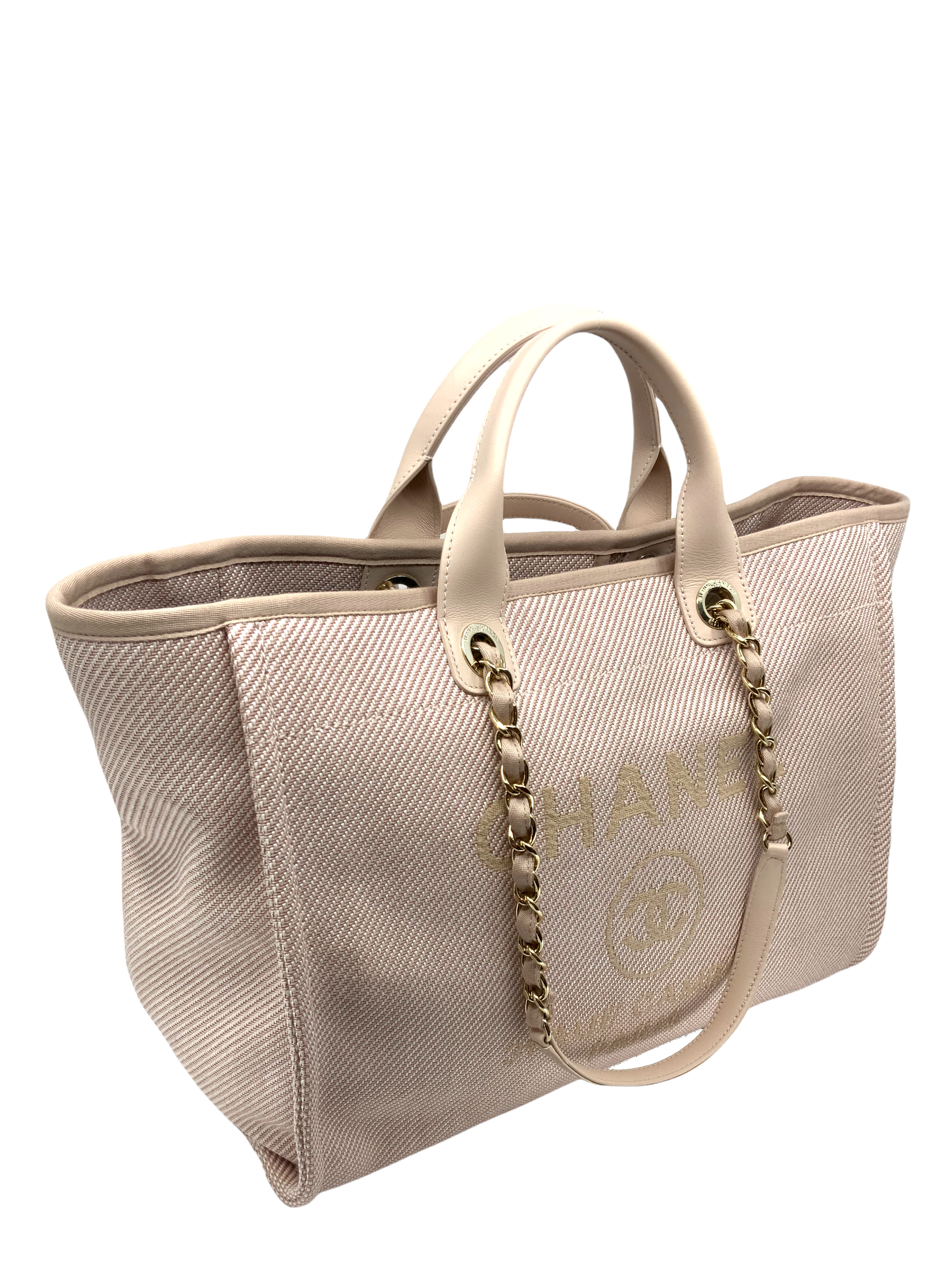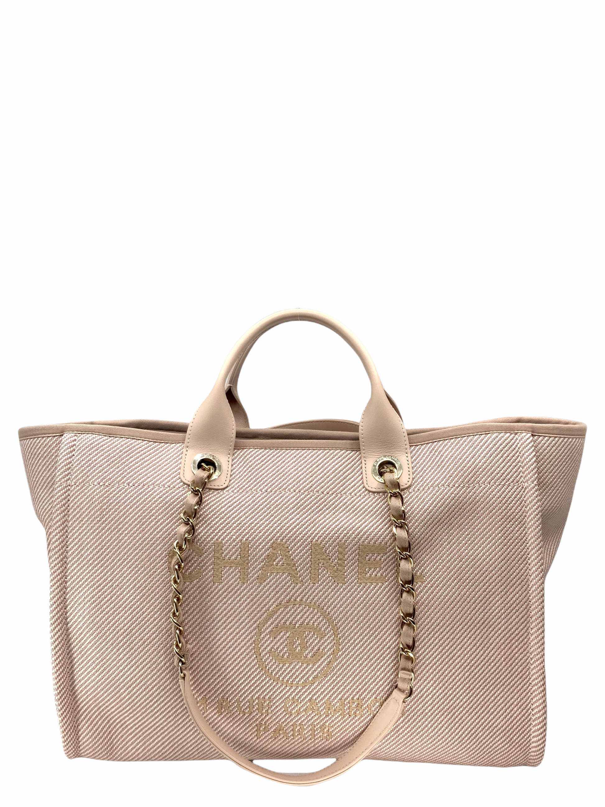 We the ity of this BRAND NEW, never before usedCHANEL Medium Deauville Tote Bag NEW 2020 or your .This chic and functional tote has a sleek design and is beautifullycrafted frompink and white canvas with a tan signature 'CHANEL' logo front and center.Featuring a gold-tone chain link strap with a Shop designer handbags by Chanelat.