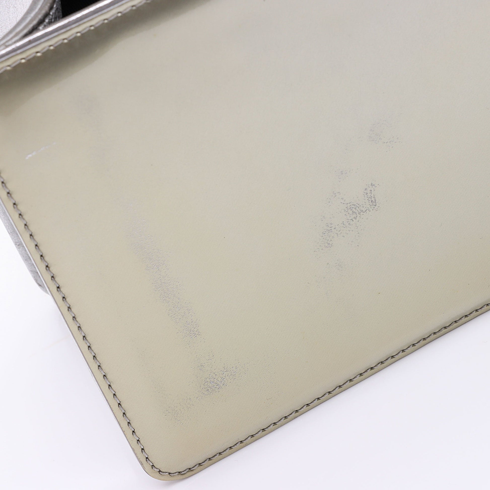 Condition Notes: Visible marks and discoloration to exterior bottom corners. Light marks and scuffs throughout exterior. Visible creasing and wear throughout shoulder strap. Surface scratches to hardware. Visible color transfer to interior front patent leather from flap. Scuffs and minor creasing throughout interior flap. Minor marks and wear throughout interior.