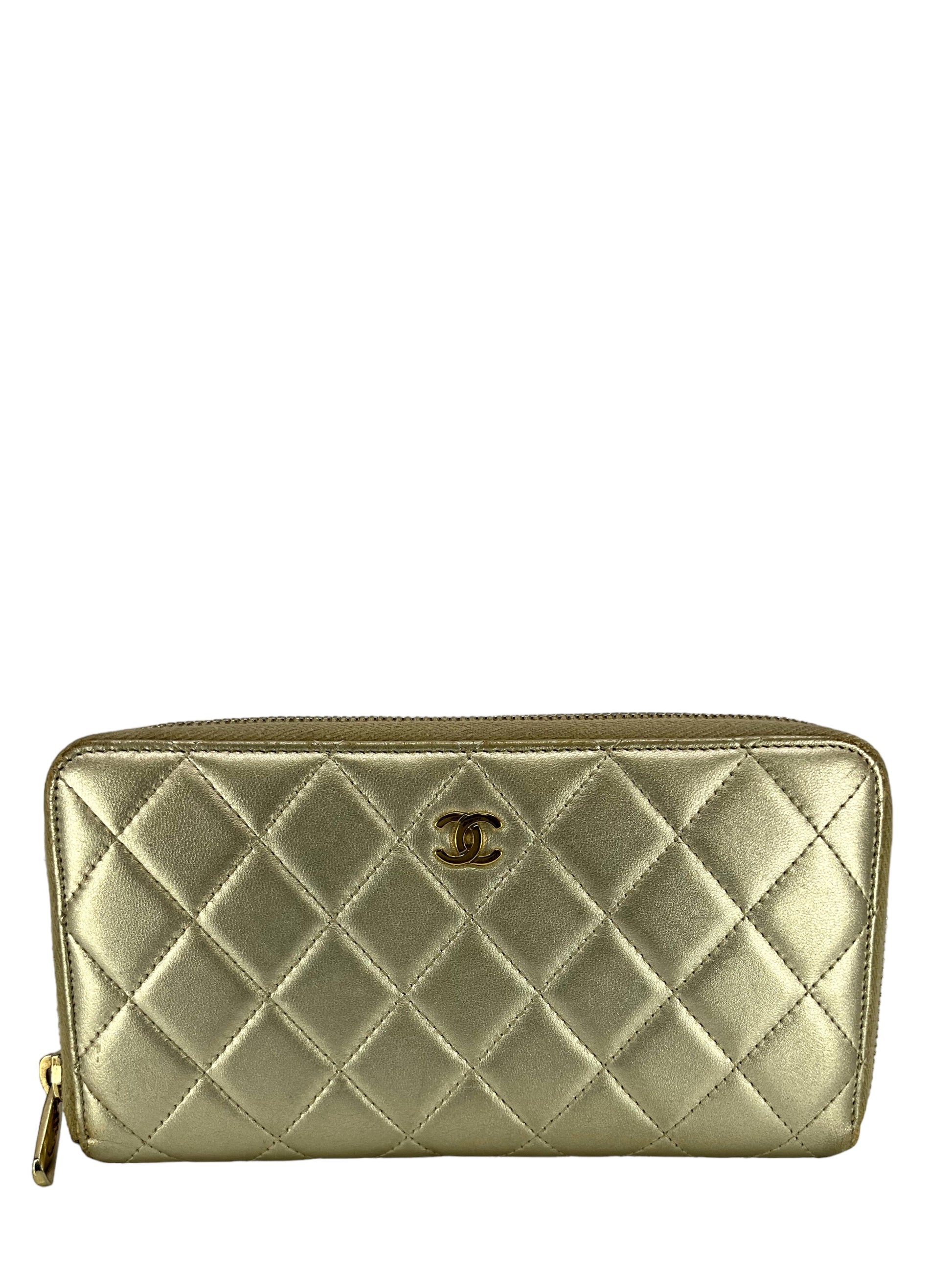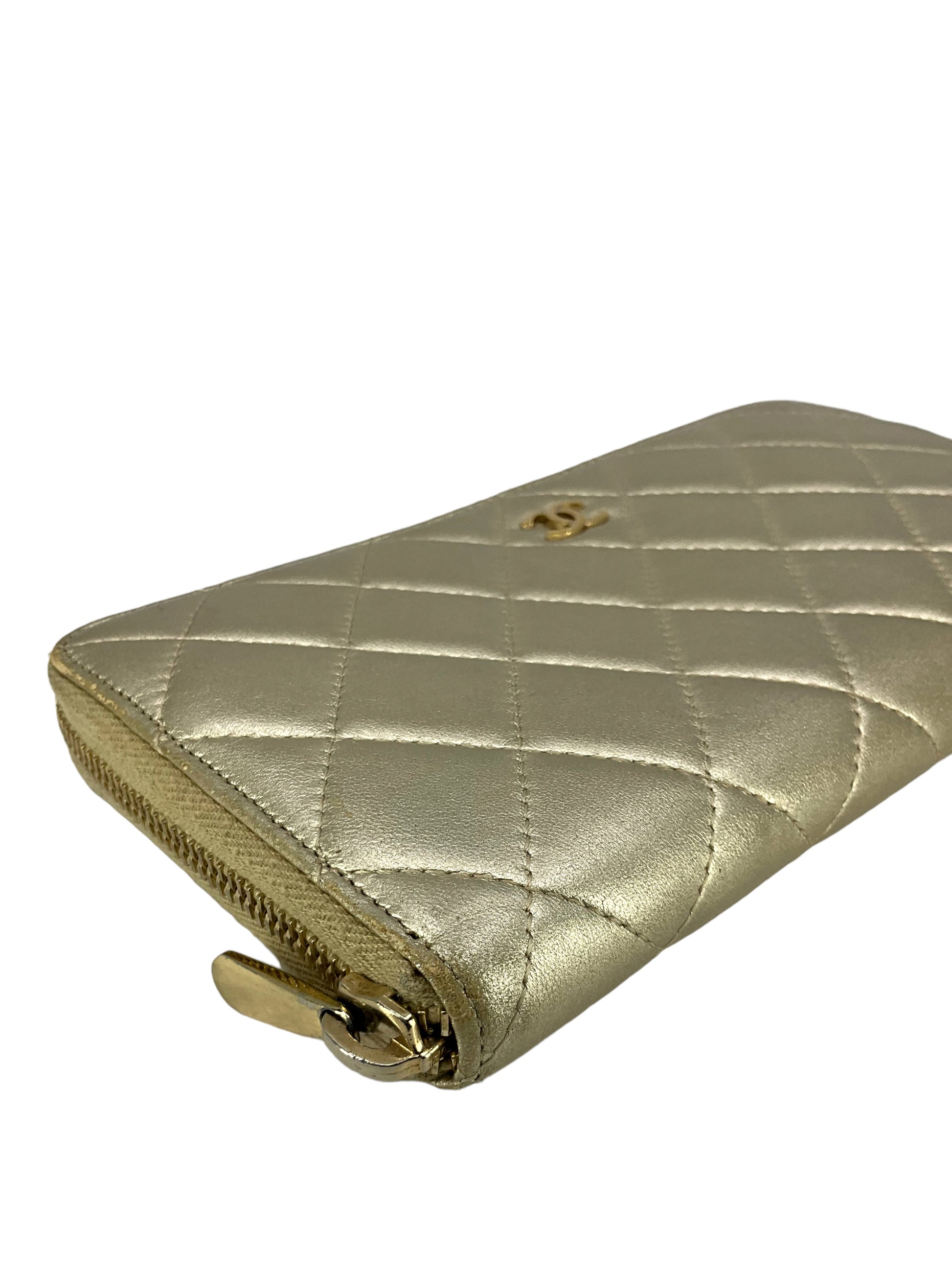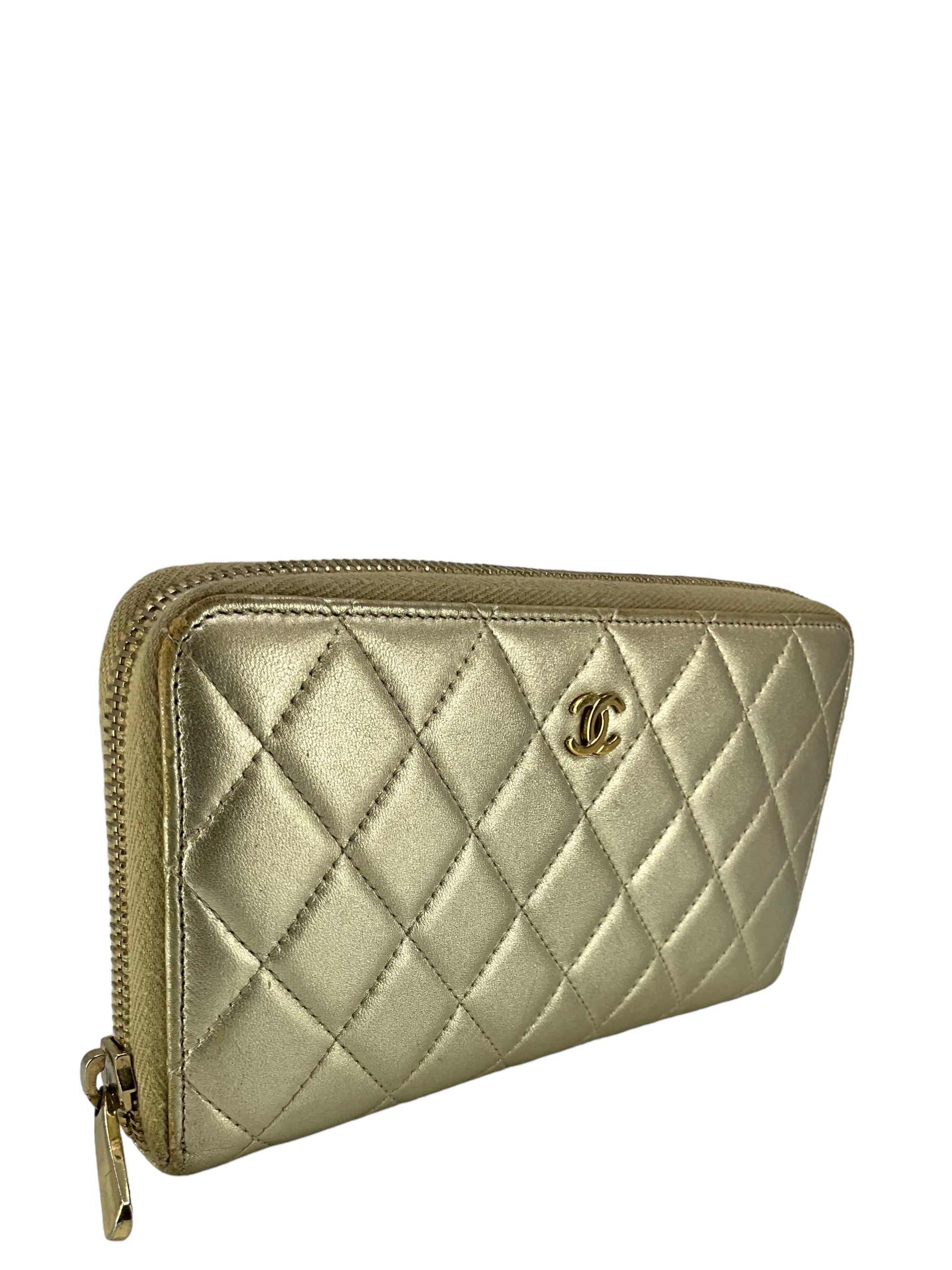 Organize your essentials like bills and credit cards in style with this d CHANEL Metallic Quilted Lambskin Long Zip Around Wallet crafted from quilted metallic gold leather with a signature gold-tone 'CC' logo at front.