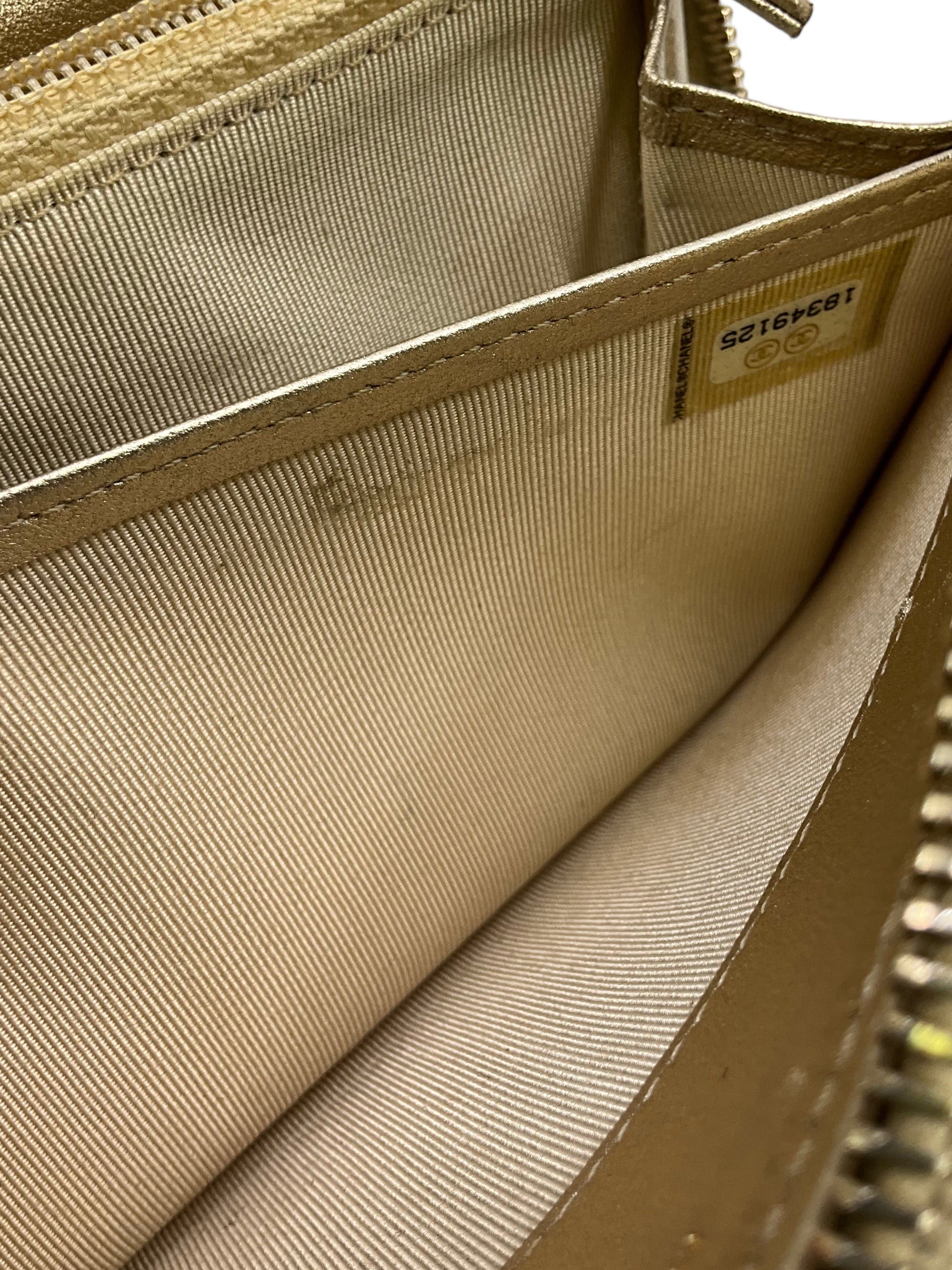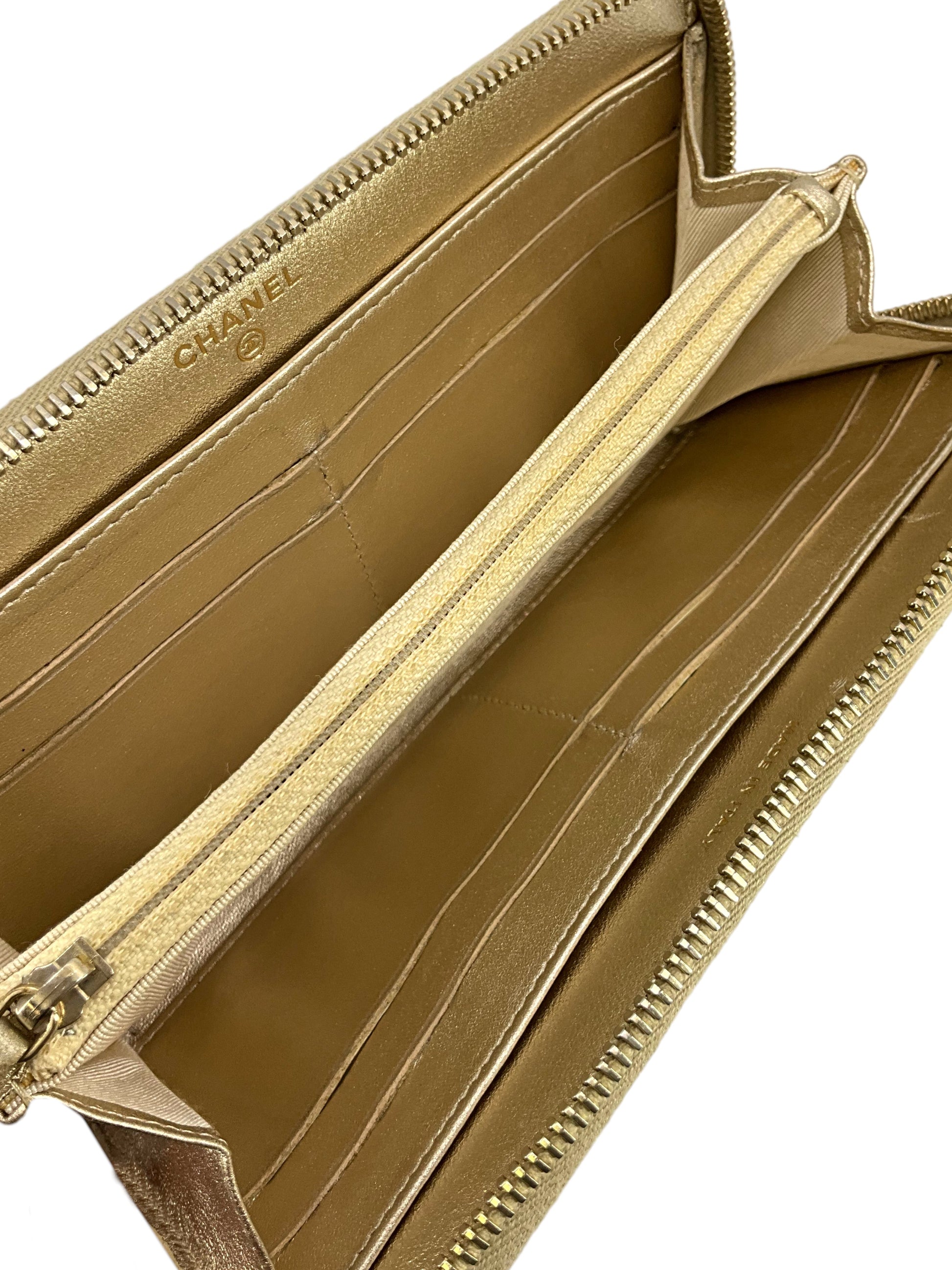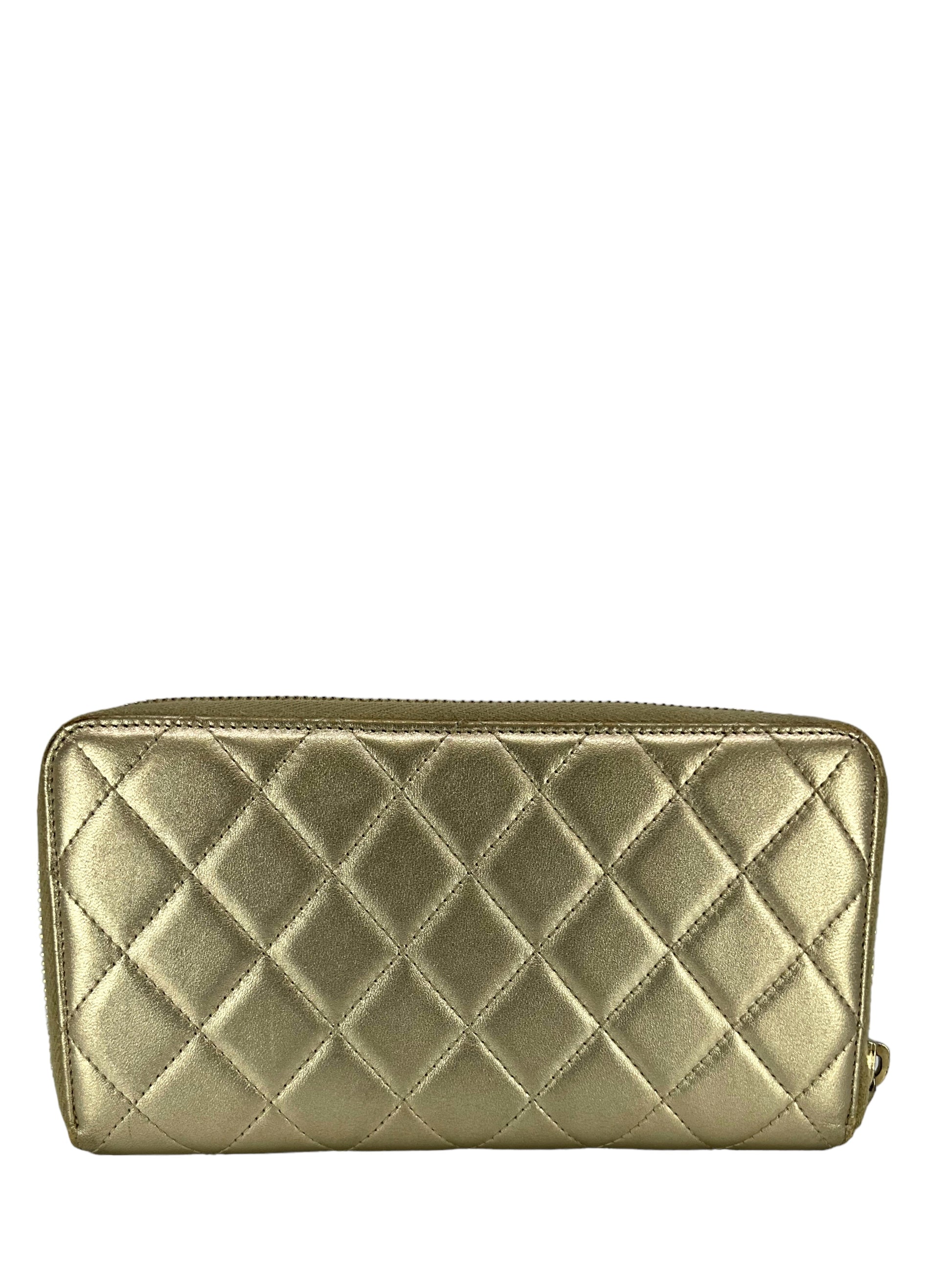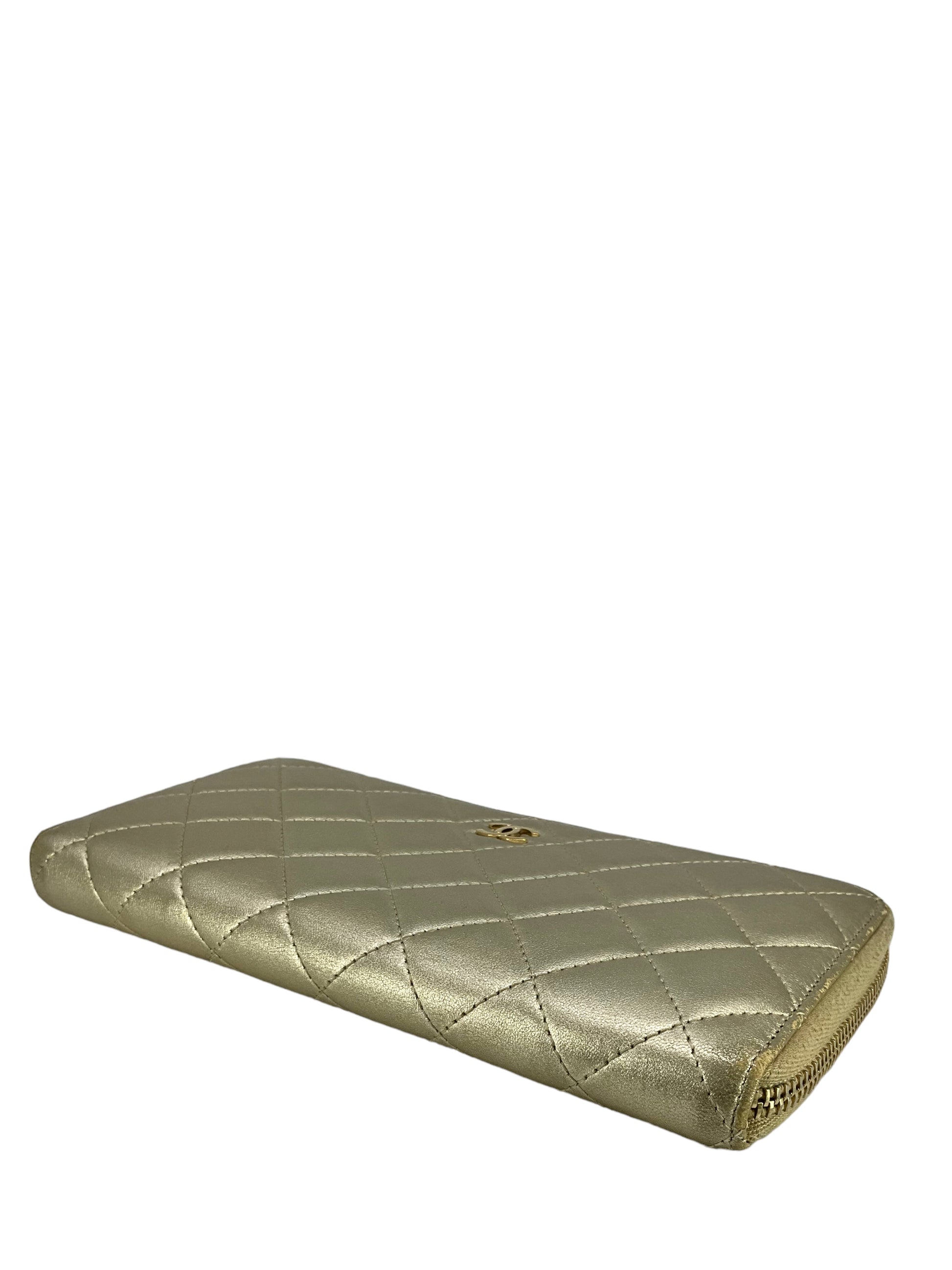 Organize your essentials like bills and credit cards in style with this d CHANEL Metallic Quilted Lambskin Long Zip Around Wallet crafted from quilted metallic gold leather with a signature gold-tone 'CC' logo at front.