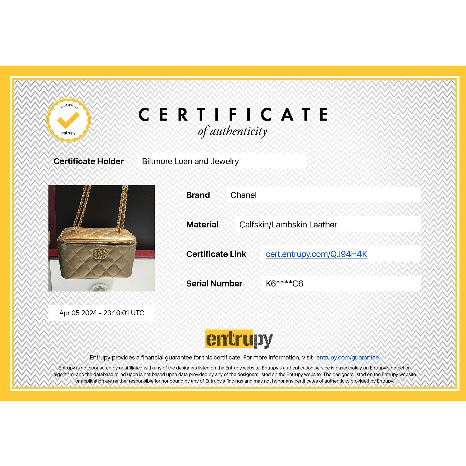 The Chanel Metallic Quilted Lambskin Small Dynasty Vanity Case is an elegant and exclusive piece from the designer brand. Crafted from metallic gold quilted lambskin leather, this vanity case exudes luxury. The dual zipper opens to a gold leather interior with practical features such as a mirror, card slots, and lipstick holder. Made in Italy, this case is a sophisticated and tasteful addition to any collection.