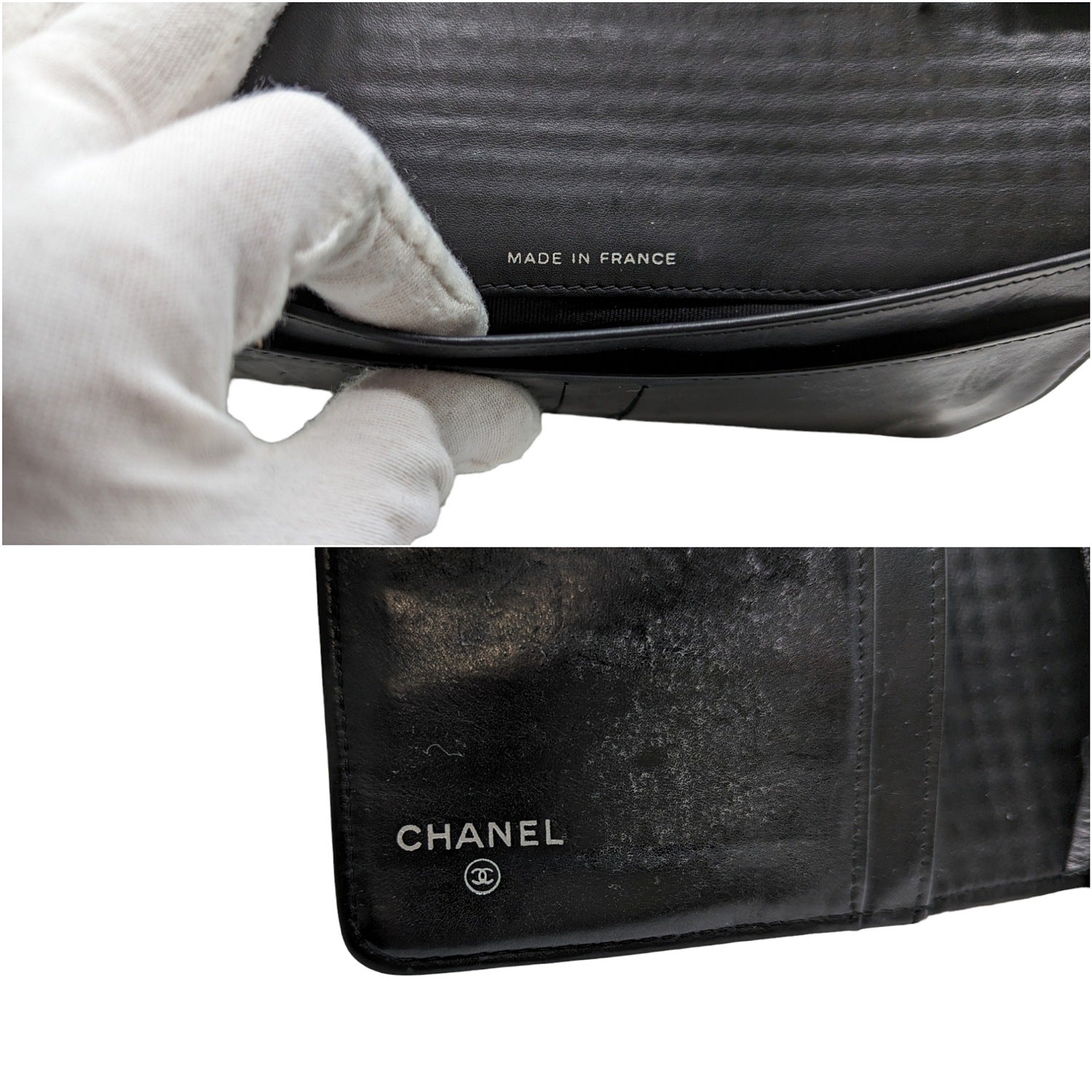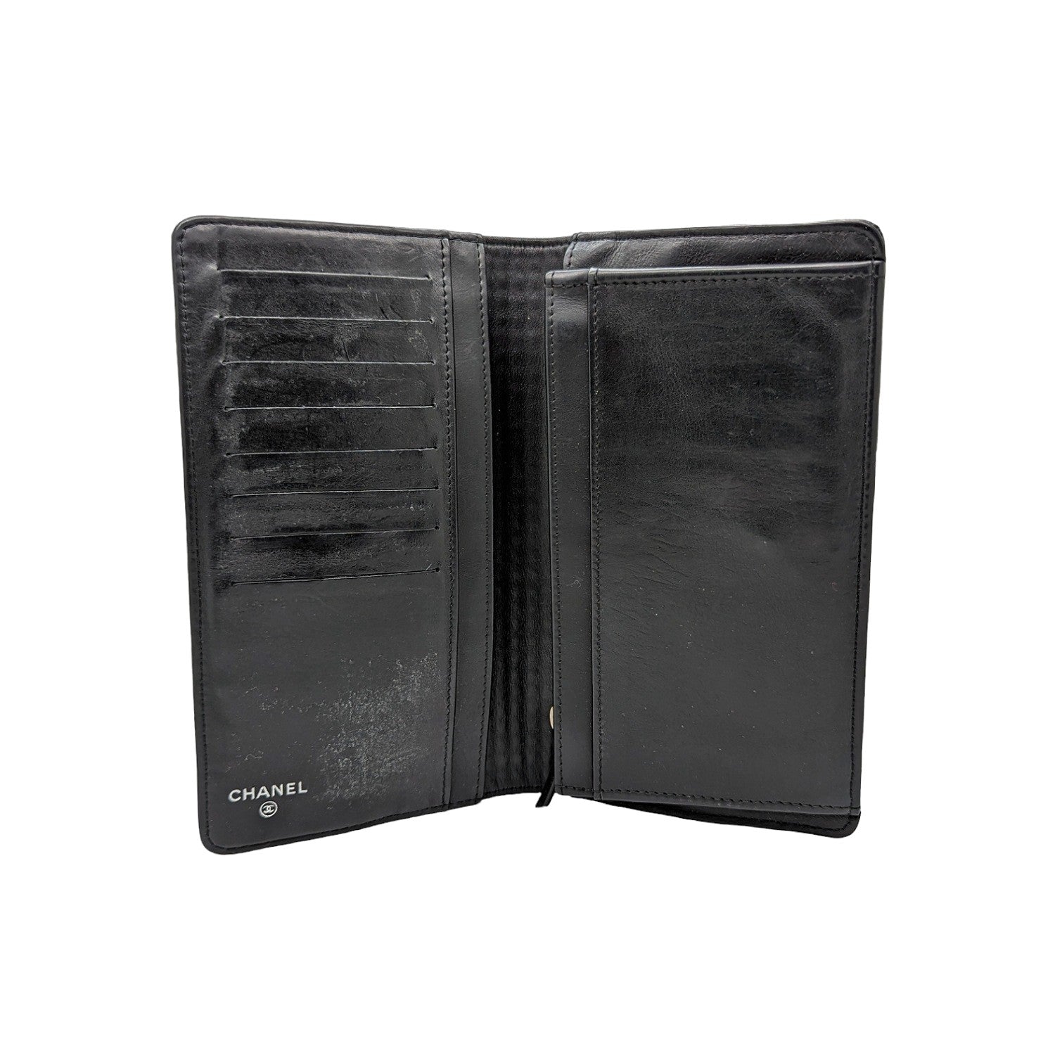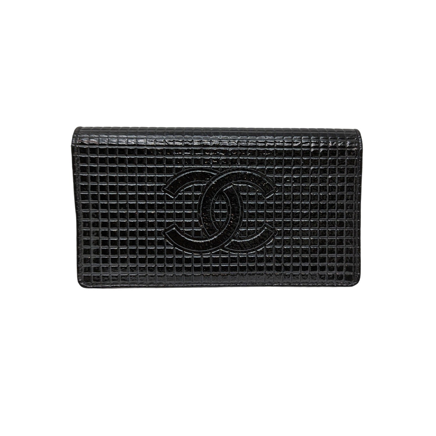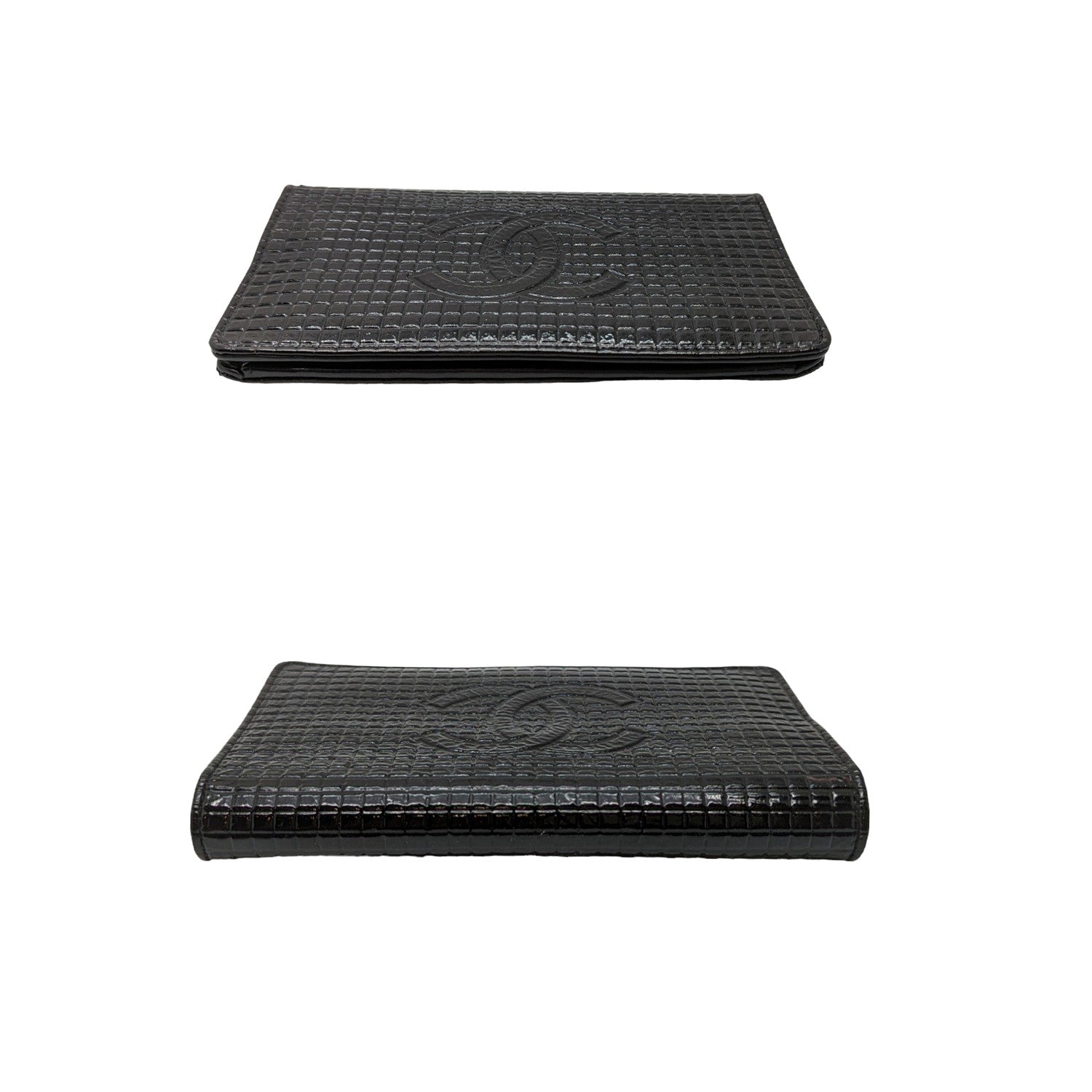 Chanel Micro Chocolate Bar Coco Mark Long Wallet by Karl Lagerfeld. Crafted of black patent leather with interlocking CC logo at front face, flap closure that opens to a tonal leather lining with plenty compartments, pocketsand card slots. Made in France.