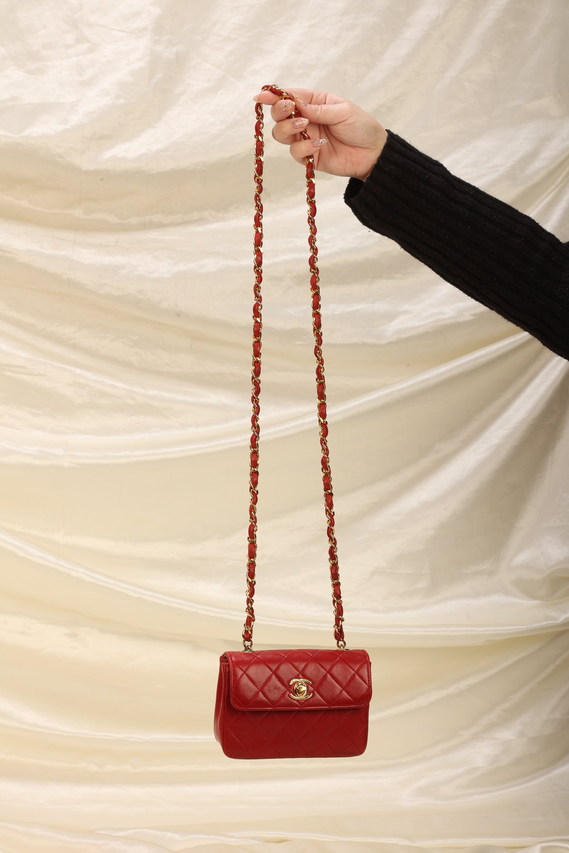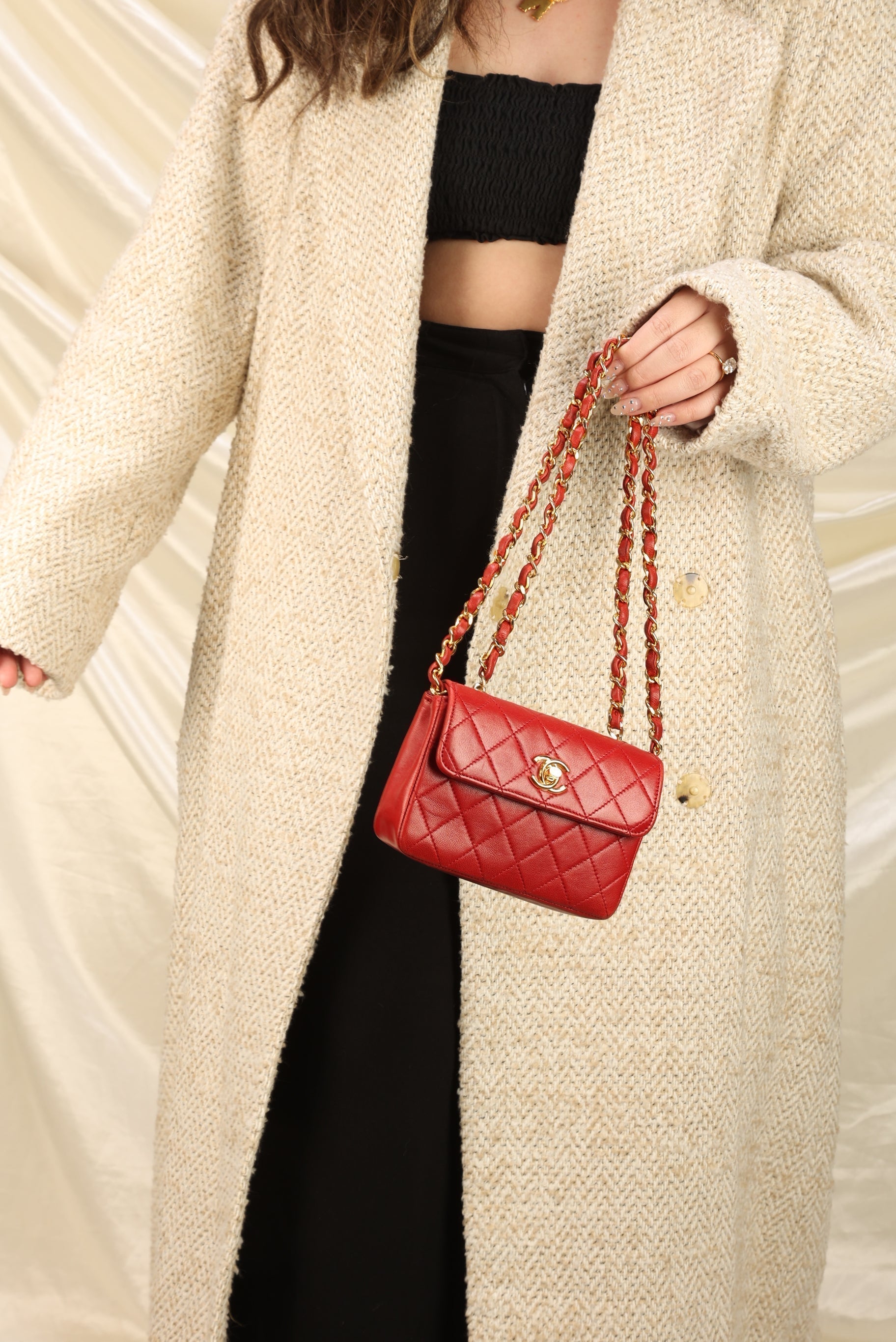 A mini vintage Chanel with the iconic diamond quilting and 24K gold plated turnlock logo. It's a beautiful cherry red color the perfect pop to add to any outfits. Can be as a crossbody or a double chain shoulder bag. Can fit a phone, keys, and car holder.??
