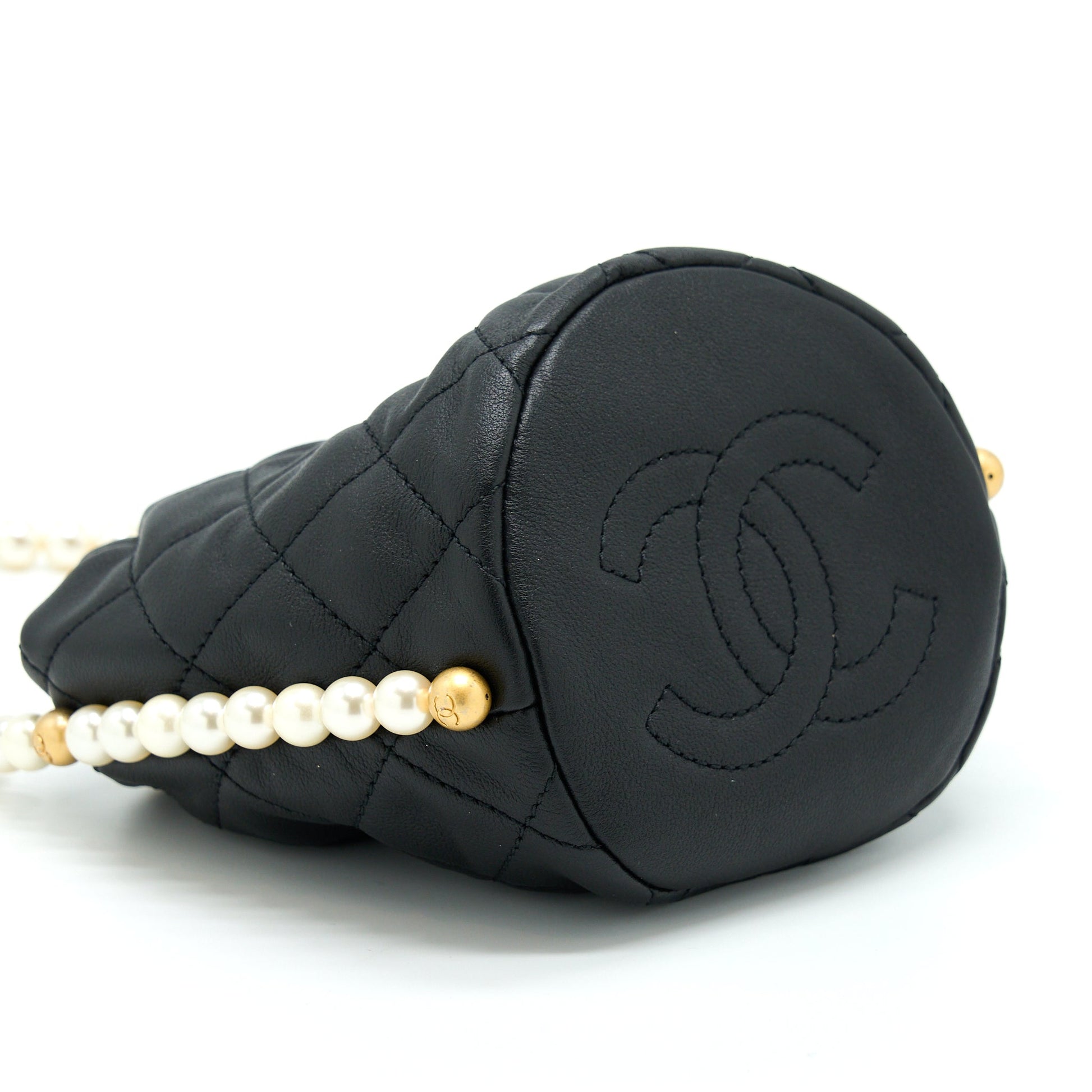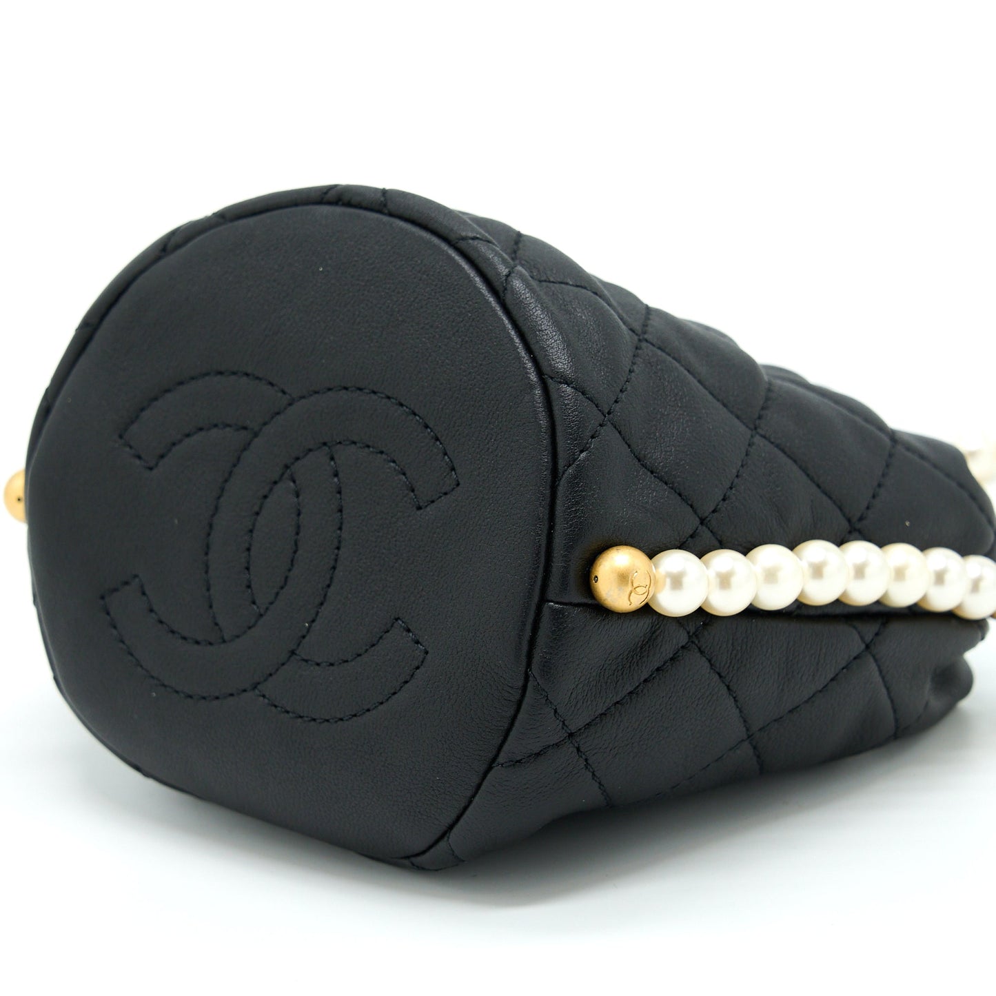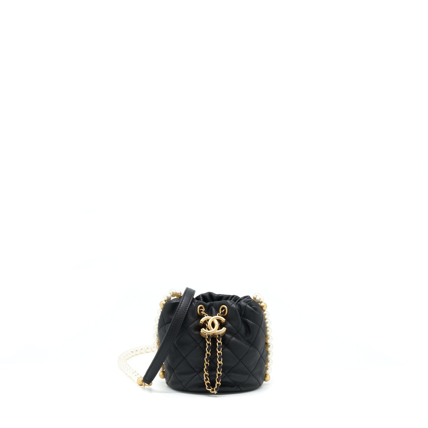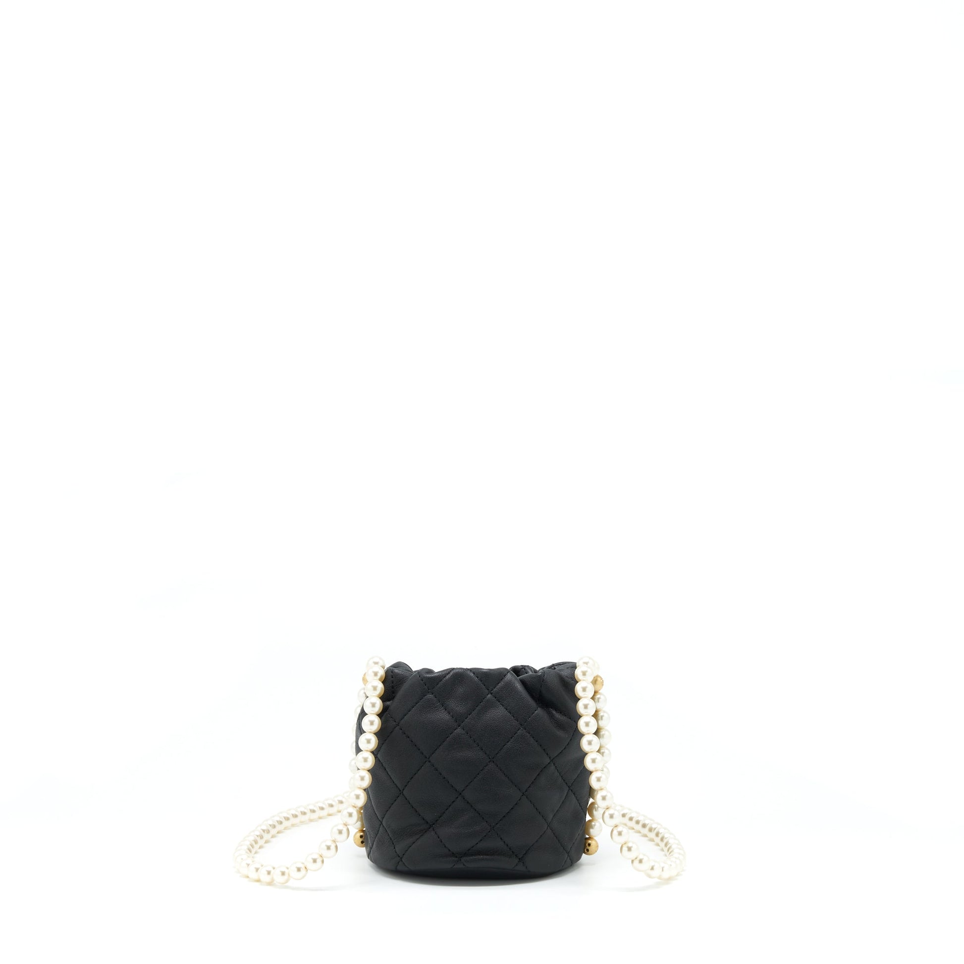 Chanel Mini Bucket Bag With Pearl Chain Lambskin Black GHW