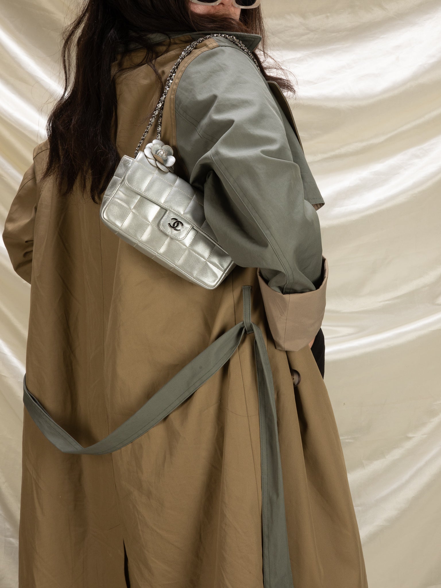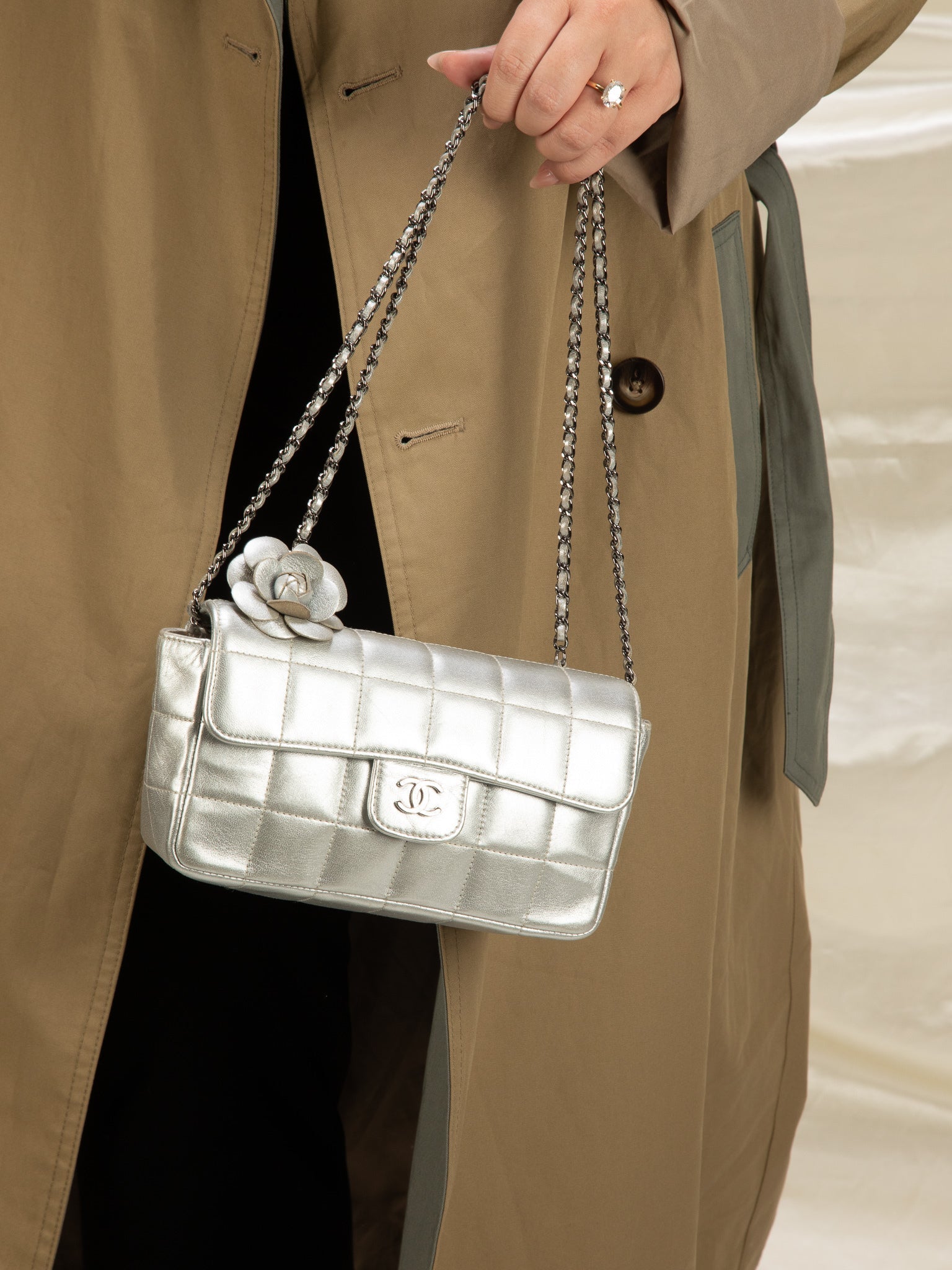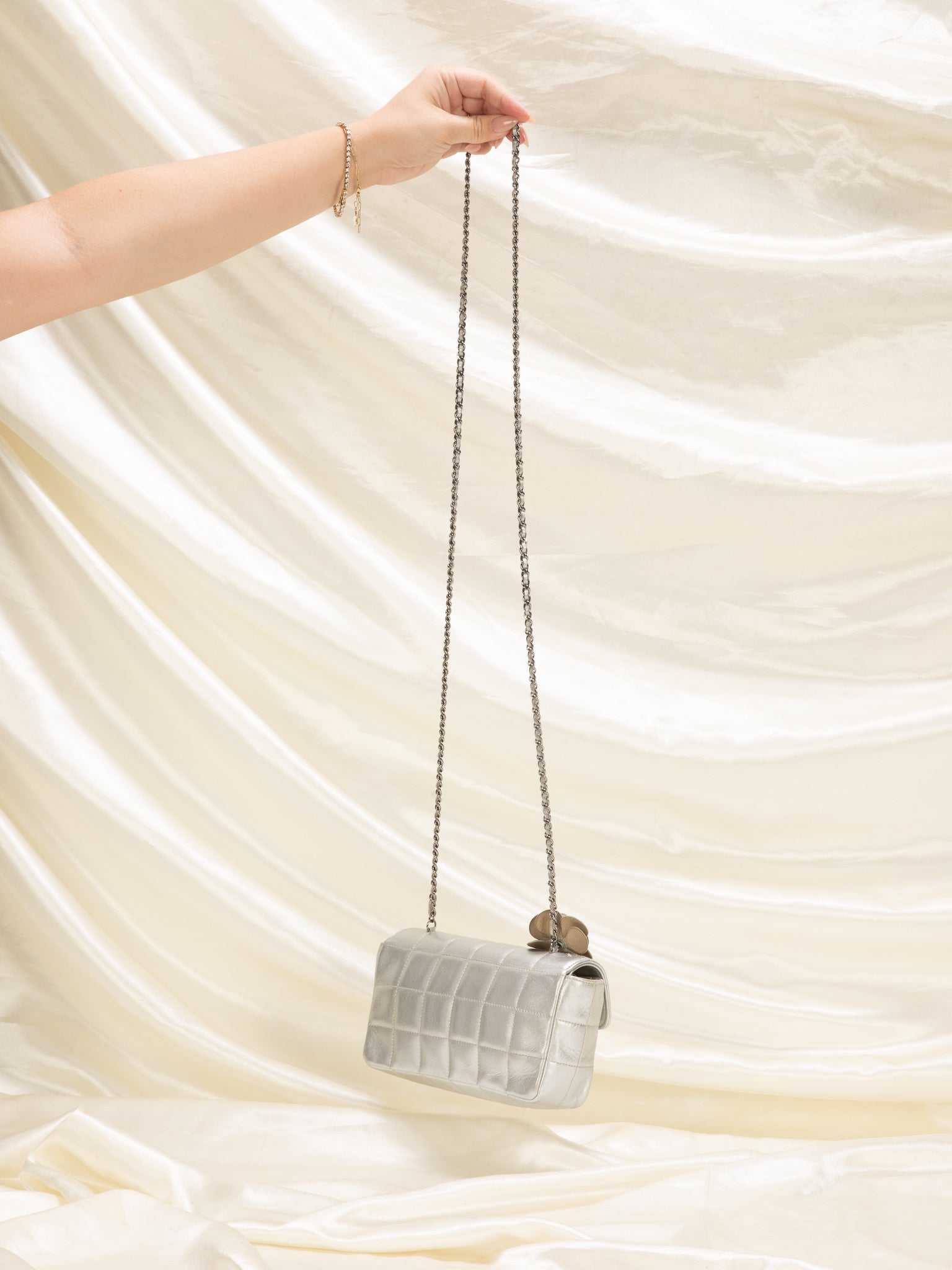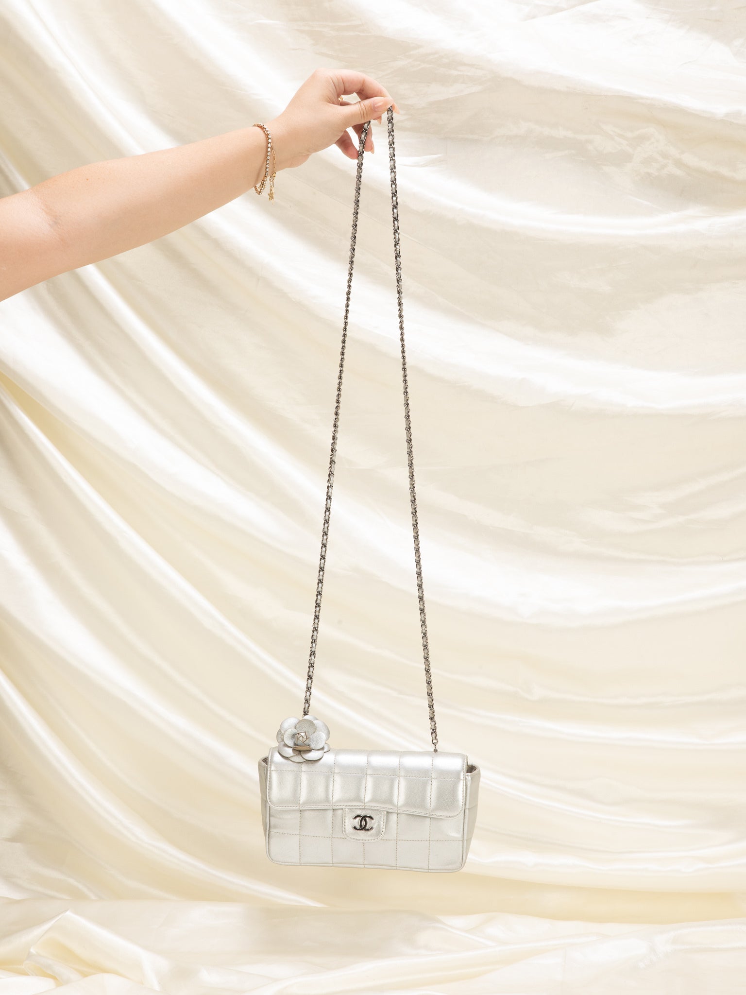 A rare mini?metallic silver Chanel Chocolate Bar adorned in the iconic CC logo. Can be easily transitioned from day to night. Perfect evening bag for the holidays coming up. What makes this bag so unique is the iconic Camellia flower featured on the bag. Can fit a phone and keys. Versatile piece that can be multiple ways! Going for 3k online.