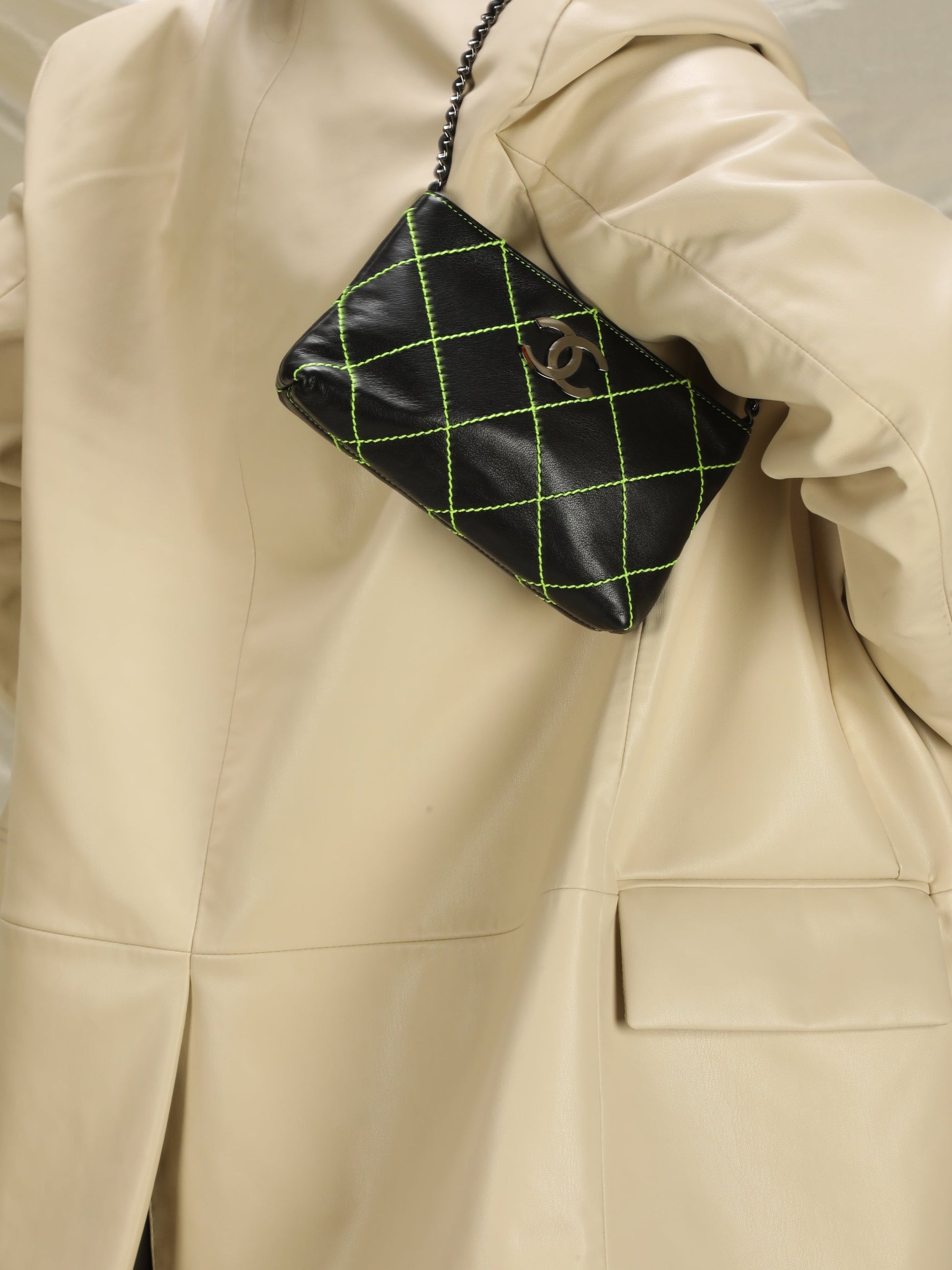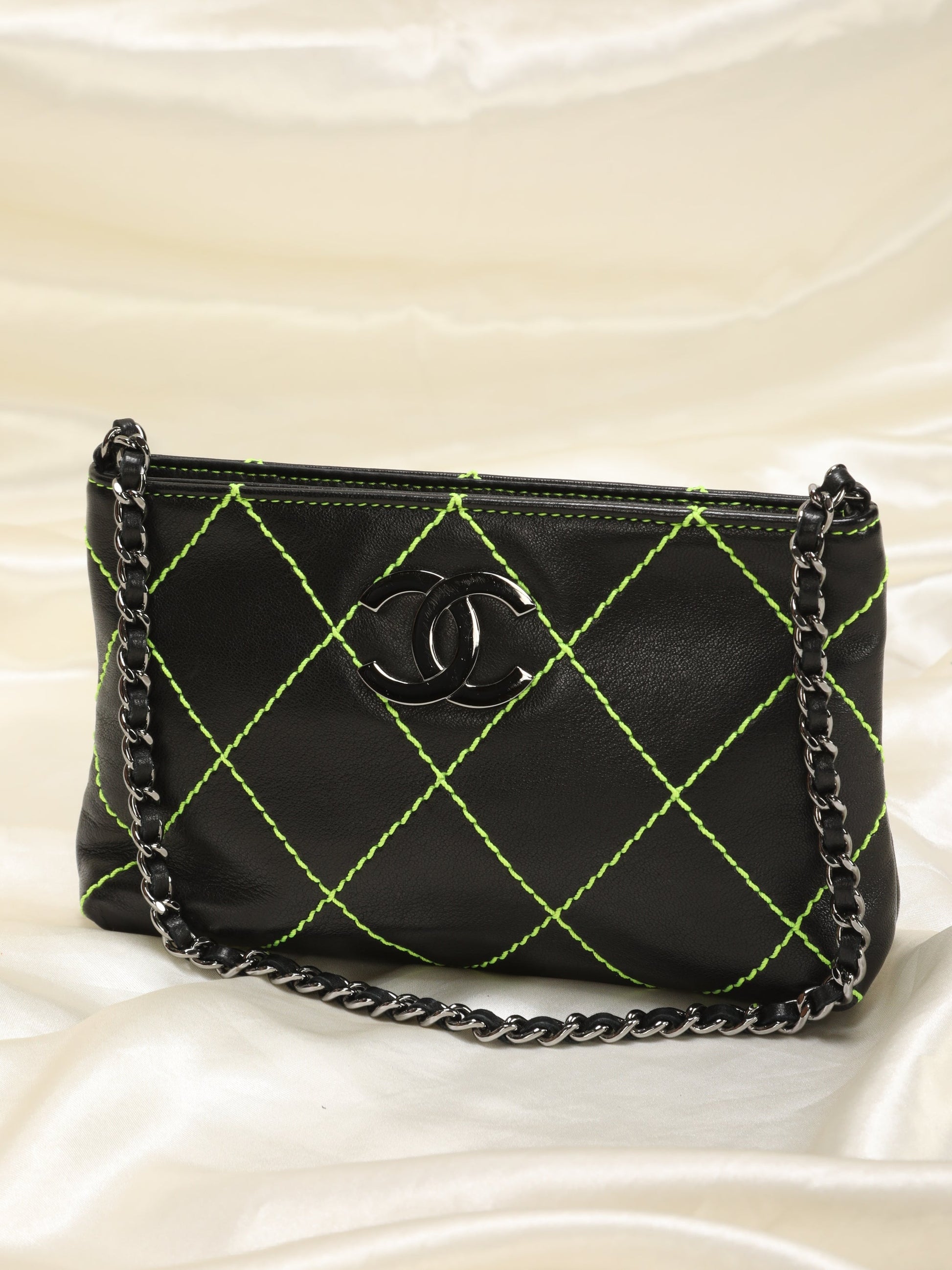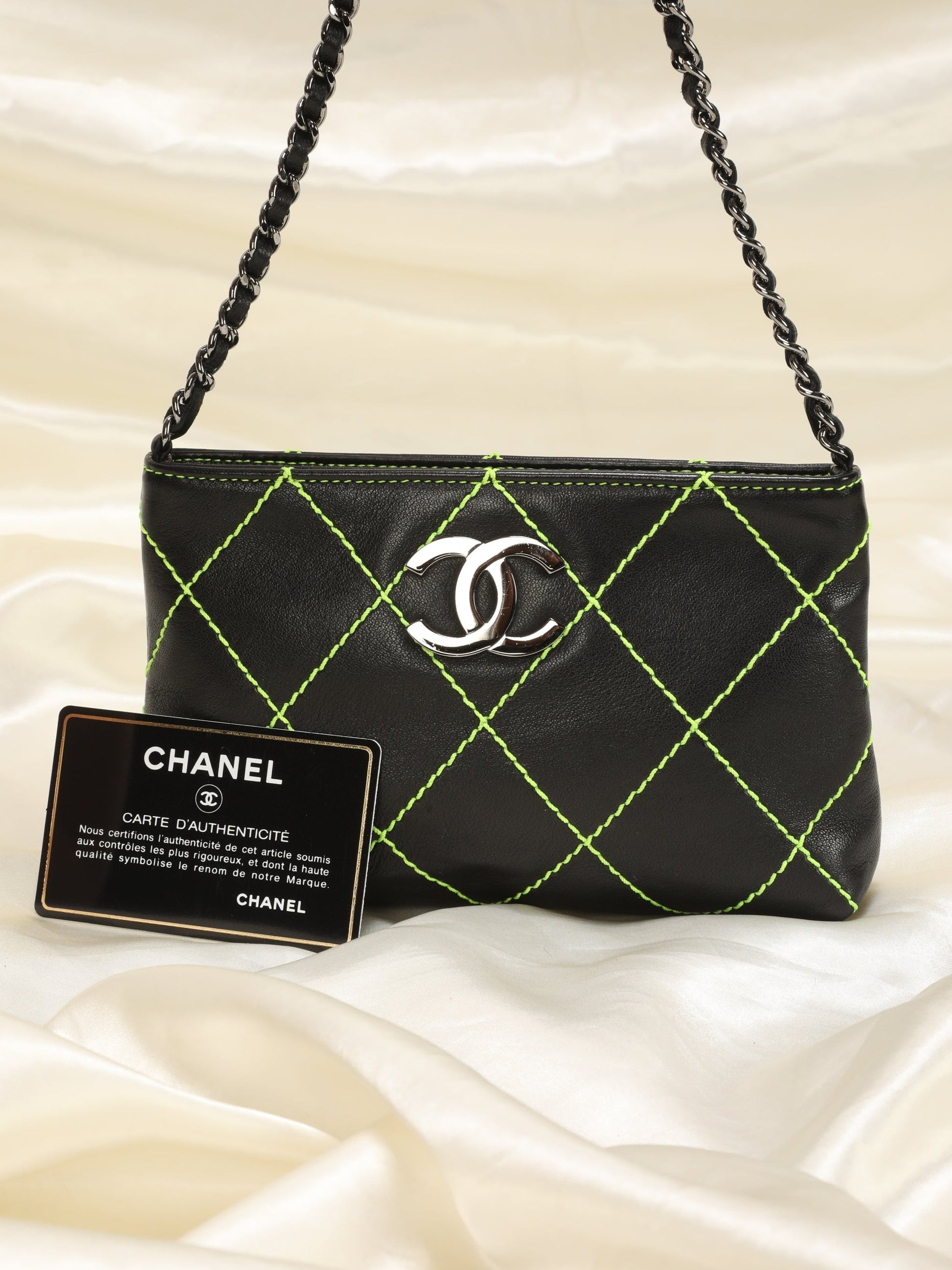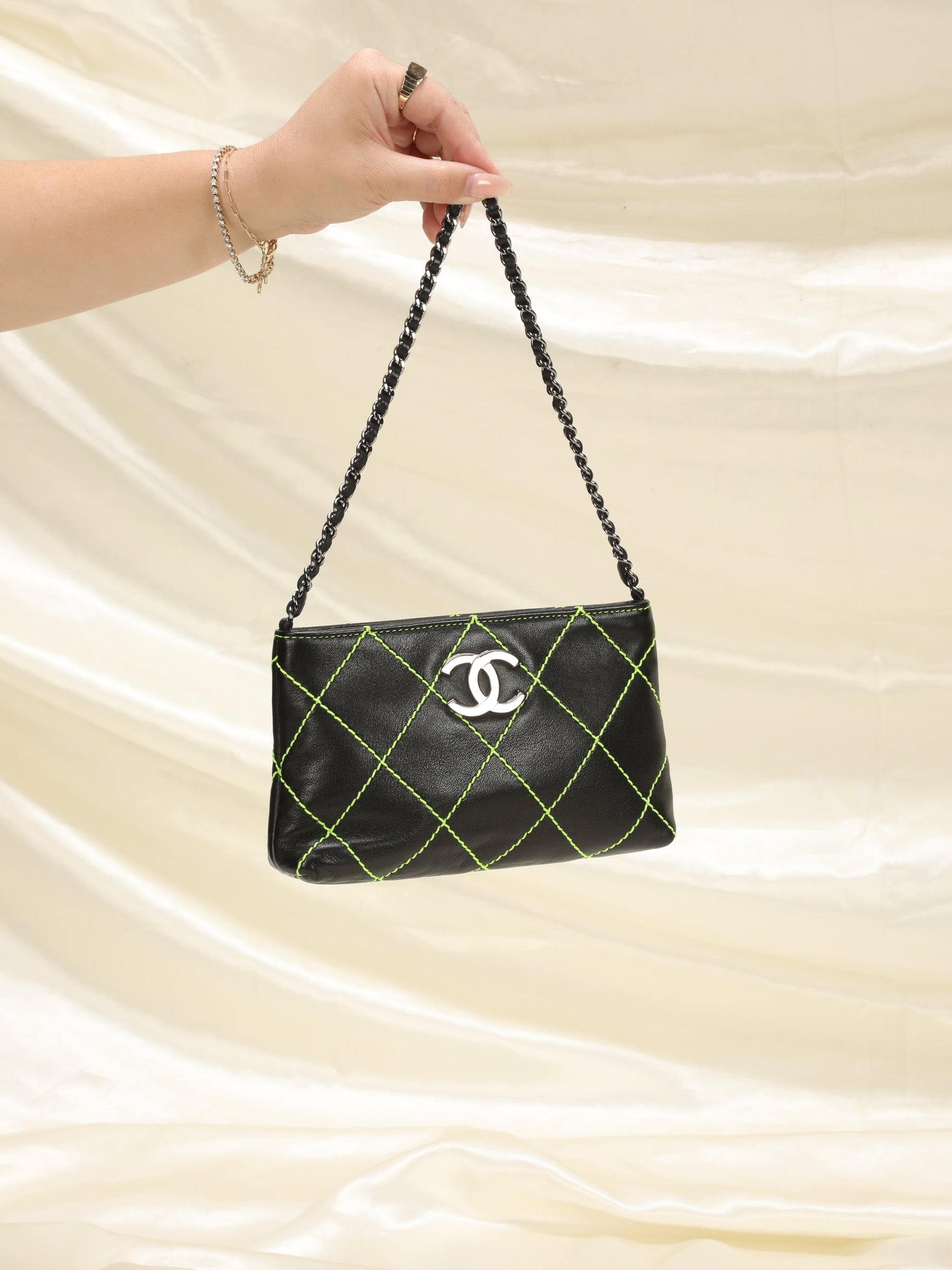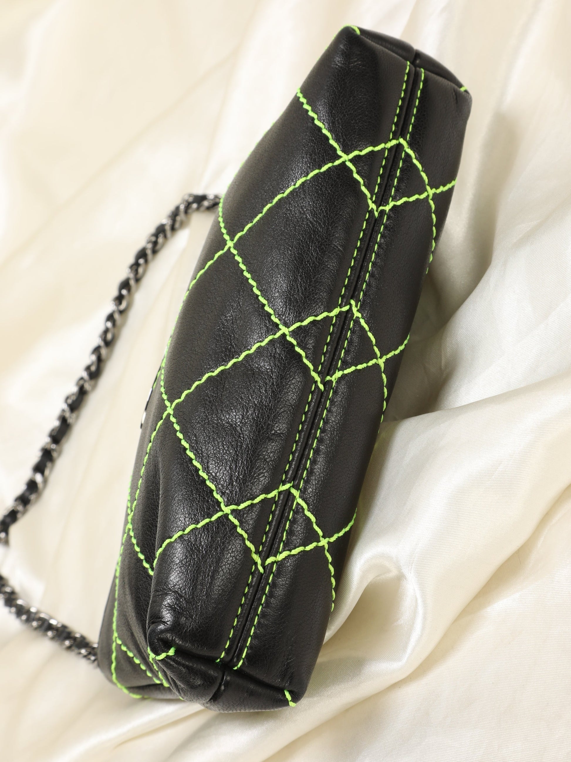 Up for grabs is a stunning Chanel Mini bag! Perfect for someone who wants the classic style but also wants a little pop of color. Neon yellow contrast stitching adorns this black lambskin piece. Large Chanel silver logo and hardware. Matching neon interior.?