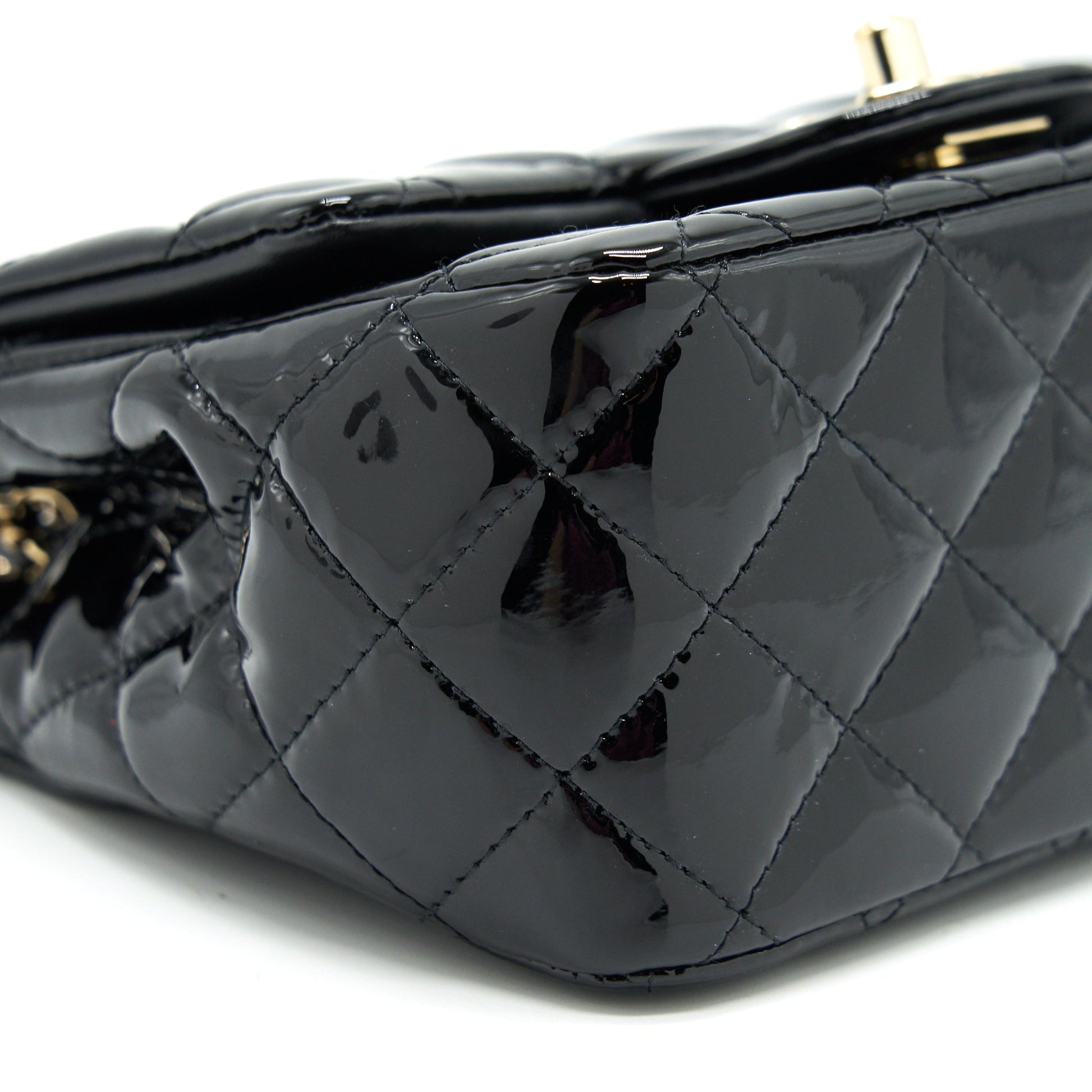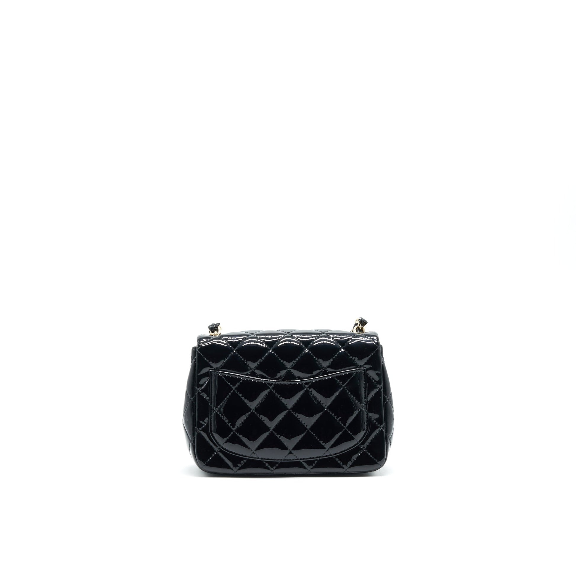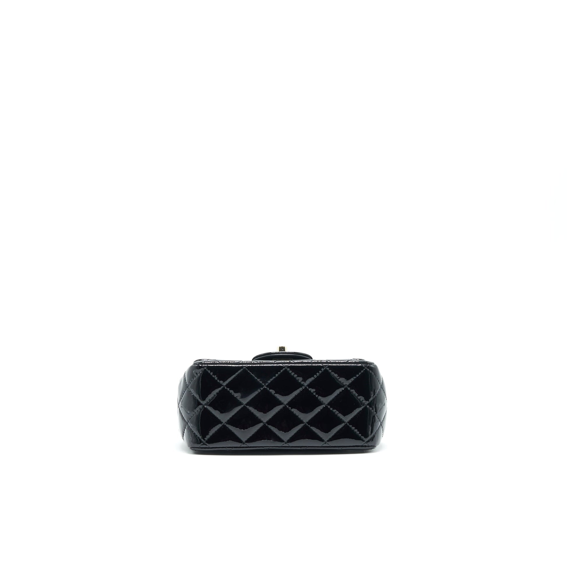 CHANEL MINI SQUARE FLAP BAG QUILTED PATENT LEATHER BLACK GHW