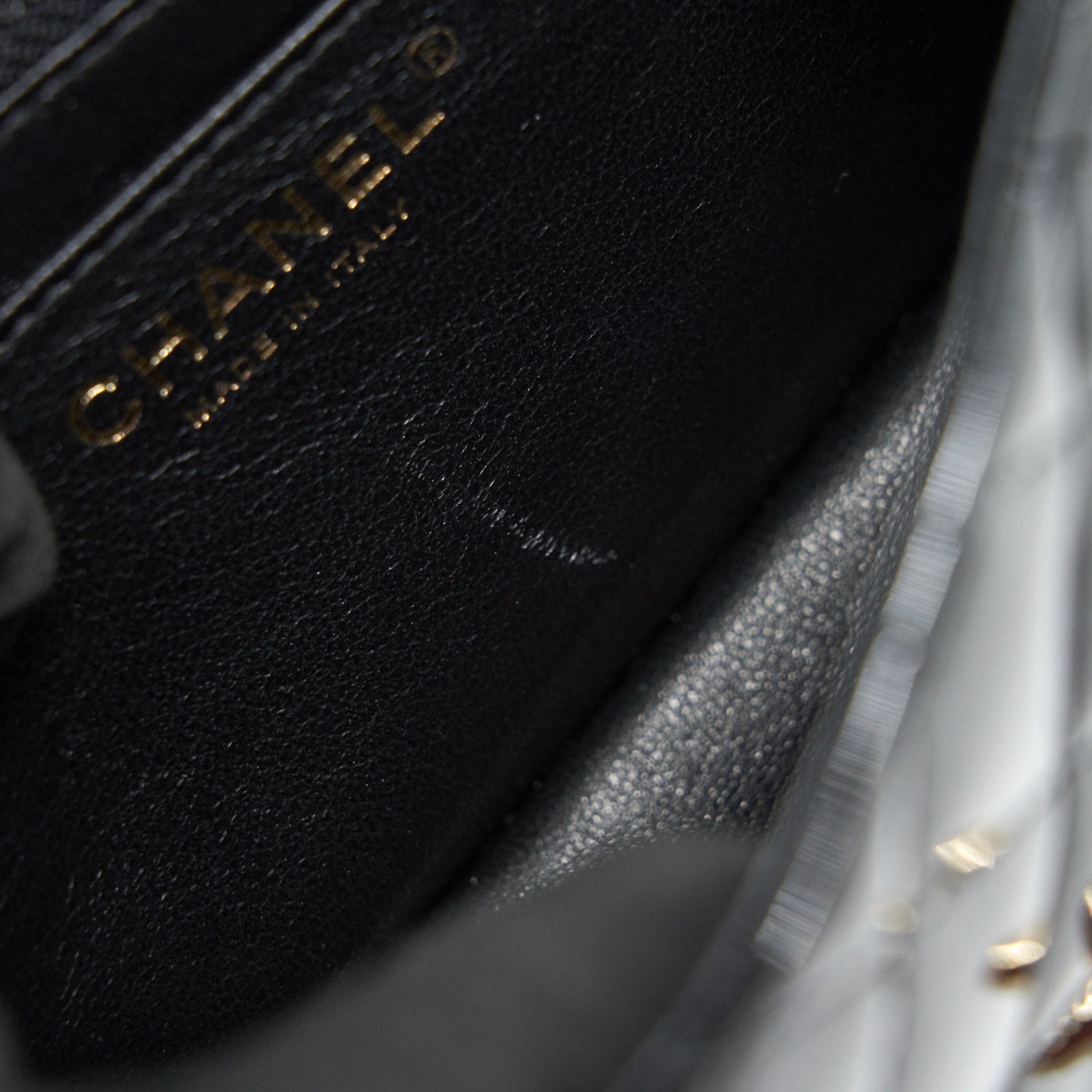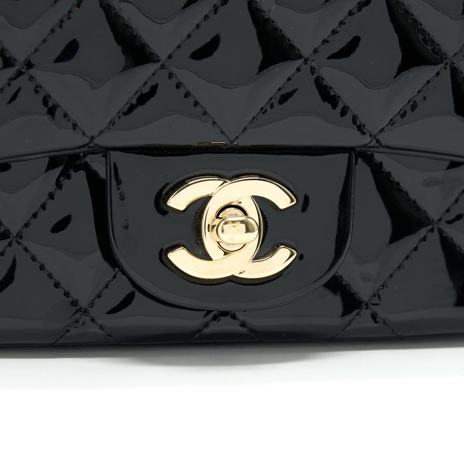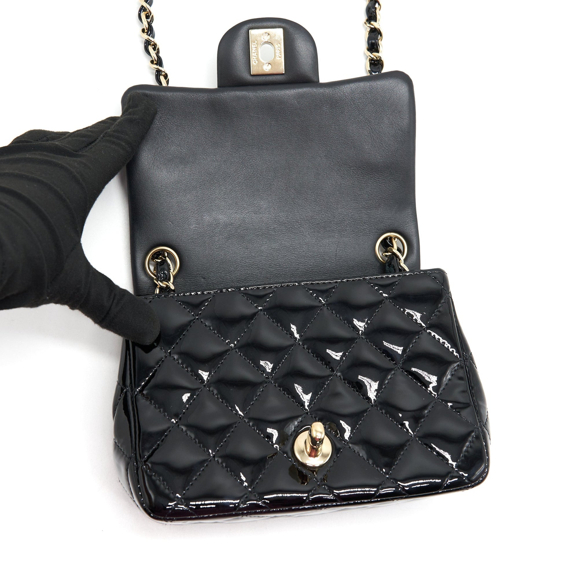 CHANEL MINI SQUARE FLAP BAG QUILTED PATENT LEATHER BLACK GHW