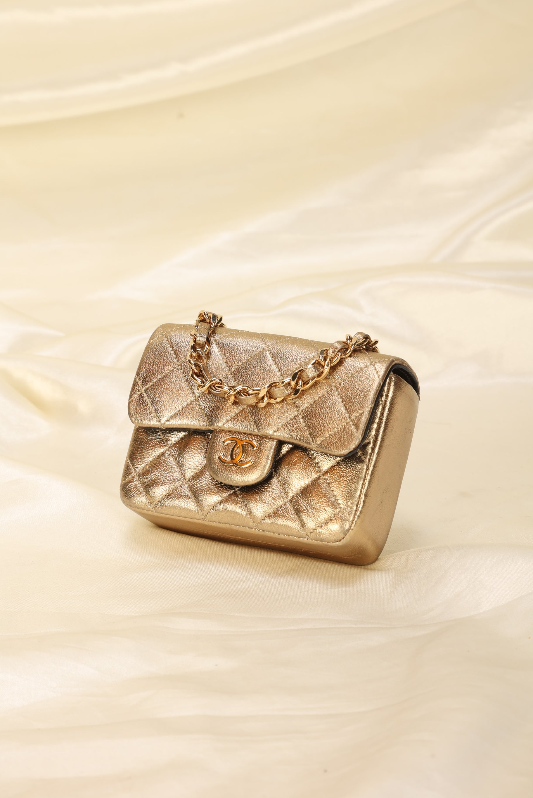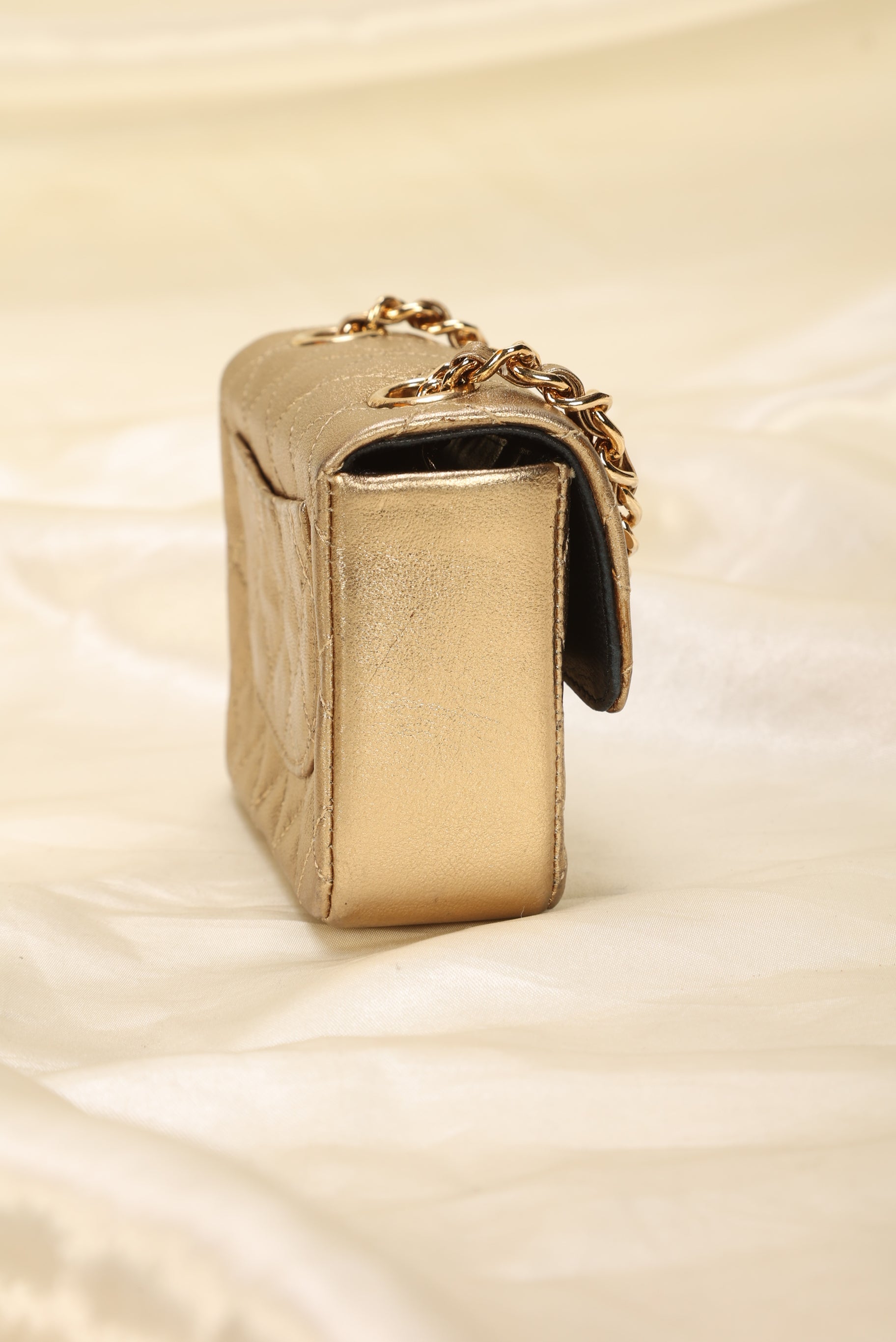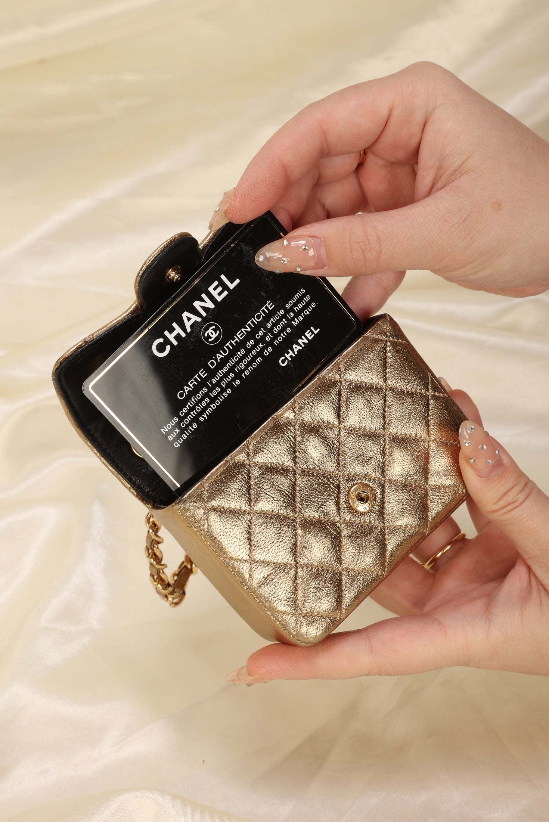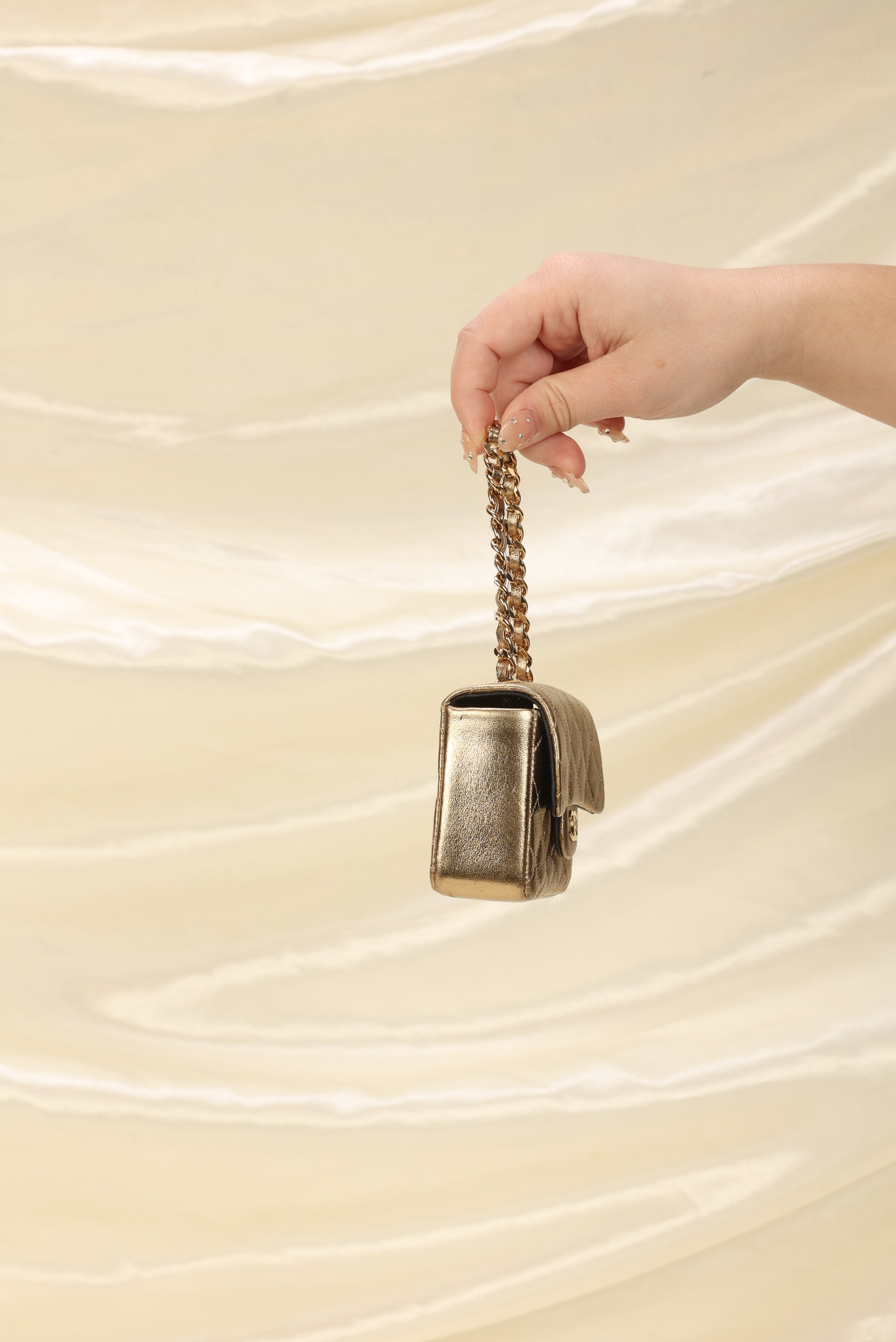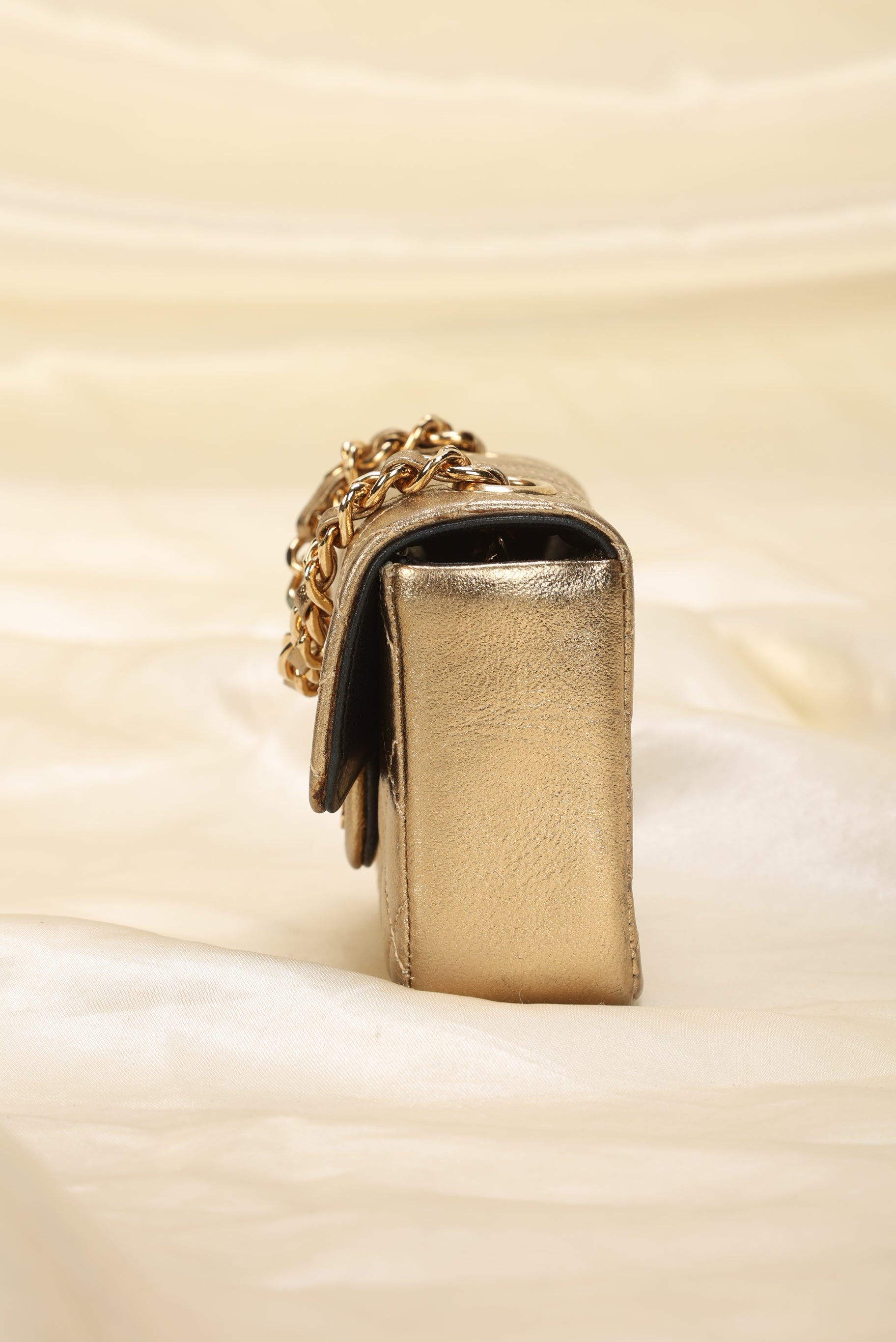 A Chanel micro bag that makes a statement! Beautiful metallic brown, and pairs perfectly with any black or neutral outfits. Stunning color mixed with 24K gold plated hardware. A rare find? and can be on its own, or can be hooked onto a larger Chanel bag, to create a unique look!