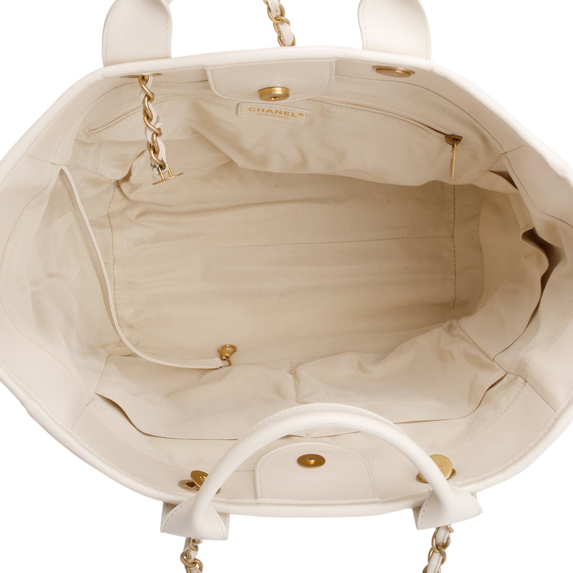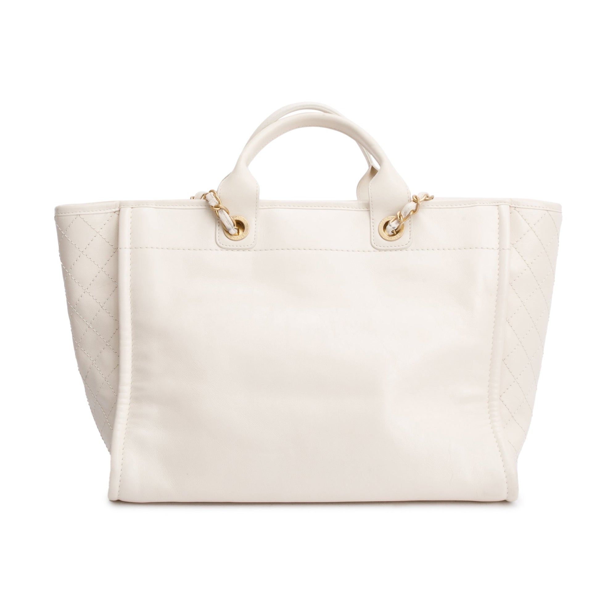 Chanel 2020 Neutral Calfskin Leather Embellised Medium Deauville Logo Charms Shopping Tote