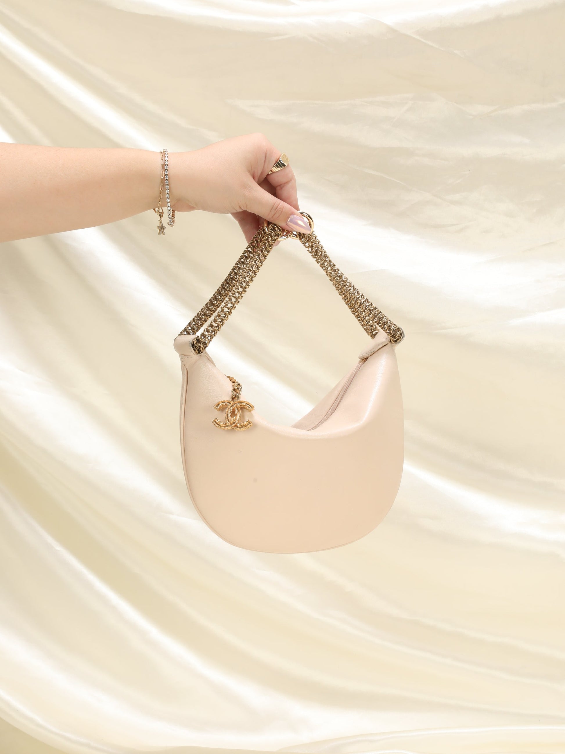Not currently available anywhere online!! I own the same style and has easily received the most compliments due to its uniqueness! An incredible Chanel piece crafted in a blush?pink and gold?champagne?hardware. Lambskin with an intricate CC zipper logo charm makes this the perfect mini bag. Brand quiet in nature, yet makes a statement with any outfit. Attention in the details,?unique rolled chain on each side. I fastened two rings in order for bag to be held together but left the option of unclipping rings when preferred! Style similar to the Bottega Veneta turn bag but in vintage Chanel form- can be flat and structured, or lambskin can be pushed down the middle to create a 'fortune cookie' look!