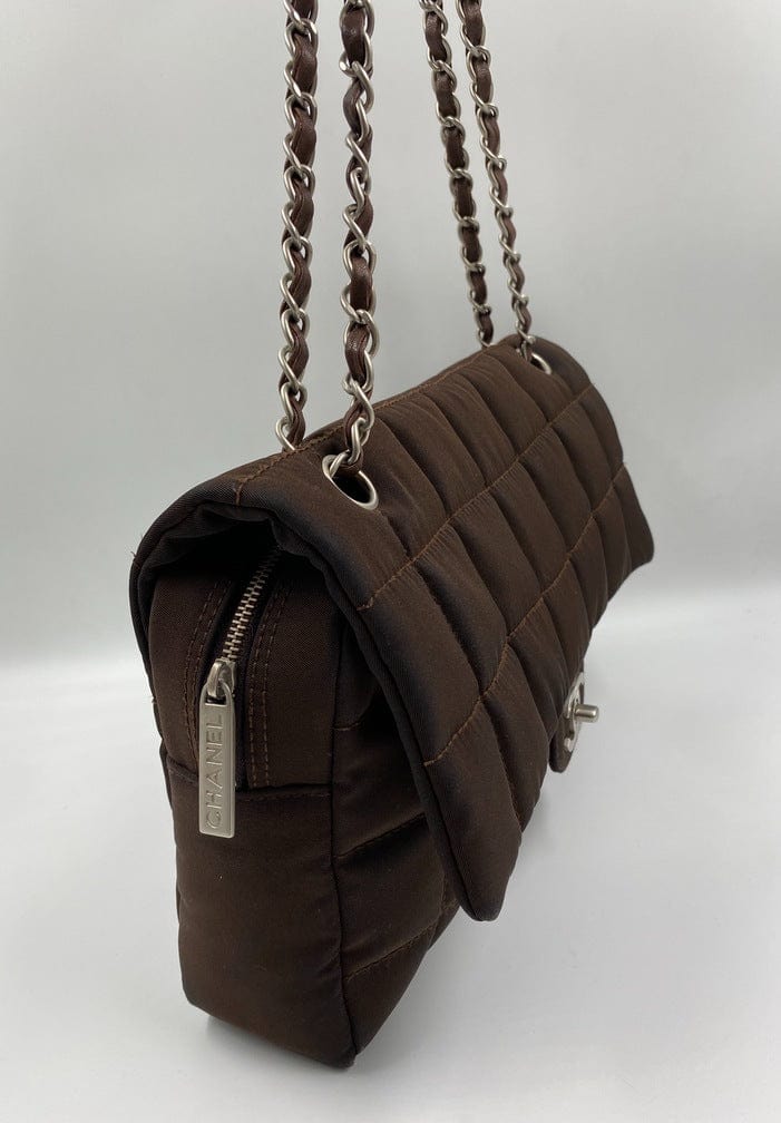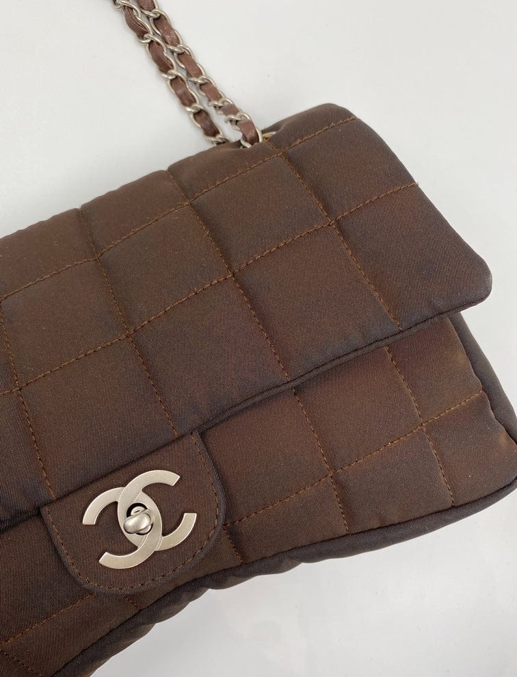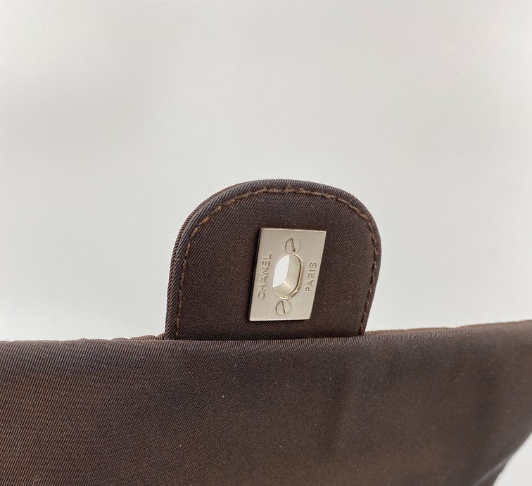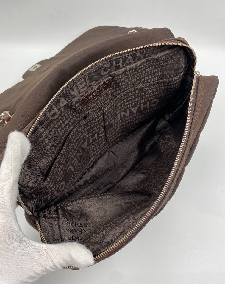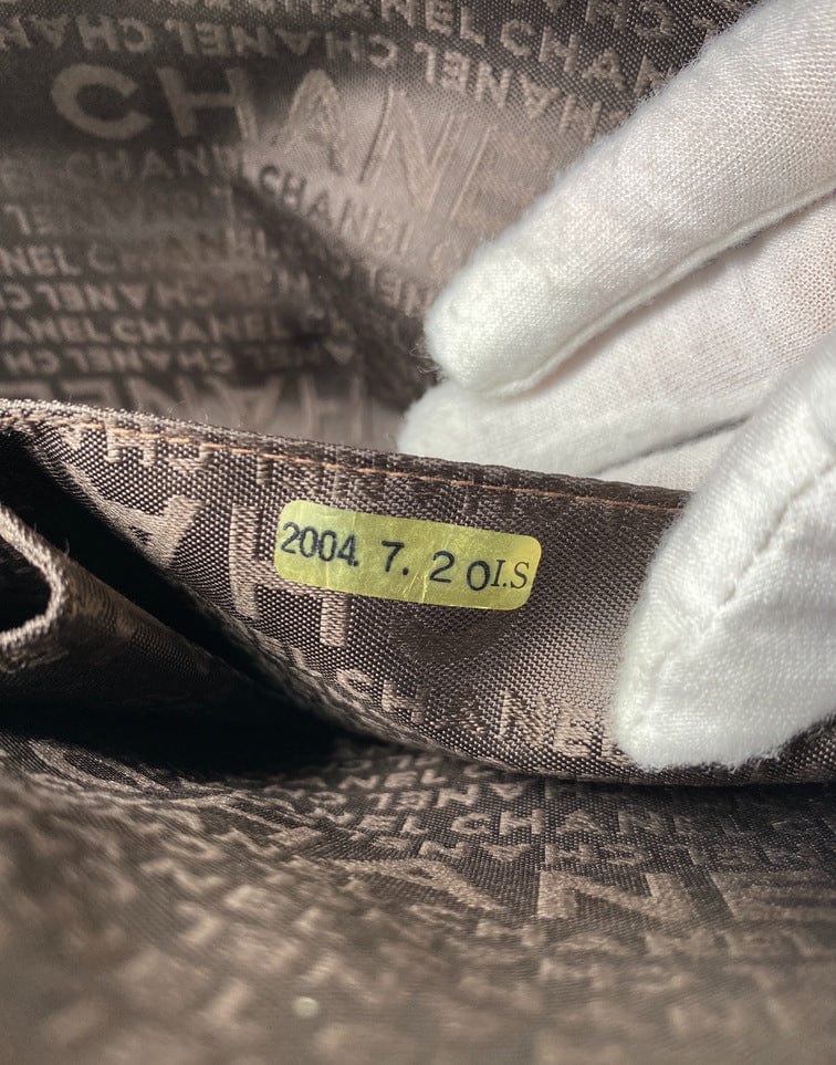 A super cool and rare Chanel Chocolate Bar nylon single flap shoulder bag, crafted from brown nylon and features brushed silver hardware. Inside the serial number sticker is still intact and attached. The serial number tells us this bag was made between 2003-2004. There is a sticker showing the date the bag was bought in 2004. This is custom practice in Japan Chanel stores.