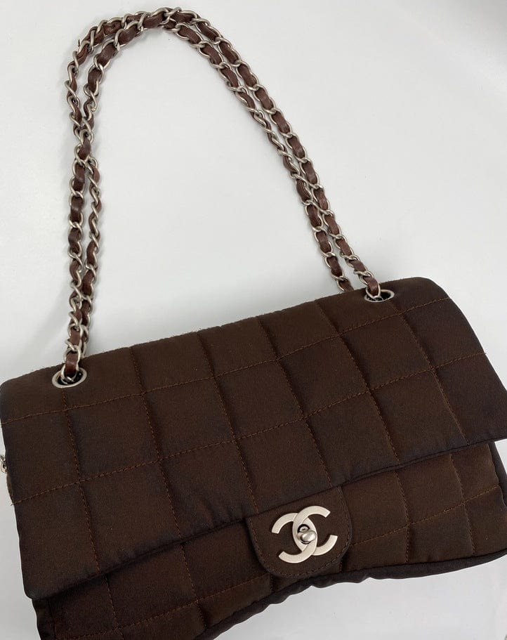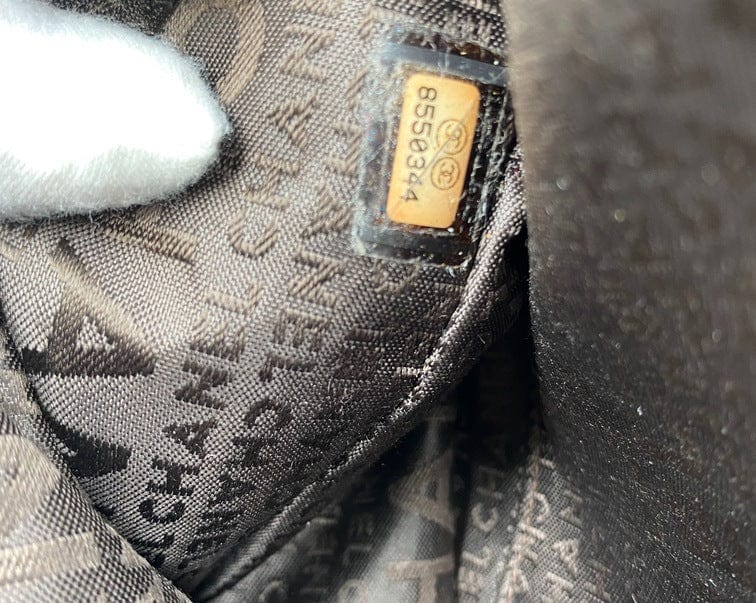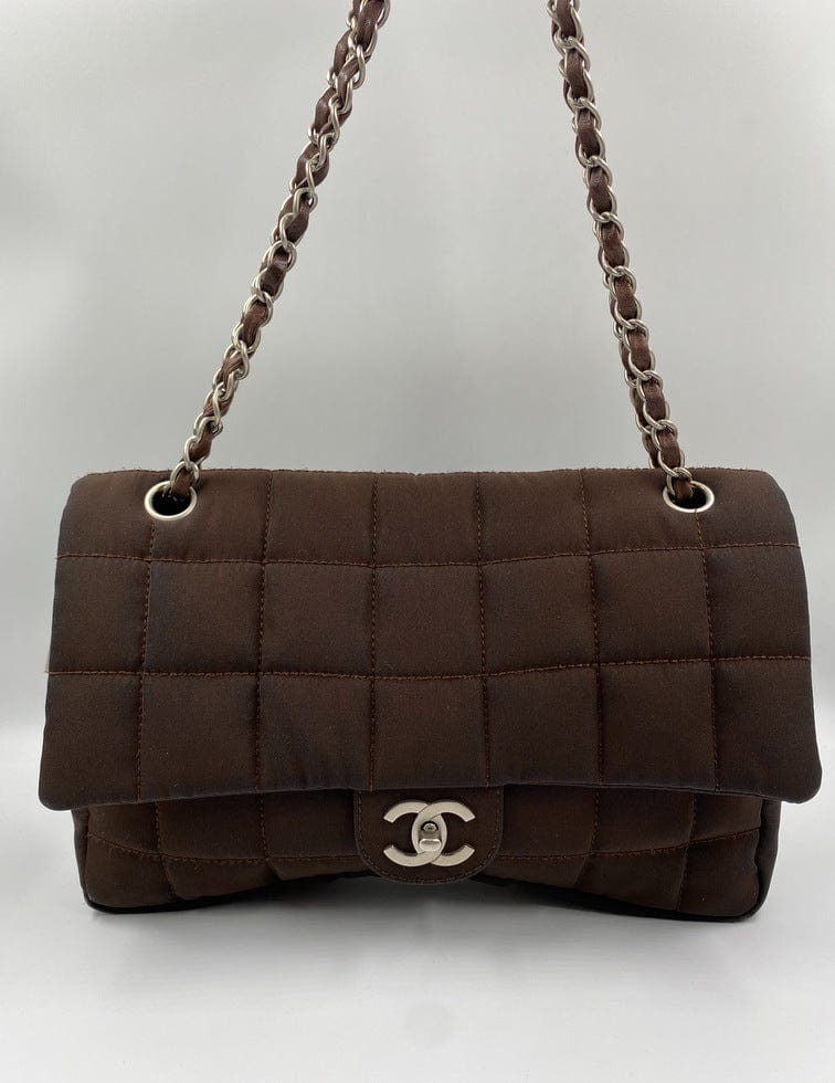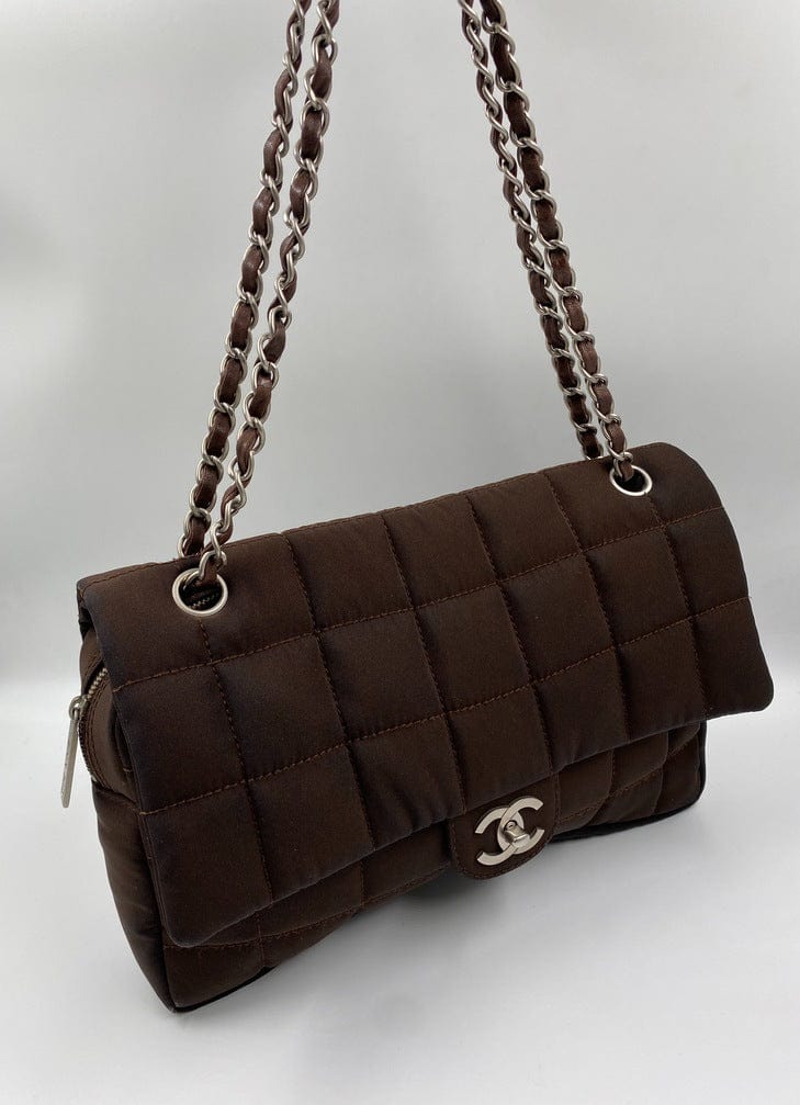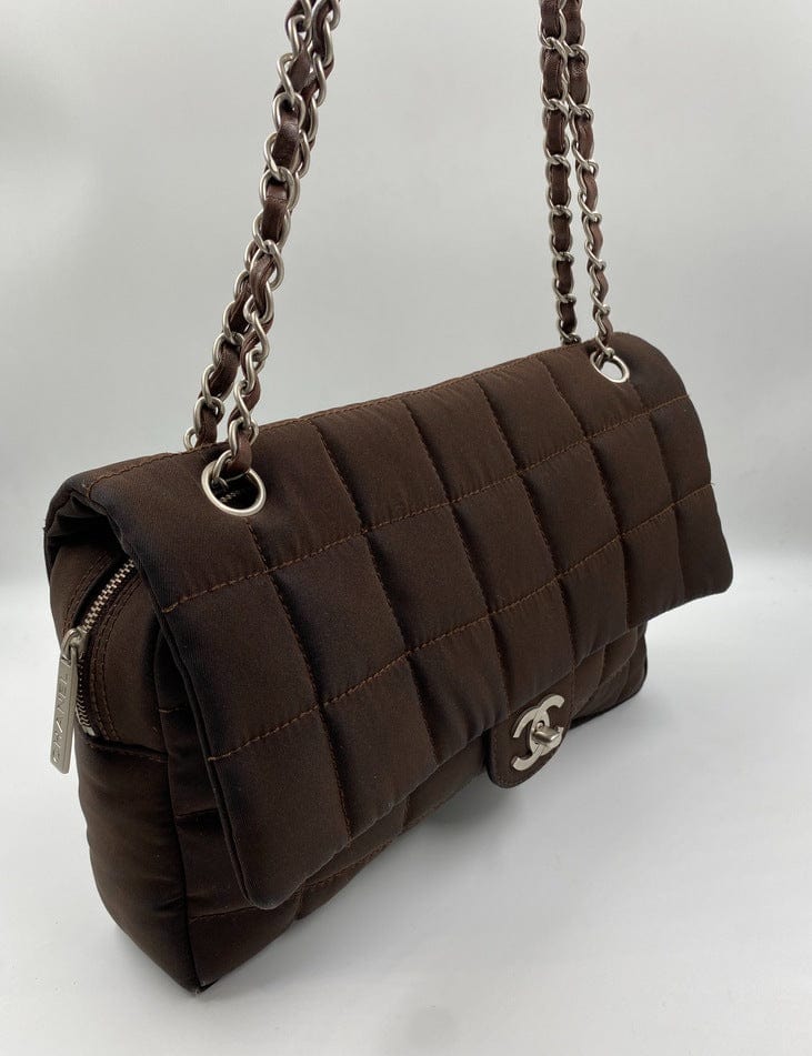 A super cool and rare Chanel Chocolate Bar nylon single flap shoulder bag, crafted from brown nylon and features brushed silver hardware. Inside the serial number sticker is still intact and attached. The serial number tells us this bag was made between 2003-2004. There is a sticker showing the date the bag was bought in 2004. This is custom practice in Japan Chanel stores.