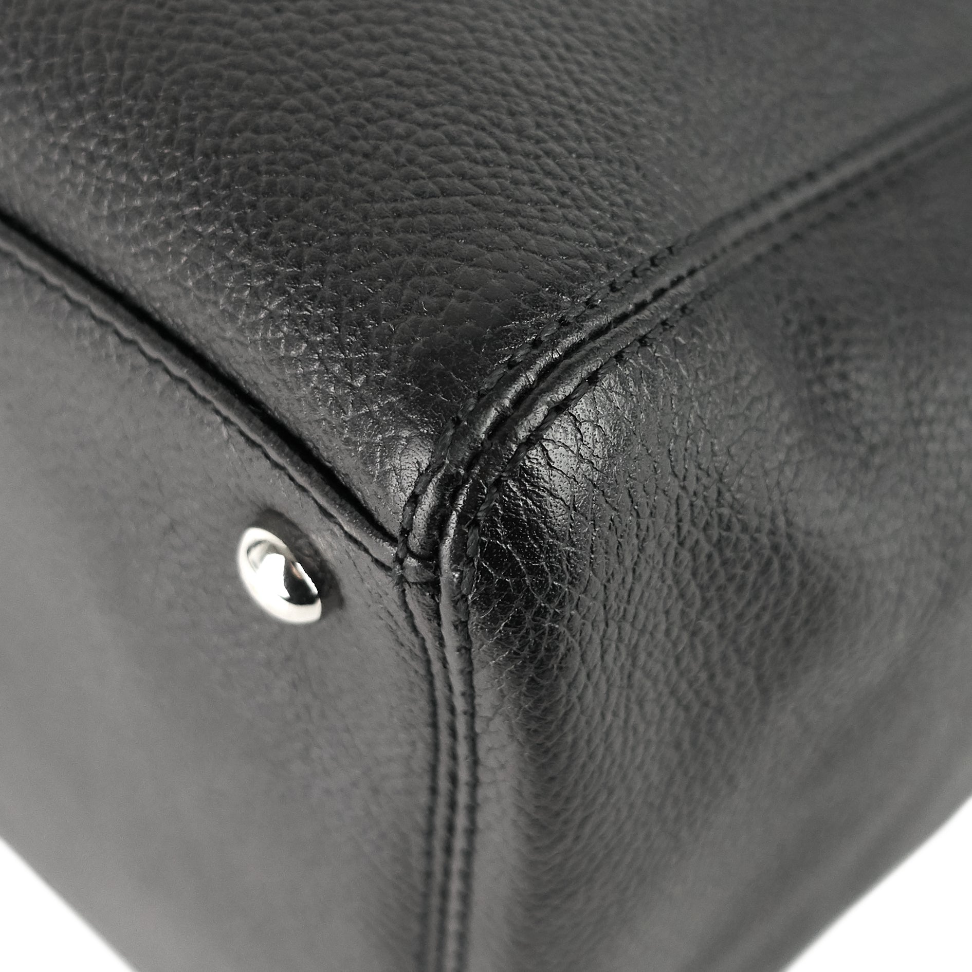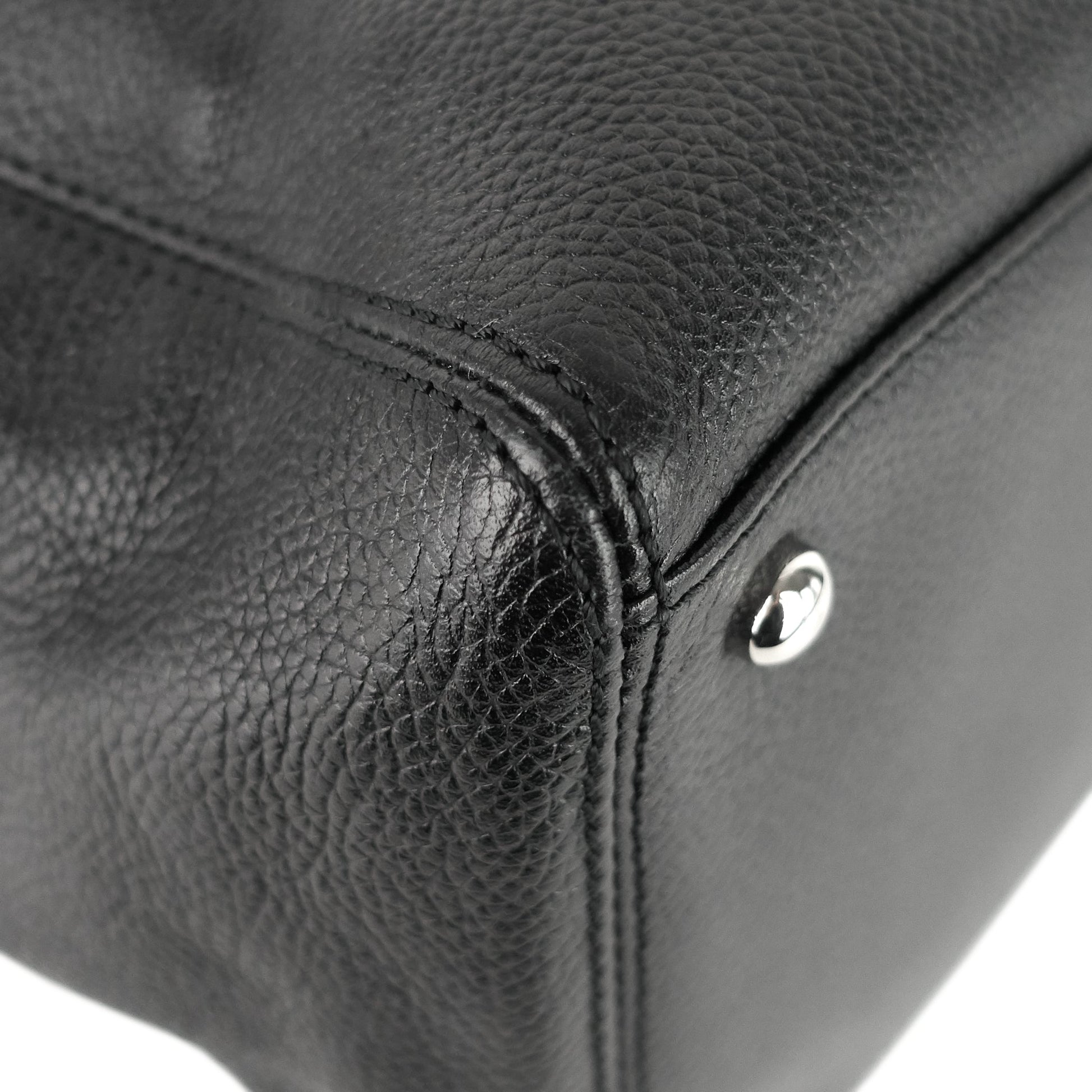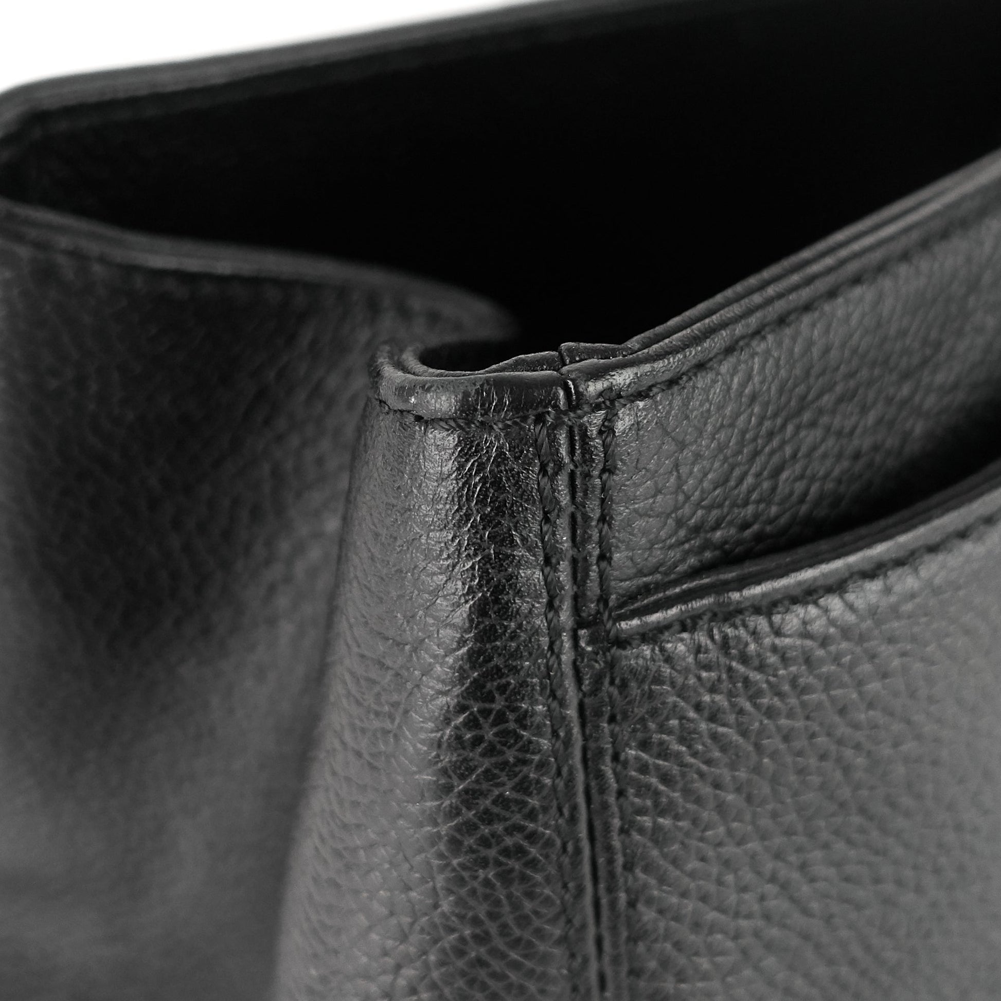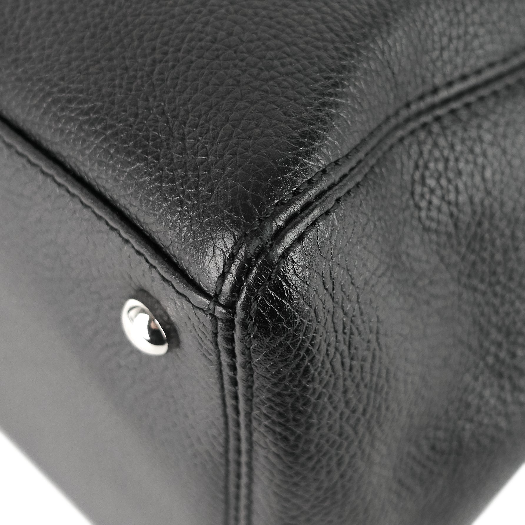 Overall: The exterior is in excellent condition with minor scuffing to the top and bottom corner edges. The interior is clean with light scratches and several faint stains to the middle compartment. The hardware remains shiny with light scratching to the tips of the protective feet. The strap's clasps show small spots of tarnishing.