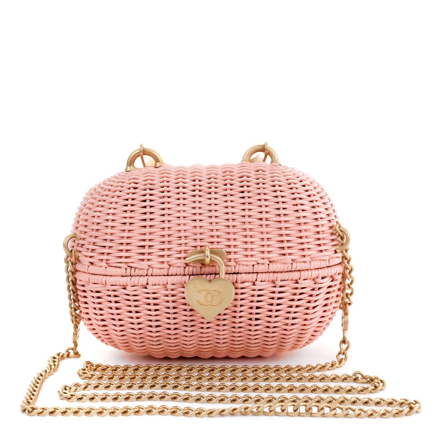 This Chanel Pink Wicker Love Basket Bag is a runway piece in pristine condition. Oval shaped pink wicker basket with top handle and hinged top. Matte gold heart shaped locket and chain strap. Dust bag included.