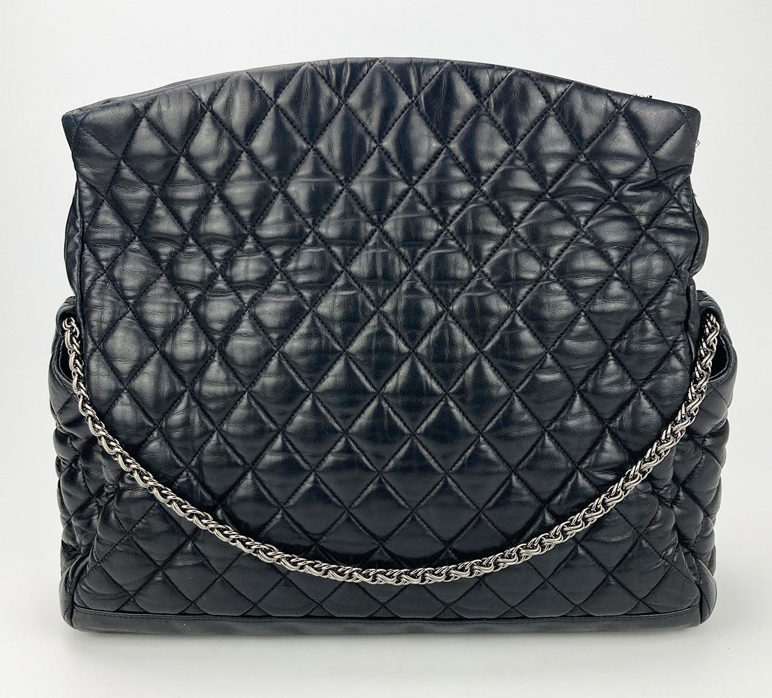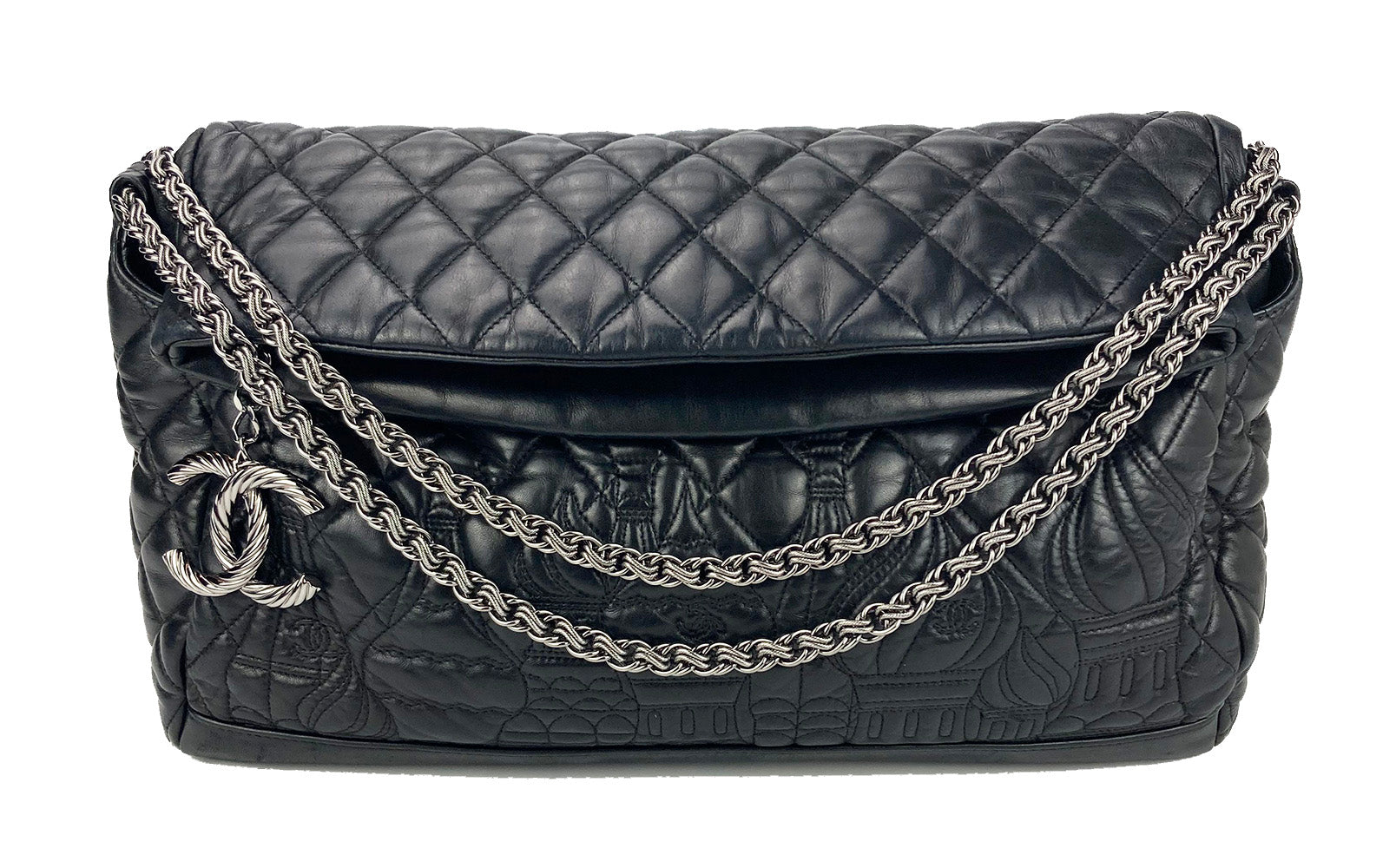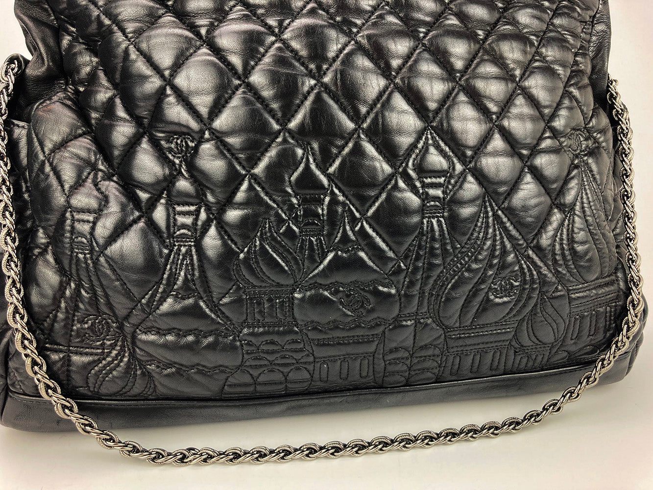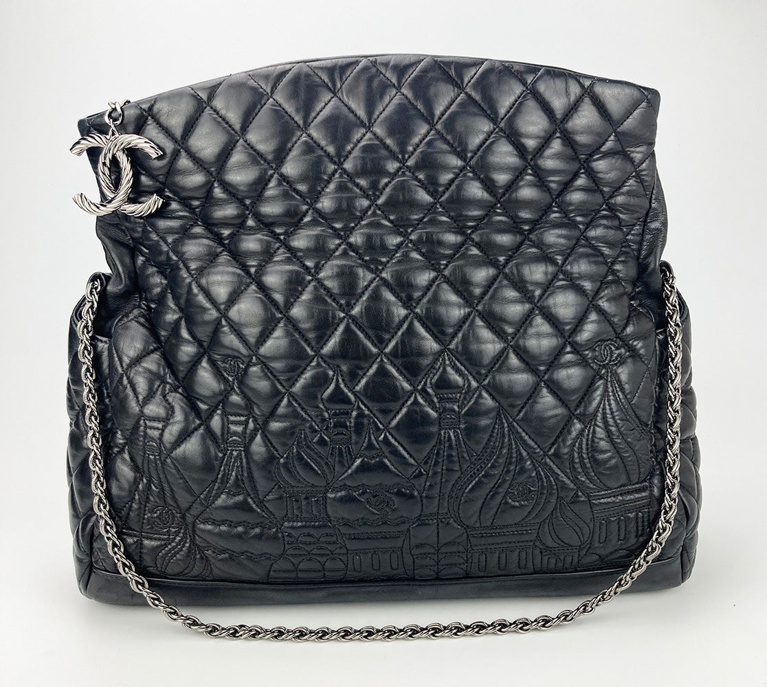 Chanel Paris-Moscow Red Square Kremlin Large Shoulder Bag in excellent condition. Black quilted leather exterior with unique quilted moscow scene along front side. Silver CC logo zip pull and matching braided chain shoulder strap. Top zipper closure opens to a silver vinyl lined interior with one zip and 2 slit side pockets. No stains smells or scuffs. Clean corners edges and interior. purchase includes a dust cover. Strap can be worn short or long. measurements: 15x10x6" 8.5-13" strap drop