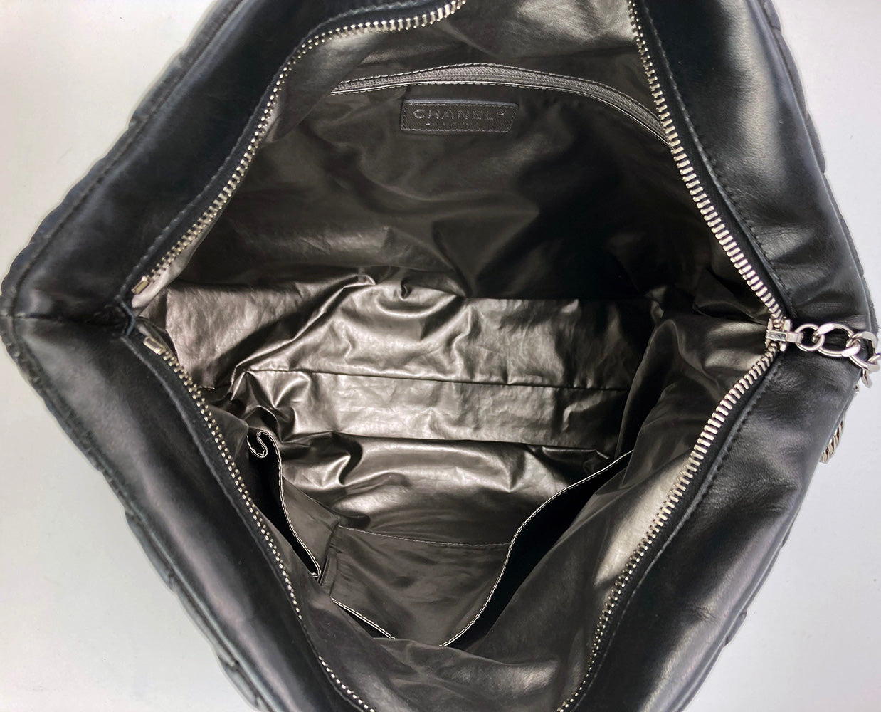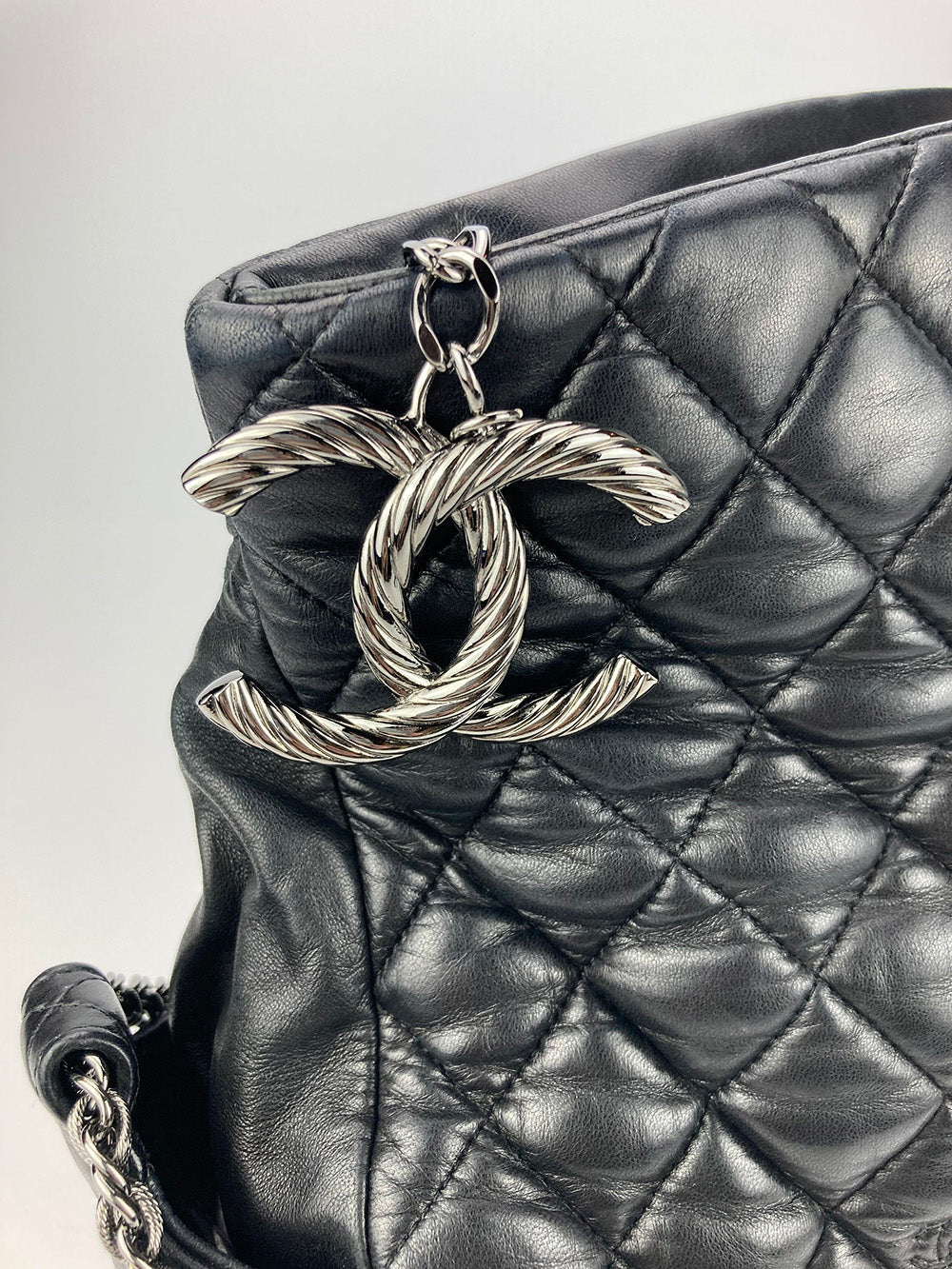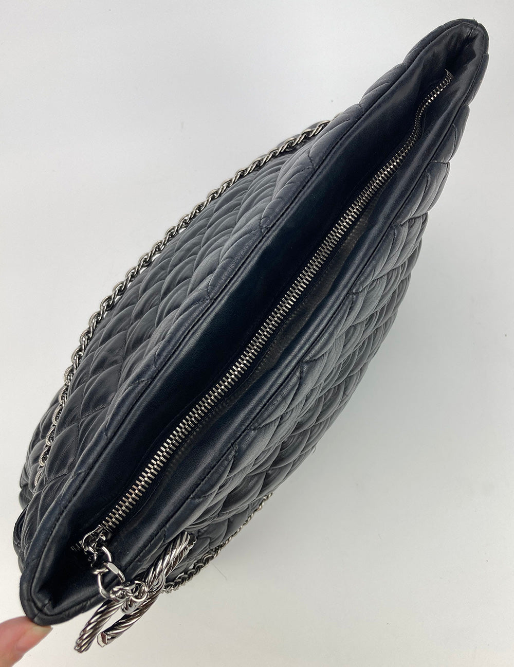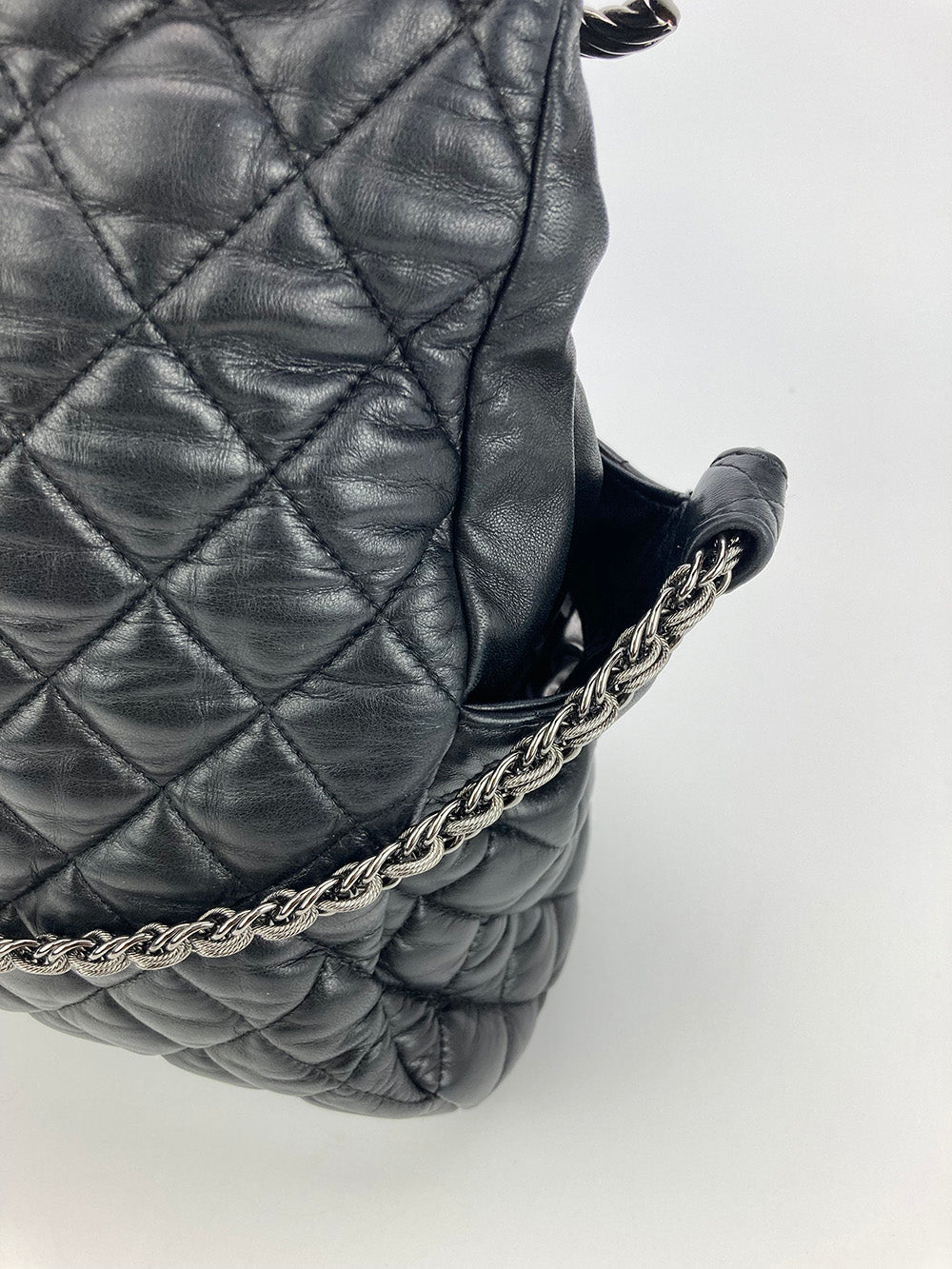 Chanel Paris-Moscow Red Square Kremlin Large Shoulder Bag in excellent condition. Black quilted leather exterior with unique quilted moscow scene along front side. Silver CC logo zip pull and matching braided chain shoulder strap. Top zipper closure opens to a silver vinyl lined interior with one zip and 2 slit side pockets. No stains smells or scuffs. Clean corners edges and interior. purchase includes a dust cover. Strap can be worn short or long. measurements: 15x10x6" 8.5-13" strap drop