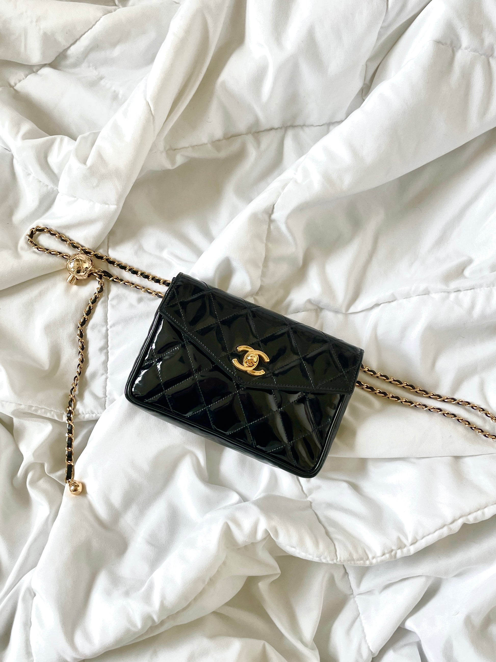 Bringing a Chanel bum bag to the shop!! This versatile piece?is crafted in patent leather! Goes with everything due to the color and style! Can fit a phone,?cardholder, and keys. Perfect for hands-free on-the-go! Generic chain added that adjusts!