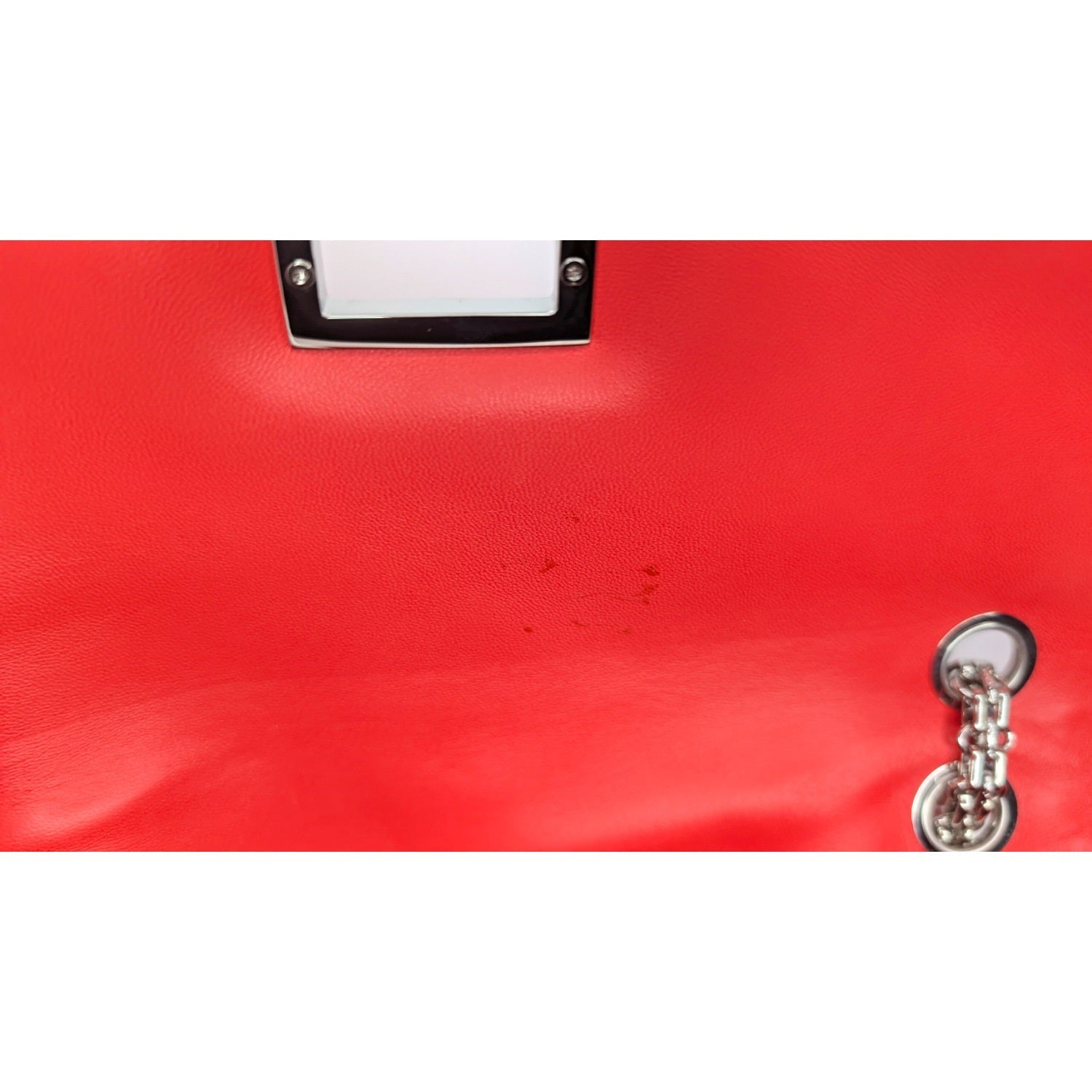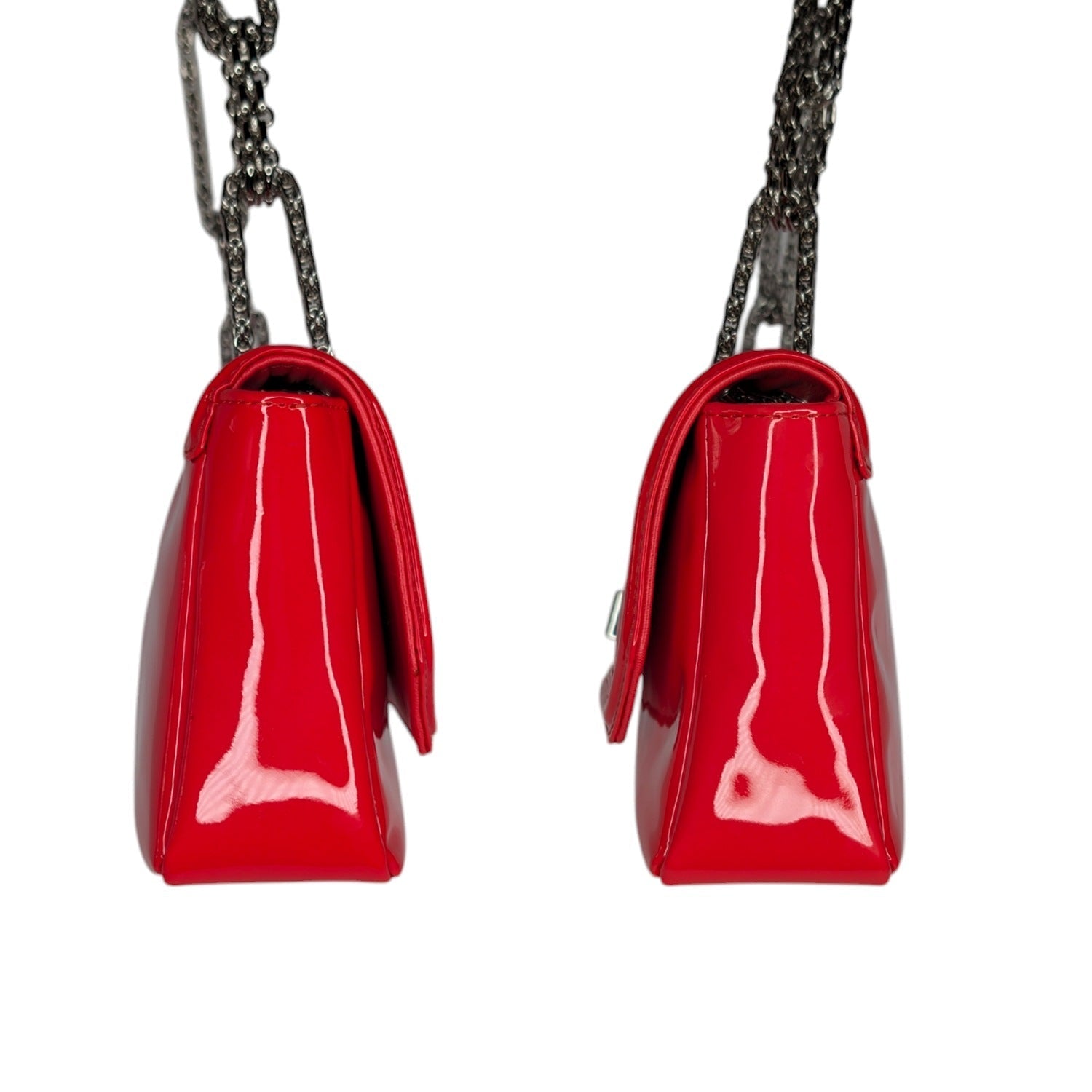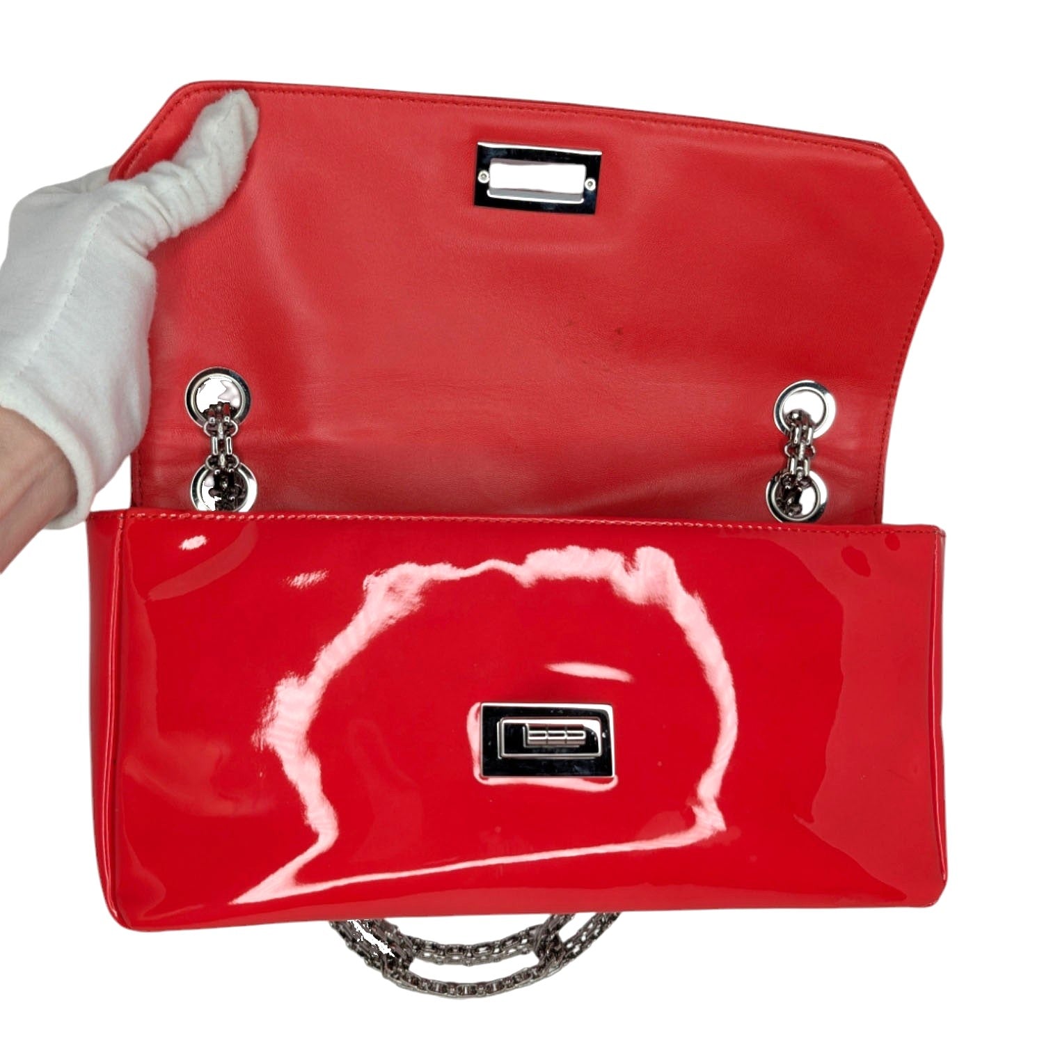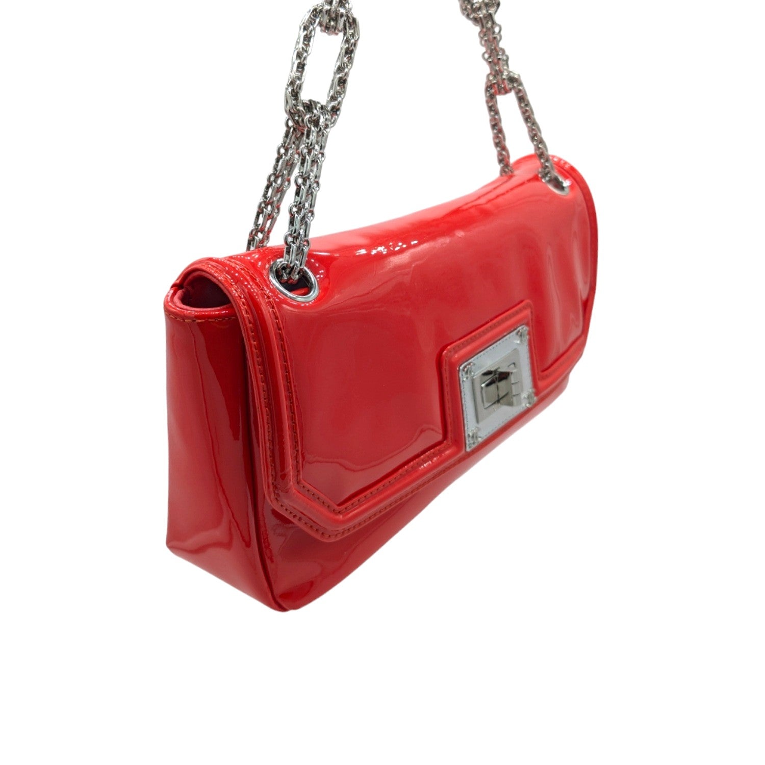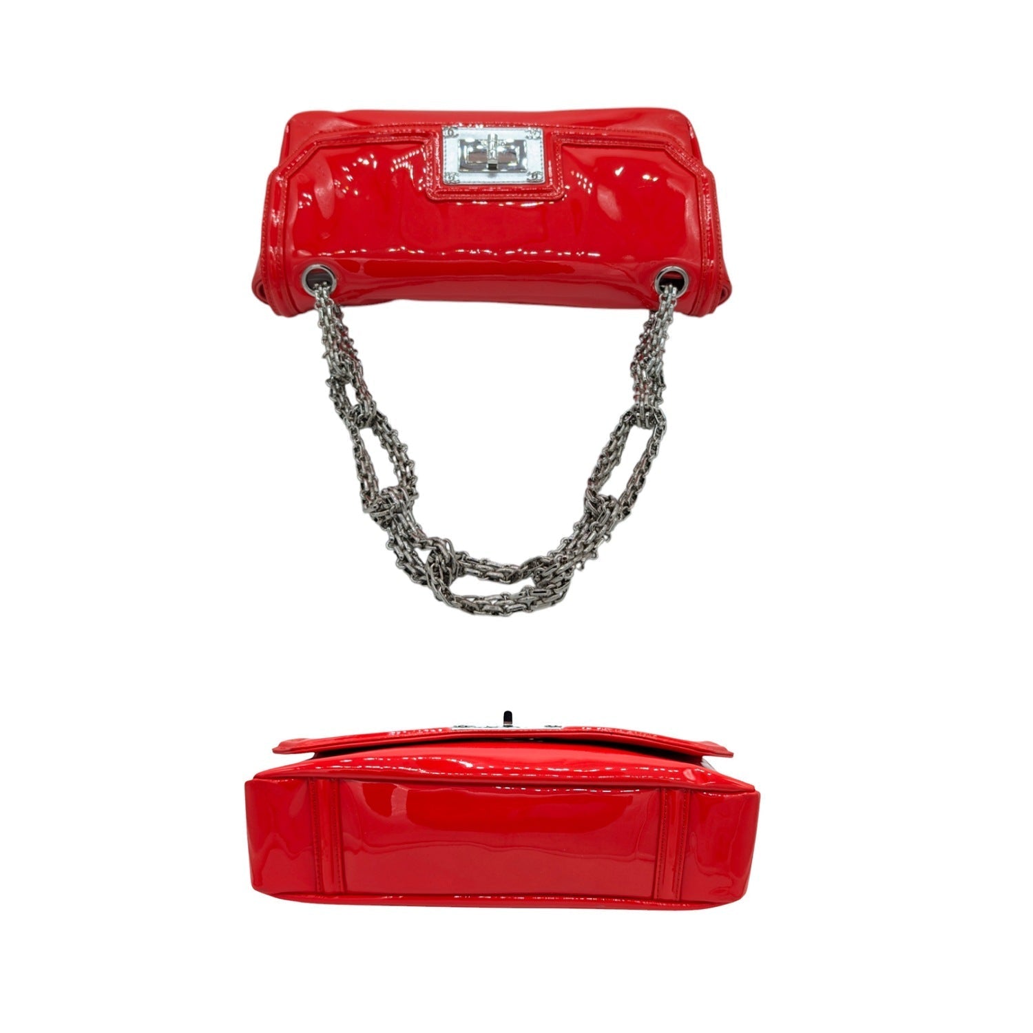 From the 2008-2009 Collection by Karl Lagerfeld. This stylish shoulder flap bag is crafted of patent calfskin leather in bright red. The bag features a silver Bijoux chain-linked shoulder strap and a silver squared Mademoiselle turn lock. This opens to a grey satin interior with a zipper pocket. Comes with an Entrupy for peace of mind.