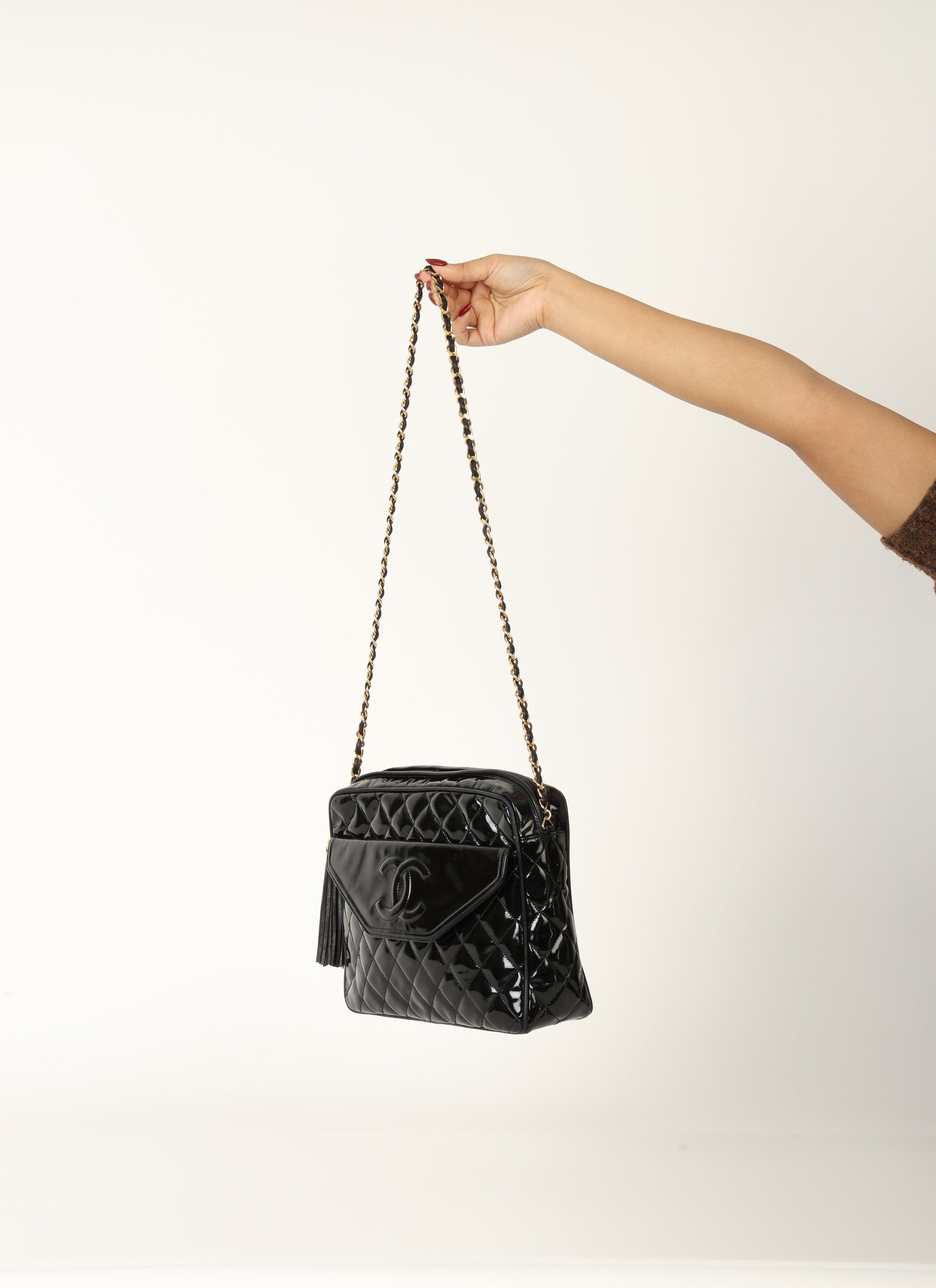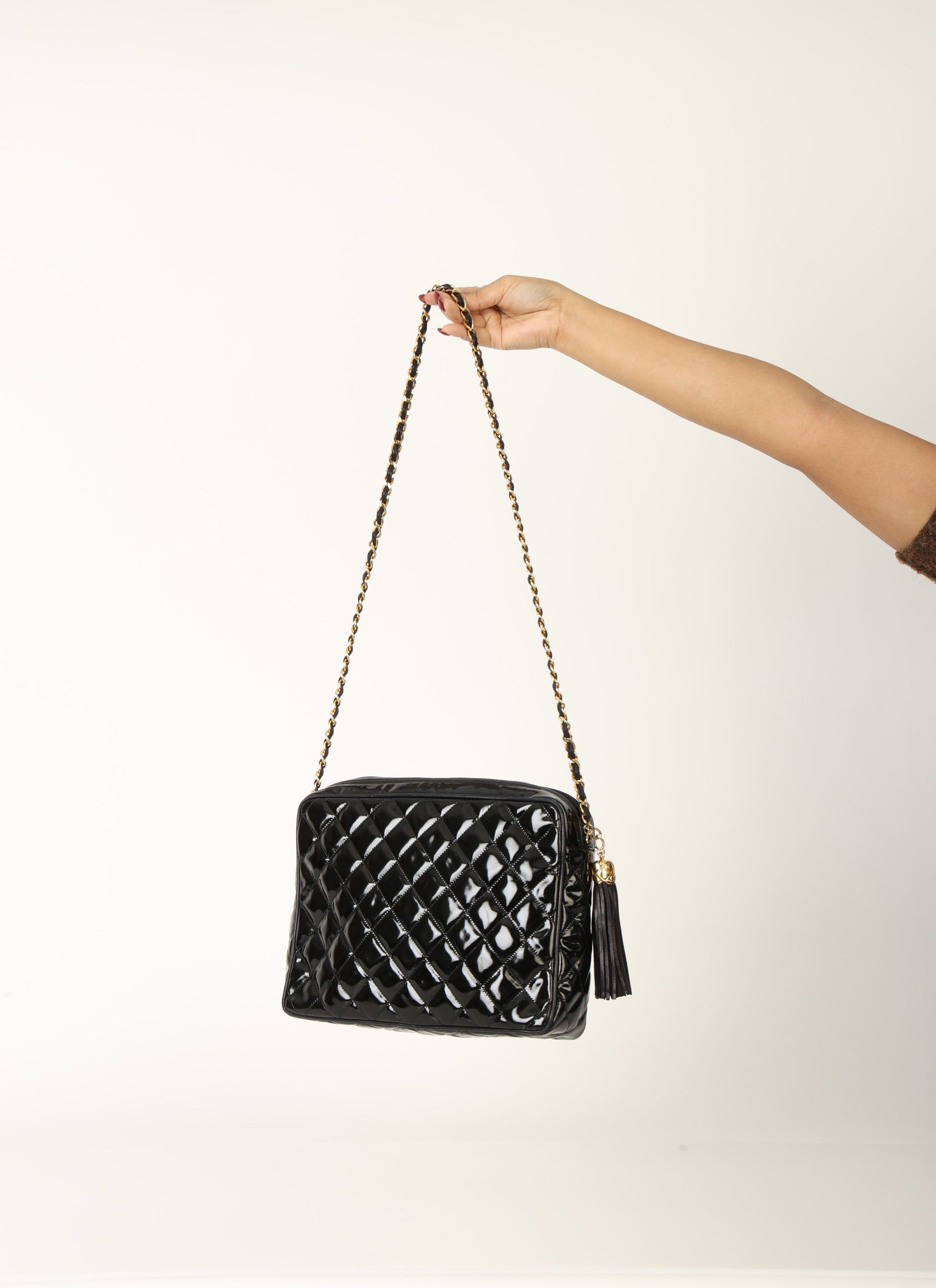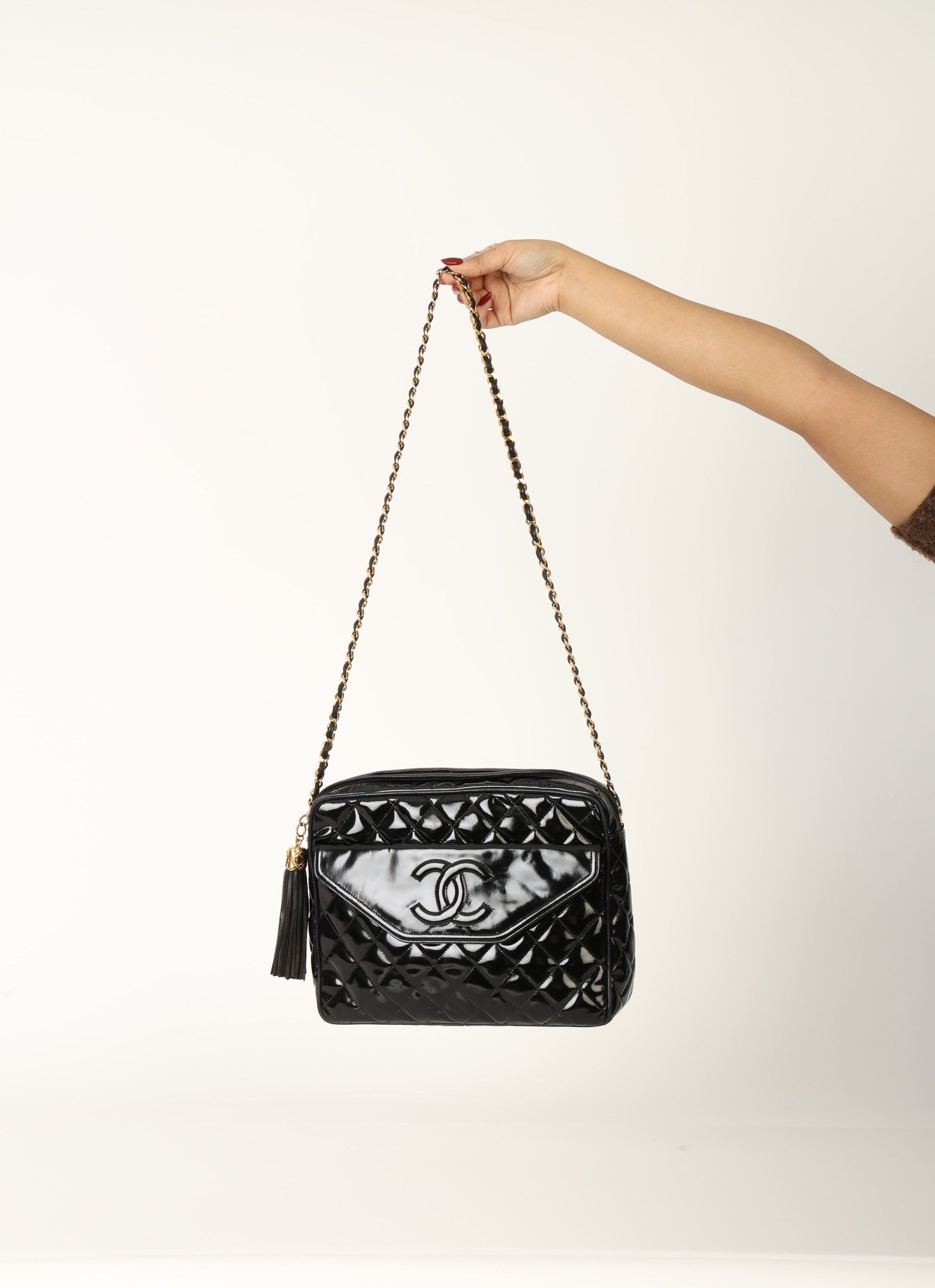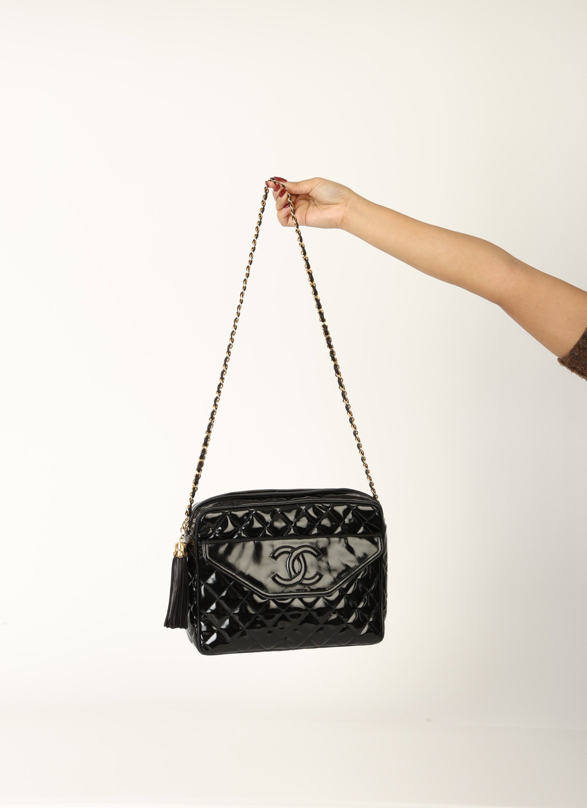 Dropping in the shop is a Chanel Patent Camera Bag in black with gold hardware!?Crafted in Chanel's patent, this camera bag?is perfect for an everyday bag to fit all the essentials! Timeless logo featured on the front of bag with 24k gold plated hardware! the Chanel tassel embellishment is just the icing on the cake! You can fit your iPad and the rest of your daily essentials.?