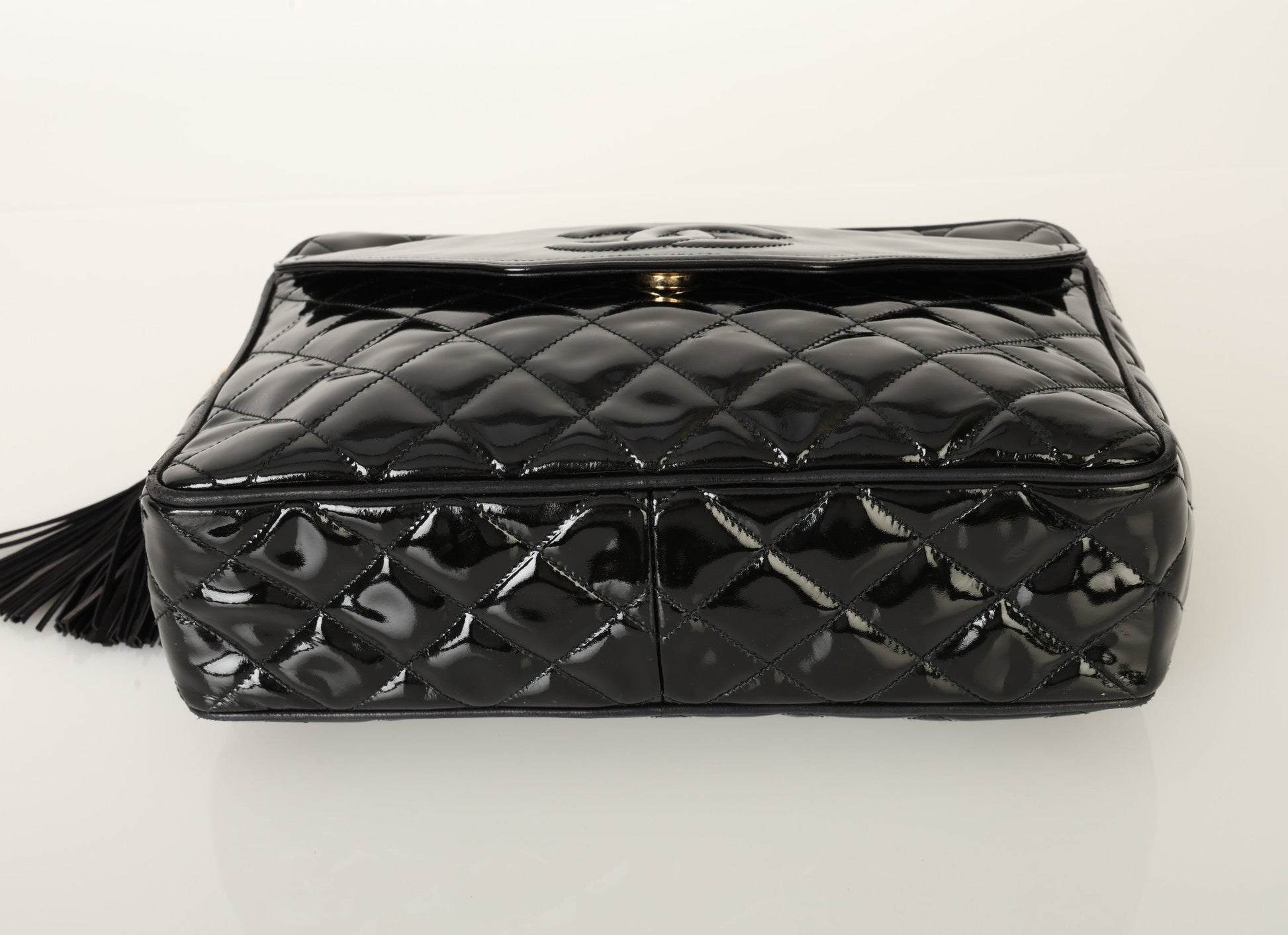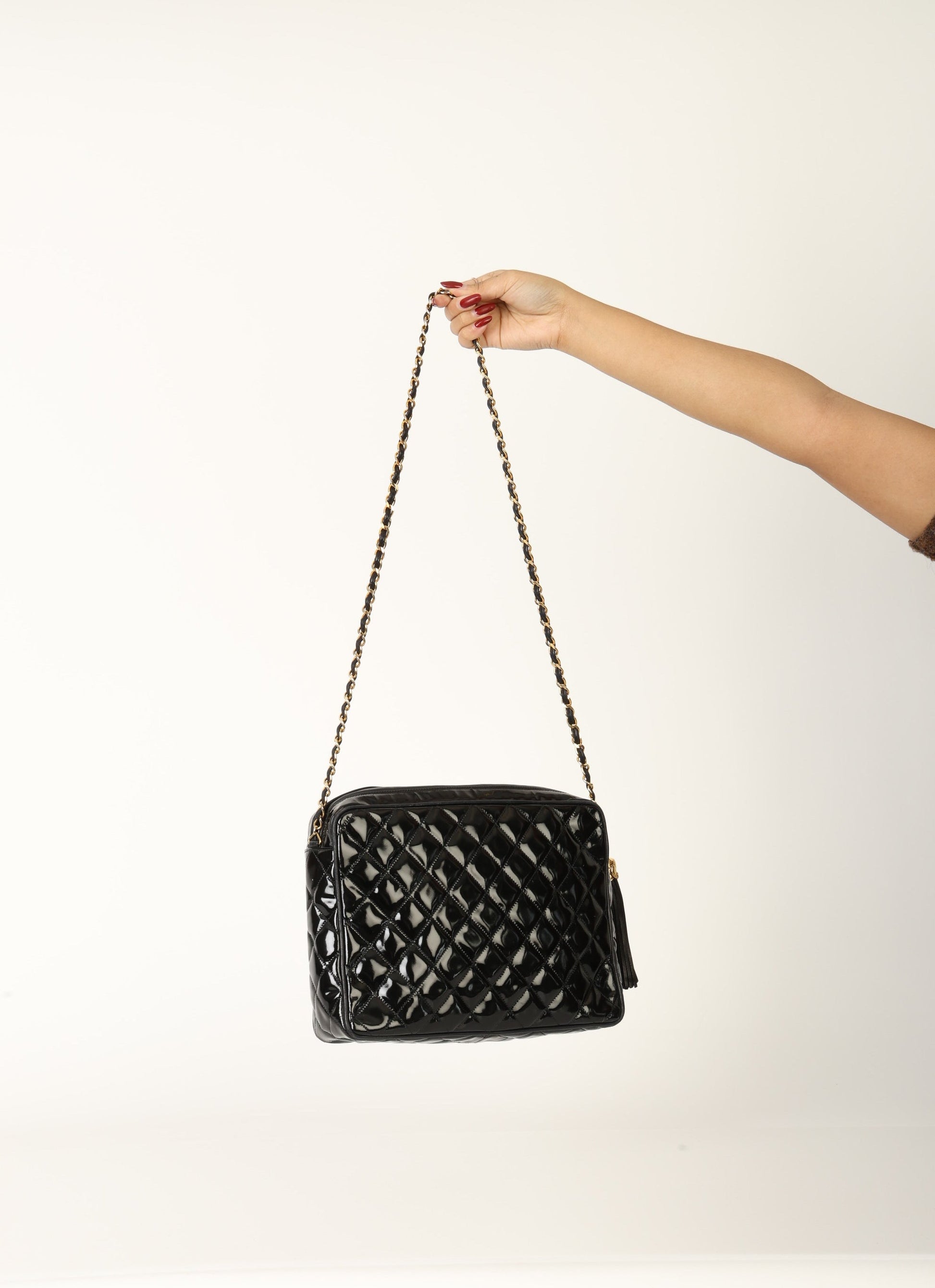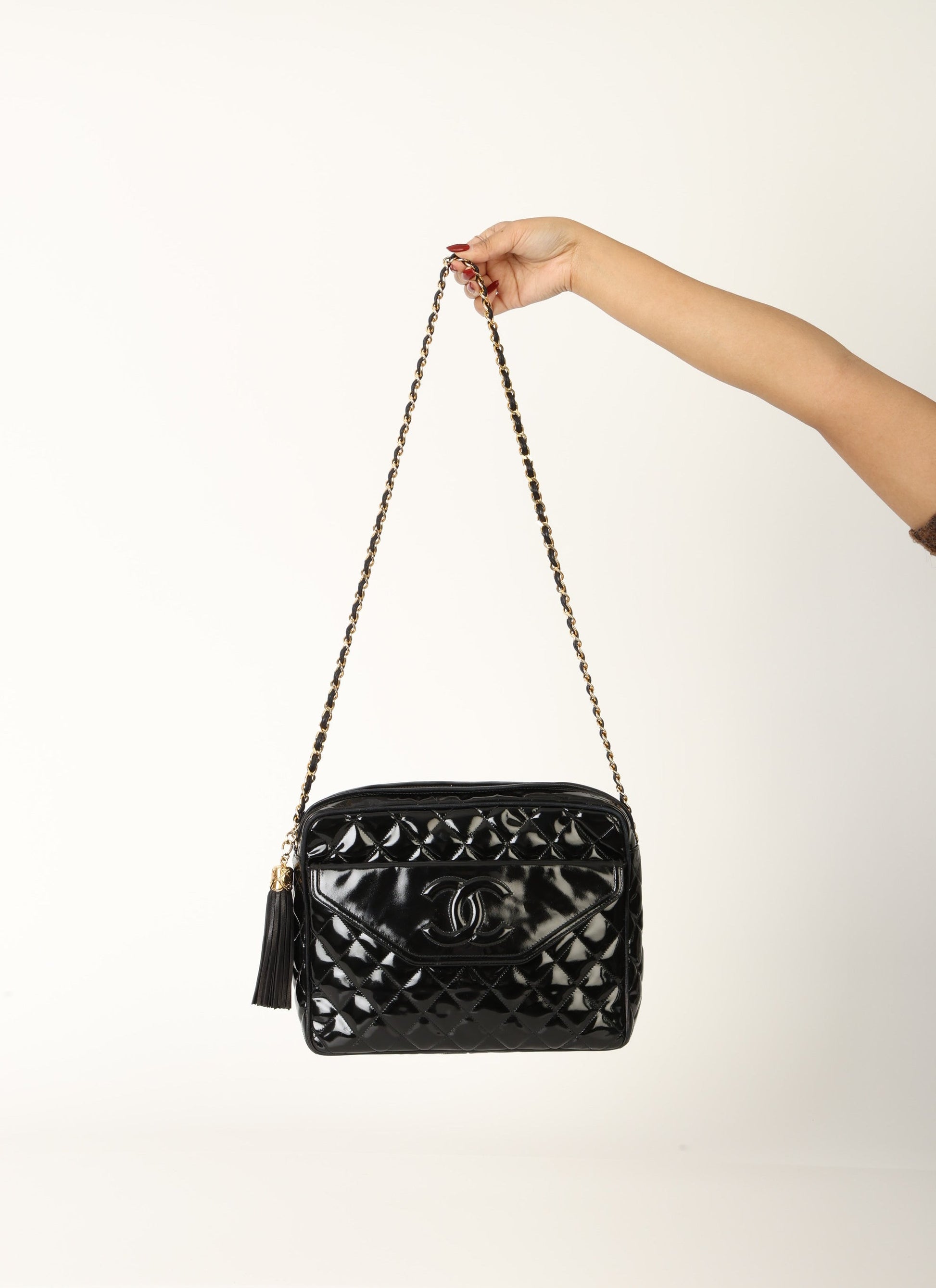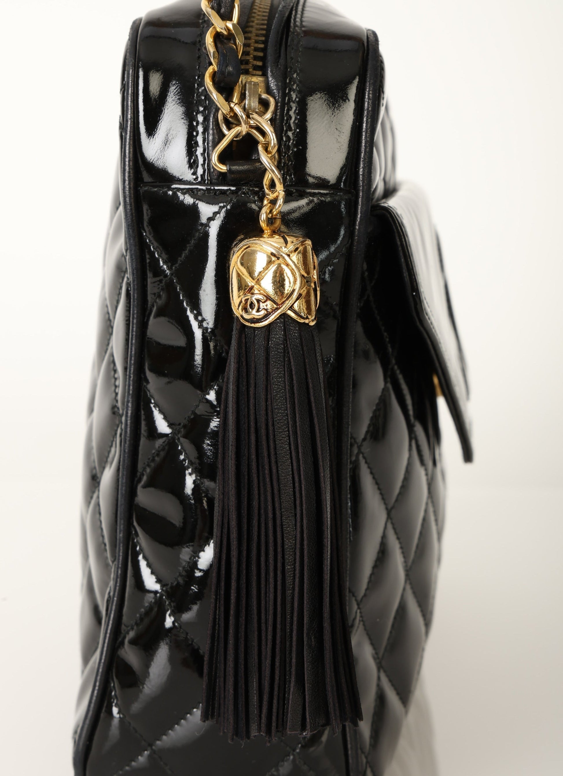 Dropping in the shop is a Chanel Patent Camera Bag in black with gold hardware!?Crafted in Chanel's patent, this camera bag?is perfect for an everyday bag to fit all the essentials! Timeless logo featured on the front of bag with 24k gold plated hardware! the Chanel tassel embellishment is just the icing on the cake! You can fit your iPad and the rest of your daily essentials.?