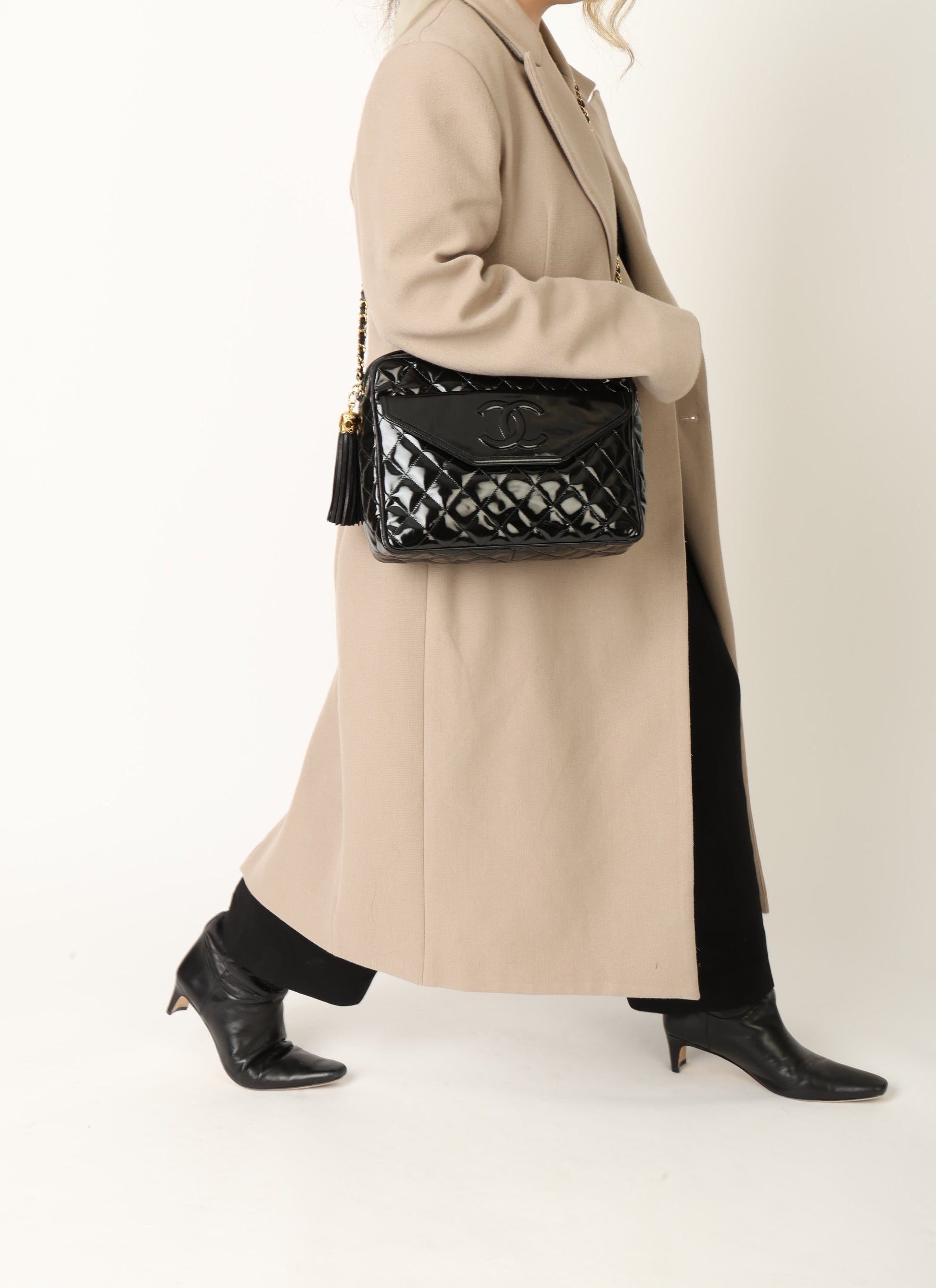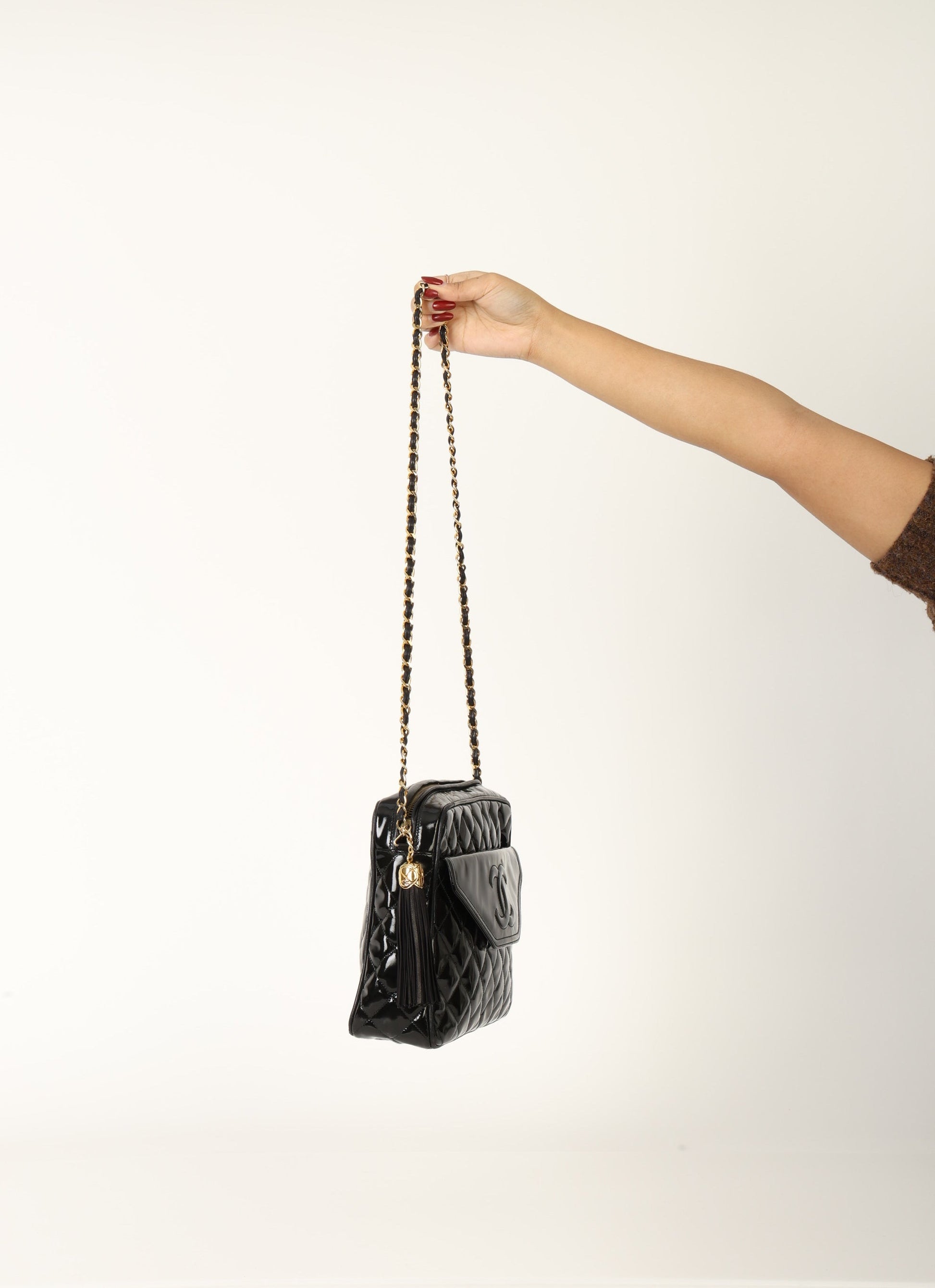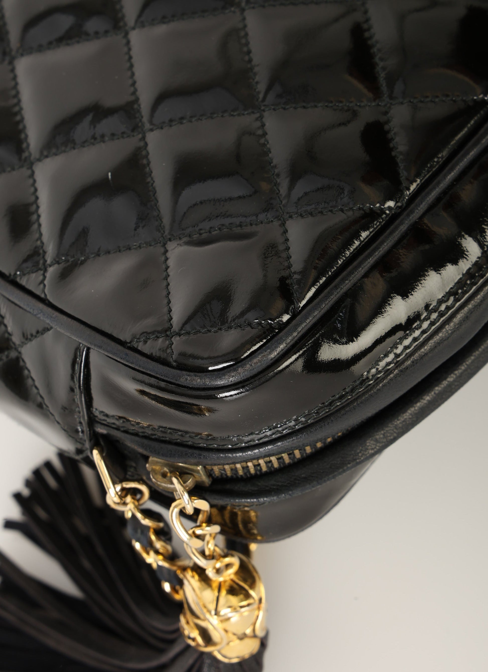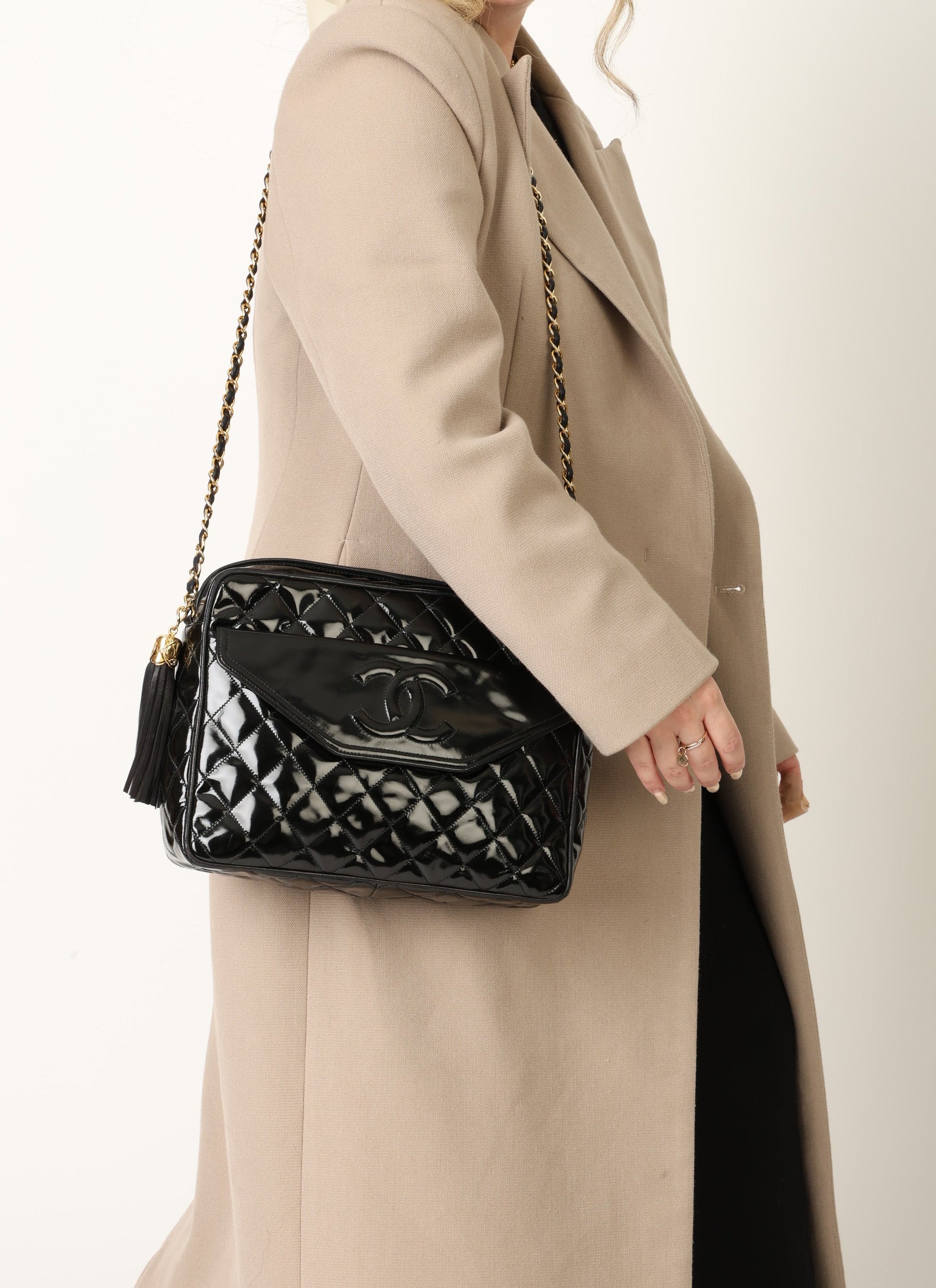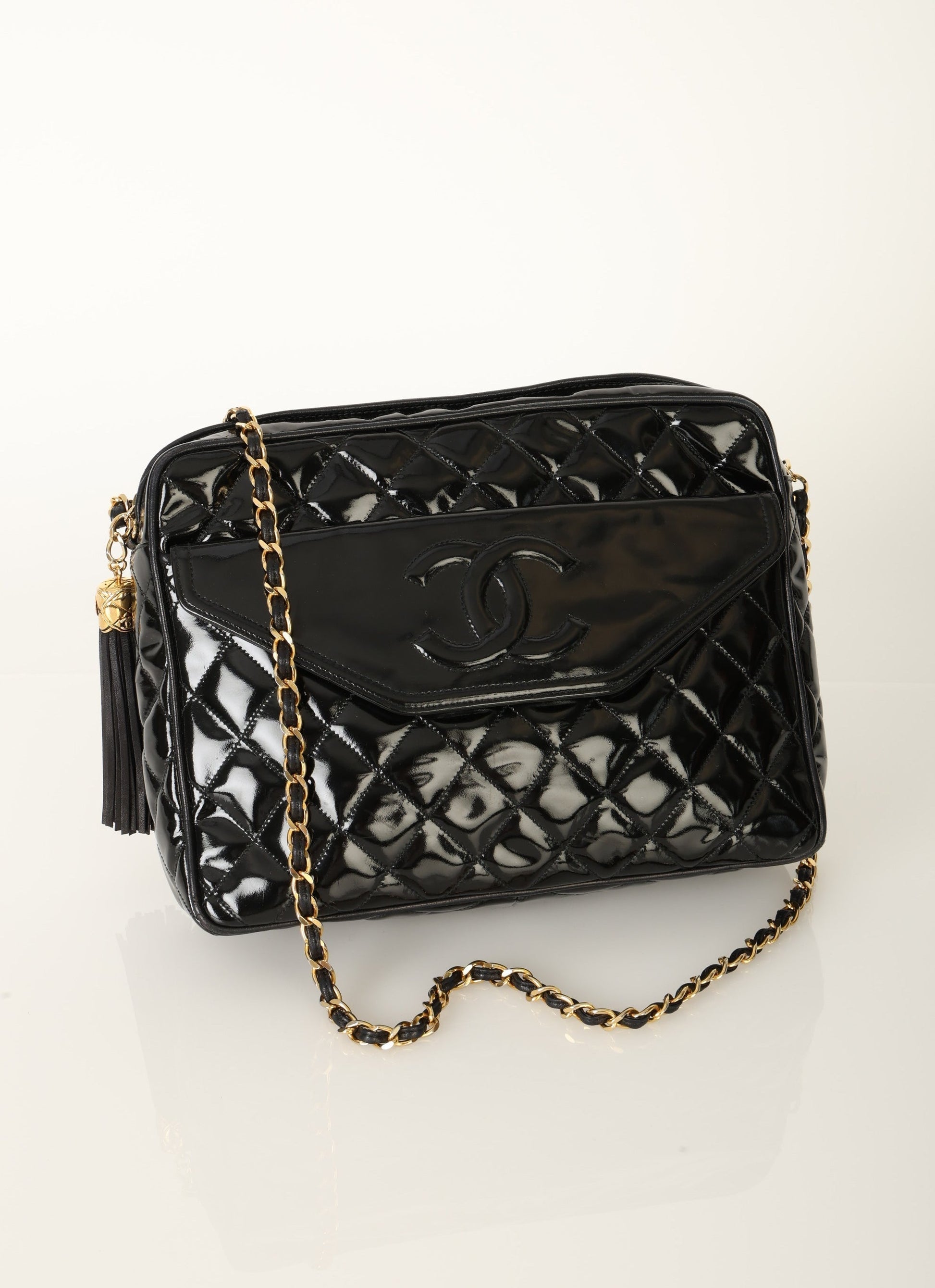 Dropping in the shop is a Chanel Patent Camera Bag in black with gold hardware!?Crafted in Chanel's patent, this camera bag?is perfect for an everyday bag to fit all the essentials! Timeless logo featured on the front of bag with 24k gold plated hardware! the Chanel tassel embellishment is just the icing on the cake! You can fit your iPad and the rest of your daily essentials.?