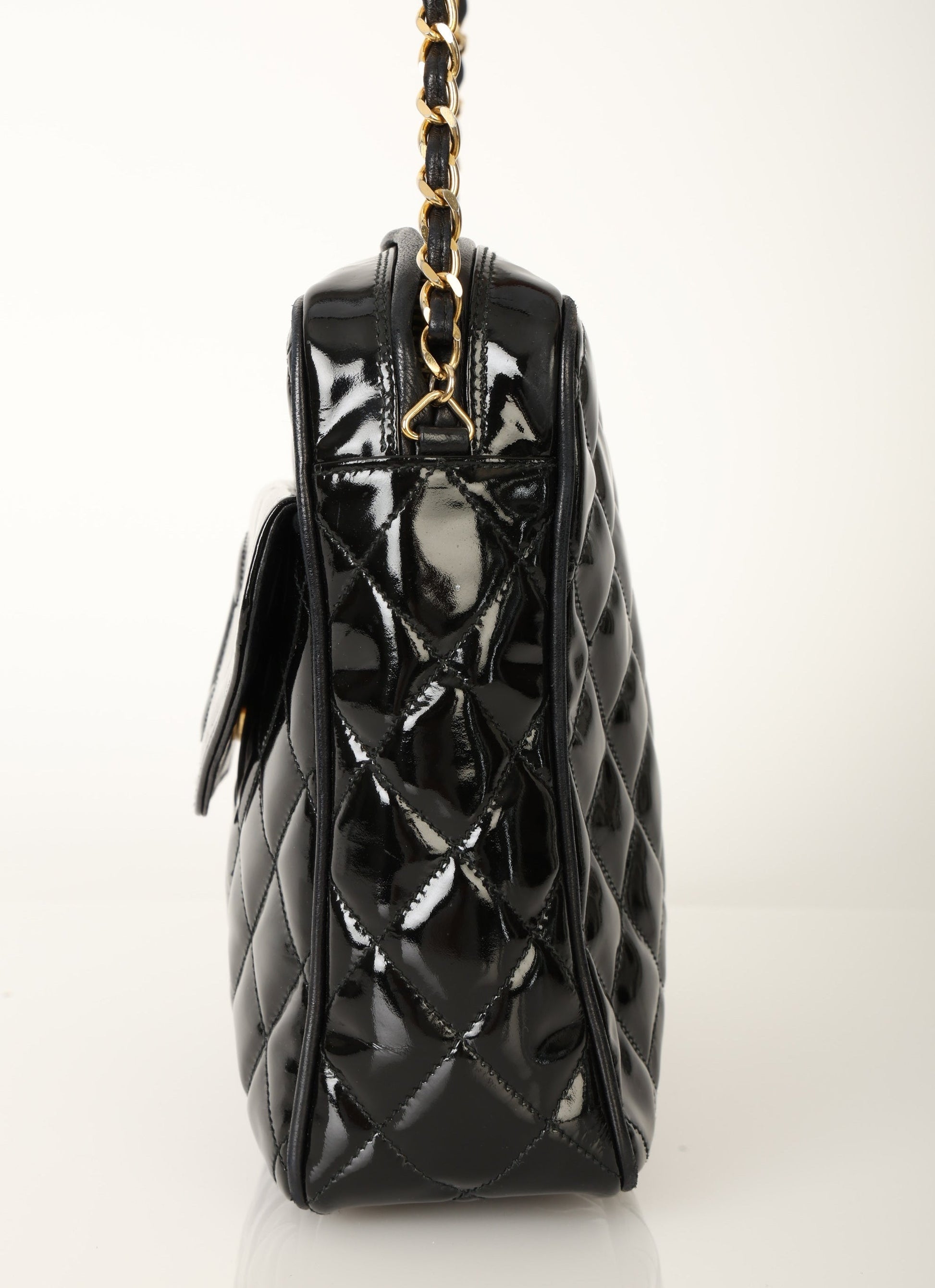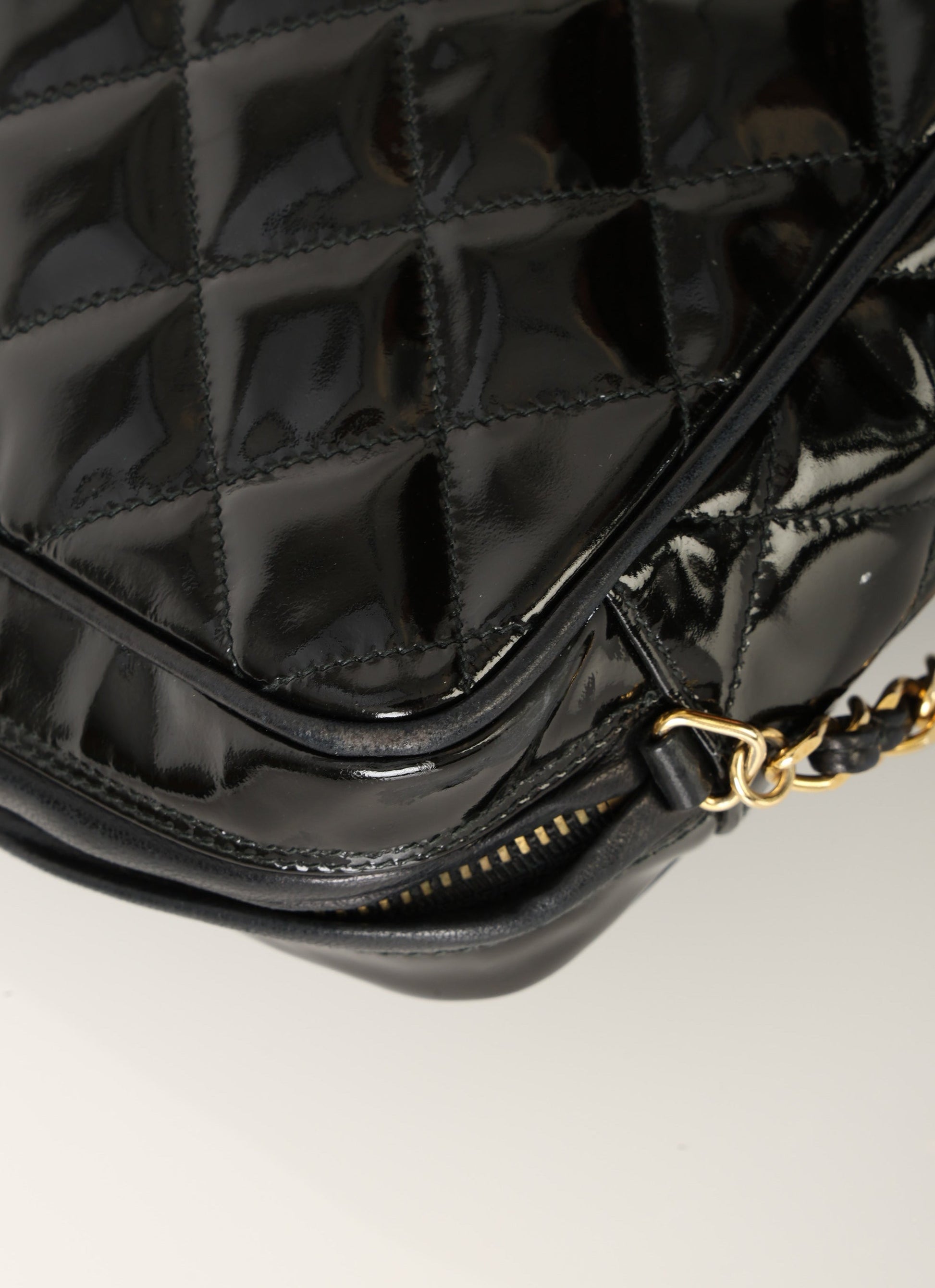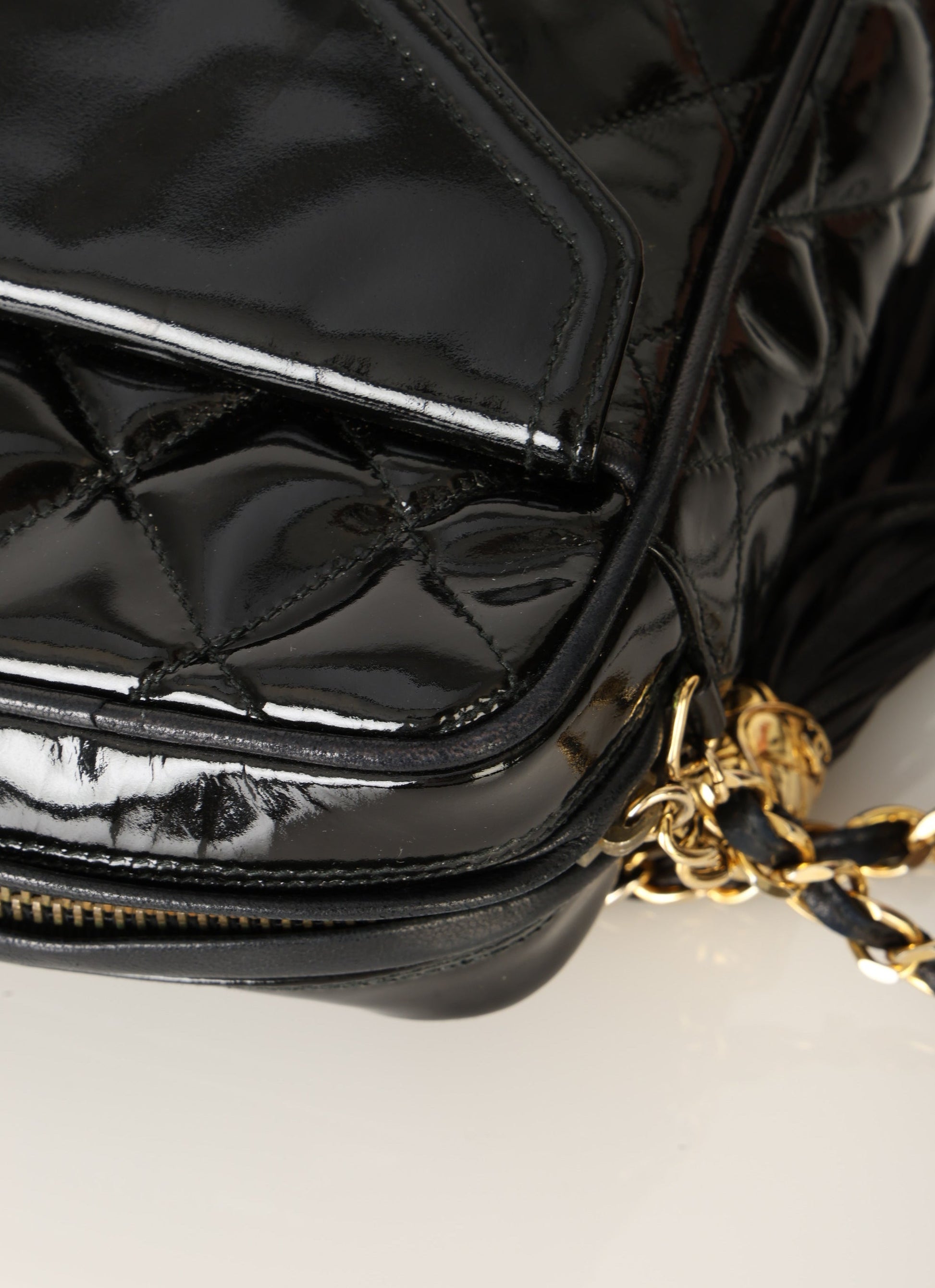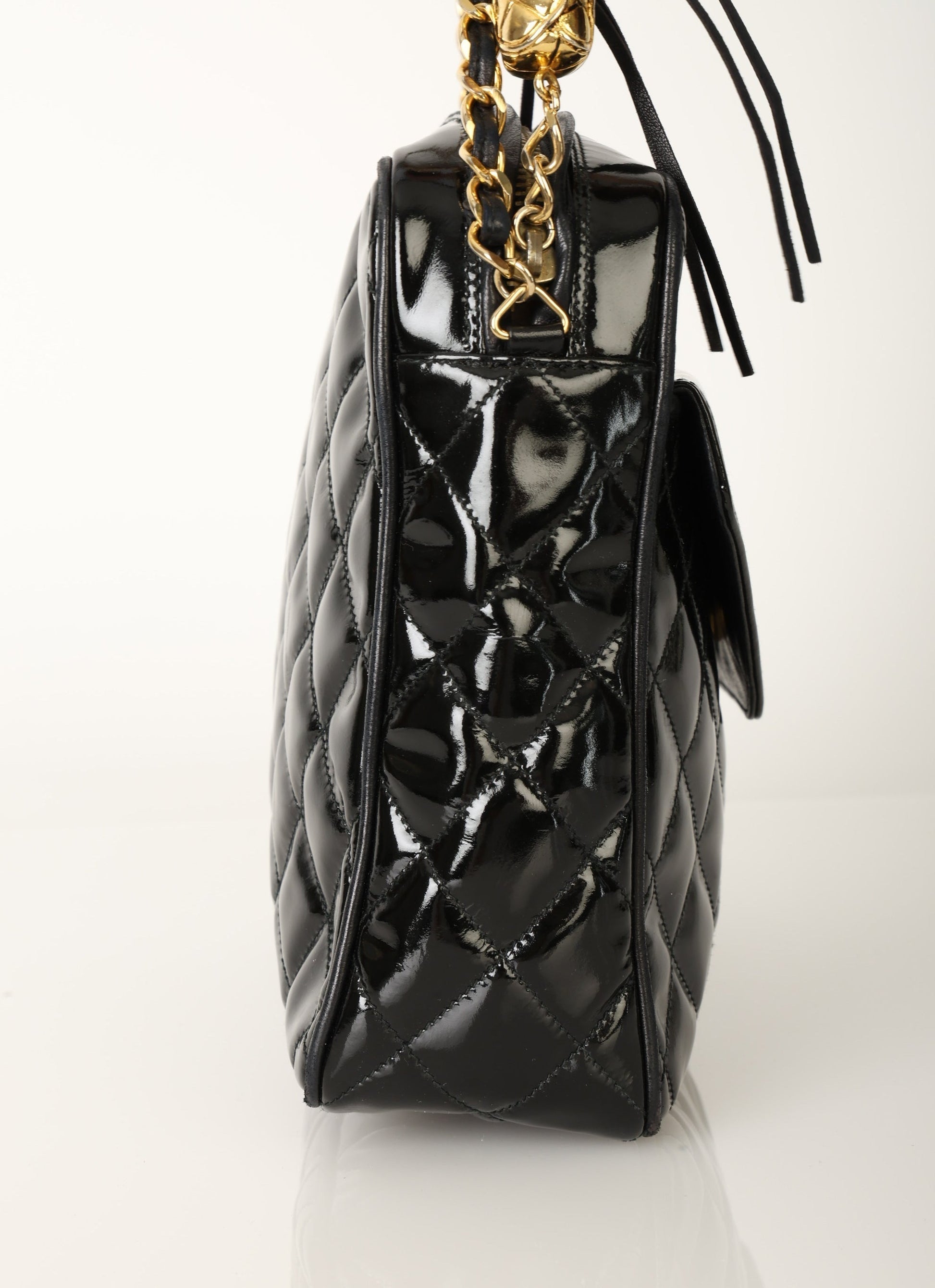 Dropping in the shop is a Chanel Patent Camera Bag in black with gold hardware!?Crafted in Chanel's patent, this camera bag?is perfect for an everyday bag to fit all the essentials! Timeless logo featured on the front of bag with 24k gold plated hardware! the Chanel tassel embellishment is just the icing on the cake! You can fit your iPad and the rest of your daily essentials.?