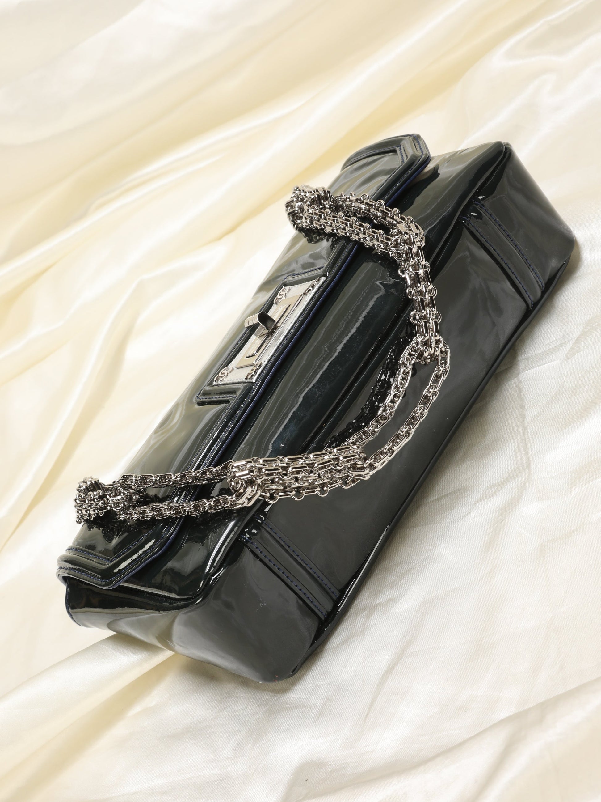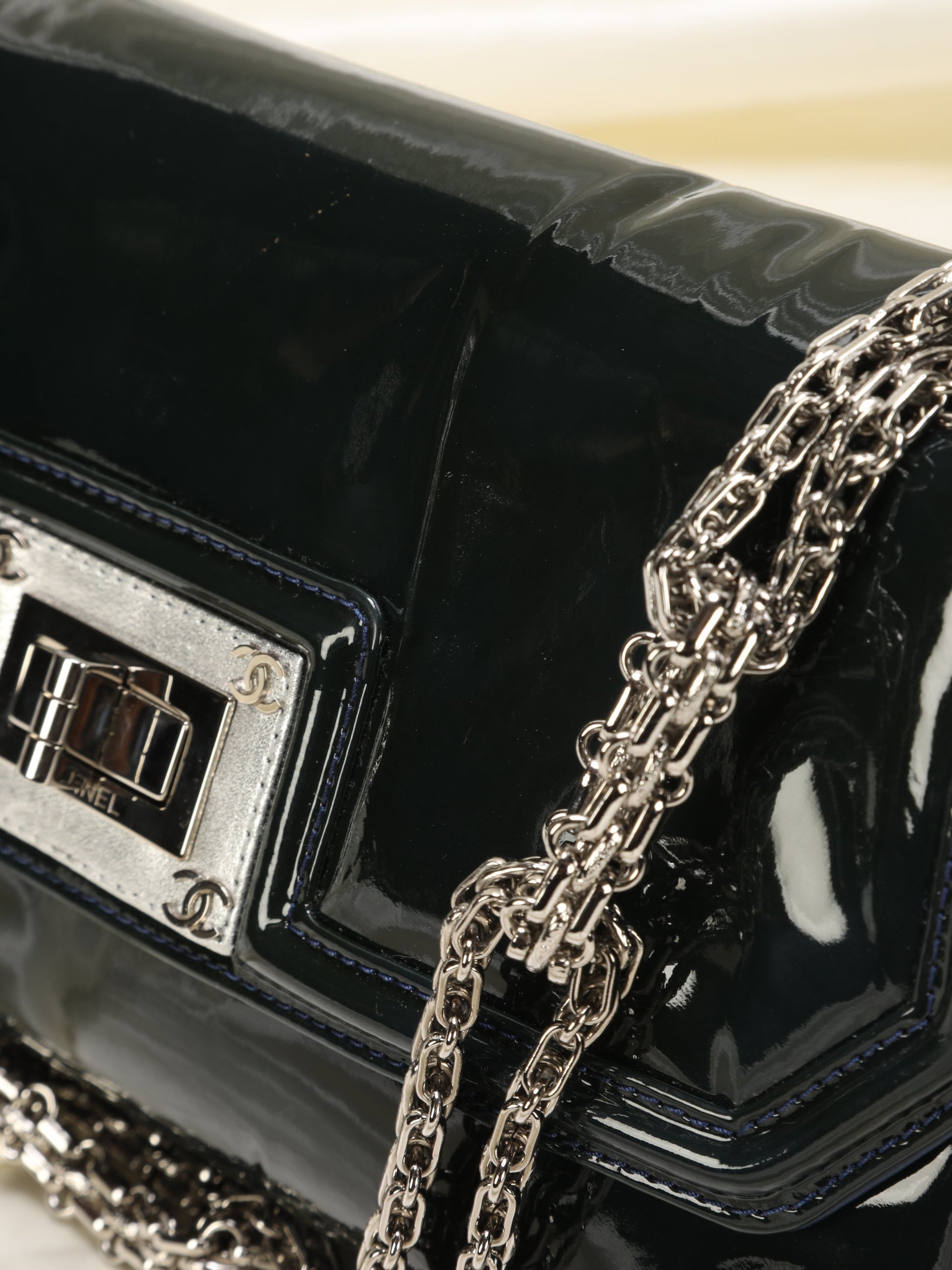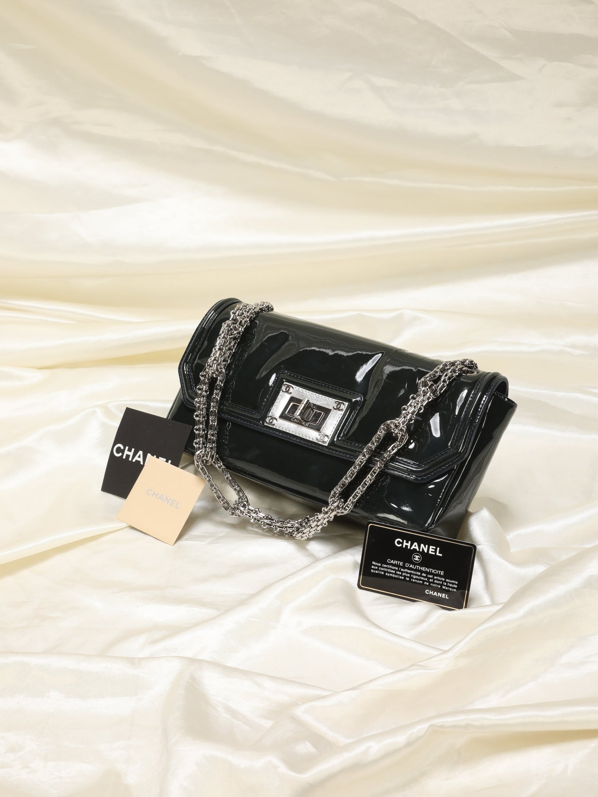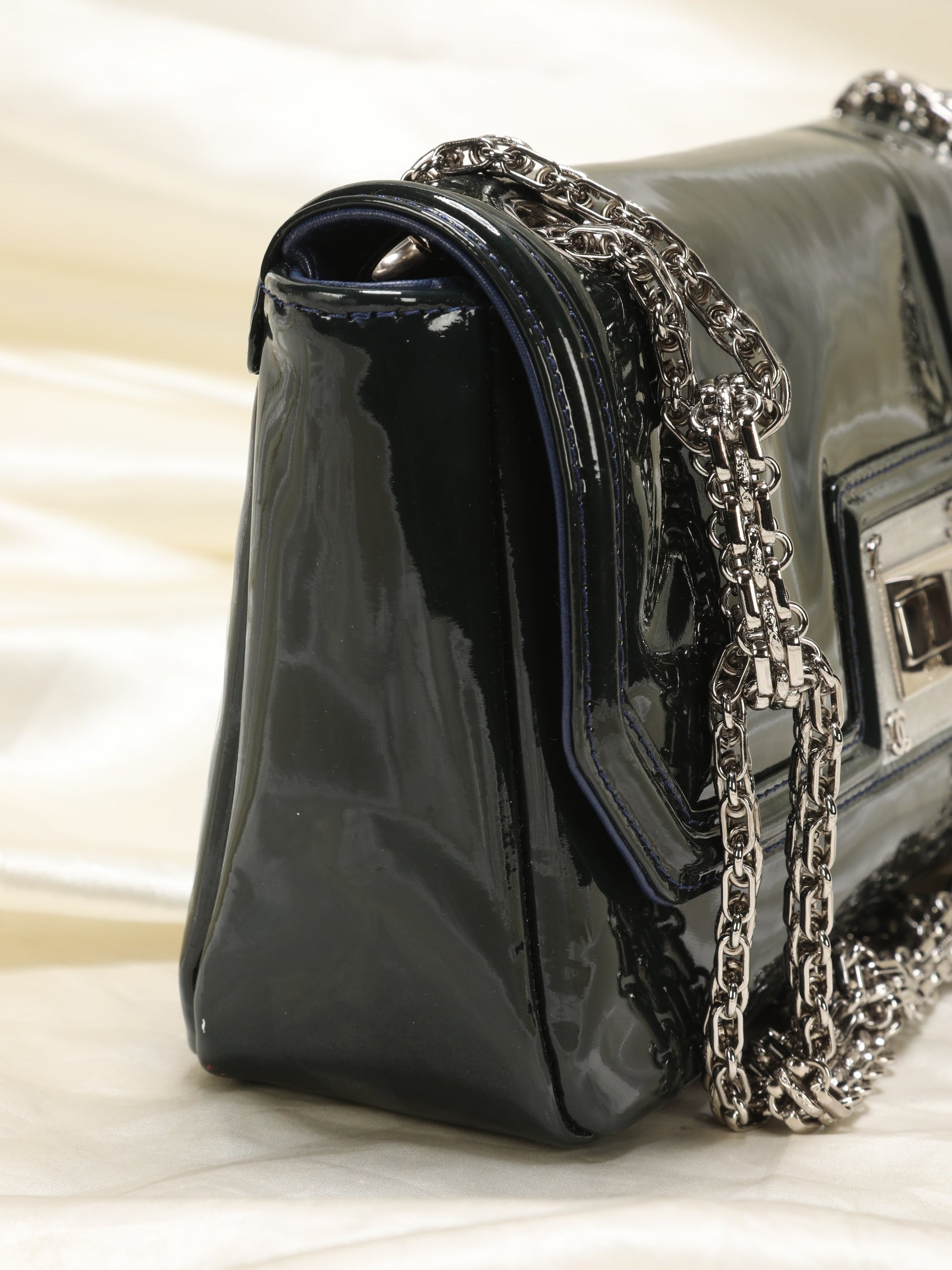 Extremely rare Chanel patent re-issue bag, crafted with stunning silver accents. Beautiful dark hunter green color with edgy chain strap links!?Dainty "cc"s border the turnlock!?