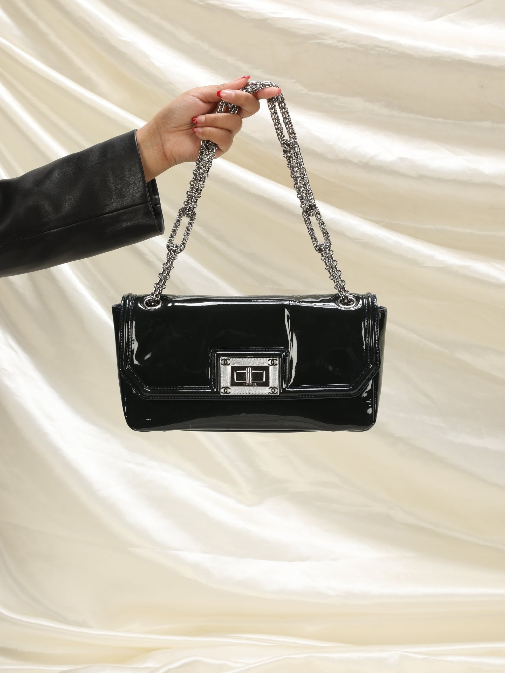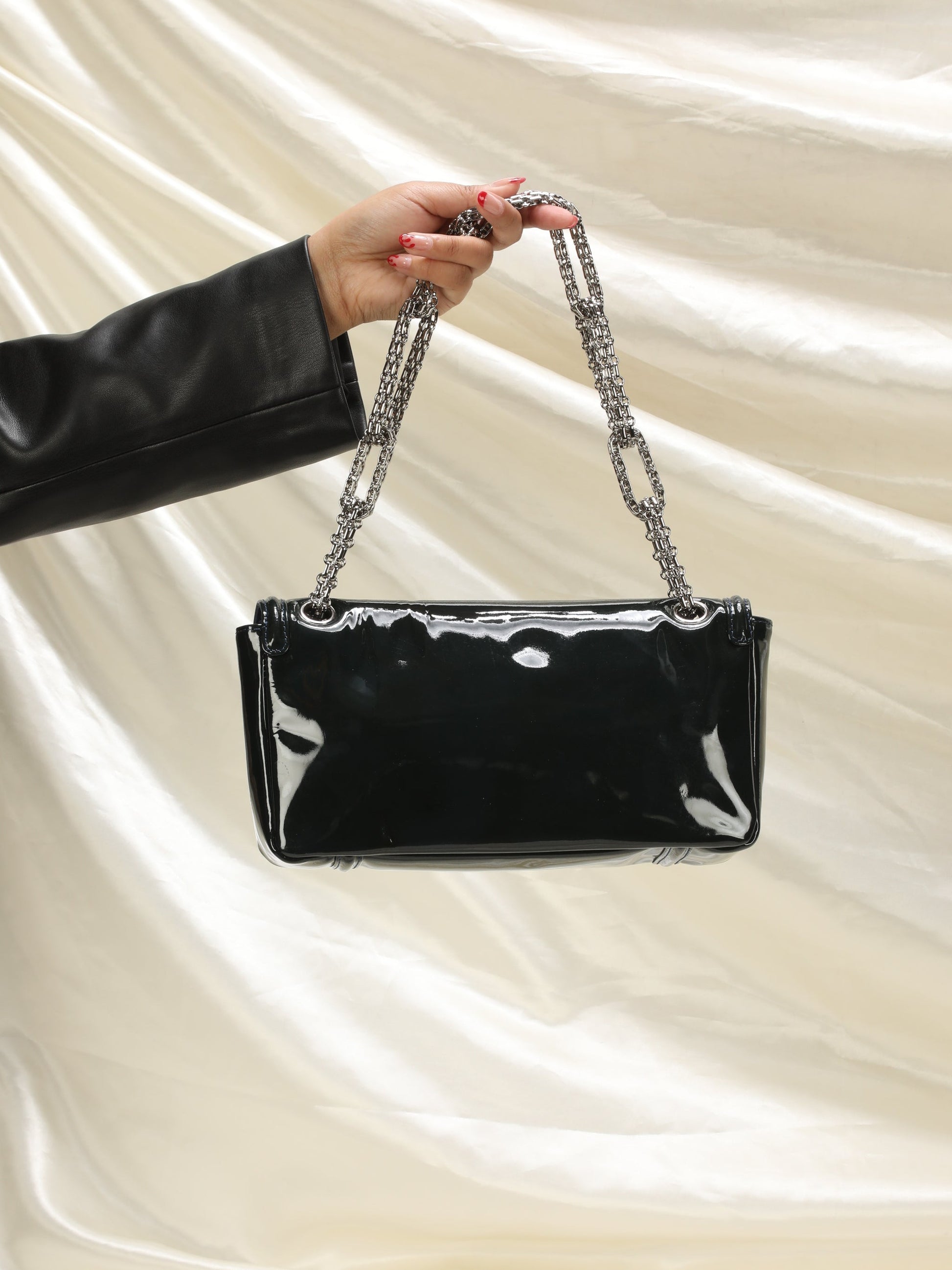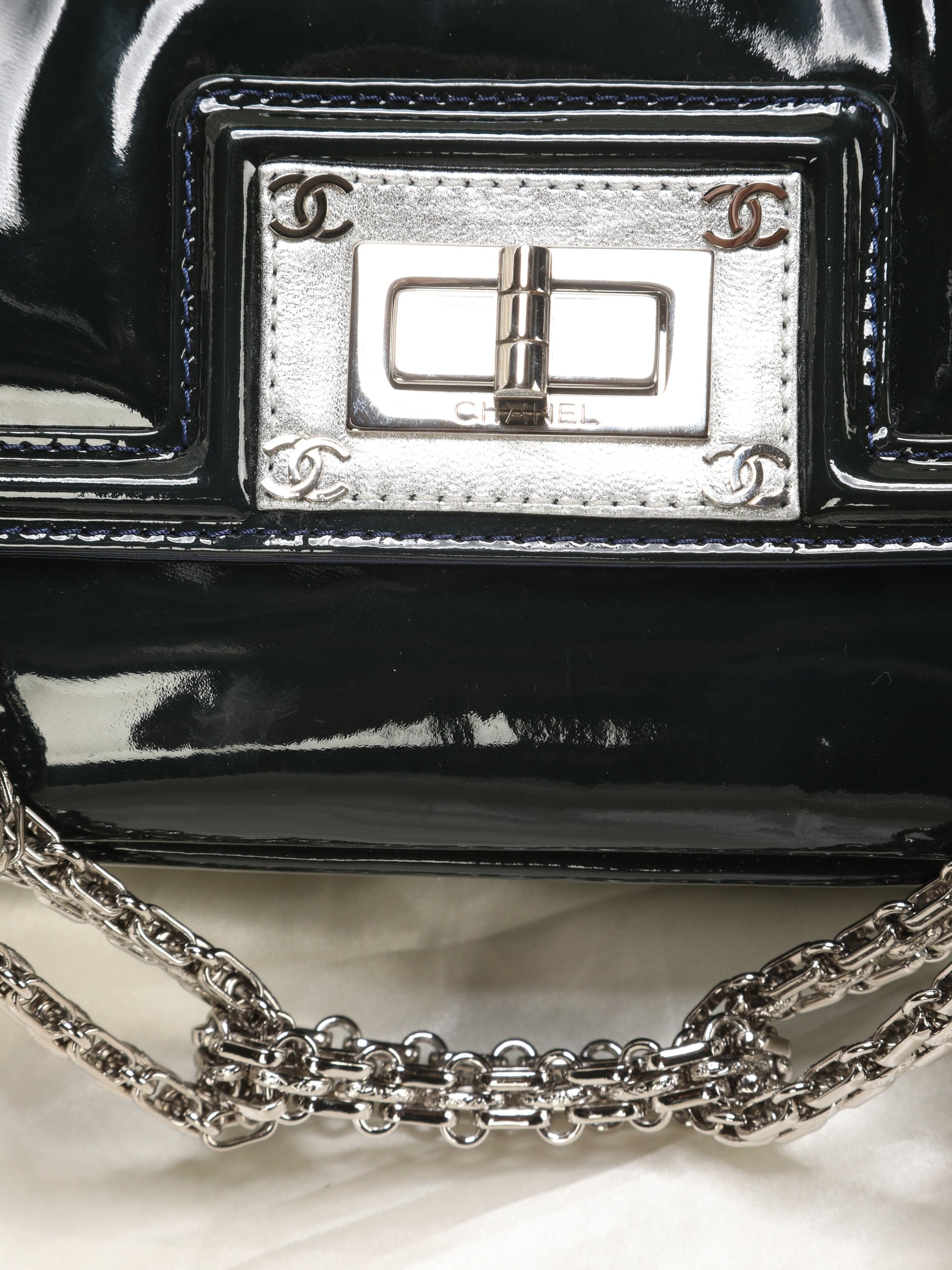 Extremely rare Chanel patent re-issue bag, crafted with stunning silver accents. Beautiful dark hunter green color with edgy chain strap links!?Dainty "cc"s border the turnlock!?