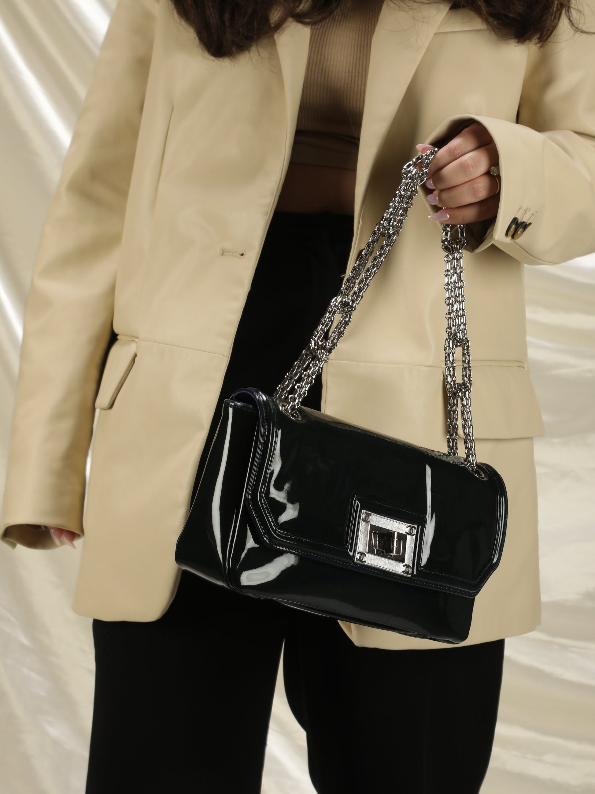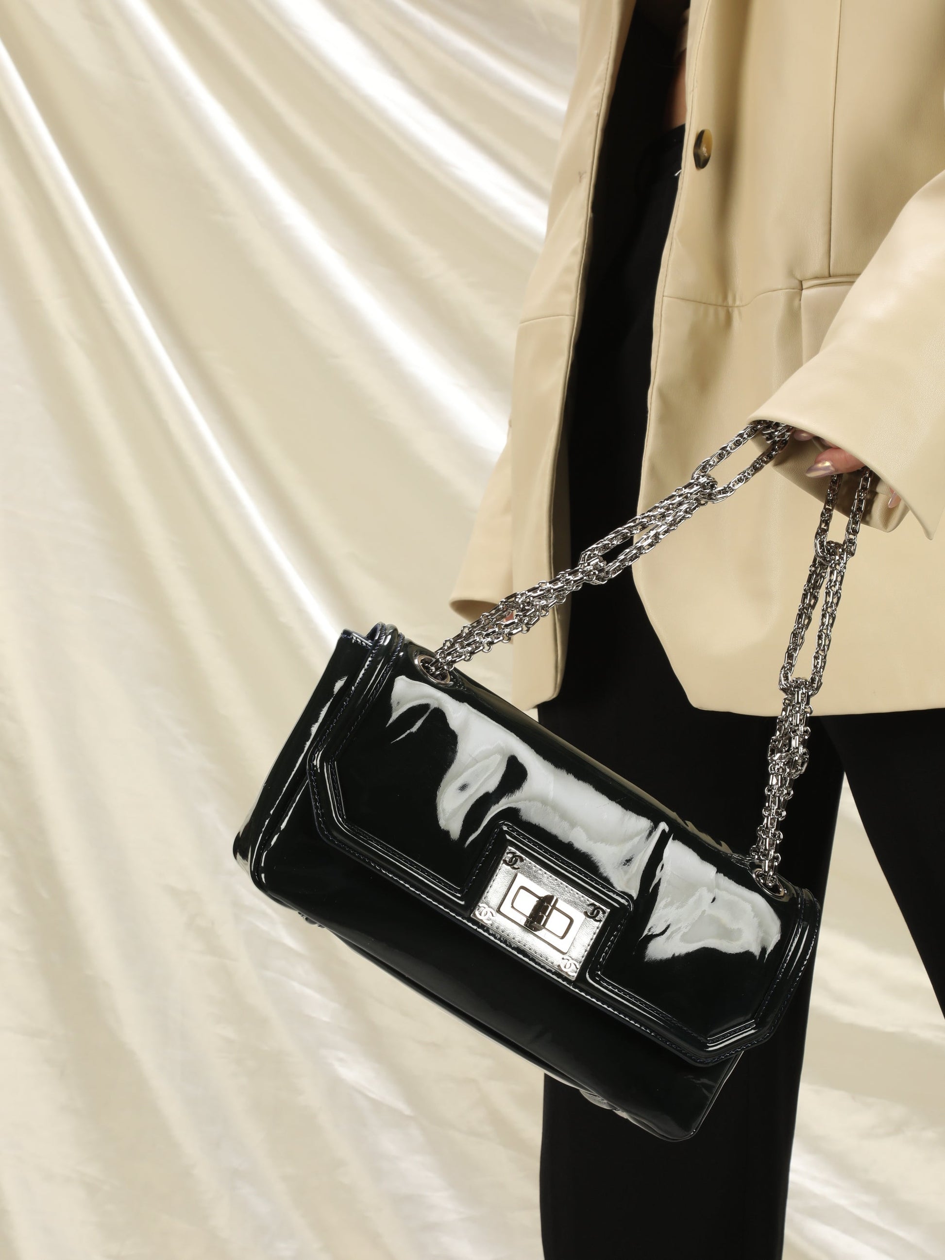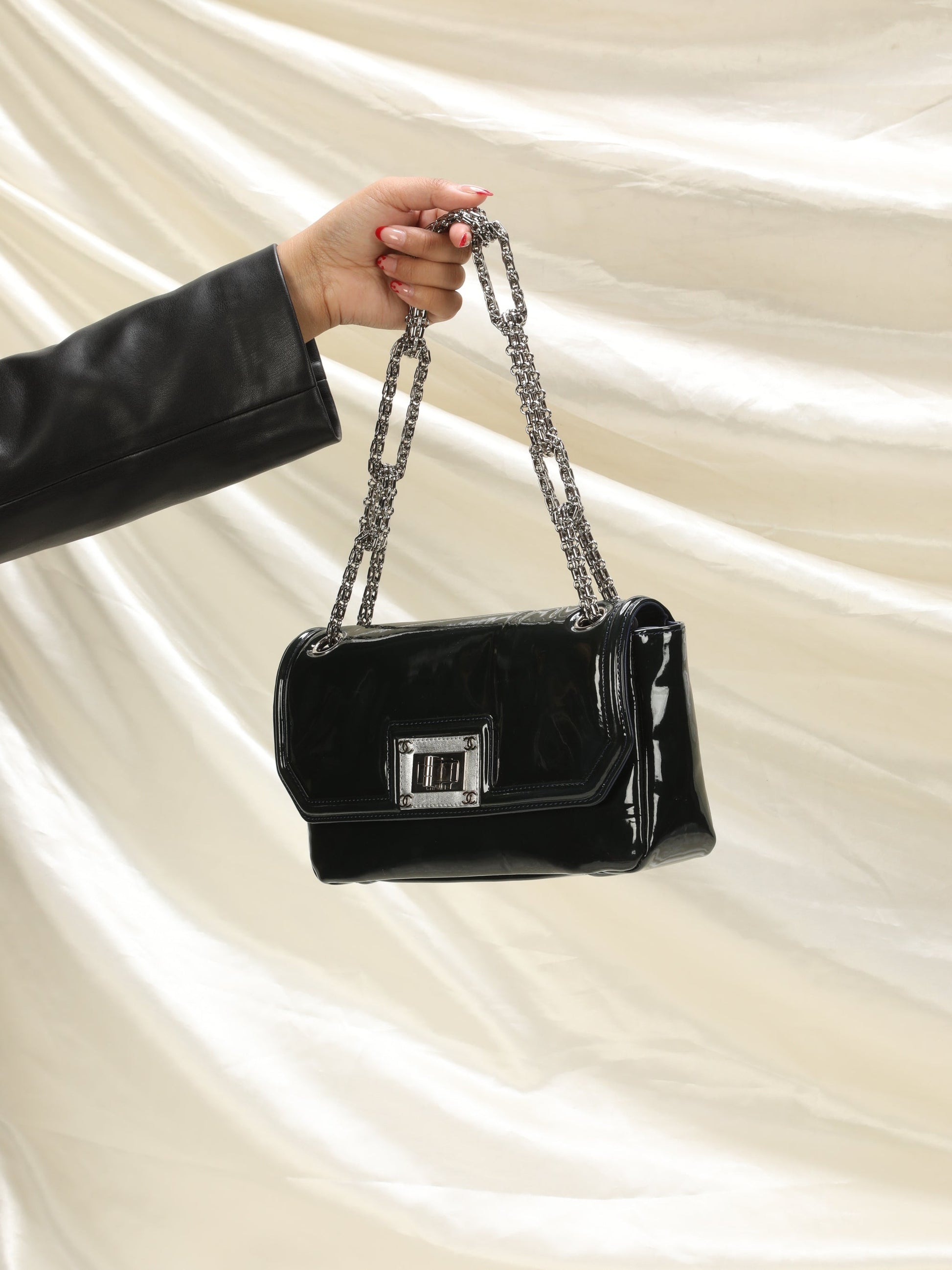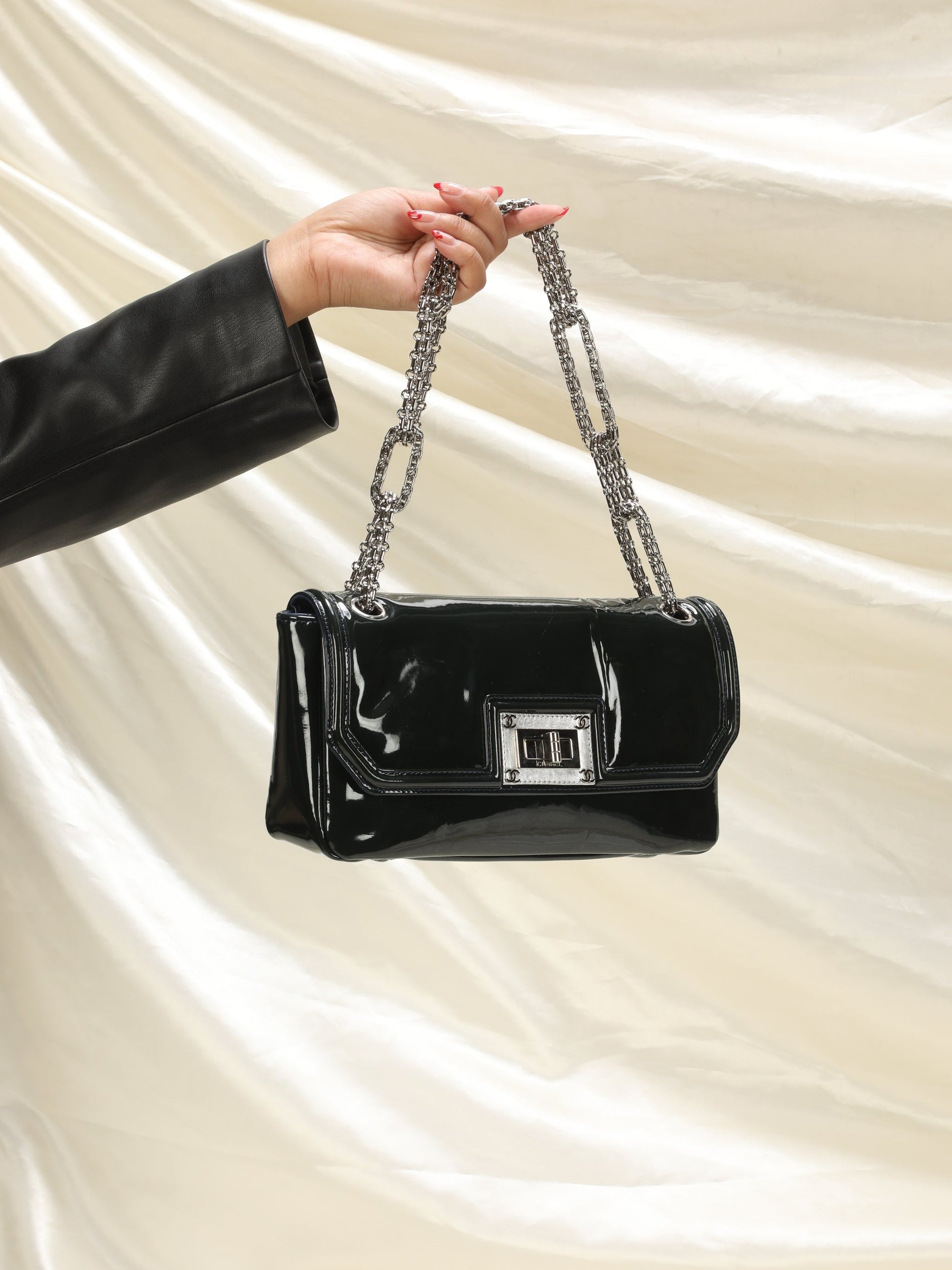 Extremely rare Chanel patent re-issue bag, crafted with stunning silver accents. Beautiful dark hunter green color with edgy chain strap links!?Dainty "cc"s border the turnlock!?