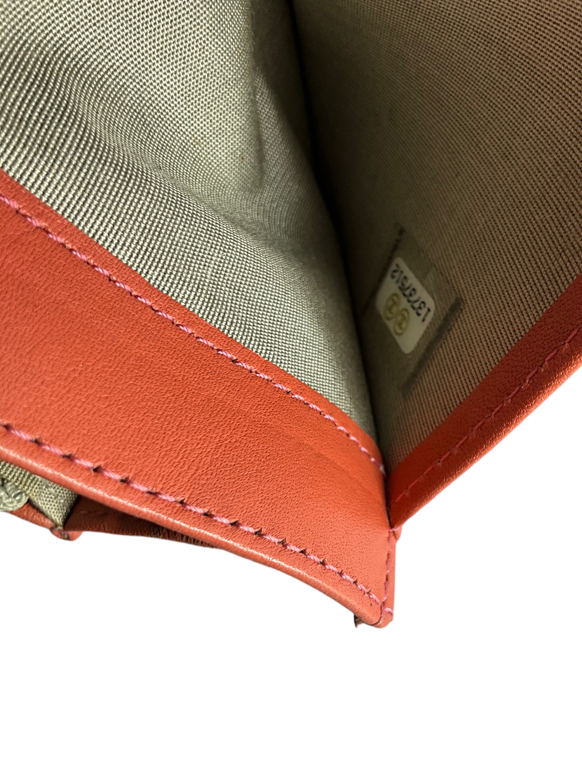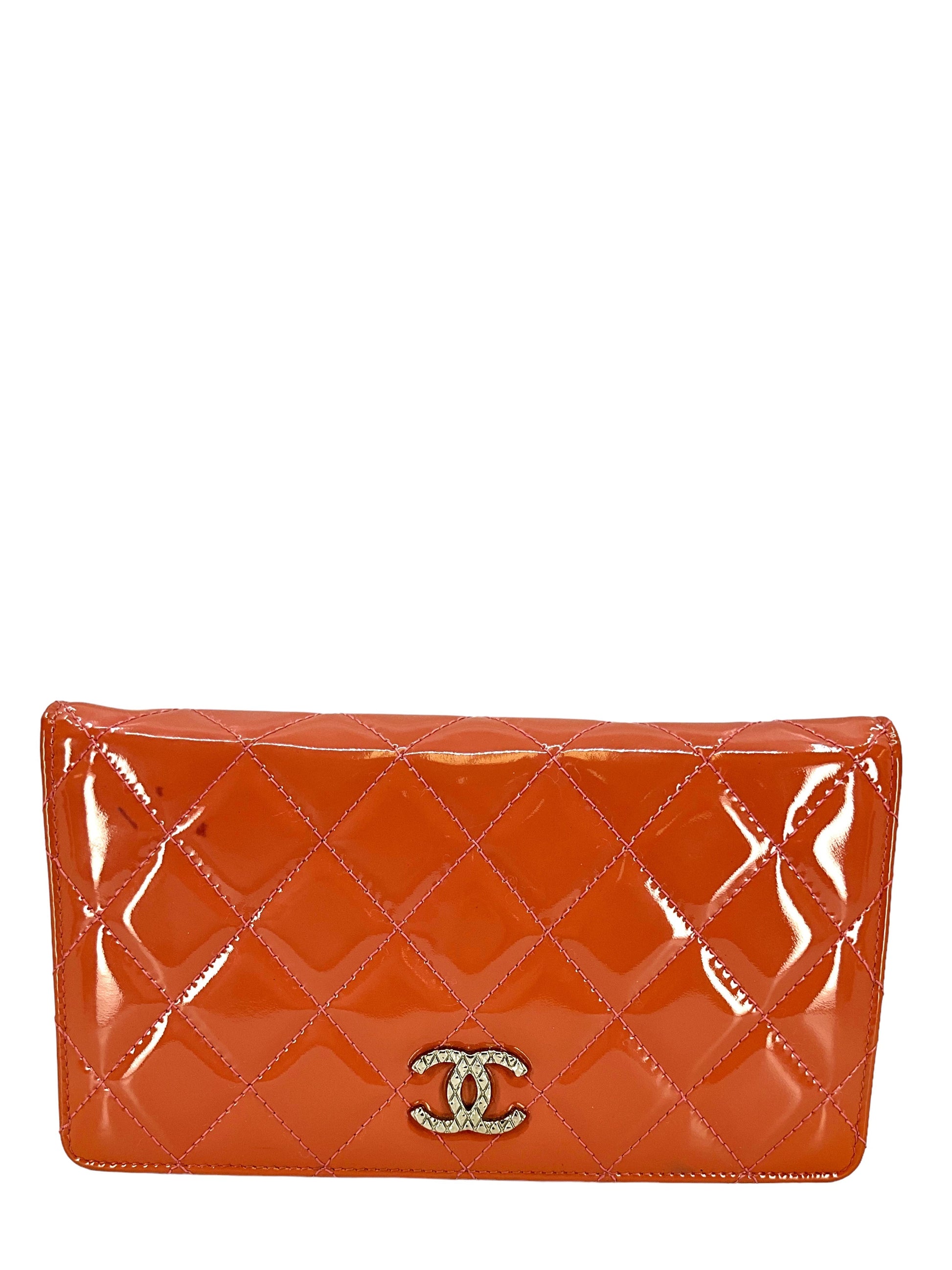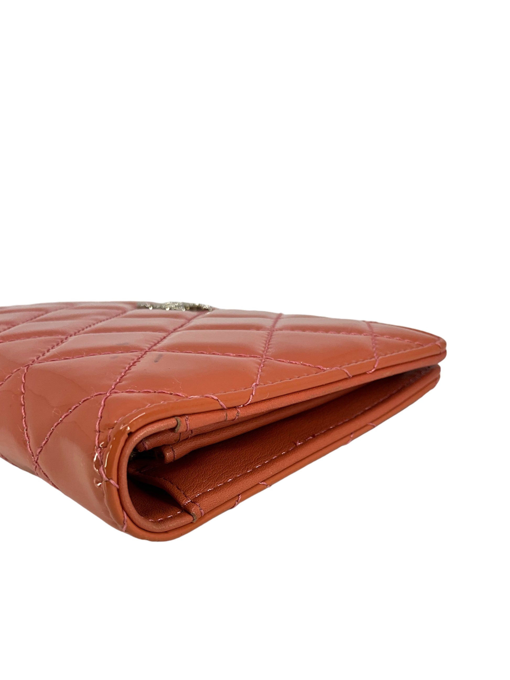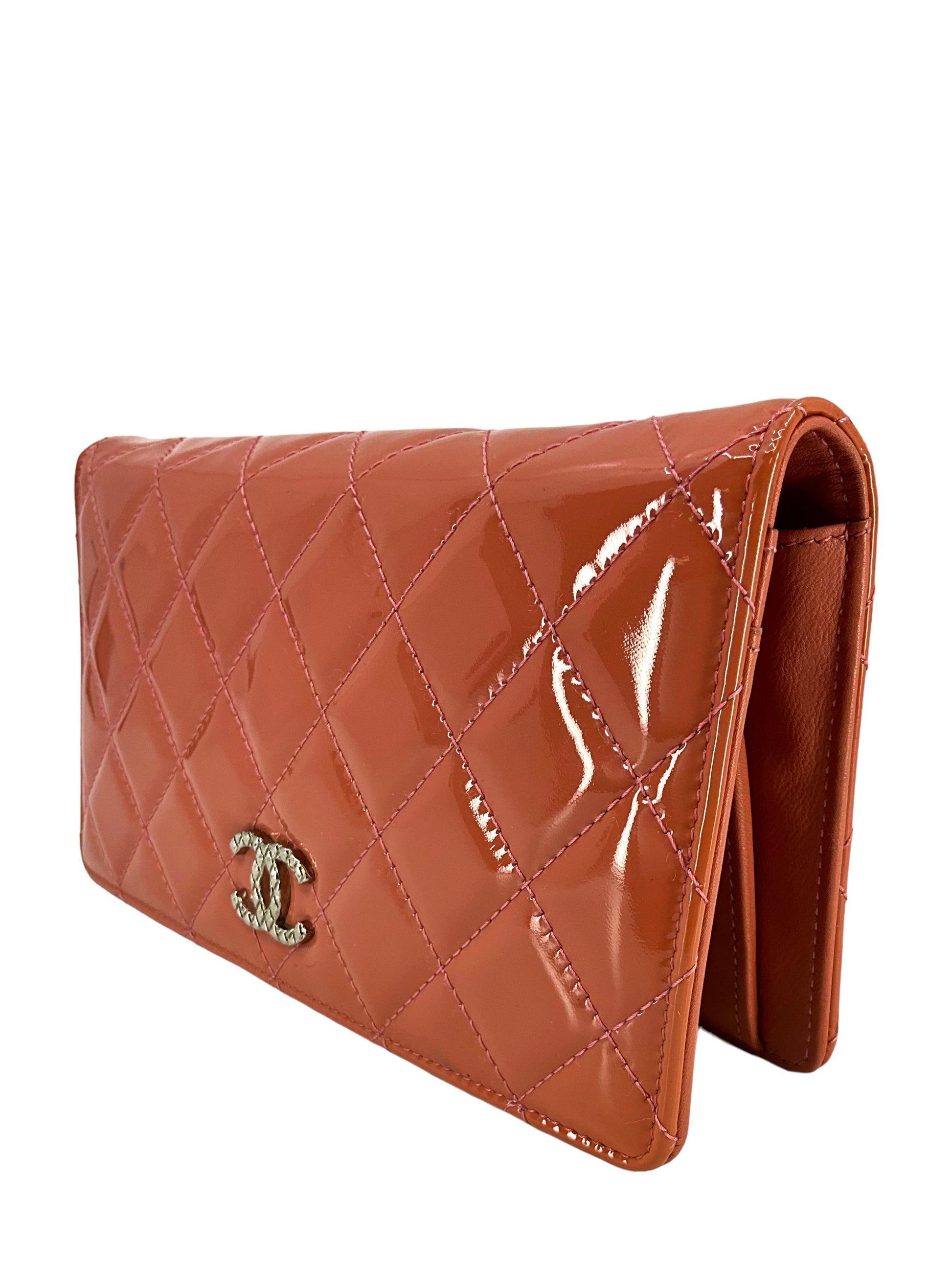 Organize your essentials like bills and credit cards in style with this d CHANEL Patent Leather Brilliant L Yen Wallet crafted from quilted glossy coral patent leather with a signature silver-tone textured 'CC' logo at front.