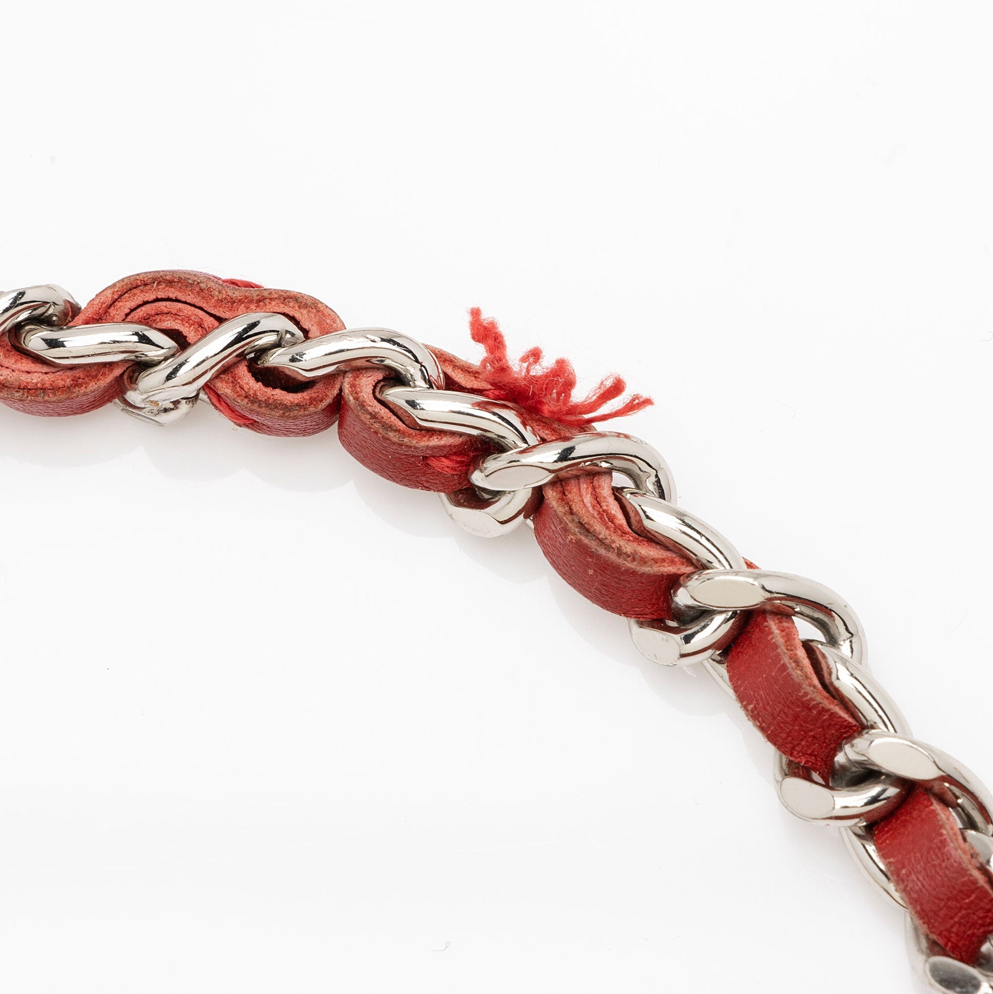 Condition Notes: Darkening and wear to exterior bottom corners. Marks and light discoloration throughout exterior. Marks and darkening throughout leather woven into strap. Surface scratches to hardware. Marks and darkening throughout interior. Light scuffs throughout interior flap.
