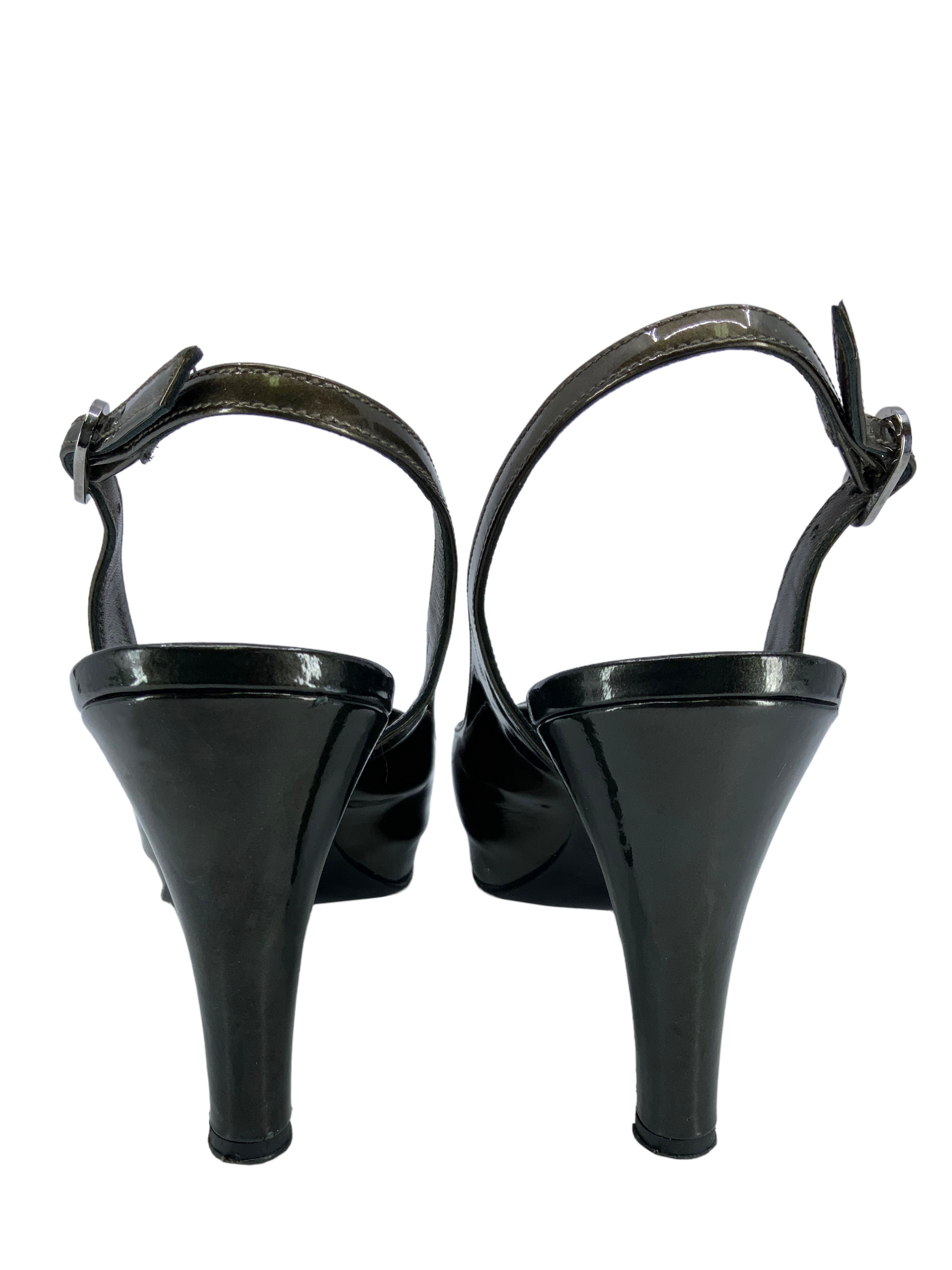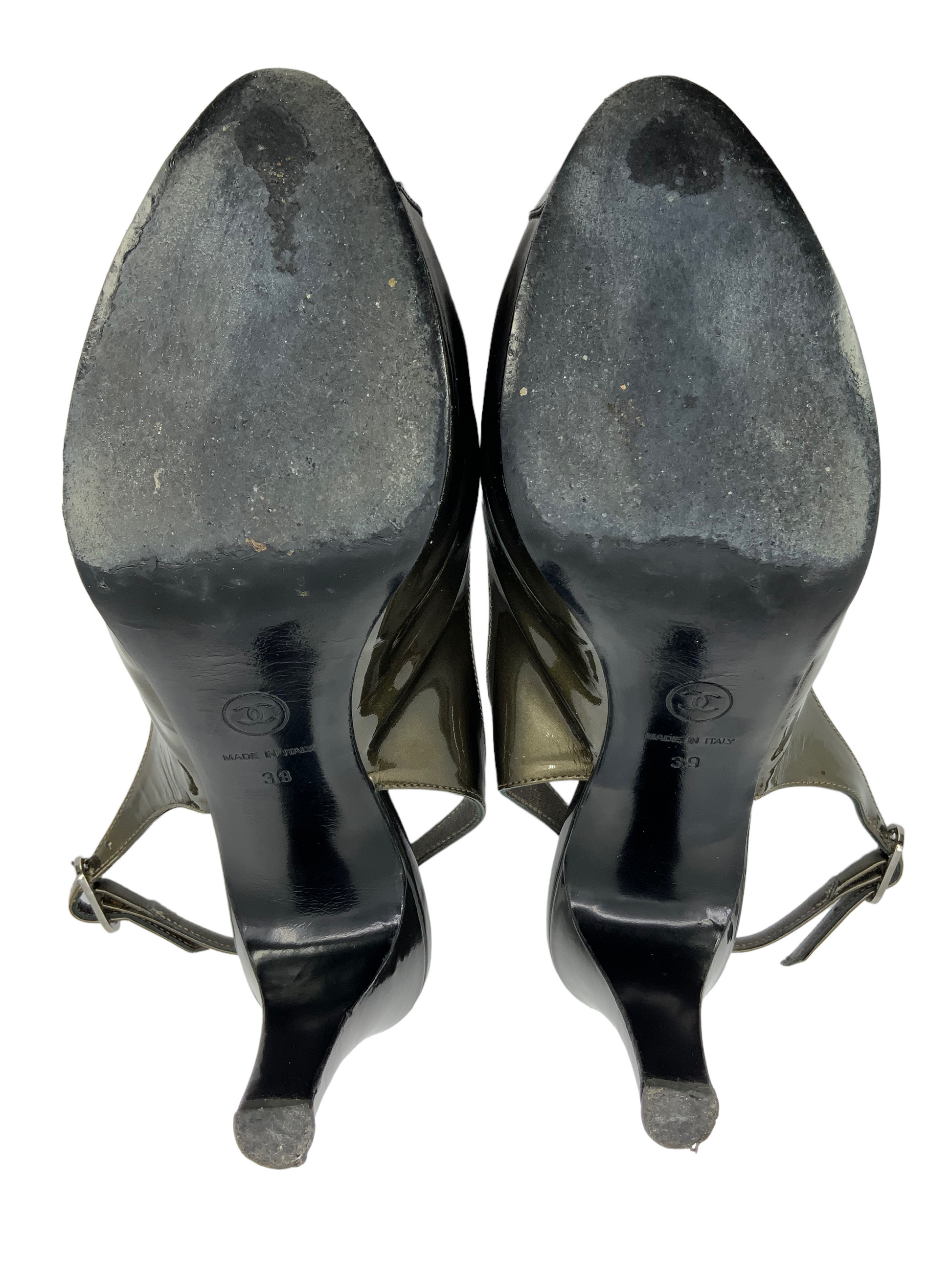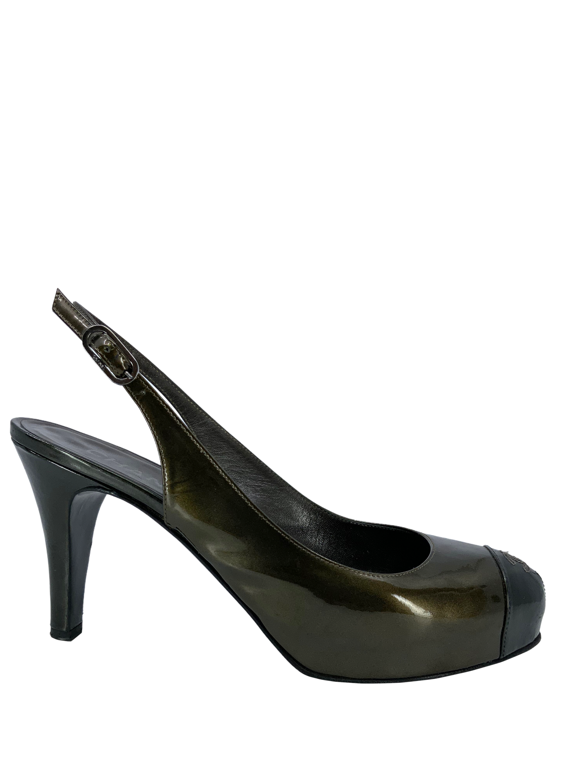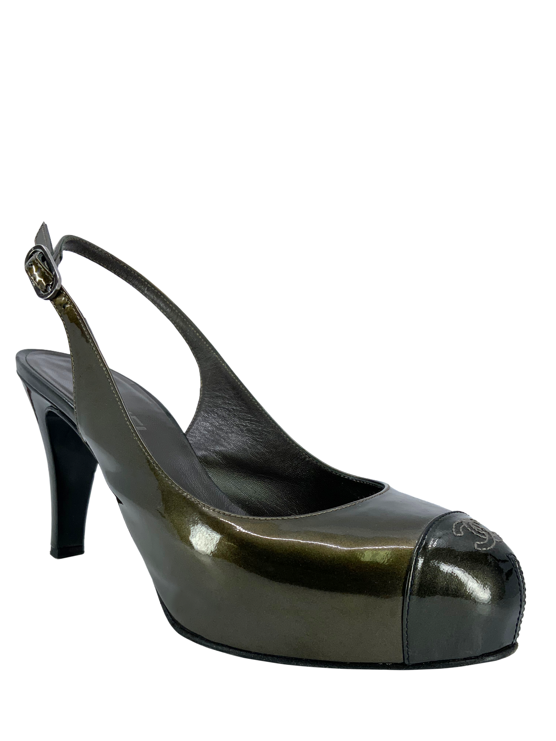 We the ity of these Chanel Patent Leather Chanel Patent Leather CC Logo Cap Toe Slingback Pumps Size 9 (IT 39) crafted from glossyolive green patent leather with a black 'CC' cap toe. Featuring an adjustable slingback with buckle fastening and a self-covered heel.