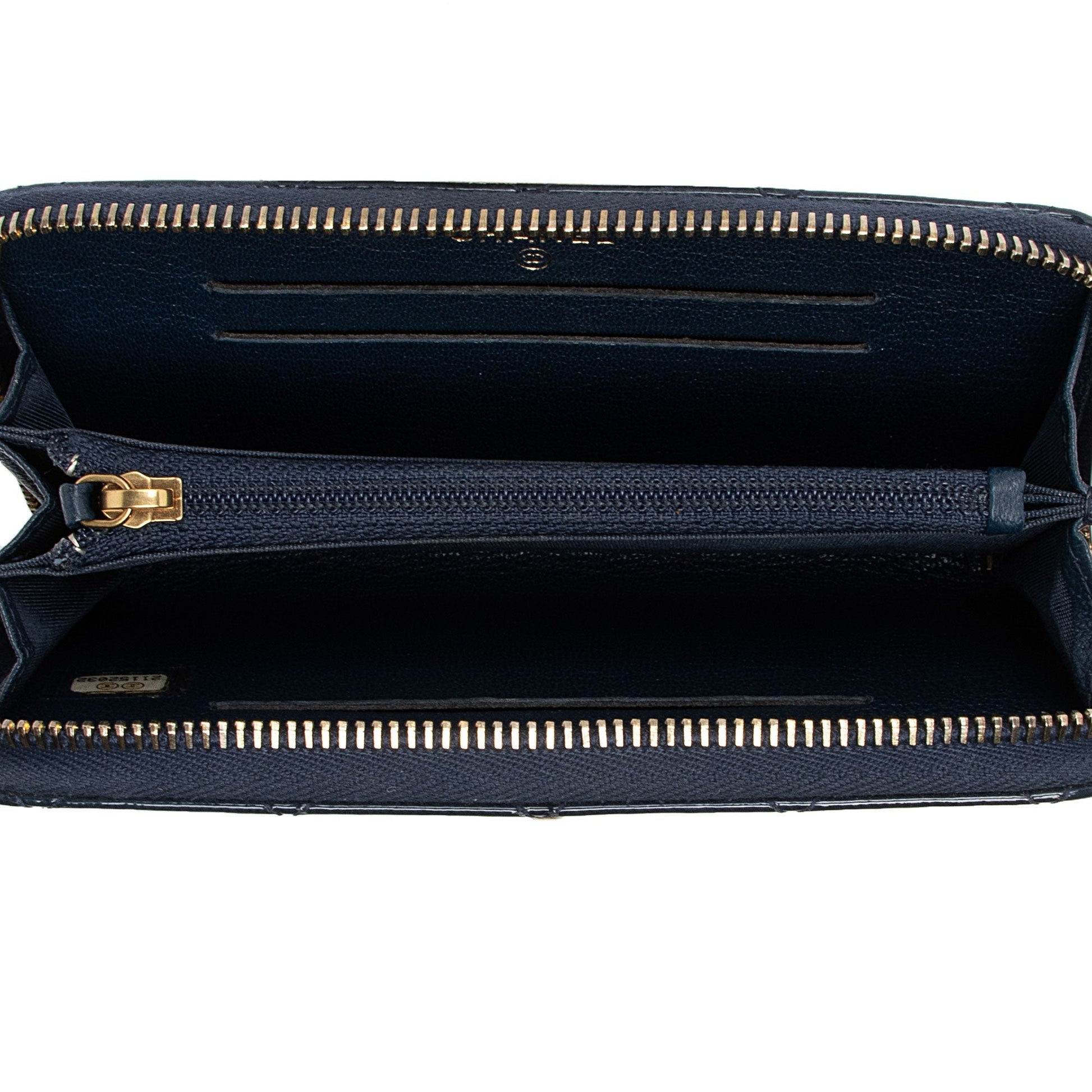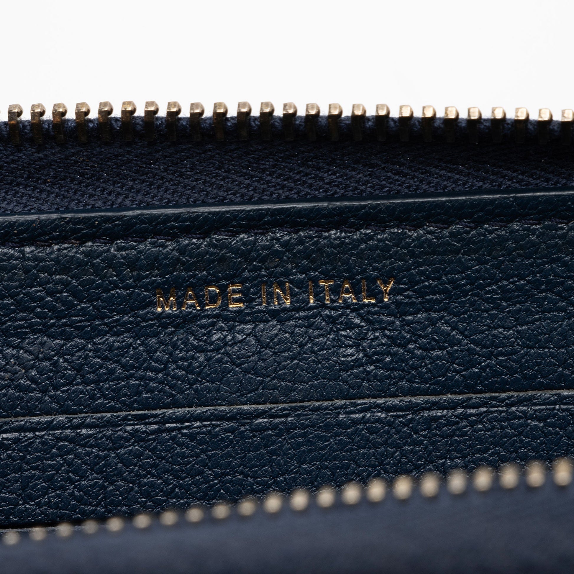 Condition Notes: Light marks and scuffs throughout exterior. Subtle pilling throughout zipper tape. Light surface scratches to hardware. Light marks and wear throughout interior. Please note: Read product details carefully. This is a dark blue wallet.