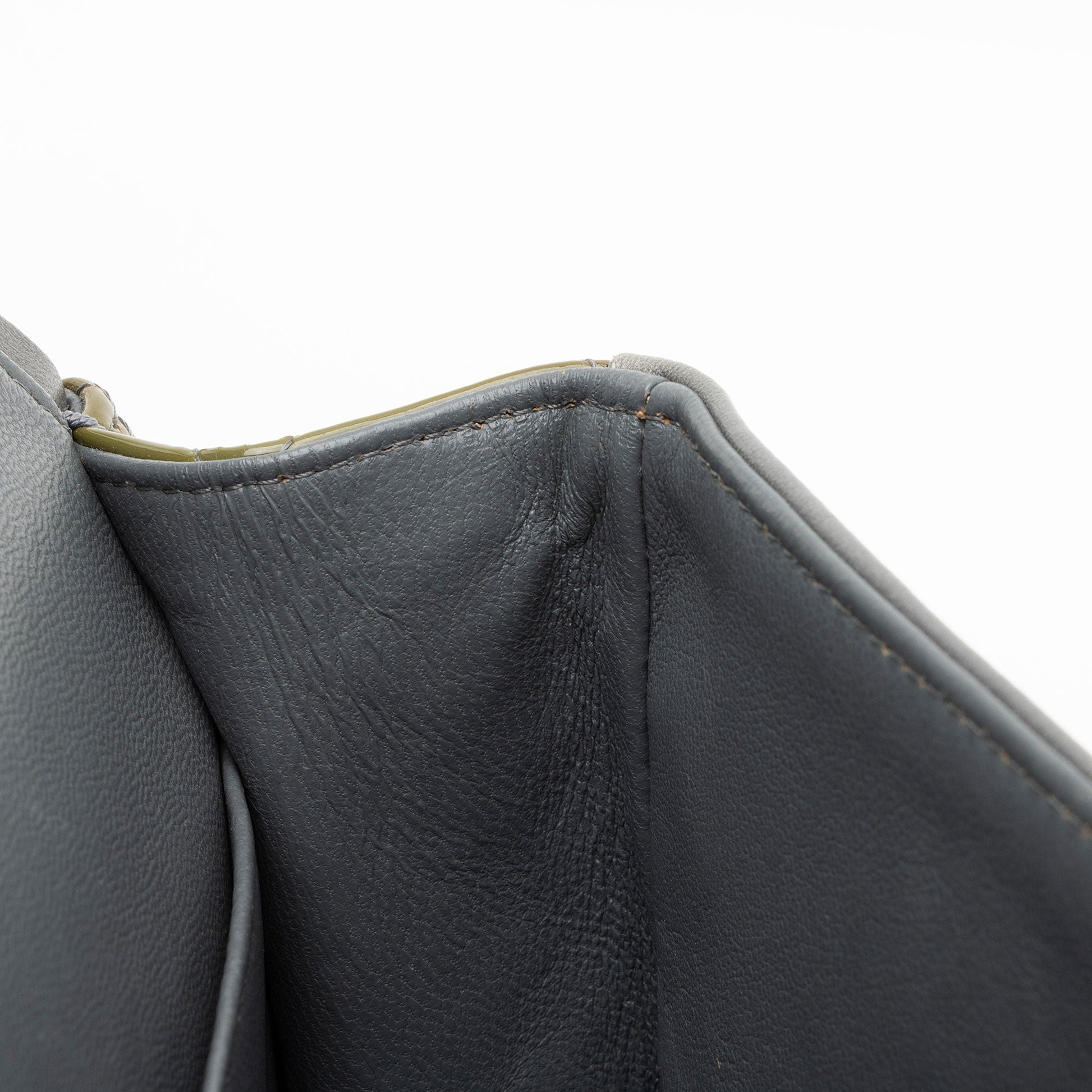 Condition Notes: Heavy discoloration, marks, and scuffs throughout exterior. Surface scratches to hardware. Tarnishing to closure hardware. Light creasing and scuffs throughout interior flap. Visible imprint to interior double flap from zipper.