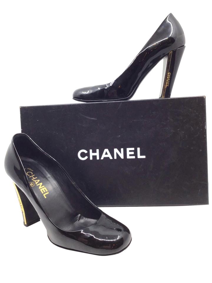 We the ity of theseChanel Patent Leather Metal Logo Heel Pumps Size 7.5 | 37.5crafted in Italy of the finest patent leather with 4" self covered heels. The outer heels feature vertical gold tone metal bars witha signature 'CHANEL' logo followed by black leather insoles. Box included.