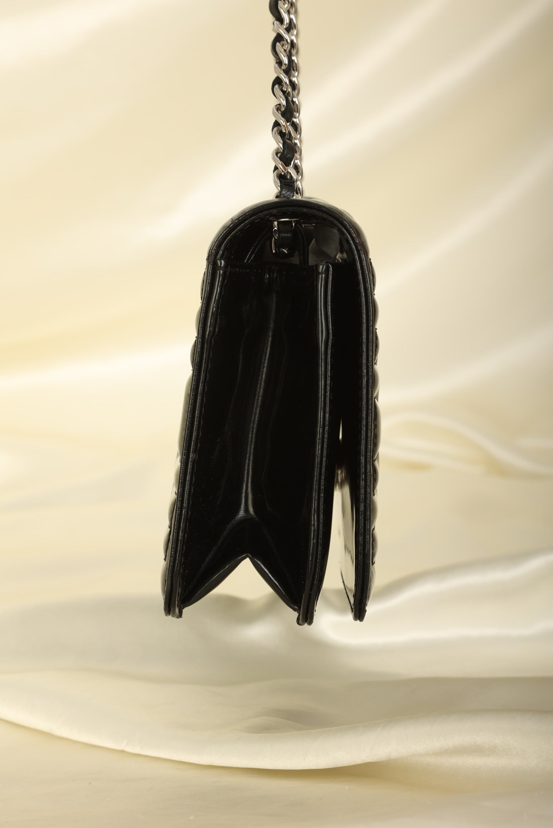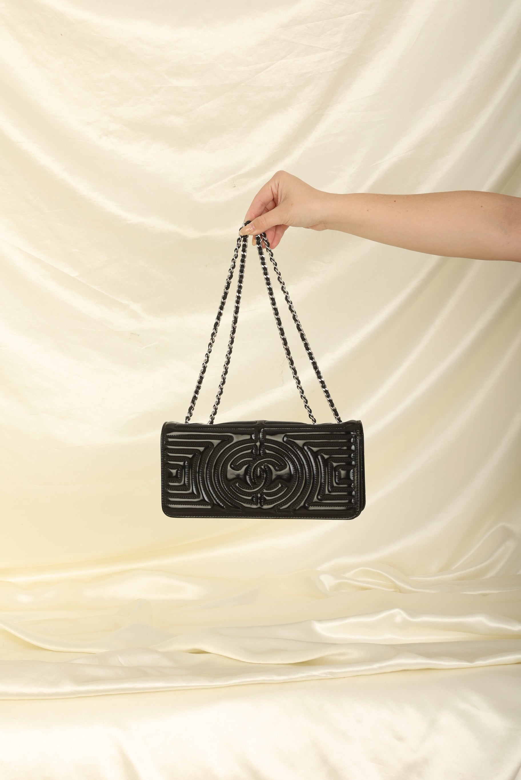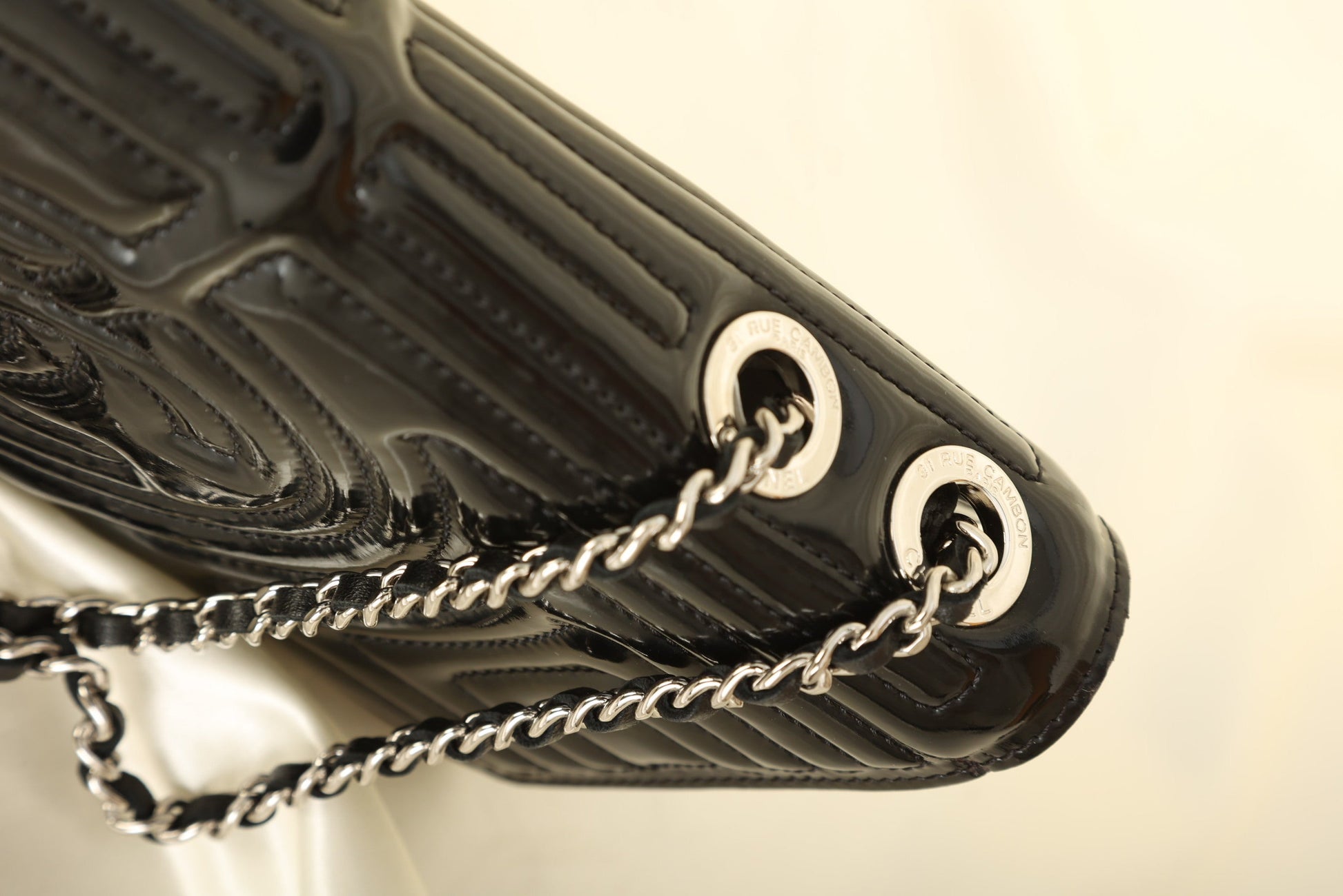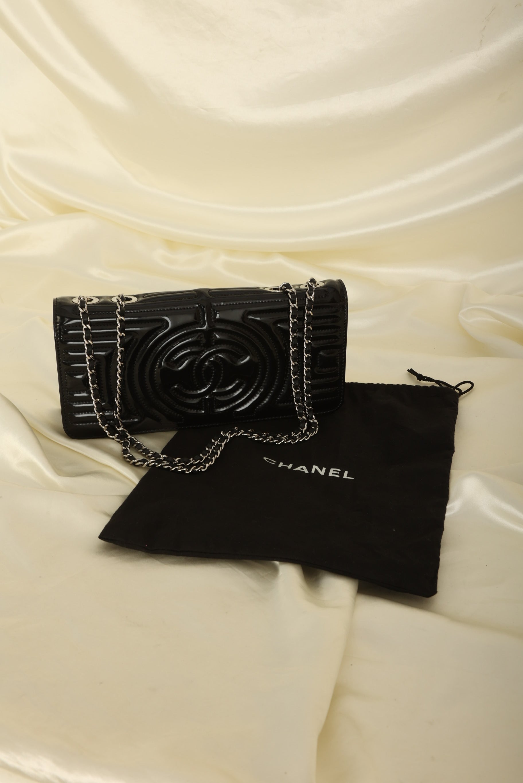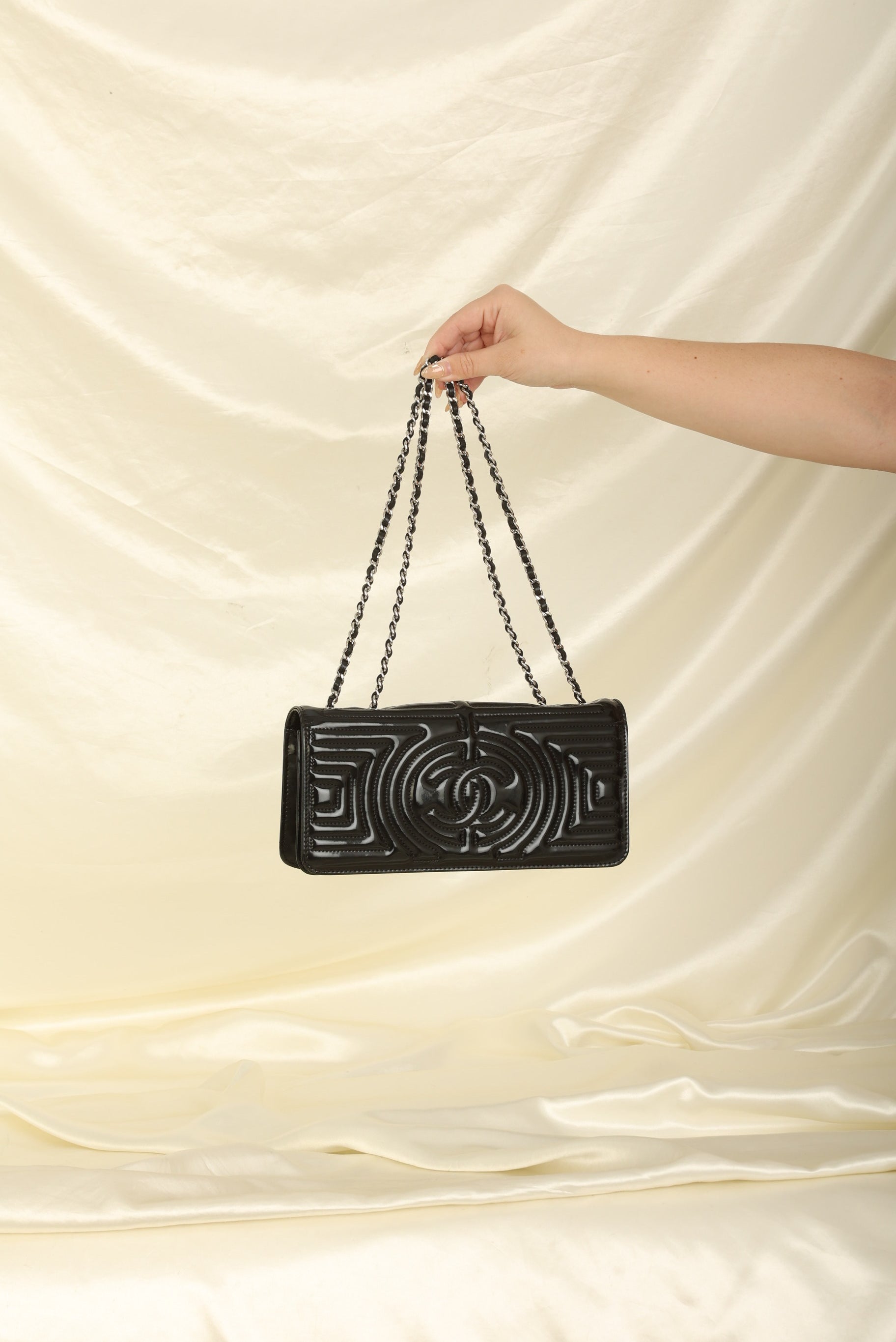 This stunning Chanel pochette is crafted of luxurious patent leather with silver hardware. The?geometric stitching of the?iconic timeless logo makes this so funky and unique! The size is similar to an East West, allowing this bag to go with anything and everything, and fits a cardholder, keys, phone, and lipstick.