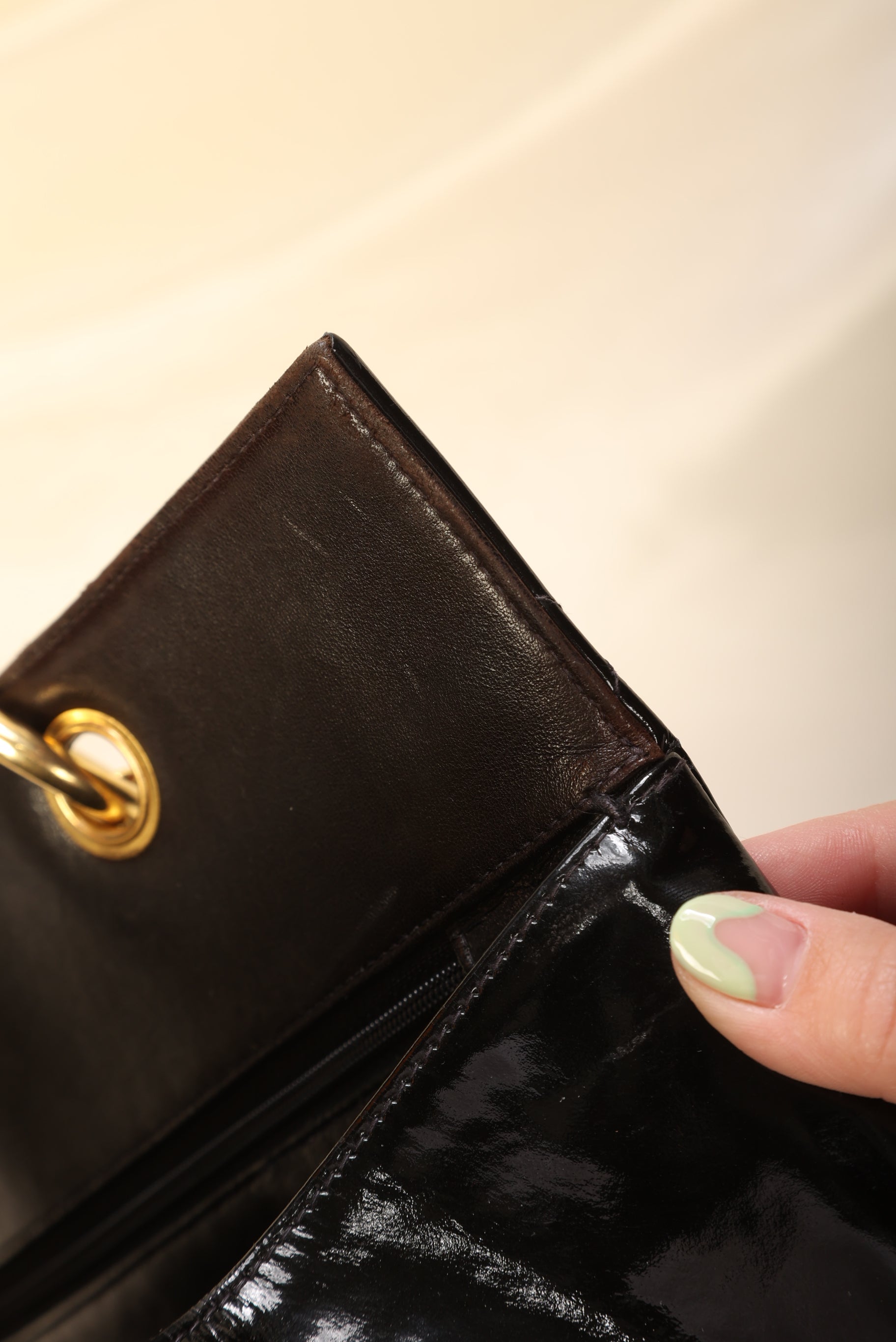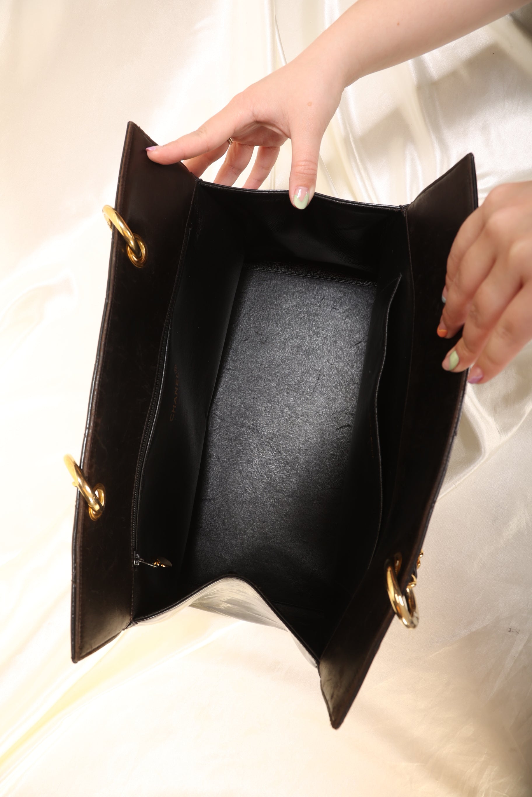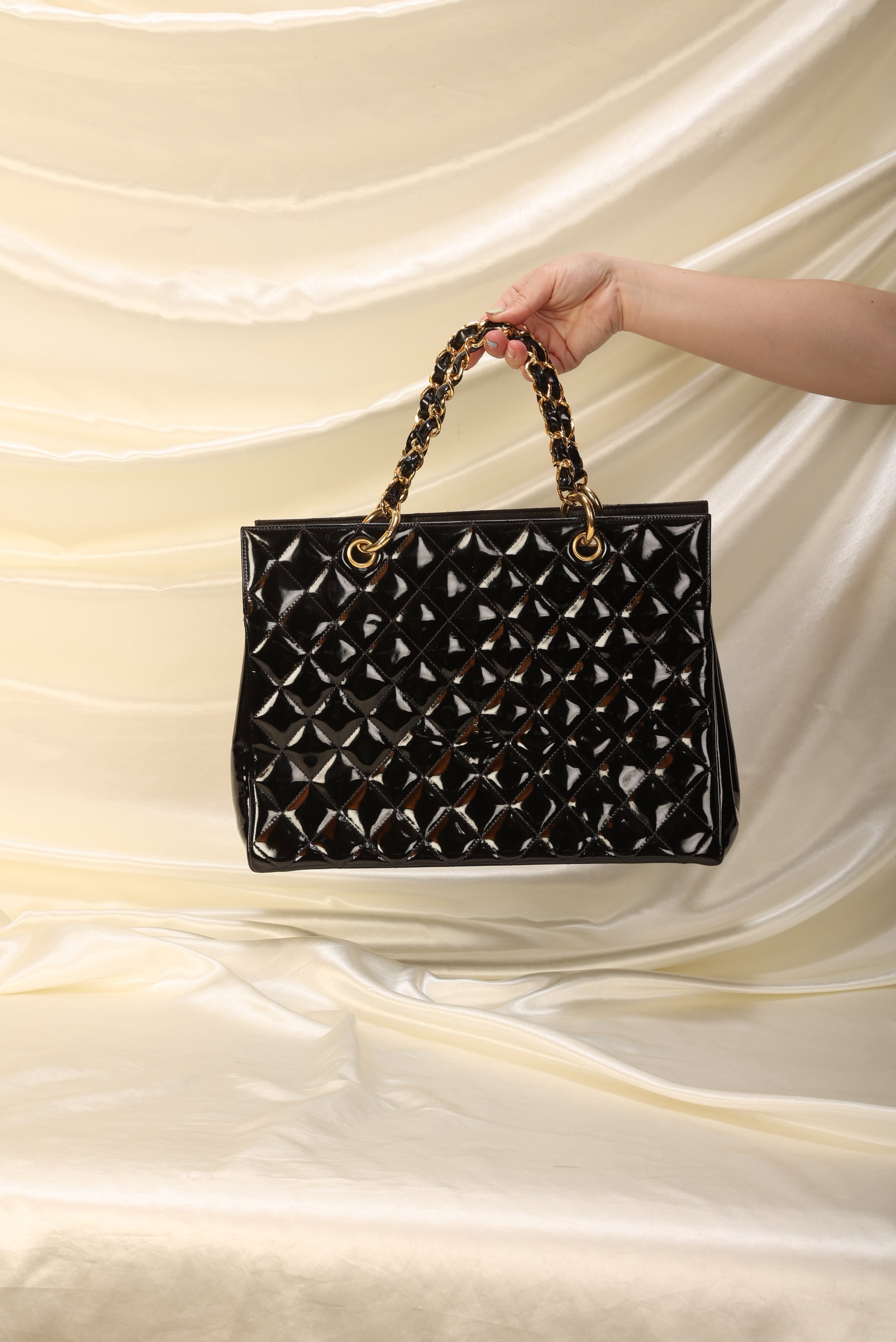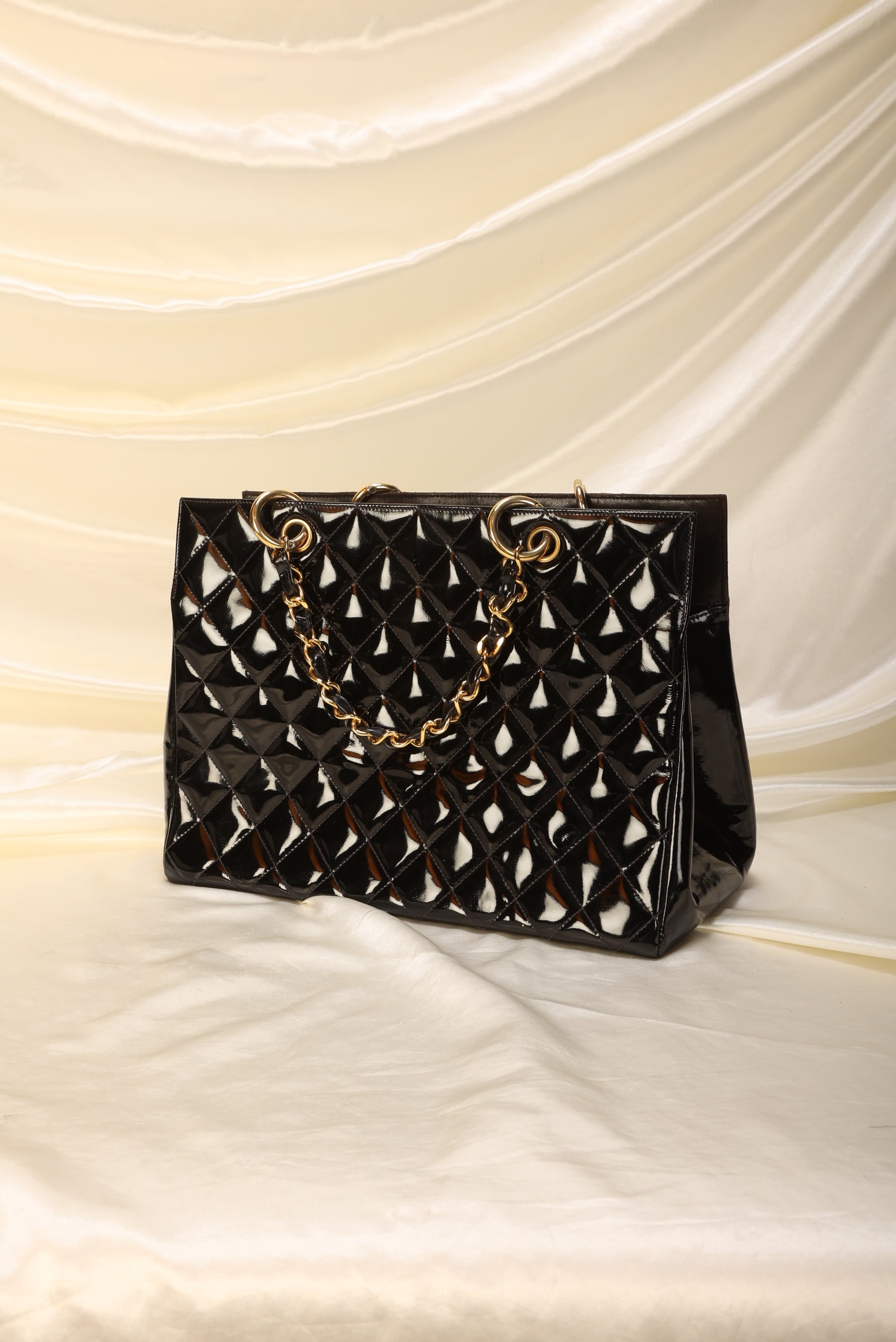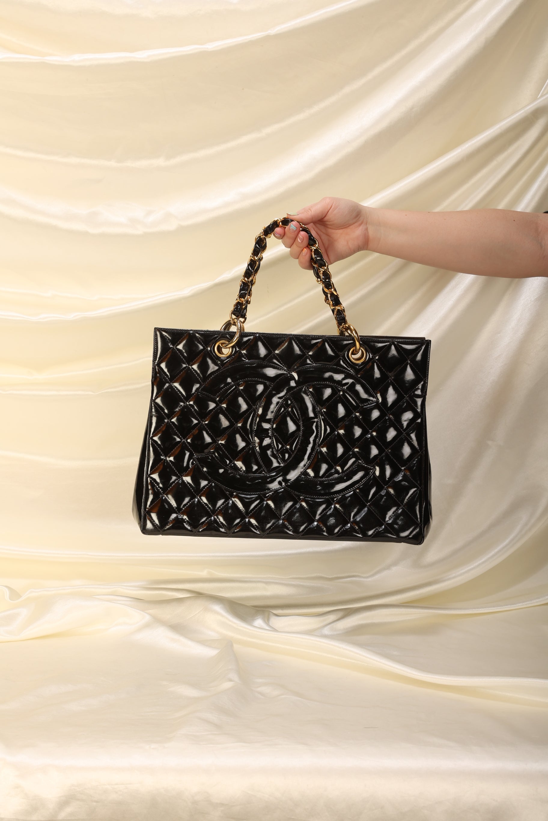 A stunning and bold Chanel patent tote with 24K gold plated chains!! Features a huge Chanel timeless logo on the front! Simply iconic, and perfect to style with a casual fit. Can fit a 13-15in laptop. Gives an effortless chic vibe when with a ?coat!?