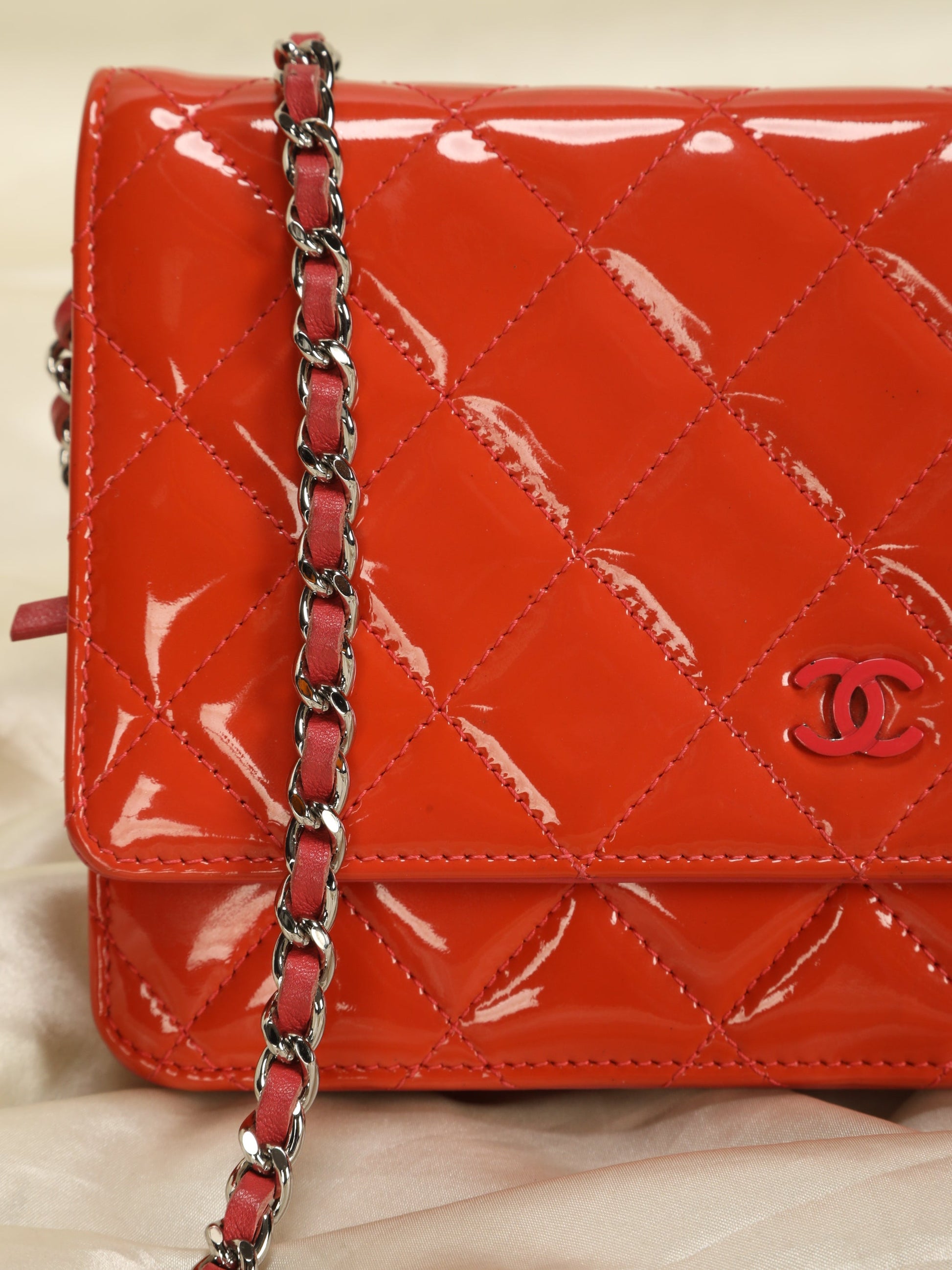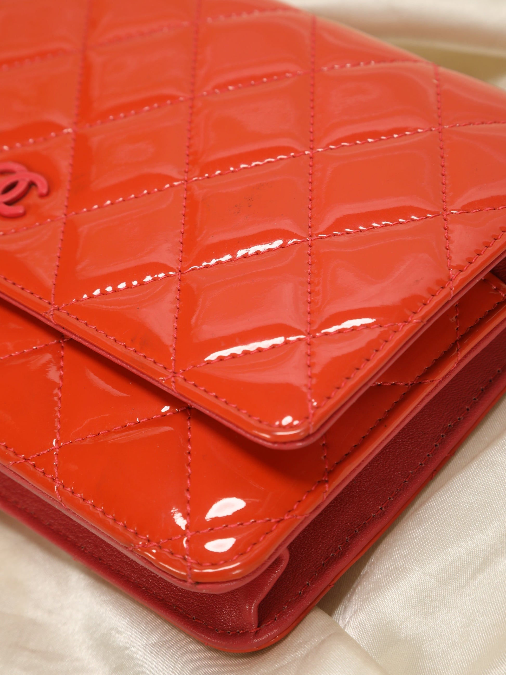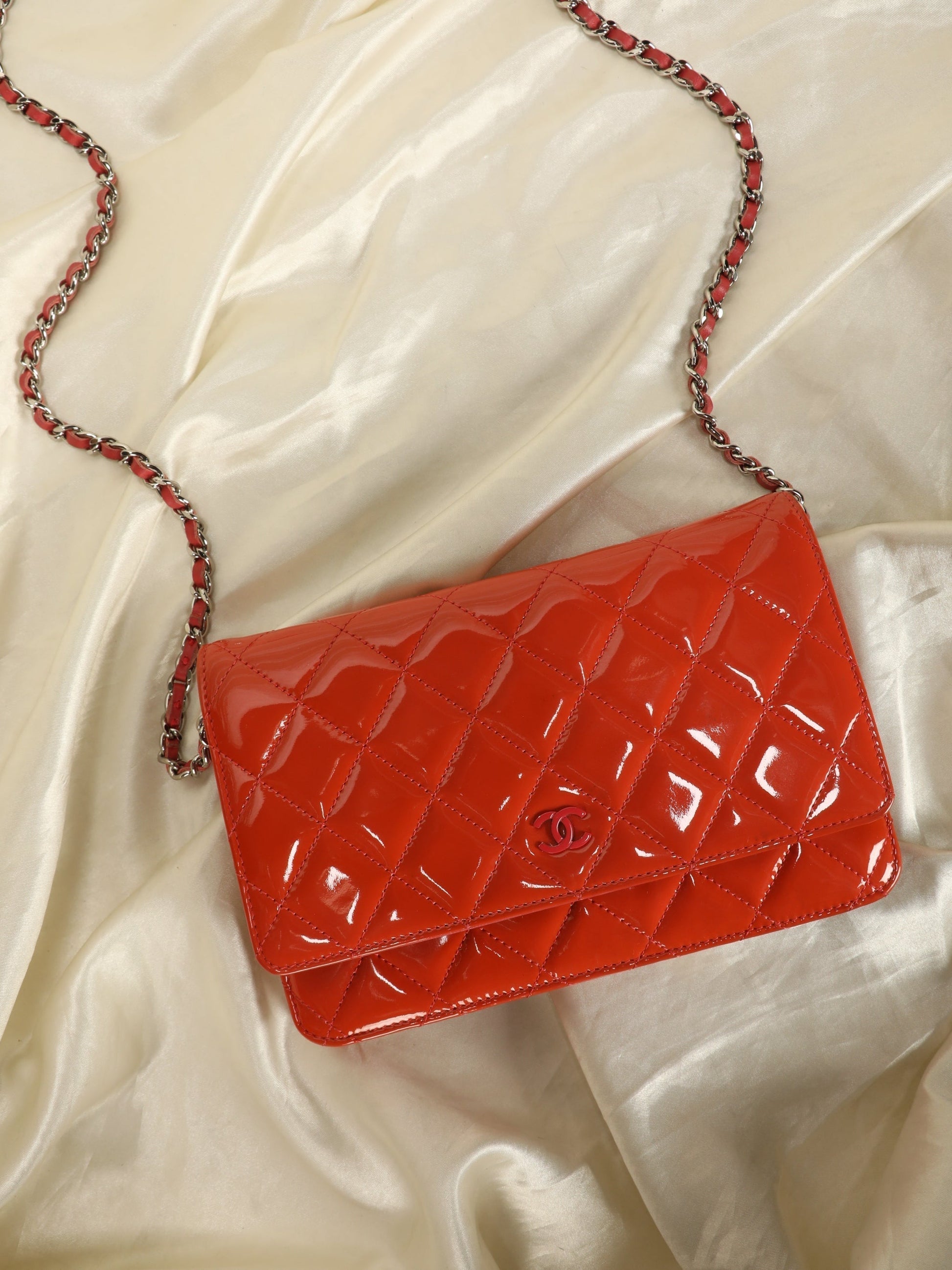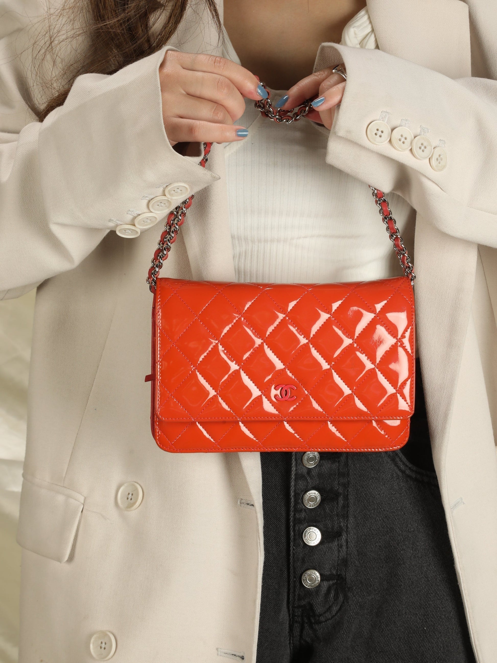 Wallet is lavishly designed using blood orange quilted patent leather, with the same hue CC accent placed on the front. It has an organized fabric-lined interior, which can easily carry your cards.?Versatility allows for this bag to be as a crossbody, shoulder bag, AND short chain bag!