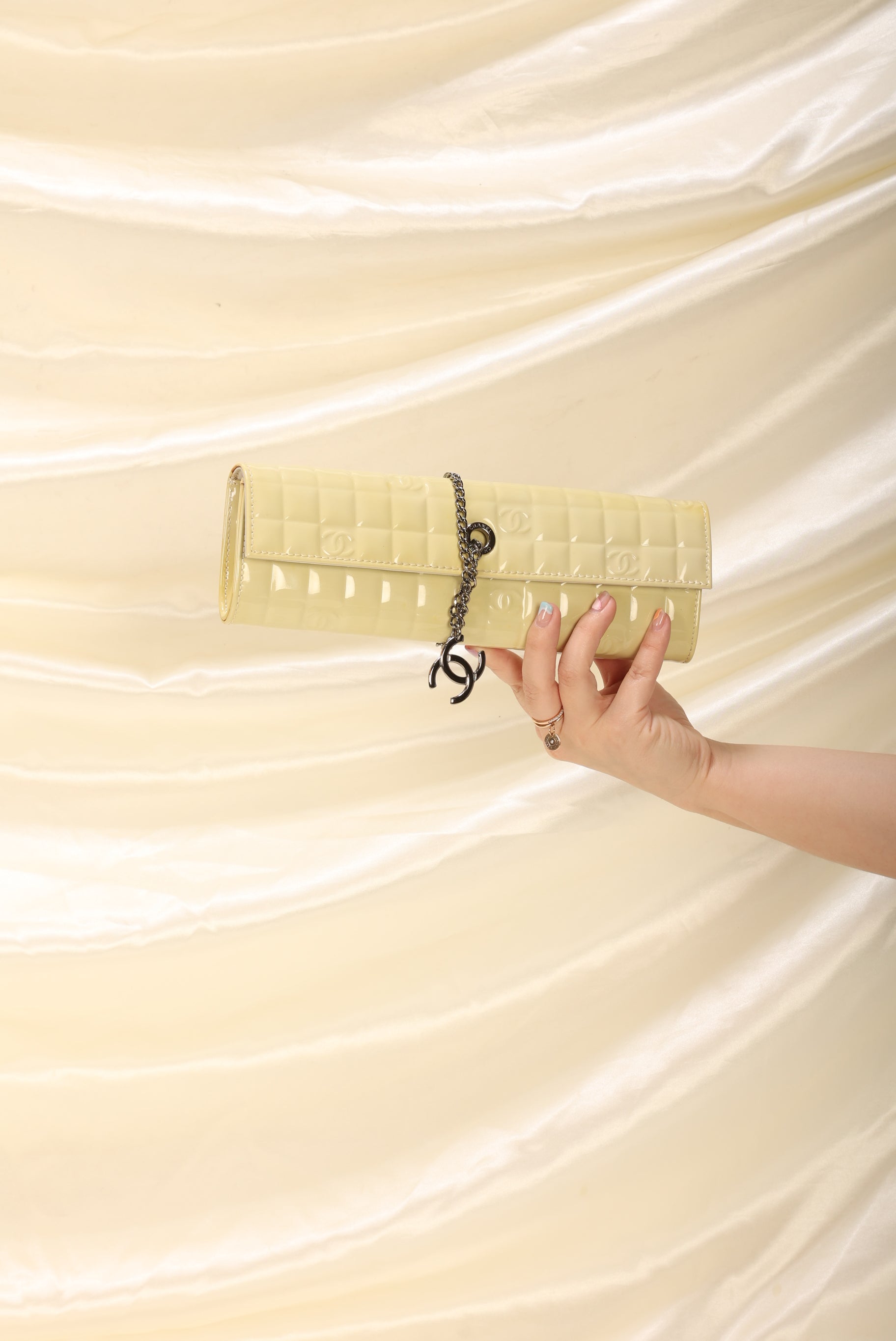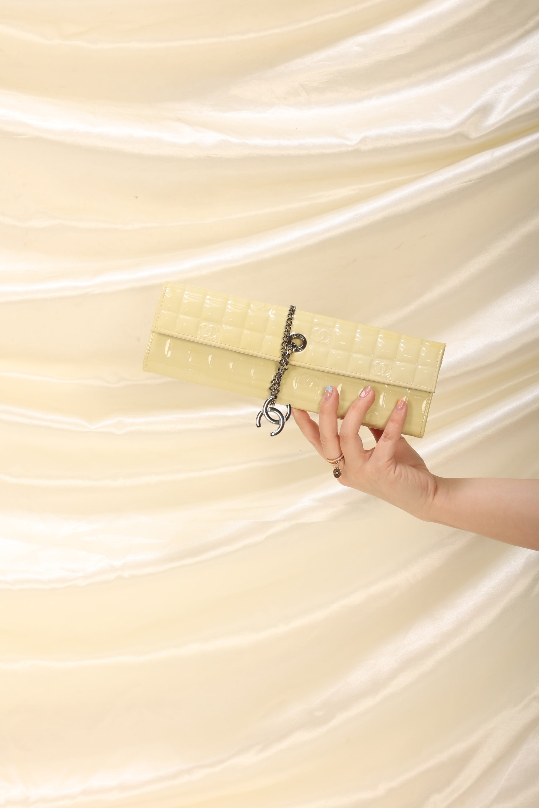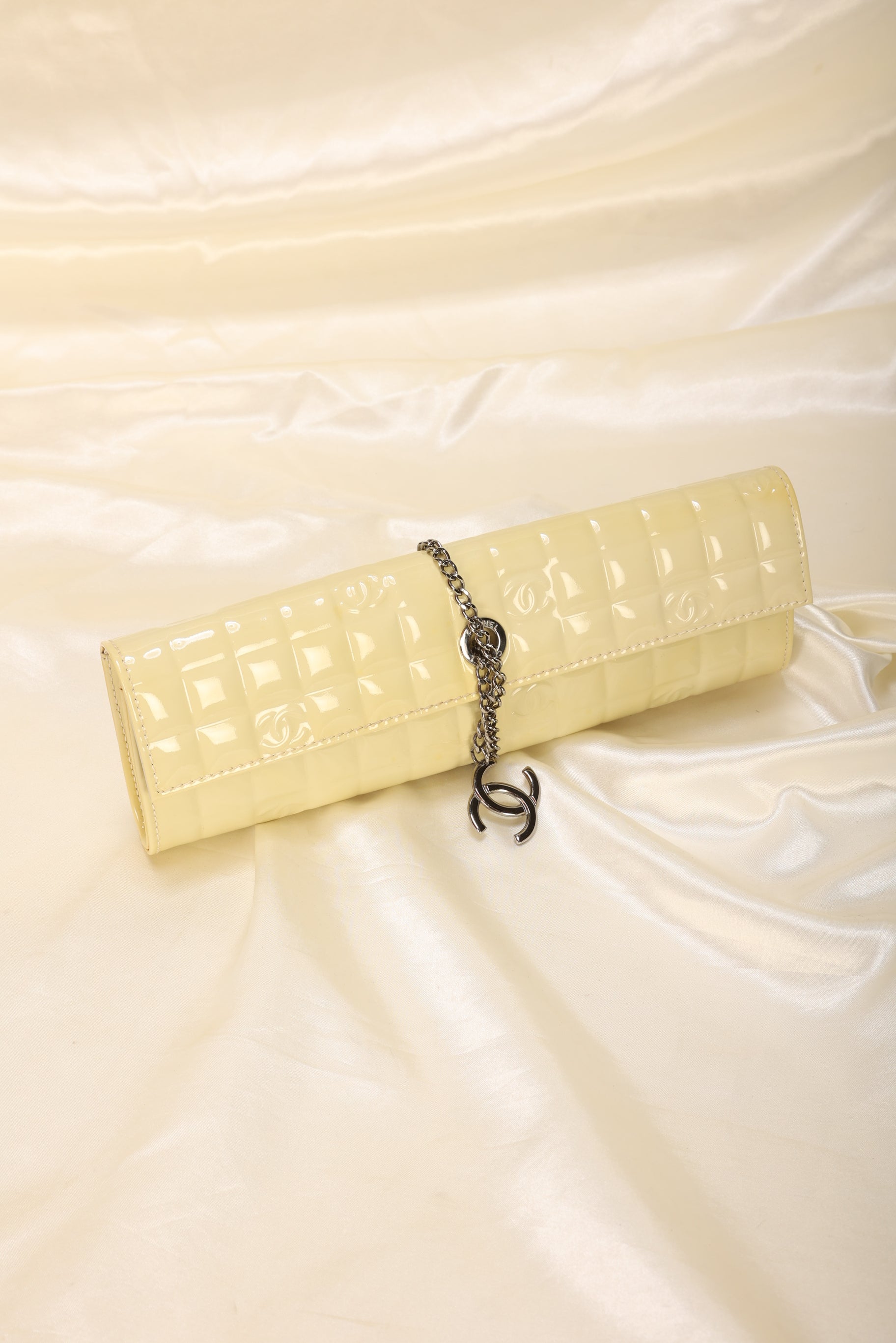 A rare vintage Chanel patent chocolate bar clutch.?Tiny CC logos adorn this light pop of popcorn yellow piece - perfect for the spring! Dangling silver CC charm - great transitional day to night piece.