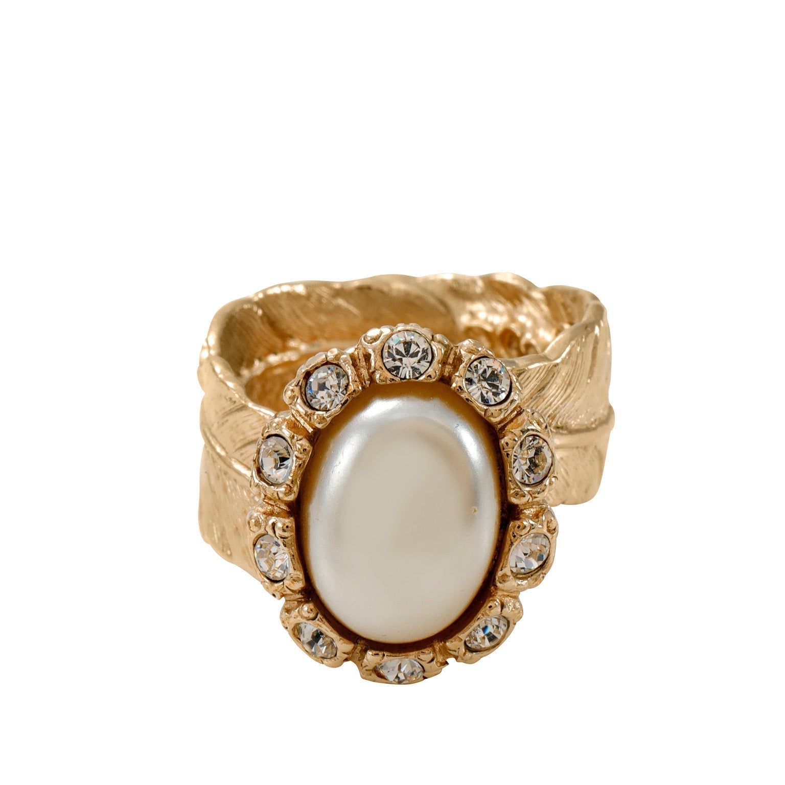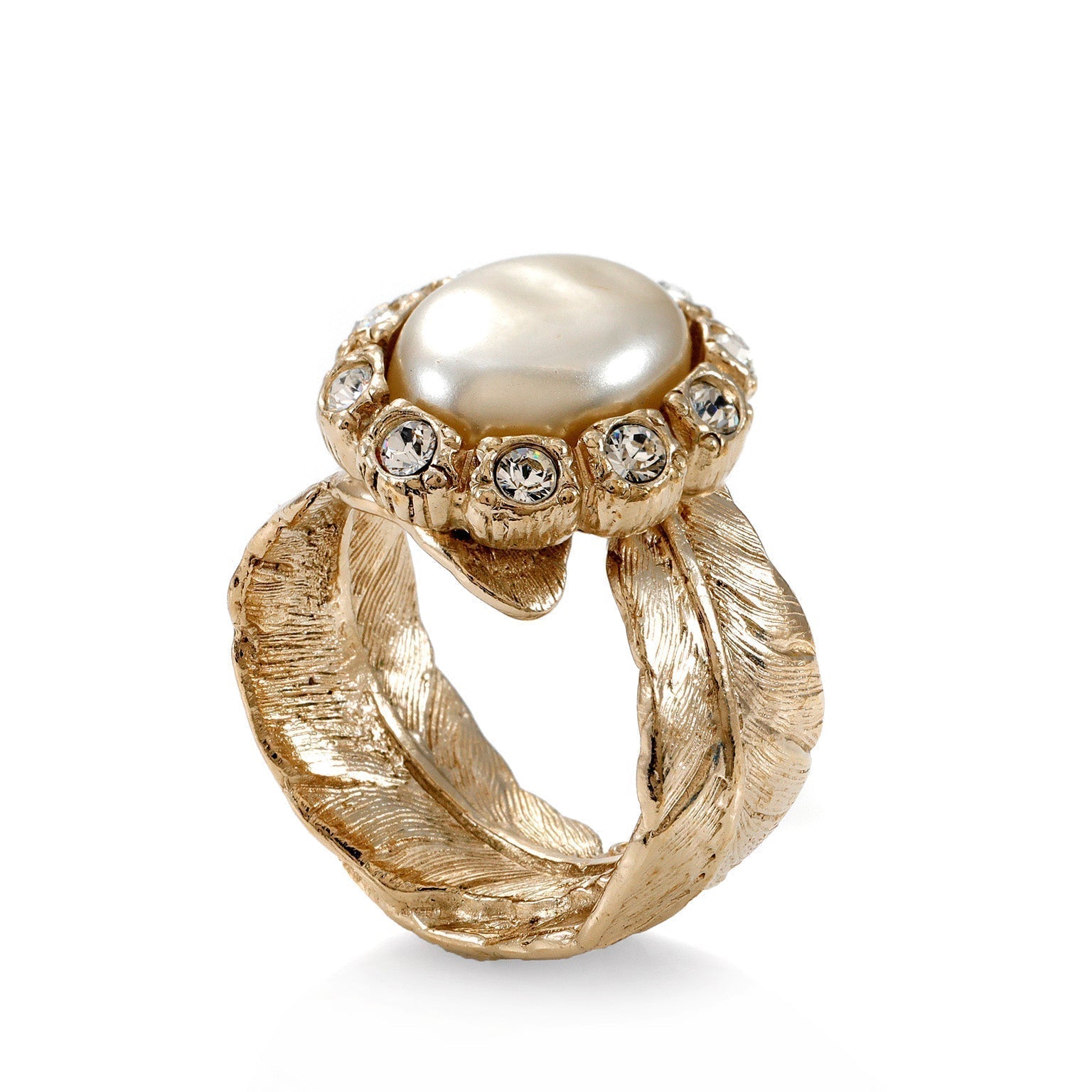 This Chanel Pearl and Feather Ring is in pristine condition. Large center faux pearl surrounded by rhinestone crystals. Wide feather band in light gold. Size 5.