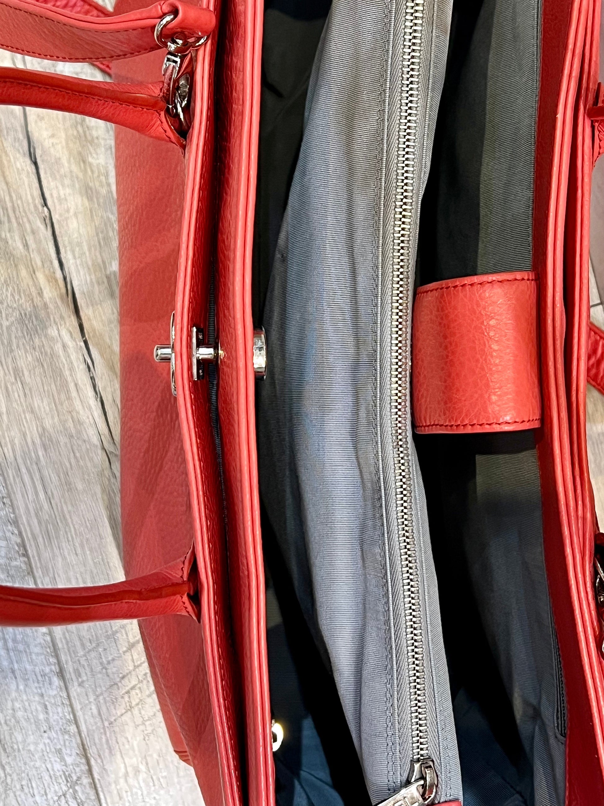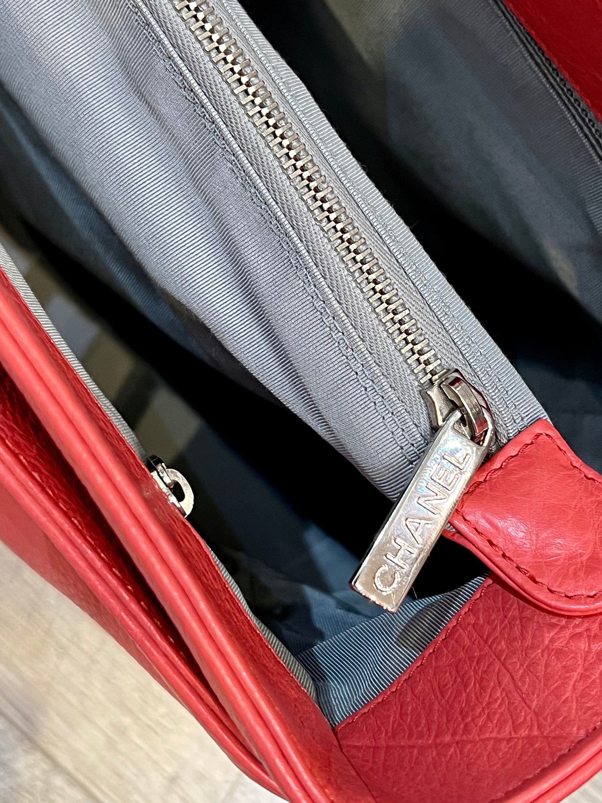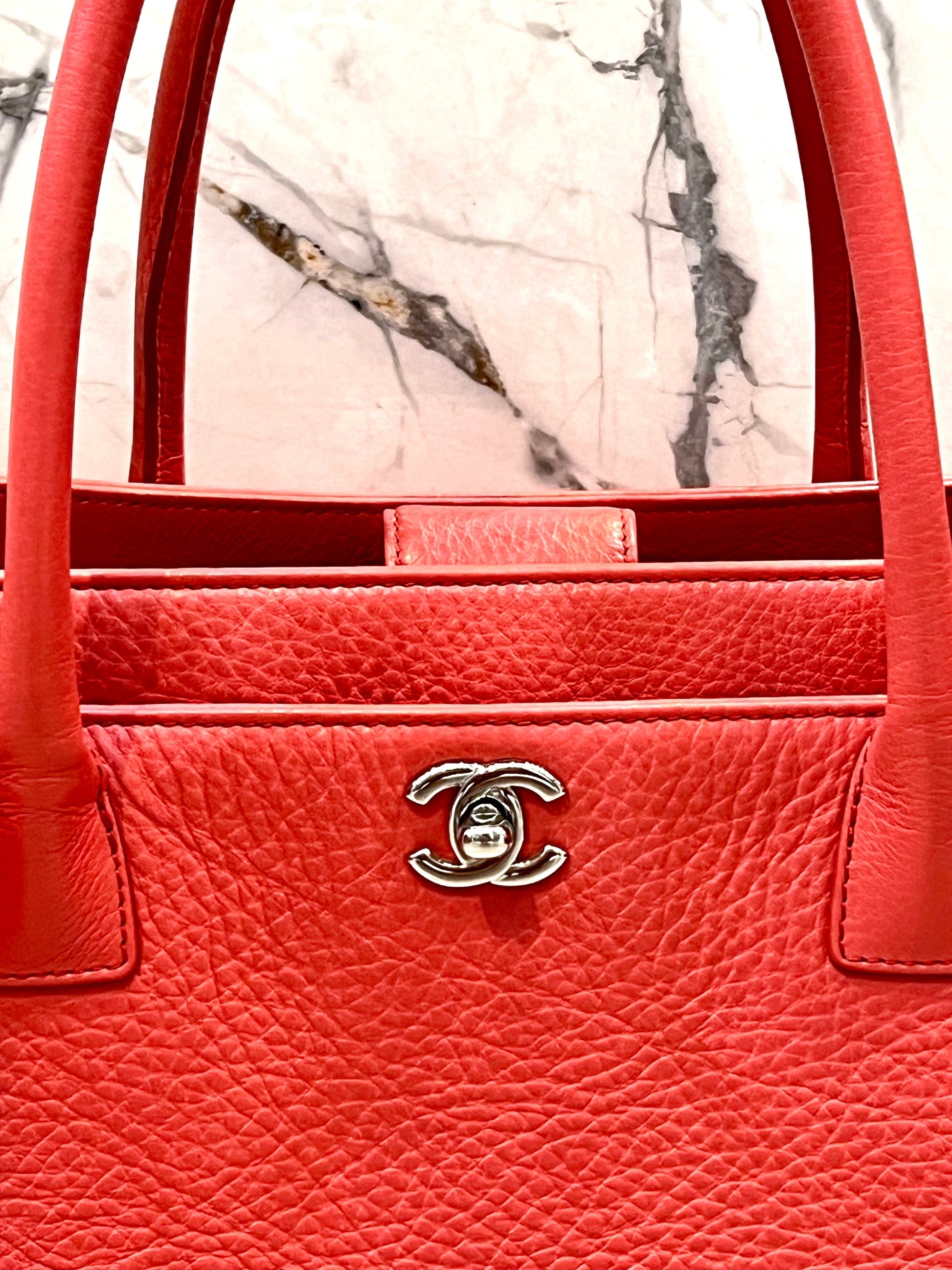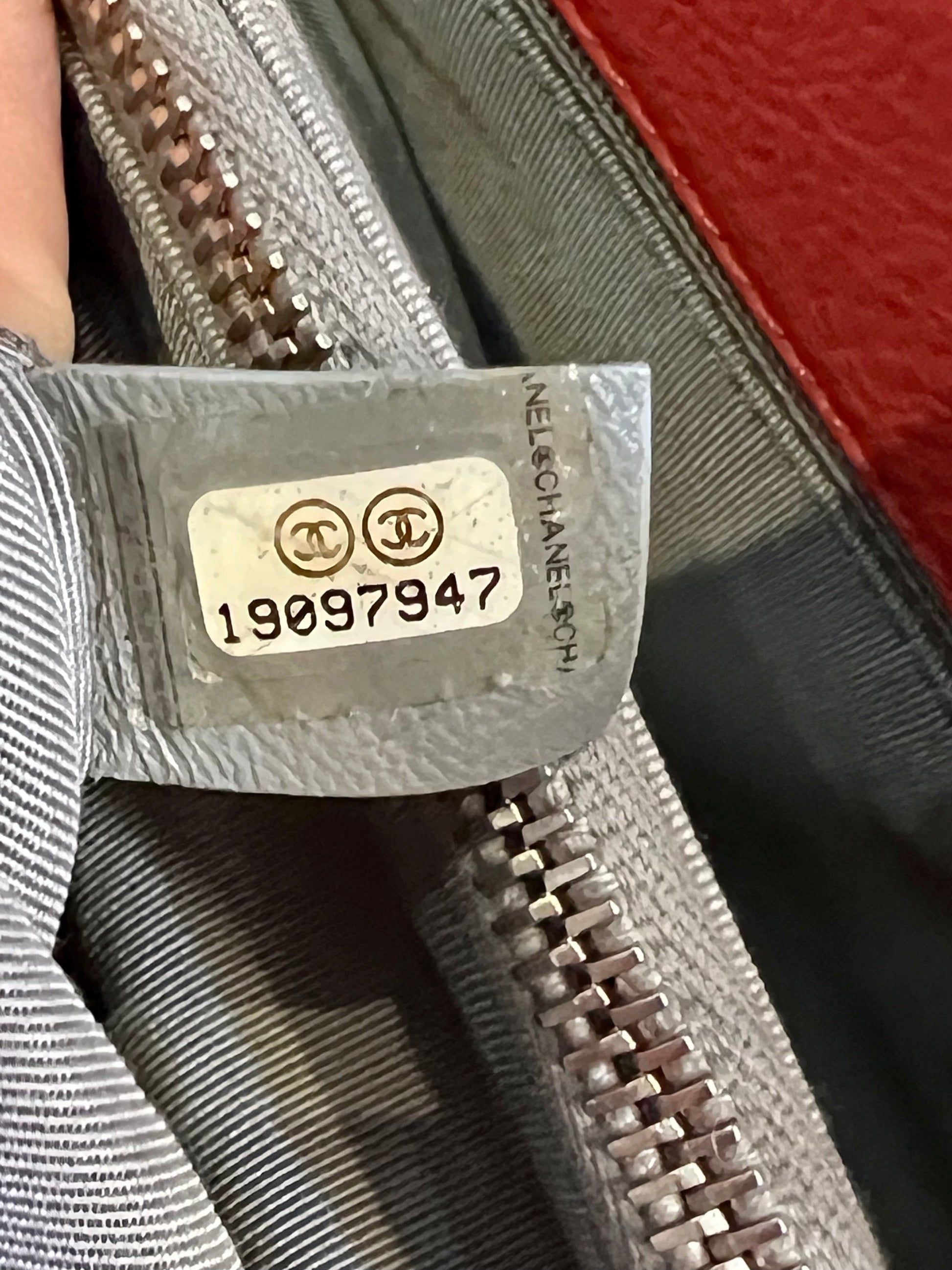 Silver metal CC - CHANEL logo on the front. Double top handles and removable shoulder strap.