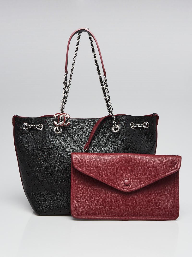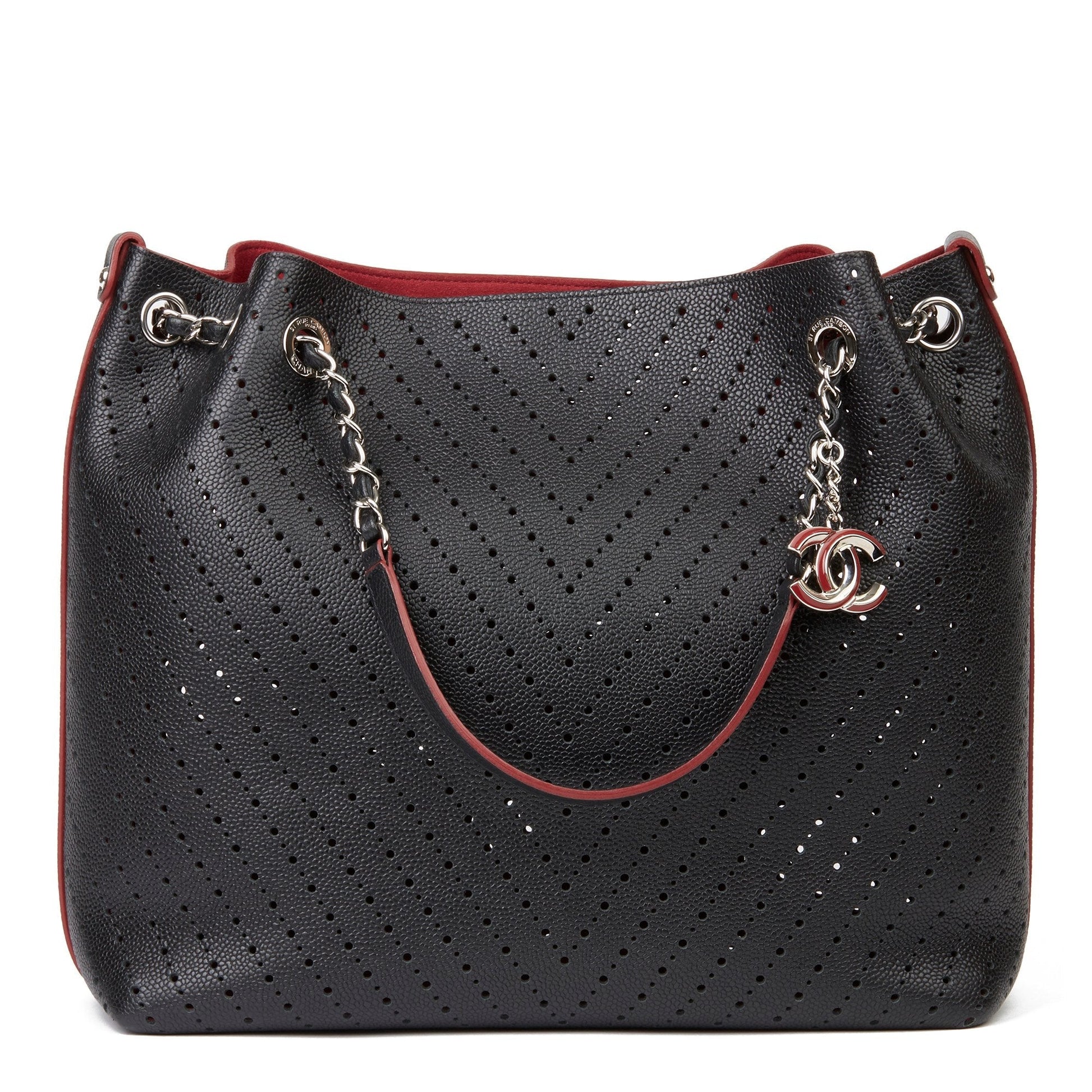 Featuring gorgeous and unique perforated grained calfskin leather, this tote is a classic shape with gorgeous bright silvertone hardware with a CC charm and two leather and chain handles with comfortable shoulder pads. The bag comes with a red leather large accessory pouch.