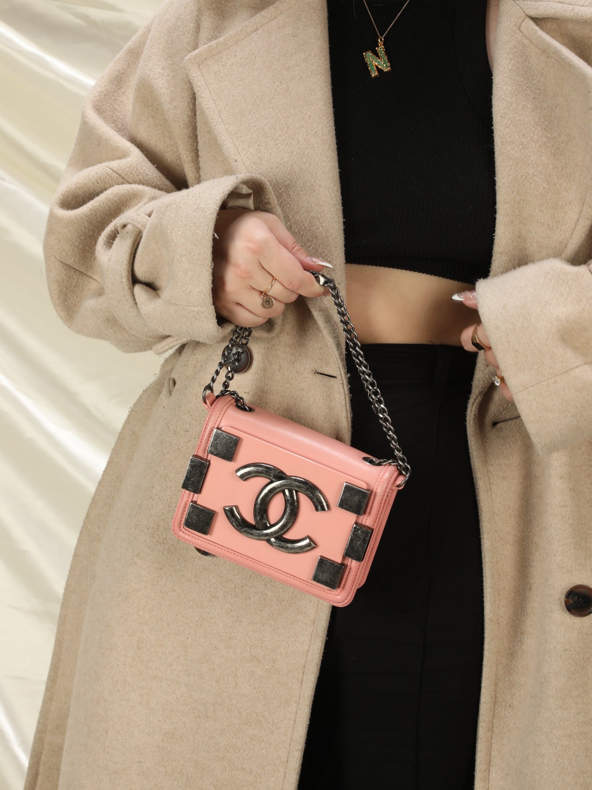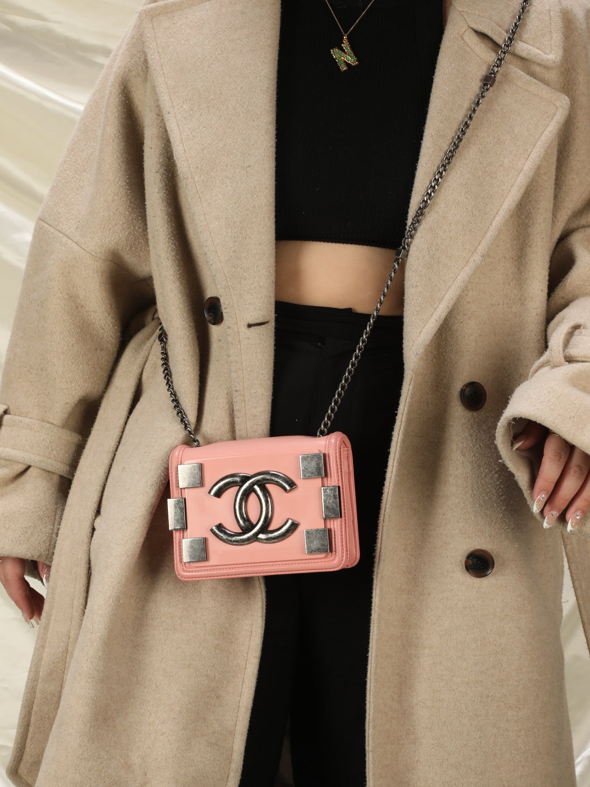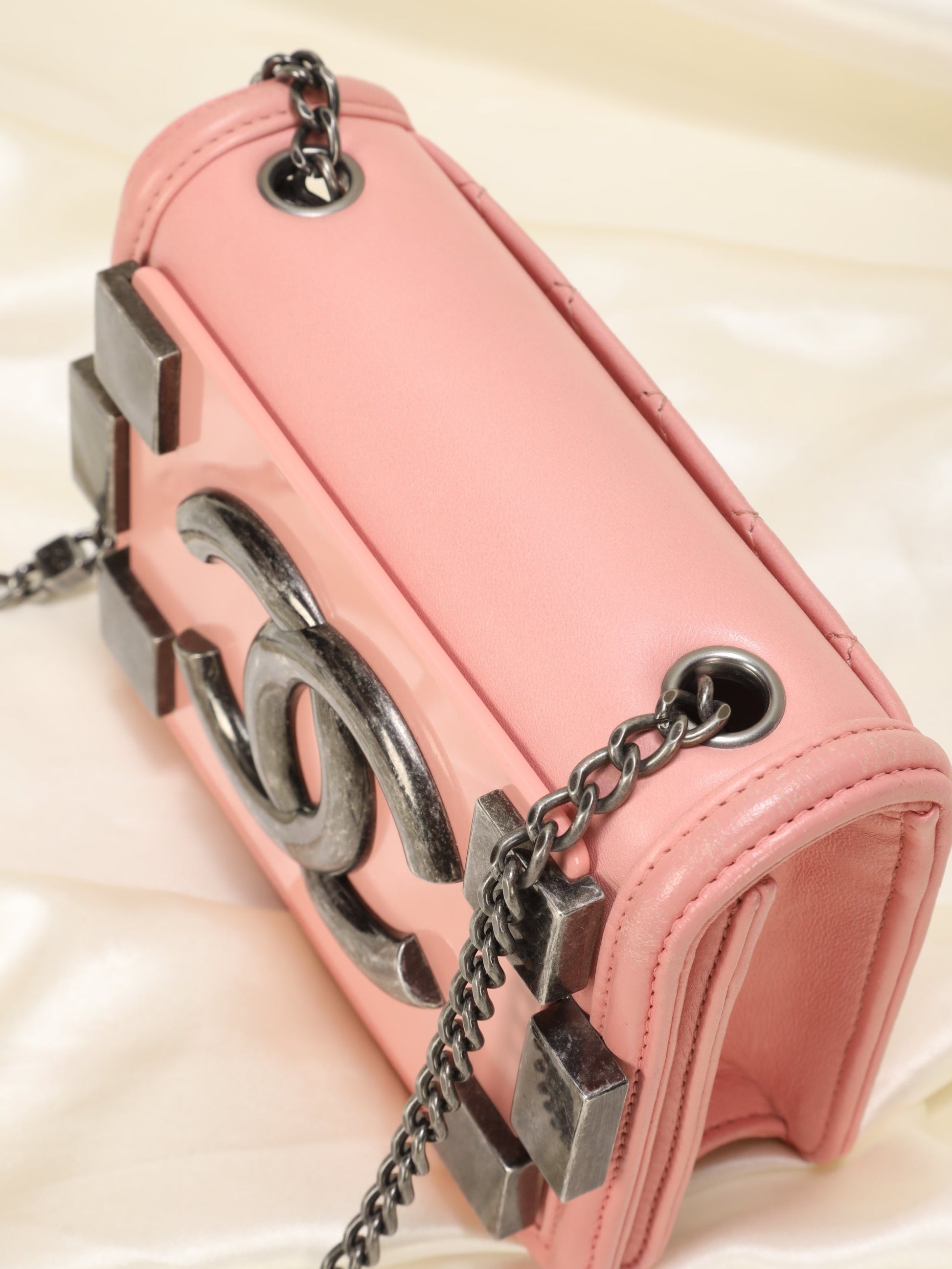 In an adorable bubblegum pink, this Chanel brick bag is truly a statement piece. This gorgeous pop of color combined with the??edgy look from the Ruthenium allows this to be an extremely versatile bag. Wear with a minimal outfit for an effortless elevation to your look! 3300+